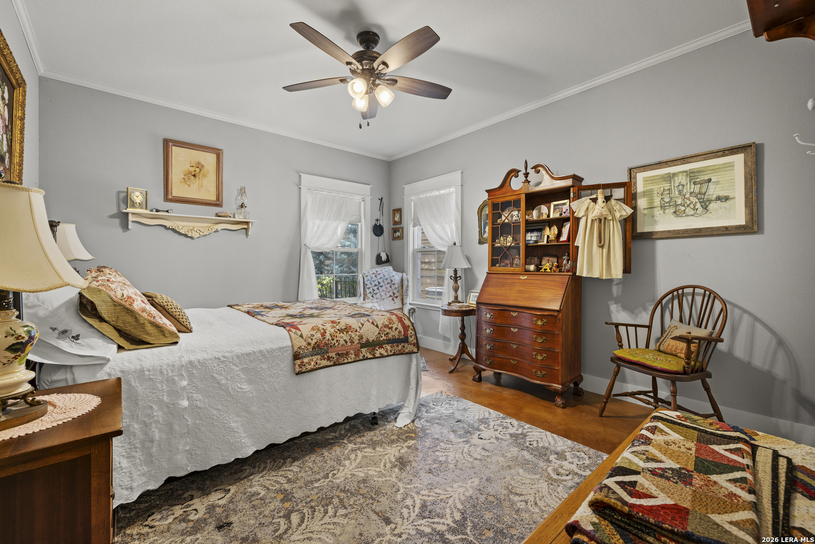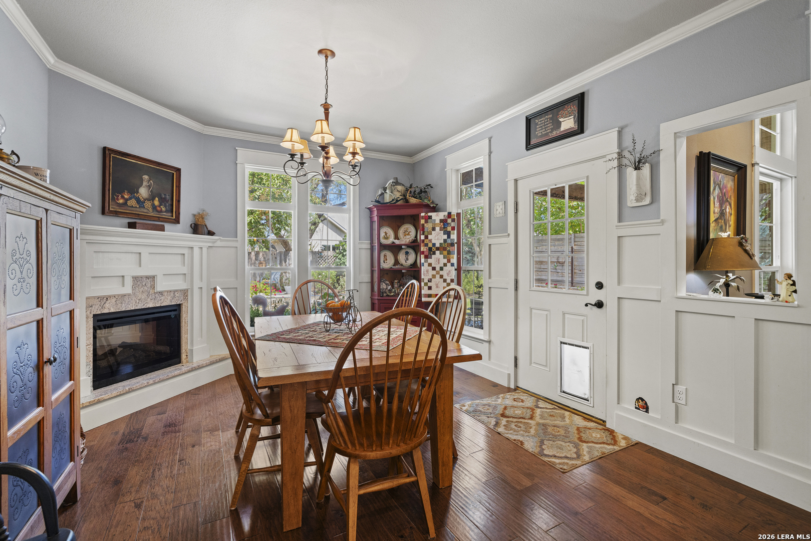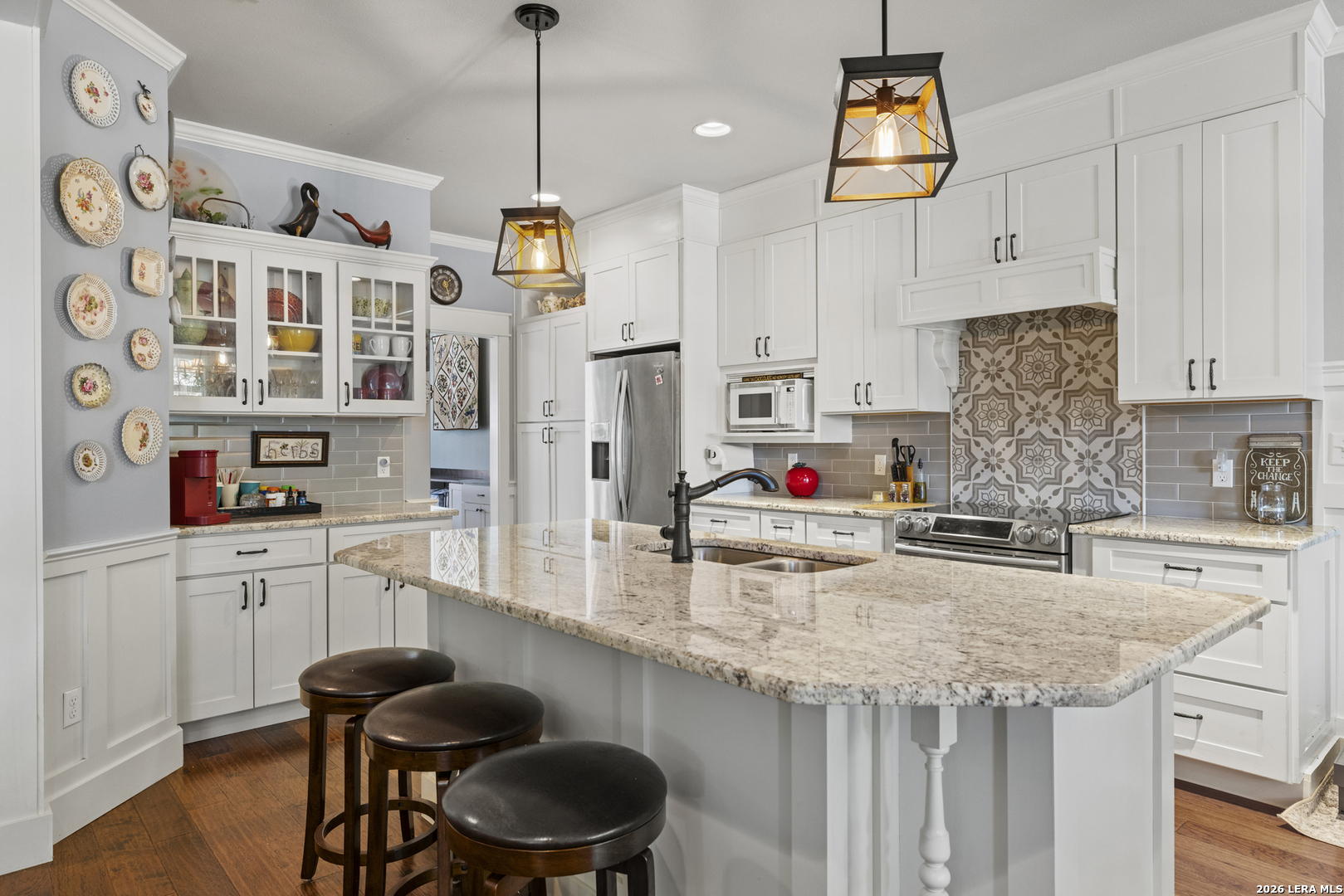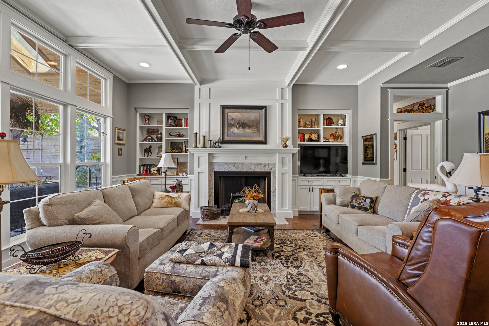Located in Stone Ridge, Fredericksburg's premier neighborhood, this custom-built, one-owner home offers comfort, quality craftsmanship, and thoughtful design throughout. The home features three bedrooms and two baths, along with a warm and inviting living area highlighted by a wood-burning fireplace. Beautiful finishes are found throughout the home, including coffered ceilings, crown moulding, and detailed wood trim. The kitchen is designed for both functionality and style, offering an island, abundant cabinet and counter space, and a convenient walk-in pantry. Adjacent to the kitchen is a cozy breakfast area with an electric fireplace and a separate dining area, perfect for everyday living or entertaining guests. The home's exterior is constructed with stone and hardi siding and includes a two-car attached side-entry garage. Outdoor living is just as inviting, with a great covered back porch overlooking a private backyard oasis complete with a sitting area and thoughtfully designed landscaping with flower beds and xeriscaping for easy maintenance. Additional peace of mind comes with the roof being re-shingled in 2025, making this beautiful property a standout opportunity in Fredericksburg.