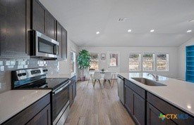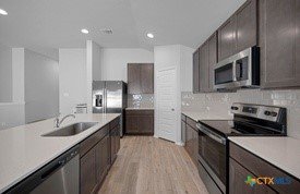 BEST PRICED HOME IN THE NEIGHBORHOOD HOME IS ONLY 2-YEARS OLD Stunning Corner Lot Home with Stone Front in Lago Vista! This beautifully designed home boasts elegant wood-look tile flooring throughout the main living areas and bedrooms. Enjoy the spacious rear covered patio, perfect for relaxing or entertaining, and blinds installed throughout for added convenience and privacy. The modern kitchen is a chef’s dream, featuring sleek grey cabinets with 42-inch upper cabinets, stunning Blanco Maple Quartz countertops, with an oversized center island. A corner pantry and stainless steel appliances complete the space, offering both style and functionality. The primary suite is a true retreat with a generous walk-in closet, an additional door for added privacy, a separate water closet, and a walk-in shower for a spa-like experience. Exceptional Community Amenities: As a resident, you’ll have access to a host of remarkable community features, including 9 scenic parks, a hiking trail, and a disc golf course—providing plenty of opportunities to stay active and enjoy the natural beauty of the area. Water enthusiasts will love the open boat ramps leading to the stunning waters of Lake Travis, as well as the fishing well and convenient kayak storage racks. For fitness-minded individuals, two well-equipped community fitness centers ensure you have everything you need to stay fit and healthy, all right at your doorstep. This home combines quality, functionality, and style, making it a must-see!