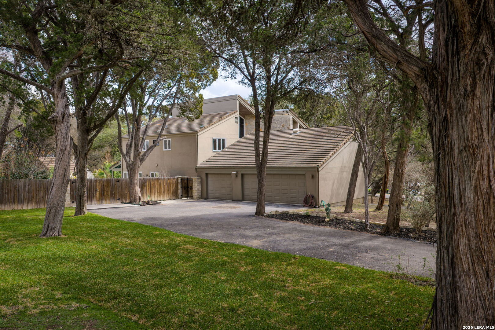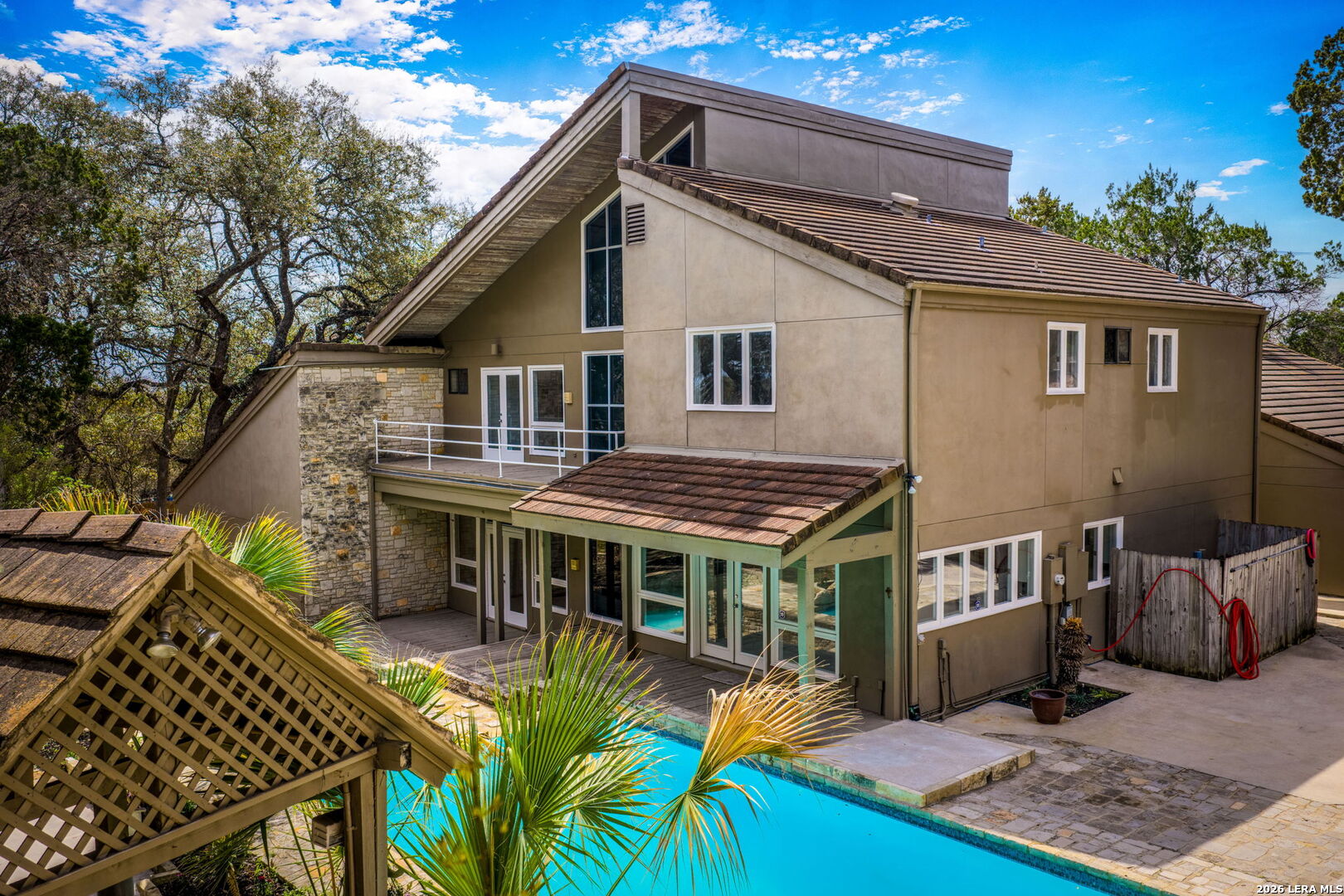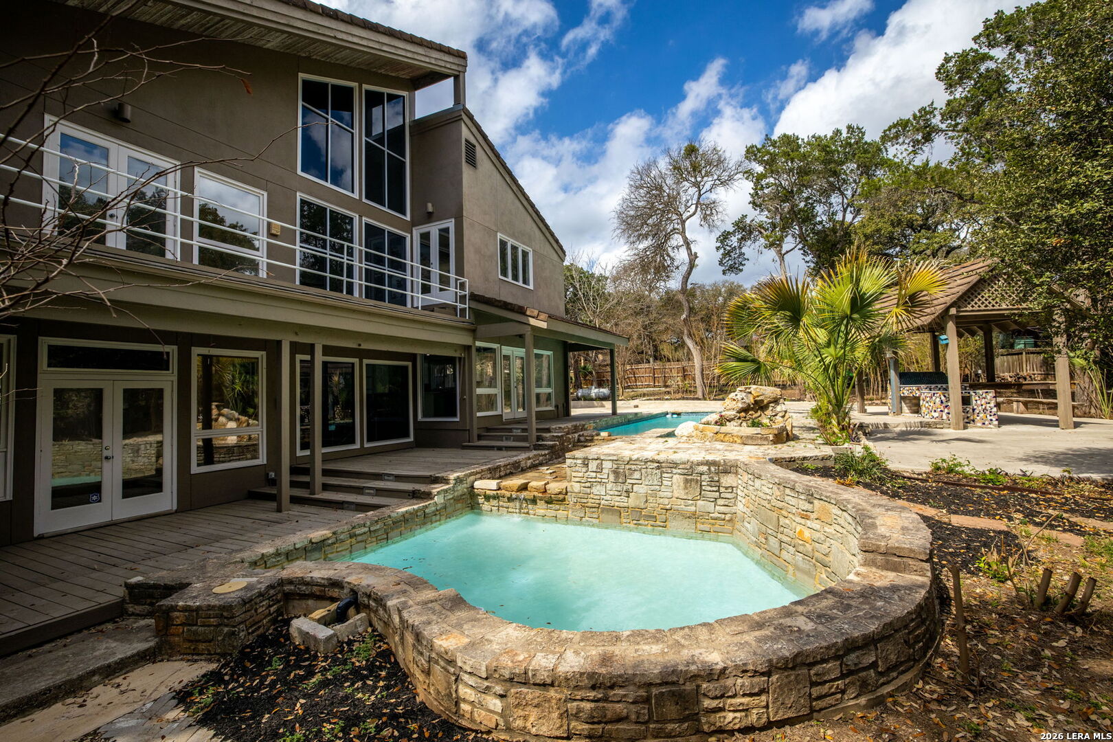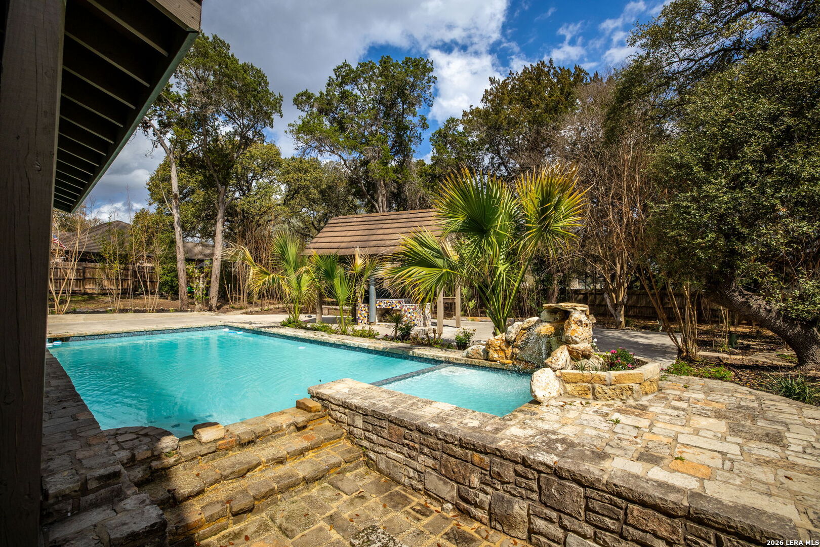 Discover the opportunity to own this 4-bedroom, 3.5-bath home in one of Garden Ridge's most desirable neighborhoods - with no HOA. Set on a spacious property surrounded by mature trees, this home offers an oversized garage, sparkling pool, and attached spa, creating a private outdoor retreat perfect for relaxing or entertaining. Inside, high ceilings and large windows highlight the home's architecture and fill the living spaces with abundant natural light. The kitchen features quartz countertops and backsplash, marble accents, wood flooring, and a JennAir stovetop, offering both style and functionality. Ceiling fans throughout add comfort, while two fireplaces - one in the living room and one in the primary bedroom - bring warmth and character to the home's inviting atmosphere. The flexible layout offers a unique opportunity to personalize and create spaces that fit your lifestyle, whether for entertaining, working from home, or everyday living. Step outside to enjoy a spacious patio and charming gazebo, ideal for gatherings, outdoor dining, or quiet evenings by the pool. The expansive outdoor living area provides plenty of room to entertain and enjoy the peaceful setting that makes Garden Ridge so desirable. Additional highlights include four HVAC units for efficient climate control and year-round comfort. Located in a sought-after community known for its larger homesites, natural beauty, and convenient access to nearby shopping, dining, and major routes, this property presents a rare opportunity to enjoy space, privacy, and the relaxed Garden Ridge lifestyle. Ready to tour and ready for its next chapter.