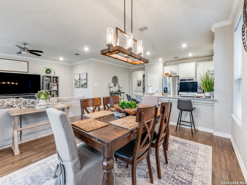 Welcome to 21807 Yucca Bend in the highly sought-after Canyon Crest neighborhood! This stunning 2,444-square-foot brick single story offers over $50,000 in premium upgrades, blending timeless elegance with modern smart-home functionality. From the moment you cross the threshold of the custom wood front door, you are greeted by sophisticated arched doorways, crown molding, and a seamless open-concept layout designed for effortless living. The heart of the home is a chef-inspired kitchen boasting crisp white cabinetry, granite countertops, a classic subway tile backsplash, and high-end stainless steel appliances including a built-in wall oven. Designed with scale in mind, the formal dining area was converted to create jumbo-sized bedrooms and massive closets, while the expansive bonus room offers the easy potential to become a fourth bedroom. Step outdoors to a private, fenced backyard featuring a covered patio and professional landscaping. Unique features include app-controlled exterior lighting, copper mesh in weep holes for bug deterrence, garage ceiling mounted storage. Schedule your showing today.