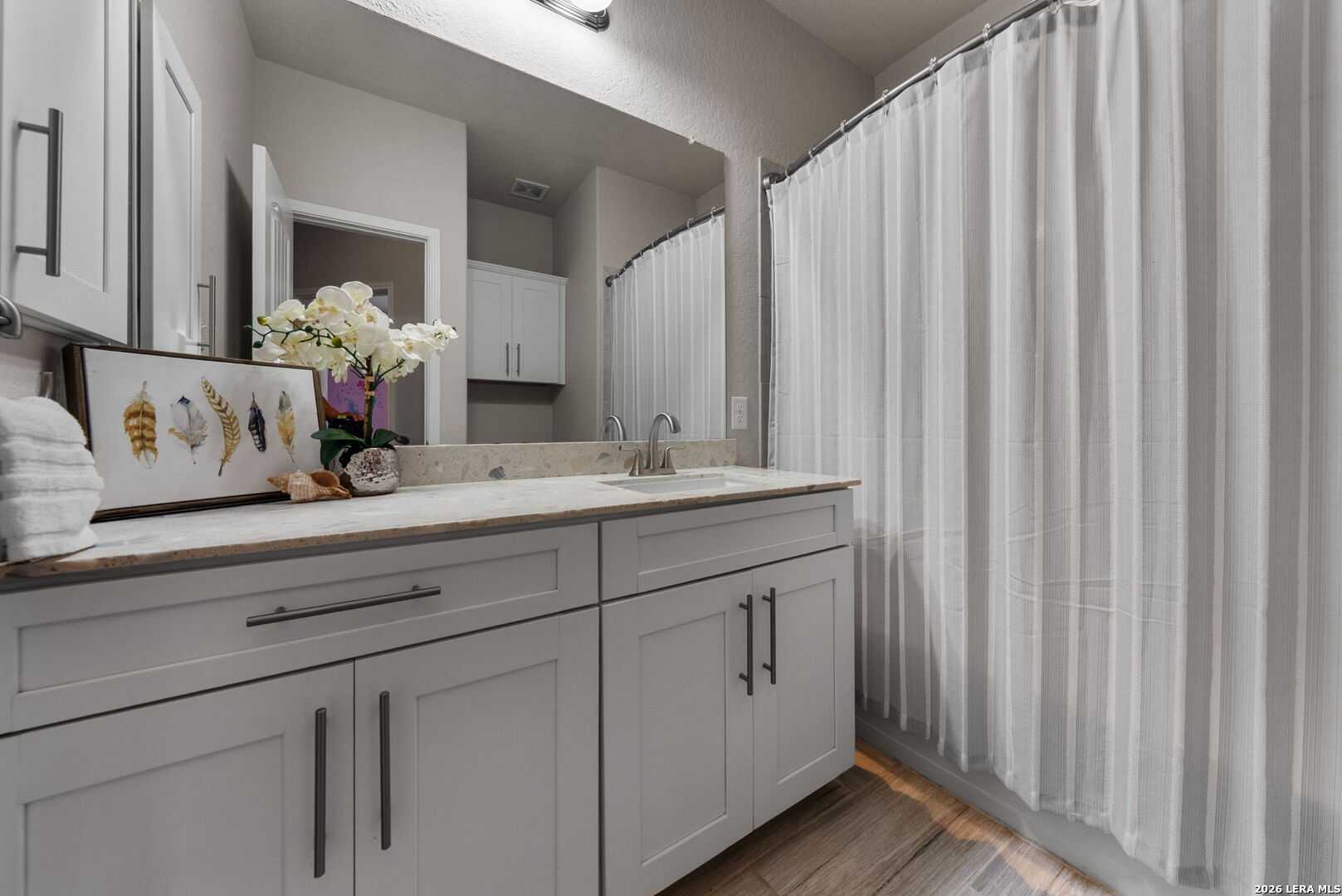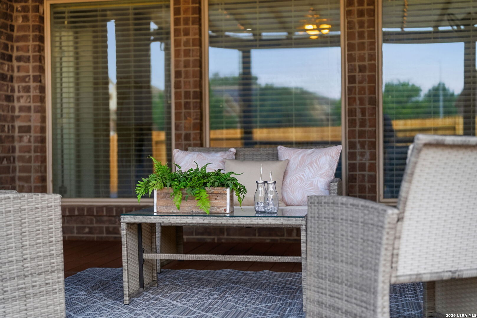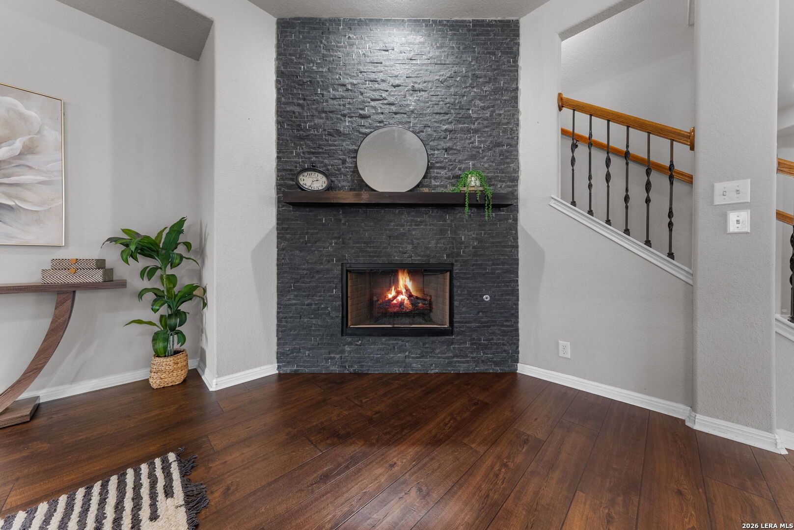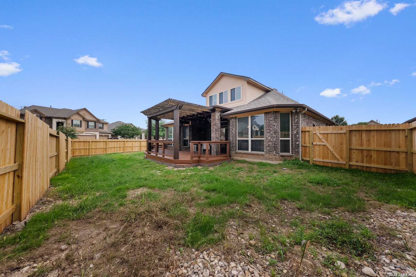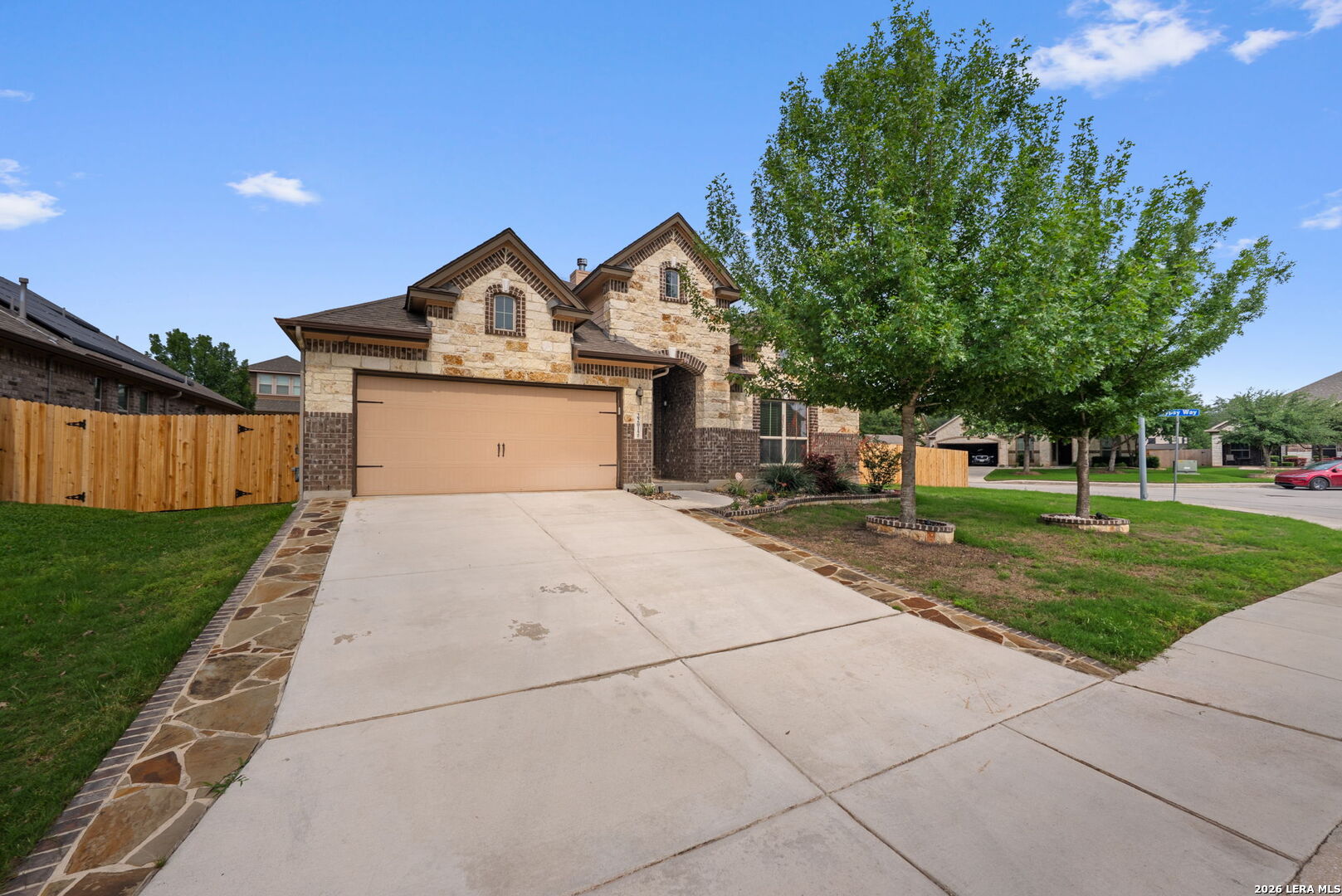 Step into elevated living in the gated enclave of Wortham Oaks, where this meticulously maintained 1.5-story home sits on an oversized corner lot just under a quarter acre. Featuring 4 bedrooms, 2 full baths, and 2 half baths, the functional layout places all bedrooms and the laundry room downstairs, with a private upstairs game room and half bath ideal for guests or entertaining. The open-concept design is anchored by a well-appointed kitchen with white shaker cabinetry, quartz countertops, gas cooking, stainless steel appliances, and a modern subway tile backsplash. The spacious living area offers wood and tile flooring, abundant natural light, and a striking floor-to-ceiling stone fireplace. The primary suite serves as a true retreat with bay windows and dual closets, while added features like surround sound wiring enhance everyday living. Step outside to a covered patio and extended deck overlooking the oversized yard, offering plenty of space to relax or entertain. This home stands out for its lot size, layout, and upgrades. Schedule your private showing today to experience everything this home has to offer.