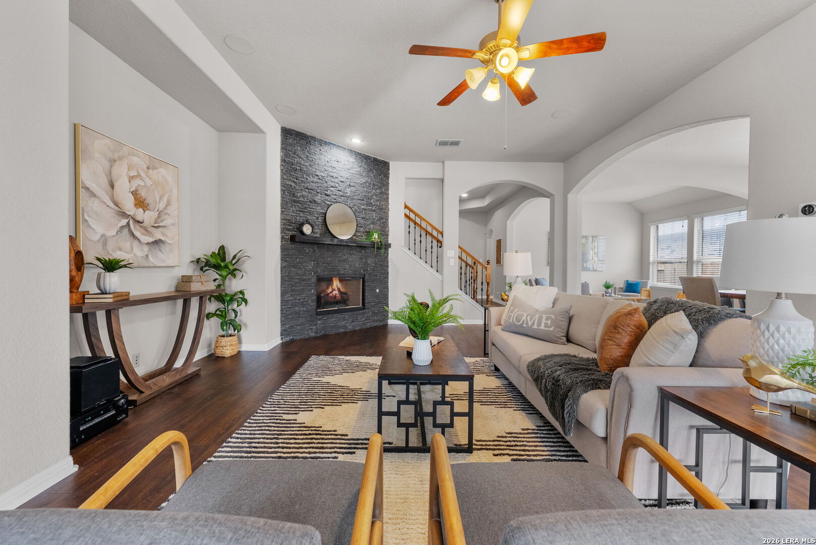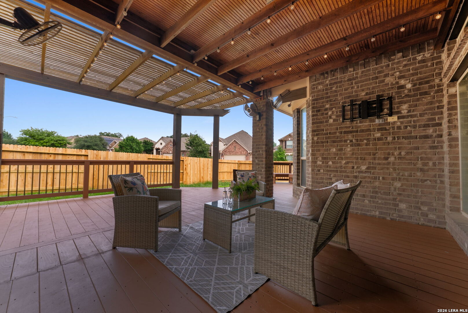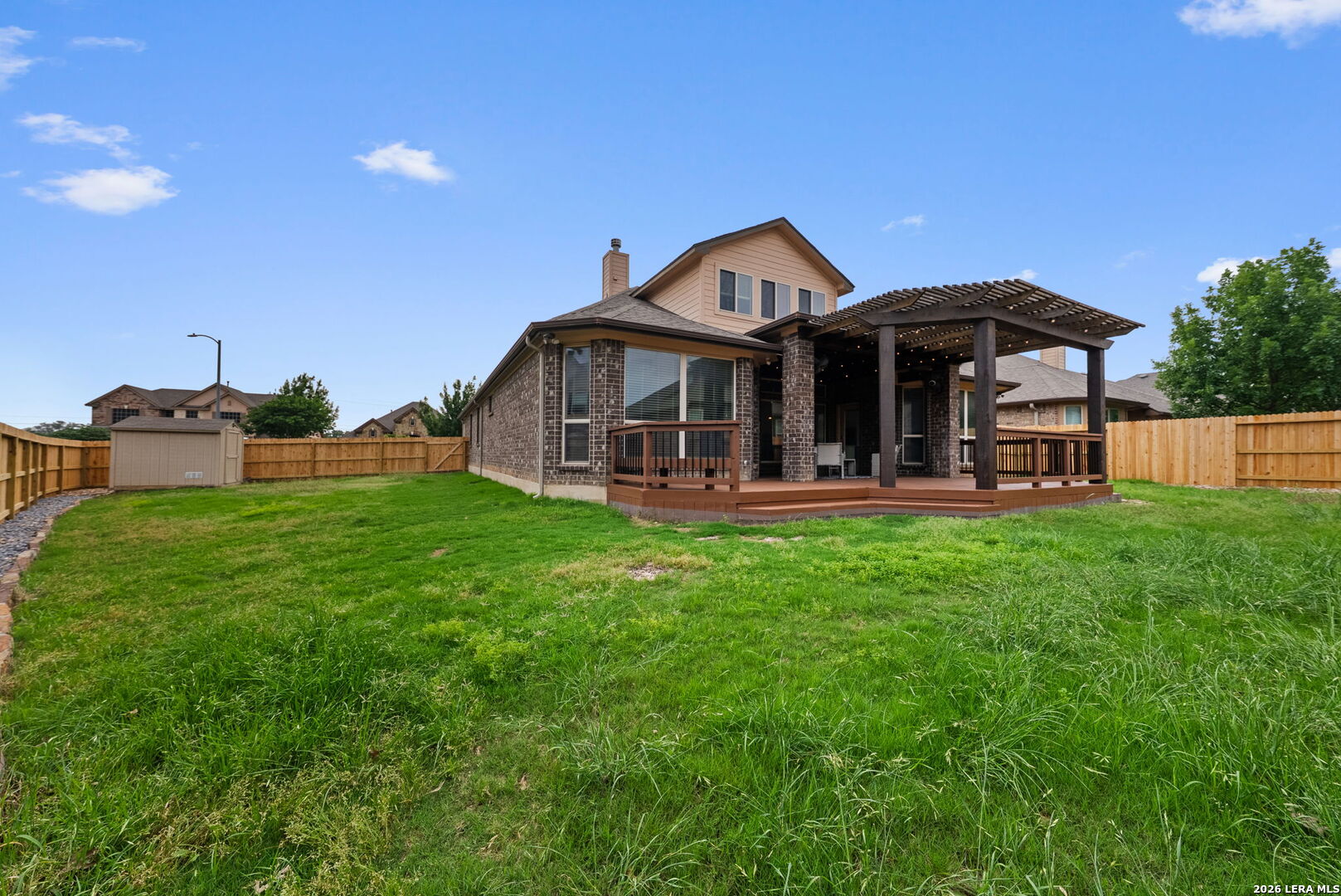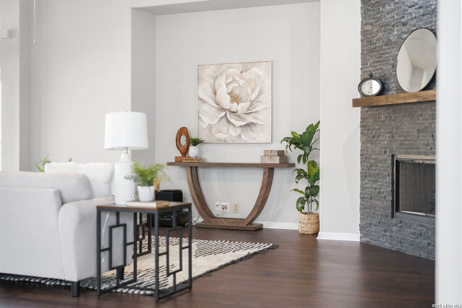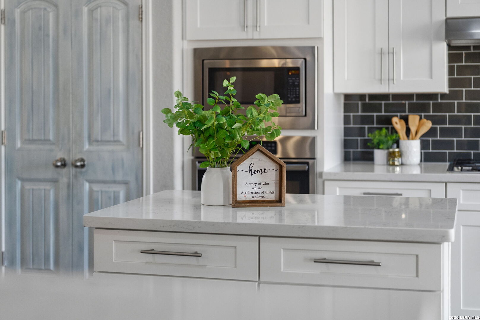 Step into elevated living in the gated enclave of Wortham Oaks, where this meticulously maintained 1.5-story home sits on an oversized corner lot just under a quarter acre. Featuring 4 bedrooms, 2 full baths, and 2 half baths, the functional layout places all bedrooms and the laundry room downstairs, with a private upstairs game room and half bath ideal for guests or entertaining. The open-concept design is anchored by a well-appointed kitchen with white shaker cabinetry, quartz countertops, gas cooking, stainless steel appliances, and a modern subway tile backsplash. The spacious living area offers wood and tile flooring, abundant natural light, and a striking floor-to-ceiling stone fireplace. The primary suite serves as a true retreat with bay windows and dual closets, while added features like surround sound wiring enhance everyday living. Step outside to a covered patio and extended deck overlooking the oversized yard, offering plenty of space to relax or entertain. This home stands out for its lot size, layout, and upgrades. Schedule your private showing today to experience everything this home has to offer.