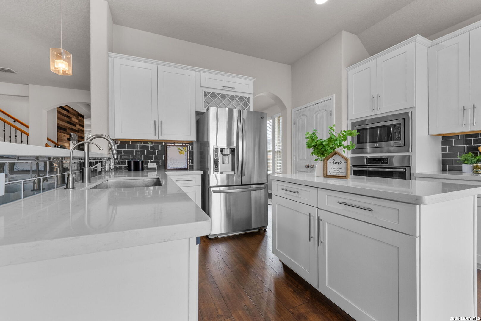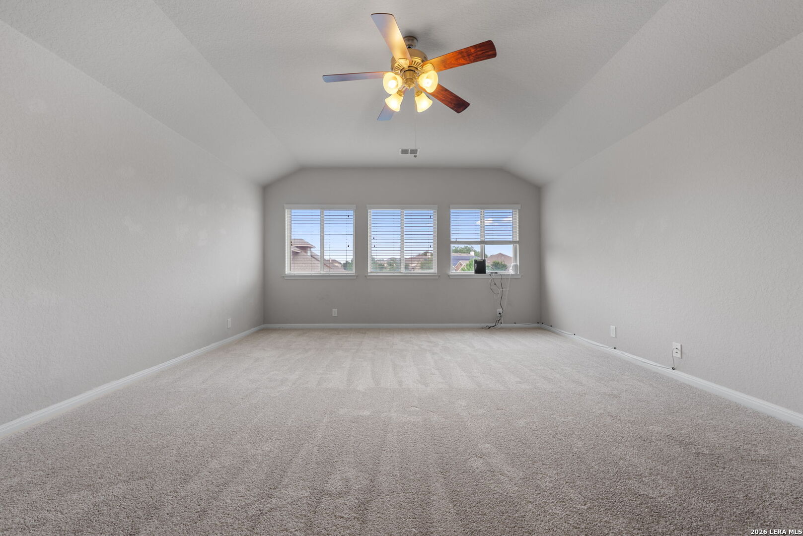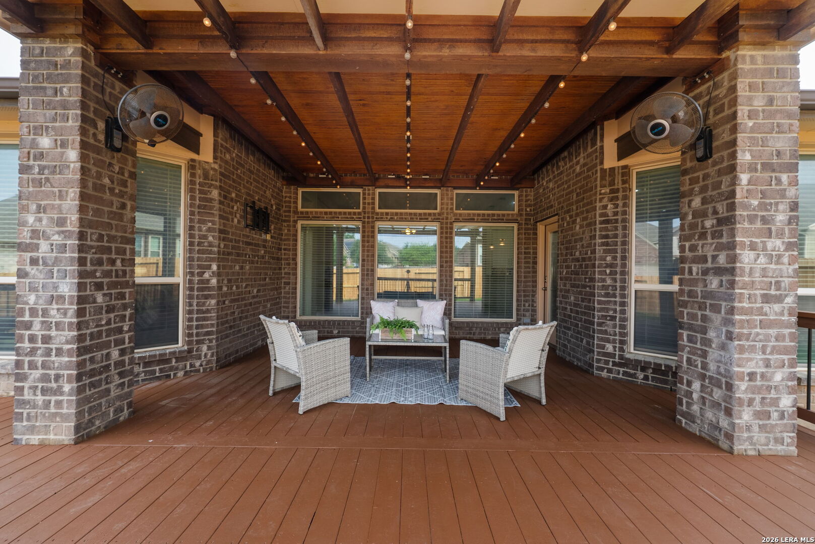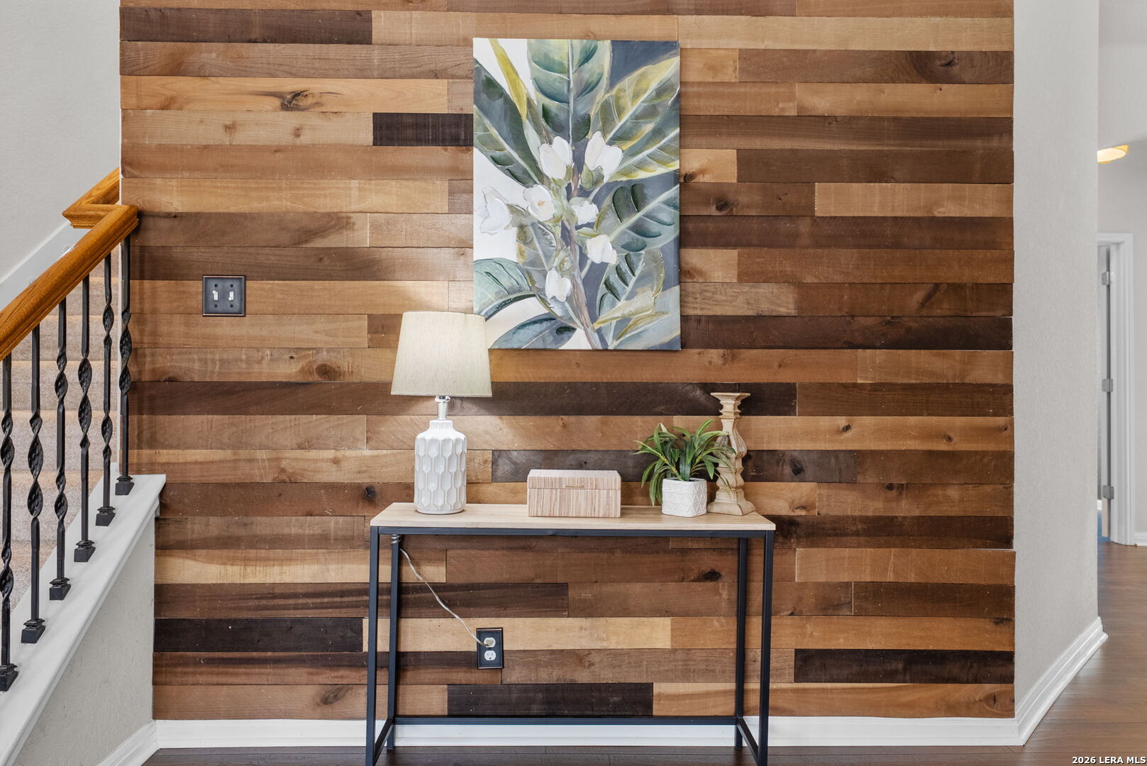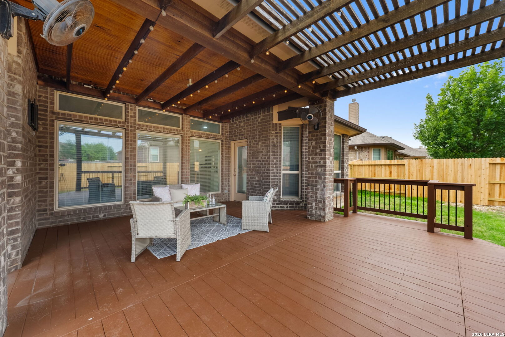 Step into elevated living in the gated enclave of Wortham Oaks, where this meticulously maintained 1.5-story home sits on an oversized corner lot just under a quarter acre. Featuring 4 bedrooms, 2 full baths, and 2 half baths, the functional layout places all bedrooms and the laundry room downstairs, with a private upstairs game room and half bath ideal for guests or entertaining. The open-concept design is anchored by a well-appointed kitchen with white shaker cabinetry, quartz countertops, gas cooking, stainless steel appliances, and a modern subway tile backsplash. The spacious living area offers wood and tile flooring, abundant natural light, and a striking floor-to-ceiling stone fireplace. The primary suite serves as a true retreat with bay windows and dual closets, while added features like surround sound wiring enhance everyday living. Step outside to a covered patio and extended deck overlooking the oversized yard, offering plenty of space to relax or entertain. This home stands out for its lot size, layout, and upgrades. Schedule your private showing today to experience everything this home has to offer.