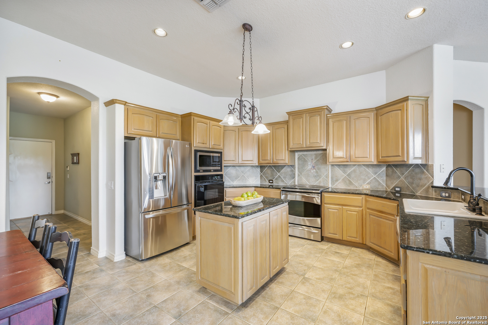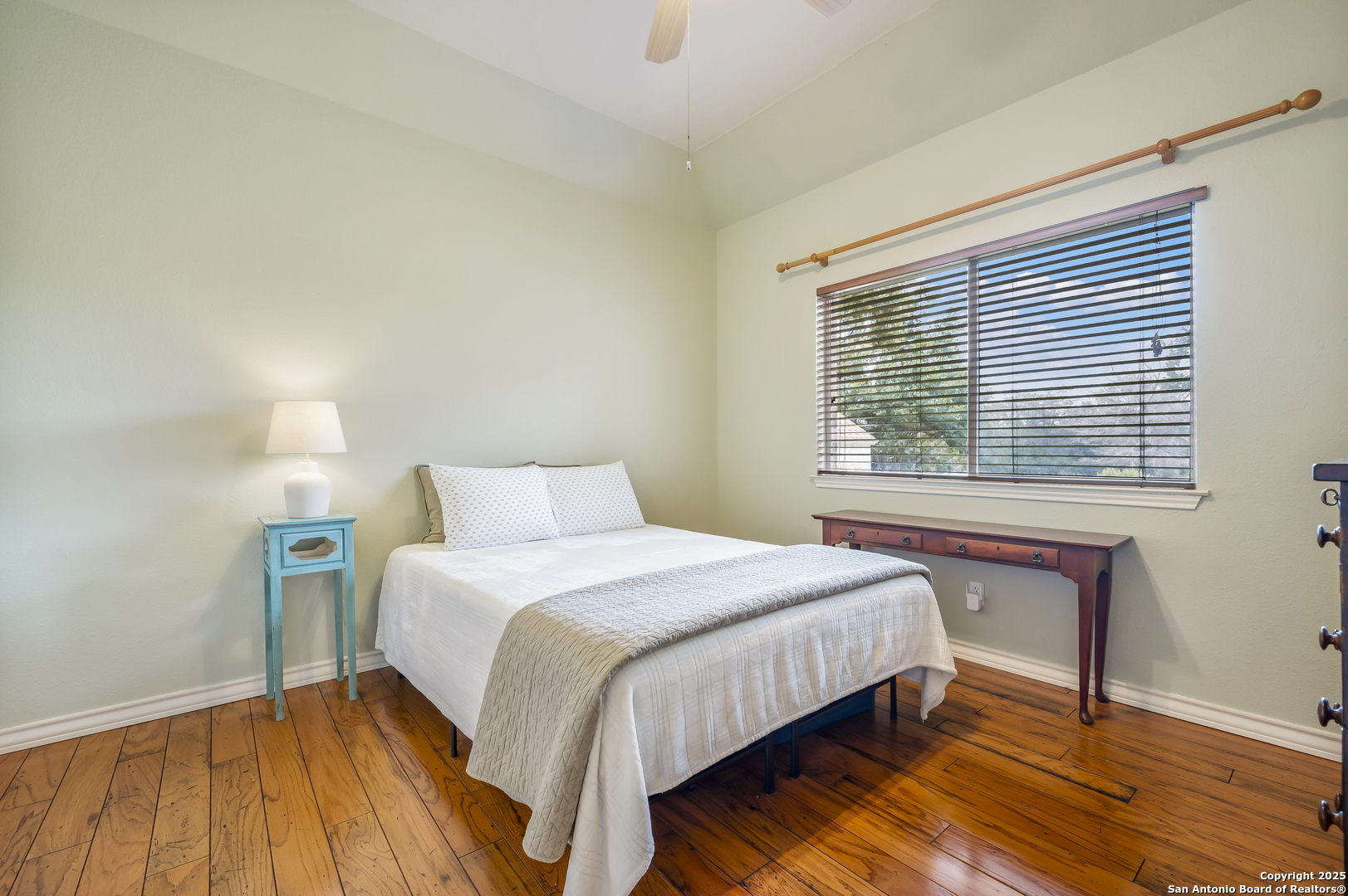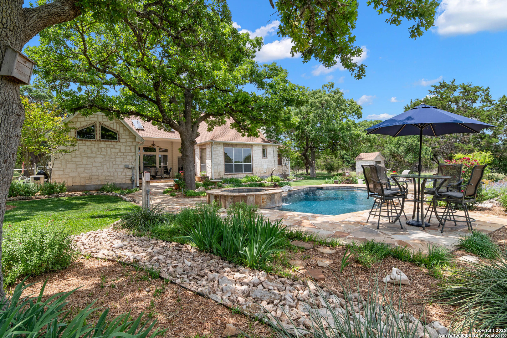Tucked away on 4.17 private acres in the prestigious Cordillera Ranch, this stunning single-story residence offers a rare blend of tranquility and natural beauty. Mature trees, native vegetation, and sprawling lawns create a picturesque, park-like setting that welcomes you home! A meandering driveway with a circular drive and multiple parking pads provide ample space for hosting family and guests. From the moment you step inside, you're greeted with views of the serene backyard oasis. The thoughtfully designed floor plan showcases warm hardwood and tile flooring, arched entries, ceiling treatments, and an abundance of windows and transoms that flood the home with natural light. As the heart of the home, the spacious great room is complete with a wood-burning fireplace and seamlessly flows into the island kitchen and casual dining area-perfect for everyday living and entertaining. The kitchen features a wraparound breakfast bar, extensive workspace and cabinetry, an induction cooktop with built-in oven, an additional Jenn-Air oven, and a built-in microwave. The home is also plumbed for gas, offering easy conversion for your culinary preferences. For larger occasions, the generously sized dining room easily accommodates up to ten guests, making it ideal for Sunday brunches or holiday gatherings. The owner's suite boasts a soaring vaulted ceiling, outdoor access, and a en-suite bath with separate vanities, a jetted tub, and a walk-in shower. Three additional bedrooms-each with walk-in closets-are located on the main level, along with a dedicated study and a utility room complete with a sink. The only room upstairs is a versatile room that awaits your personal touch-perfect for a media room, gym or craft studio. Step outside to discover a breathtaking backyard designed for year-round enjoyment. The covered patio offers a comfortable space for al fresco dining and relaxation, while winding flagstone pathways lead to a sparkling pool with a soothing waterfall and adjoining spa. Multiple lounging areas invite you to bask in the sun or simply unwind with a good book. Vibrant landscaping and blooming flowers add bursts of color and enhance the serene ambiance. The expansive lawns offer endless opportunities for play and leisure- including space for your horses to roam! This property invites you to live a peaceful, private, lifestyle while being immersed in the natural beauty of the Texas Hill Country.