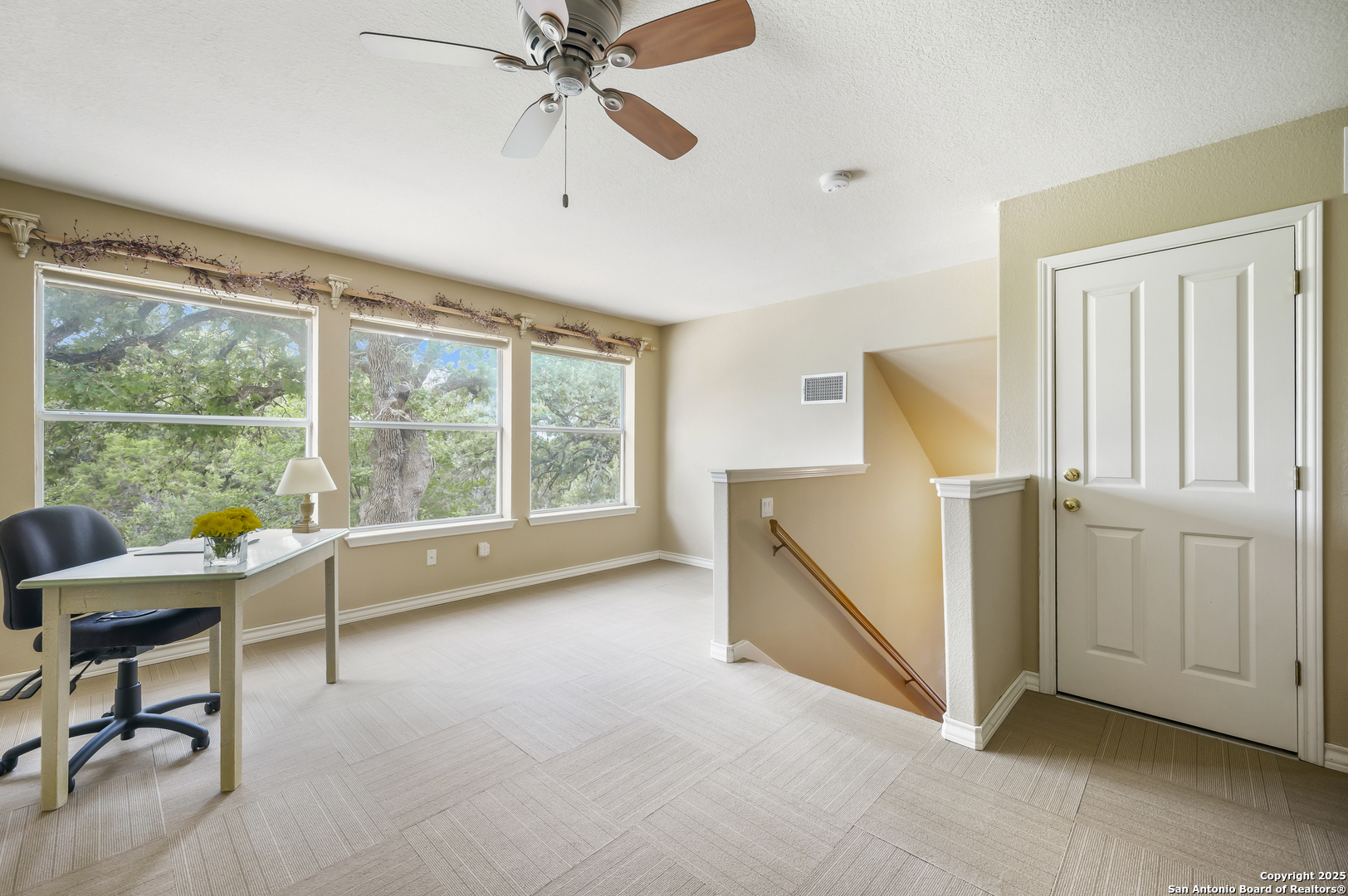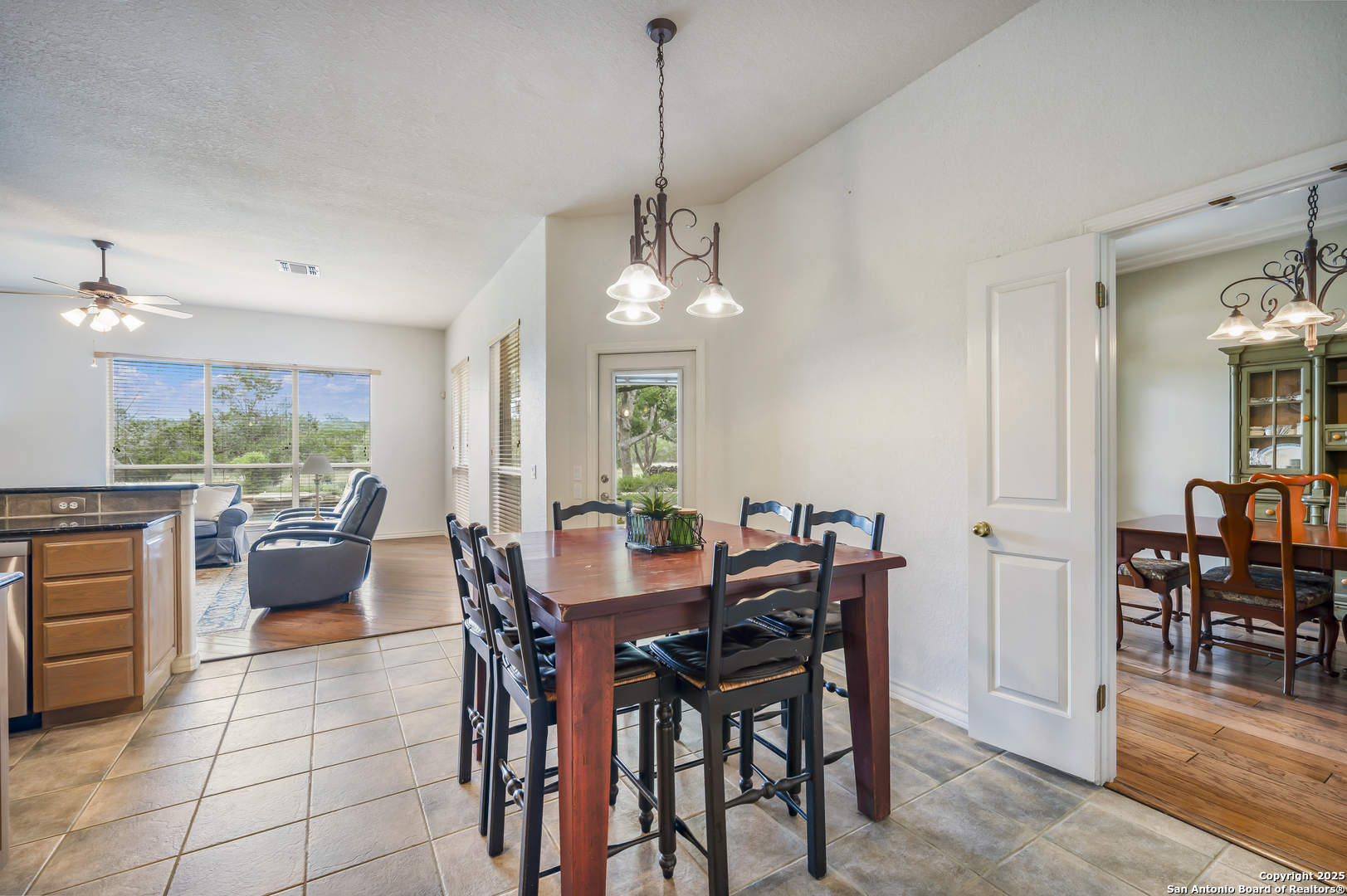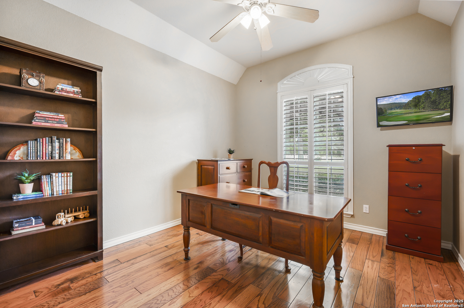 Tucked away on 4.17 private acres in the prestigious Cordillera Ranch, this stunning single-story residence offers a rare blend of tranquility and natural beauty. Mature trees, native vegetation, and sprawling lawns create a picturesque, park-like setting that welcomes you home! A meandering driveway with a circular drive and multiple parking pads provide ample space for hosting family and guests. From the moment you step inside, you're greeted with views of the serene backyard oasis. The thoughtfully designed floor plan showcases warm hardwood and tile flooring, arched entries, ceiling treatments, and an abundance of windows and transoms that flood the home with natural light. As the heart of the home, the spacious great room is complete with a wood-burning fireplace and seamlessly flows into the island kitchen and casual dining area-perfect for everyday living and entertaining. The kitchen features a wraparound breakfast bar, extensive workspace and cabinetry, an induction cooktop with built-in oven, an additional Jenn-Air oven, and a built-in microwave. The home is also plumbed for gas, offering easy conversion for your culinary preferences. For larger occasions, the generously sized dining room easily accommodates up to ten guests, making it ideal for Sunday brunches or holiday gatherings. The owner's suite boasts a soaring vaulted ceiling, outdoor access, and a en-suite bath with separate vanities, a jetted tub, and a walk-in shower. Three additional bedrooms-each with walk-in closets-are located on the main level, along with a dedicated study and a utility room complete with a sink. The only room upstairs is a versatile room that awaits your personal touch-perfect for a media room, gym or craft studio. Step outside to discover a breathtaking backyard designed for year-round enjoyment. The covered patio offers a comfortable space for al fresco dining and relaxation, while winding flagstone pathways lead to a sparkling pool with a soothing waterfall and adjoining spa. Multiple lounging areas invite you to bask in the sun or simply unwind with a good book. Vibrant landscaping and blooming flowers add bursts of color and enhance the serene ambiance. The expansive lawns offer endless opportunities for play and leisure- including space for your horses to roam! This property invites you to live a peaceful, private, lifestyle while being immersed in the natural beauty of the Texas Hill Country.