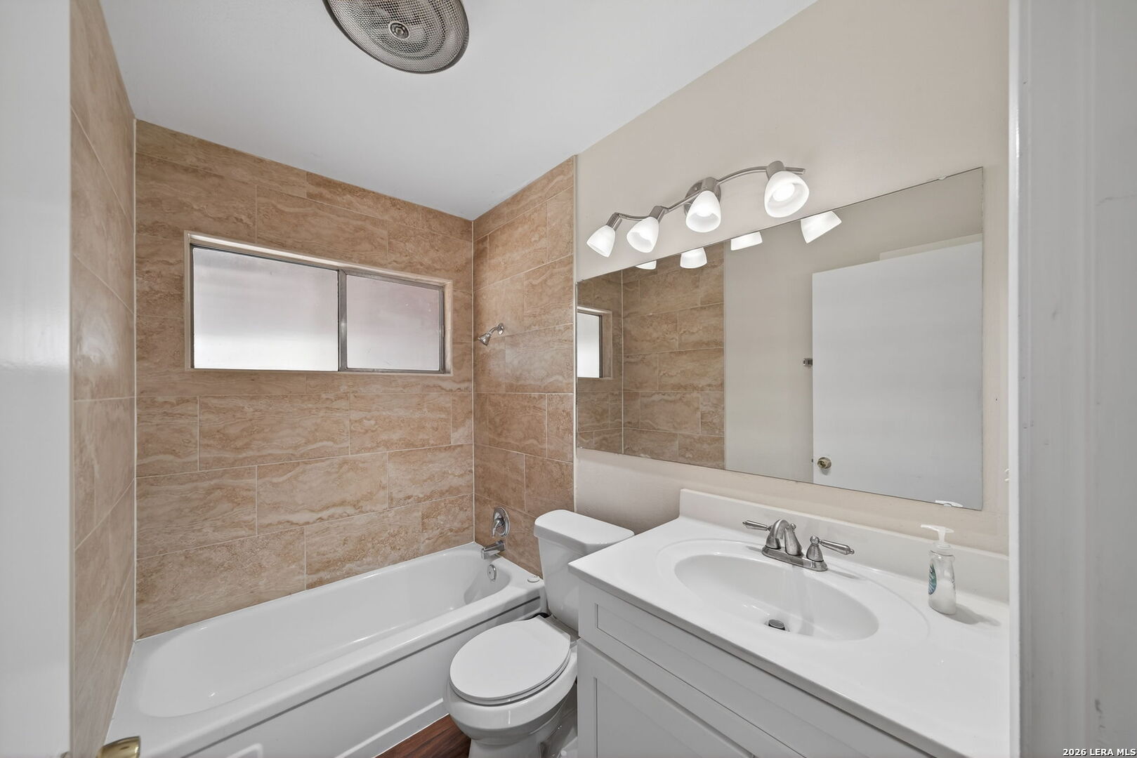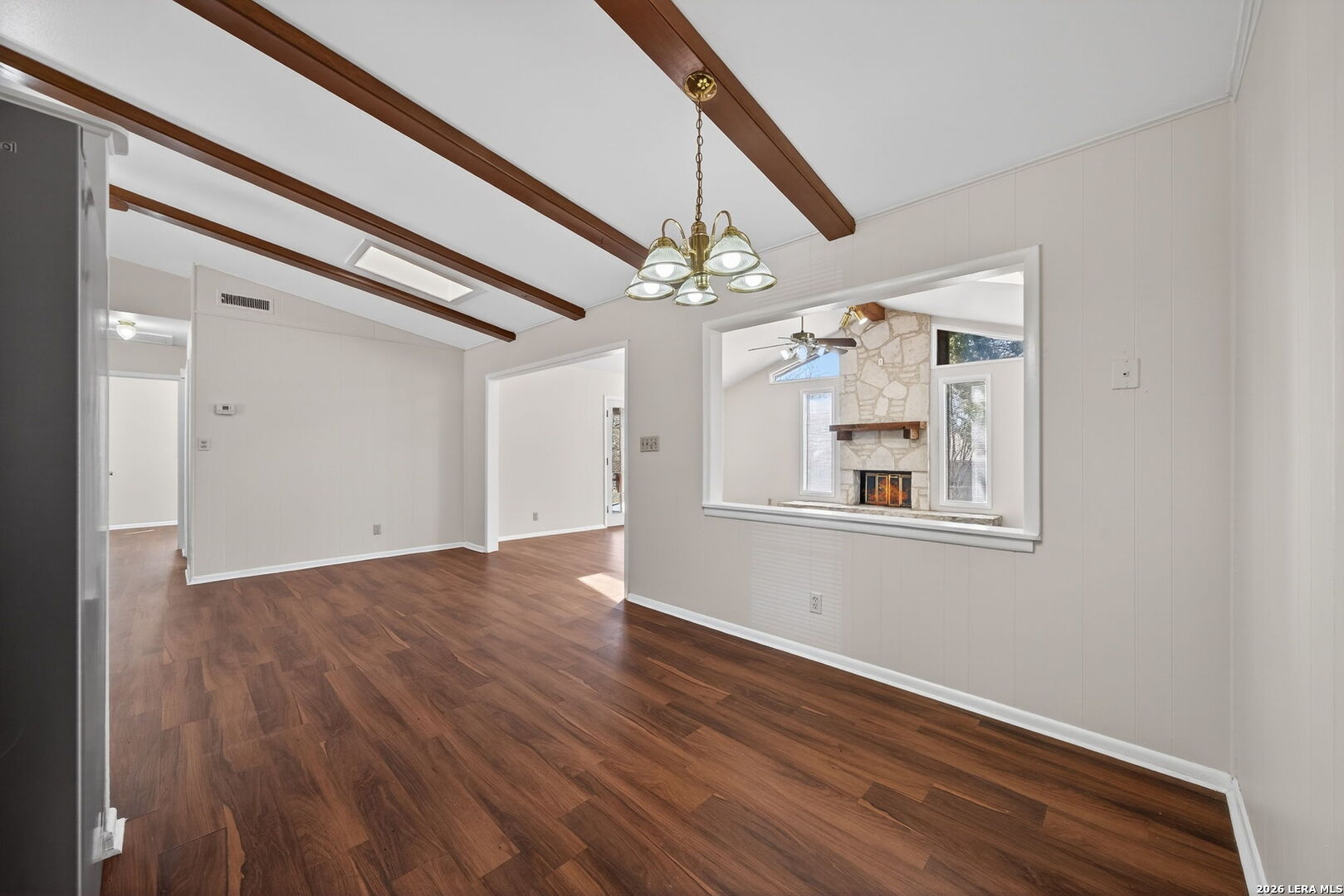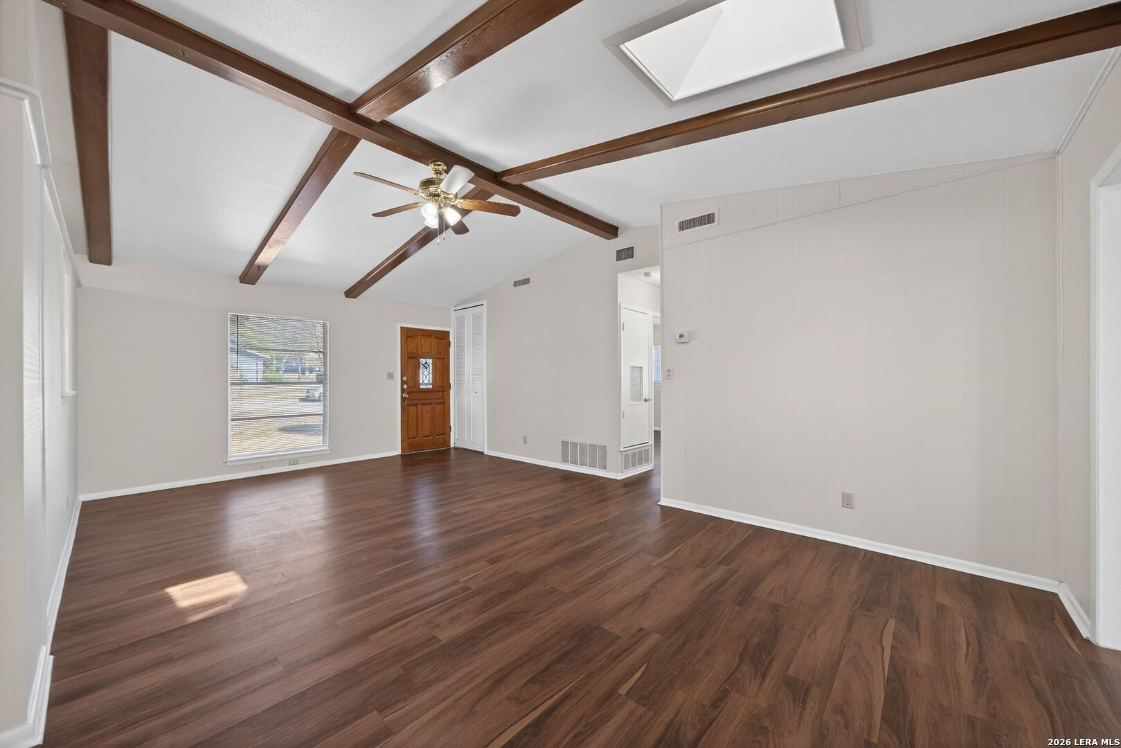 Welcome to this beautifully updated 3 bed, 2 bath home nestled in the heart of Live Oak! Conveniently located minutes from IKEA, many new restaurants and retail as well as The Forum, and Randolph AFB, with easy access to community amenities including the City of Live Oak pool, parks, playgrounds, skate ramps, and a scenic lake. Inside, you'll be greeted by stunning exposed beams, a cozy wood-burning rock fireplace, and two generous living areas - all with no carpet, featuring luxury vinyl wood-look flooring and ceramic tile throughout. The fully updated kitchen boasts brand new granite countertops, tile backsplash, and stainless-steel appliances including a smooth-top range, range hood, dishwasher, and refrigerator. A versatile flex room off the kitchen is perfect for a home office, gym, or playroom, while a spacious utility room offers additional workspace potential. The primary bedroom is privately situated away from secondary bedrooms and features a walk-in closet. One secondary bedroom includes charming floor-to-ceiling built-in bookshelves. Additional upgrades include a 2-year-old roof, fresh interior paint, new blinds, updated lighting and bathroom fixtures, new vanities, and refreshed shower/tub surrounds. Step outside to a large backyard with mature trees, a storage shed, and a covered patio/deck - ideal for entertaining and family gatherings. The home has space for a 2 car garage, but one space is currently being used as more of a finished out space so it is convertible back to a 2 car very easily, but would lose approximately 100SF of the currently finished out space in garage space 1. It's a great starter home or rental and at a very affordable price.