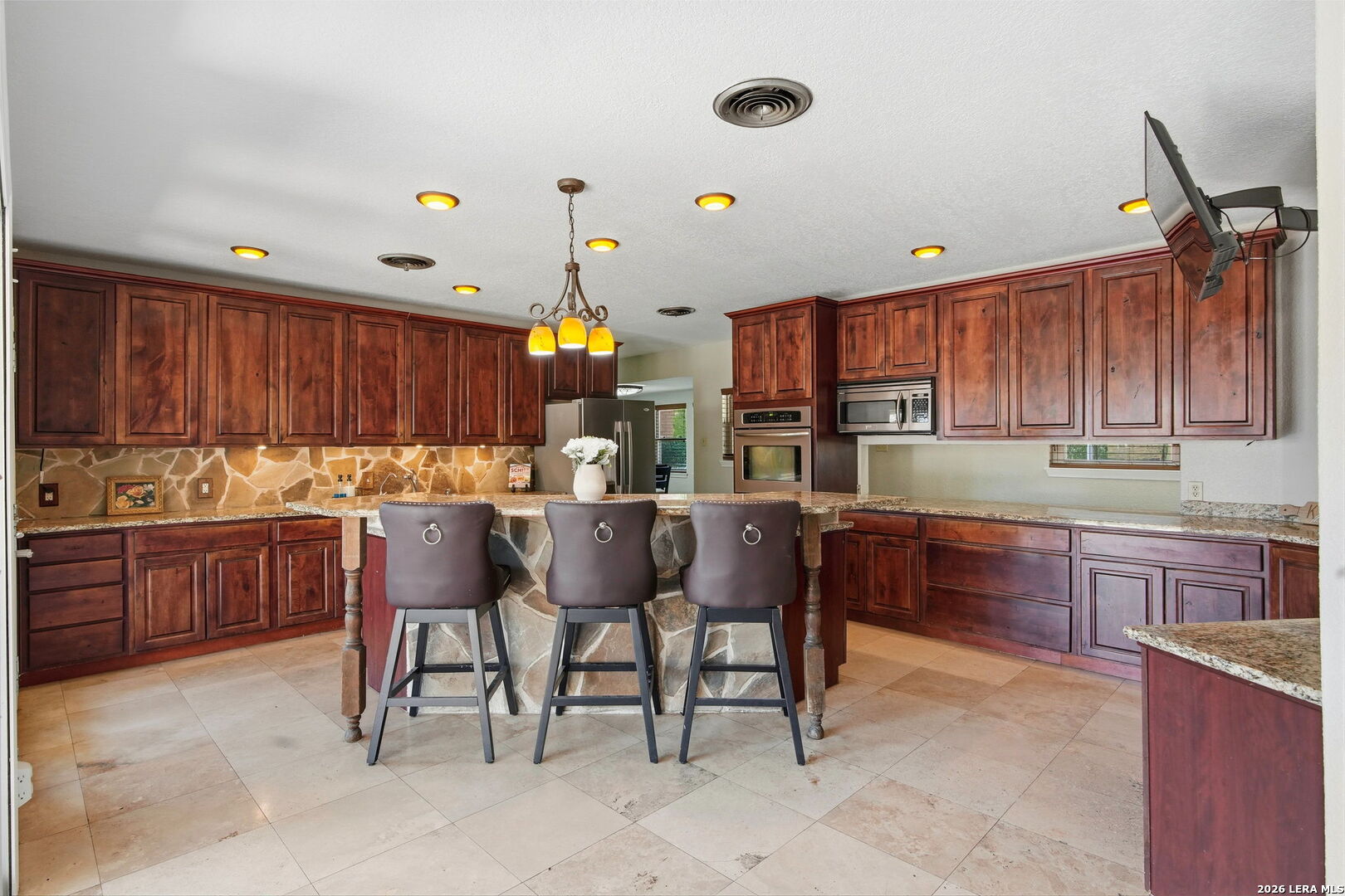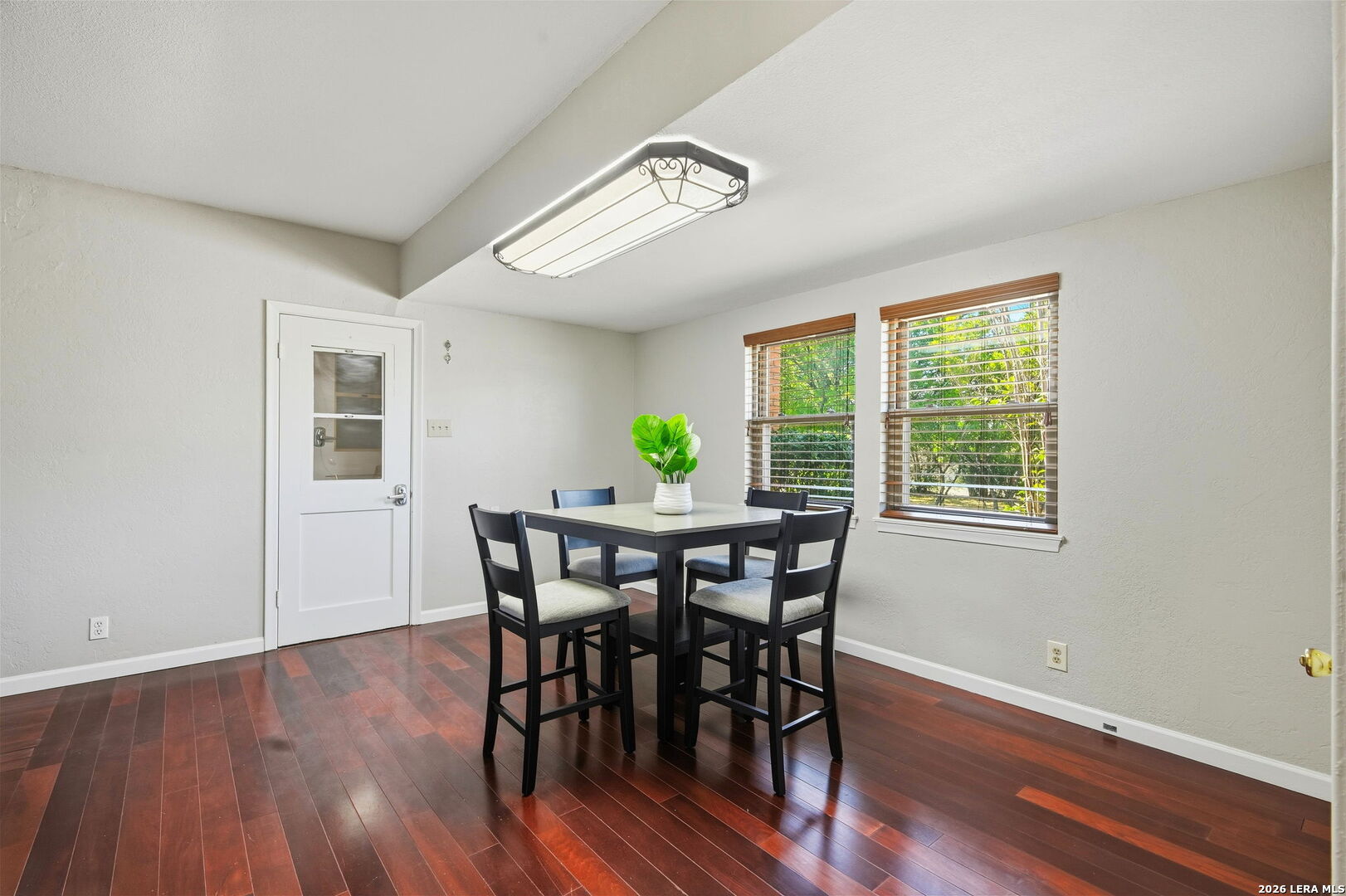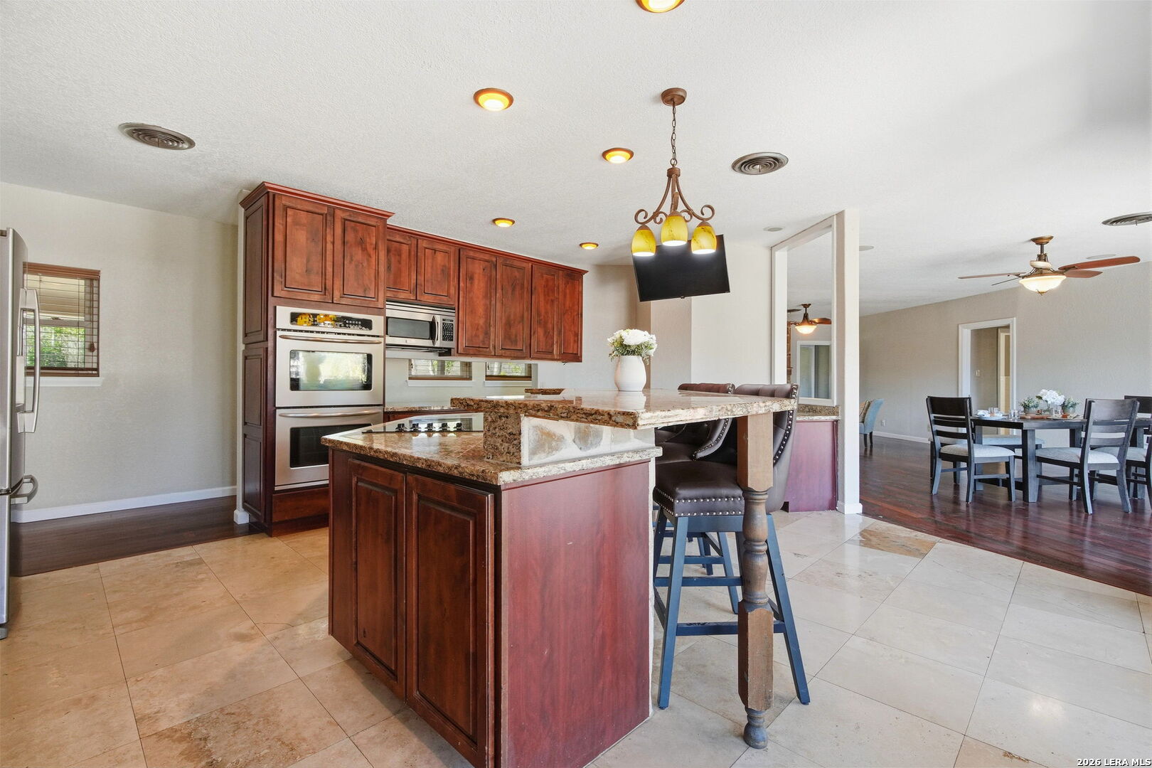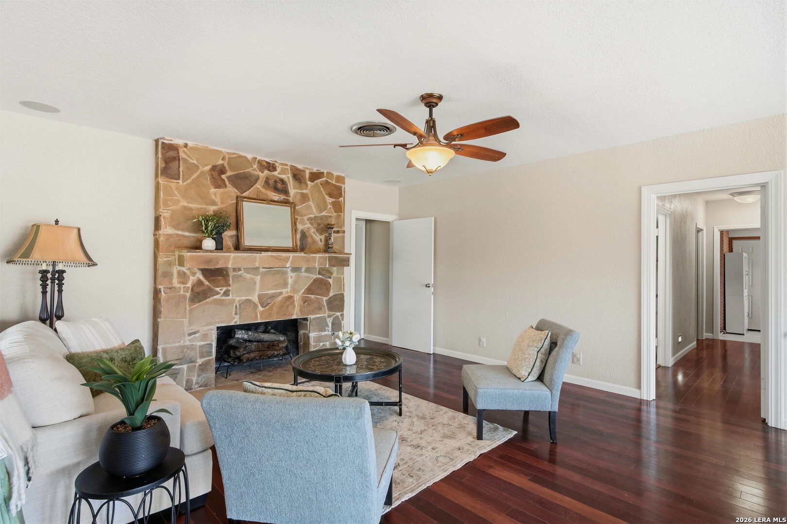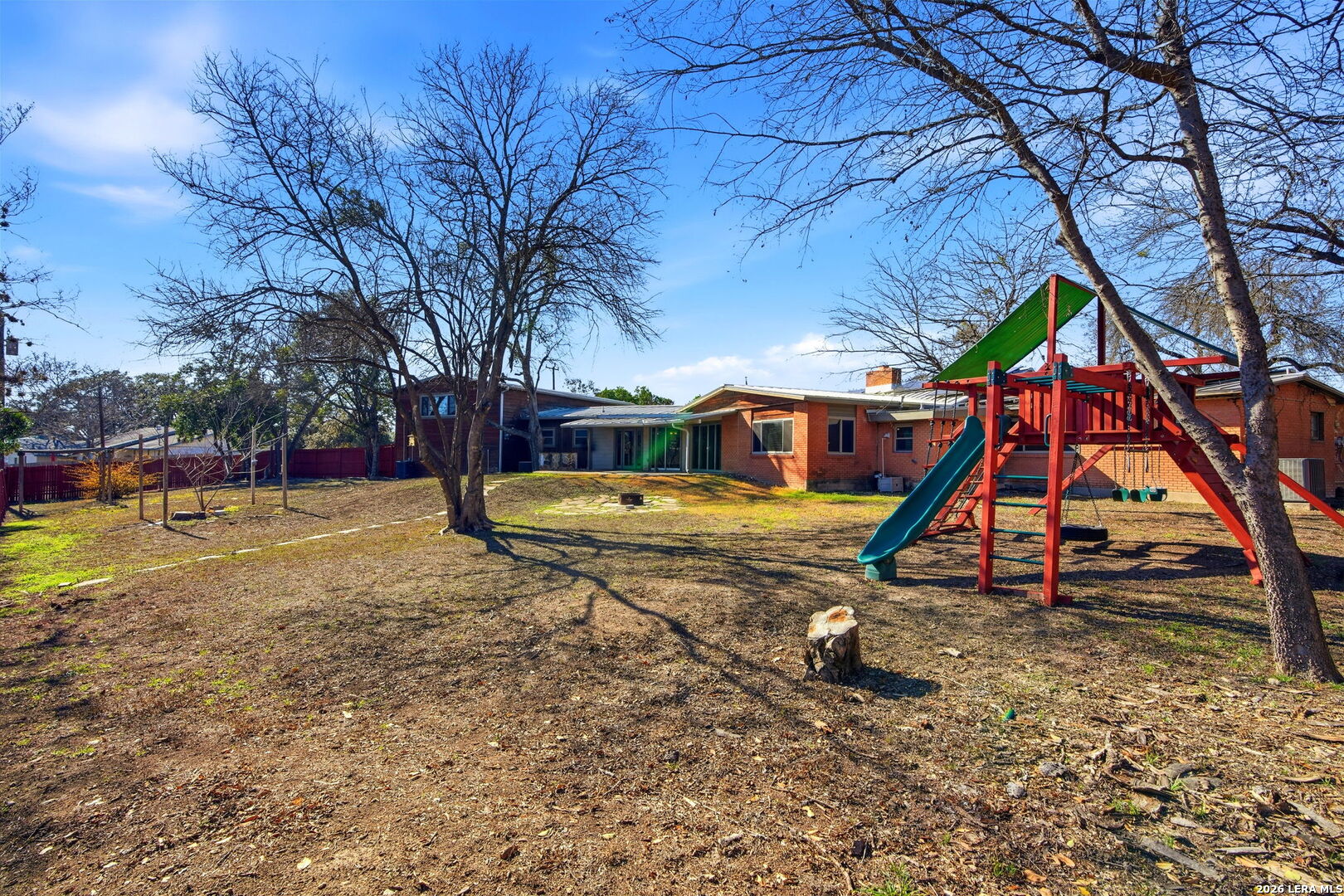 Beautifully appointed and timeless, this sprawling Castle Hills estate is ideally positioned on a prominent corner lot in one of San Antonio's most established communities. Offering 5 spacious bedrooms and 4 full bathrooms, plus a versatile bonus space above the 3-car garage that provides exceptional flexibility for additional bedrooms, a private office, gym or media room. Designed for both everyday living and effortless entertaining, the open-concept kitchen flows seamlessly into the main living area and features granite countertops, custom cabinetry, double stainless steel ovens, a striking rock backsplash and direct access to the backyard. The expansive living room is anchored by a stunning rock fireplace and enhanced with built-in speakers for an inviting, connected atmosphere. The generously sized primary suite offers double closets, room for a sitting area or workspace and a beautiful ensuite bath complete with dual vanities and an oversized double-headed walk-in shower. In addition, a newly renovated secondary bathroom adds fresh, modern appeal. Recent upgrades provide both peace of mind and energy efficiency, including a new HVAC system, metal roof, solar panels, water softener, and double-paned windows. The interior has been freshly repainted and features no carpet throughout, creating a clean, move-in-ready feel. A rare opportunity to own a mid century classic, yet thoughtfully updated Castle Hills property offering space, flexibility and long-term value, this one is truly a must-see.