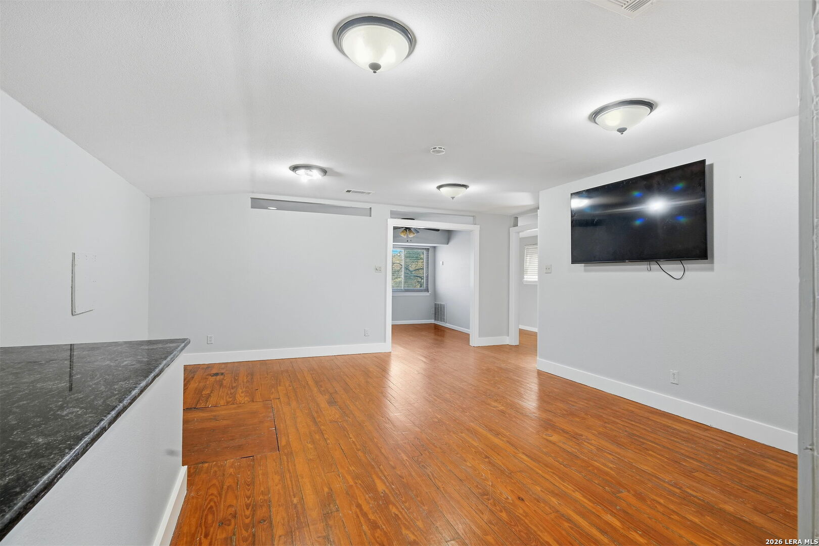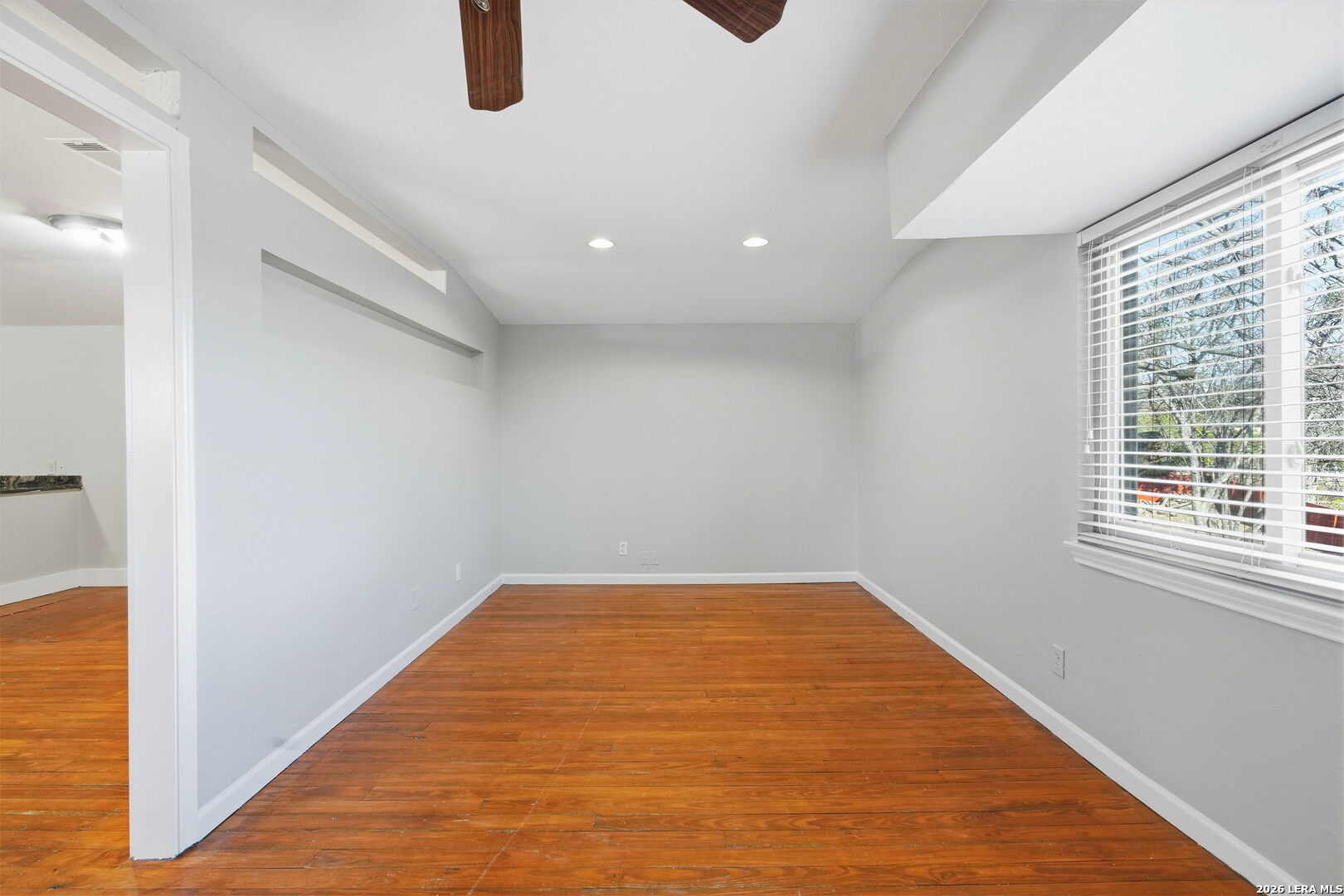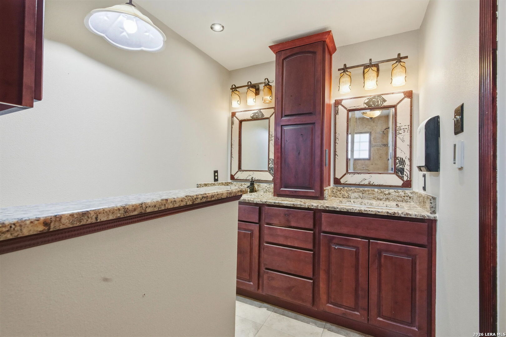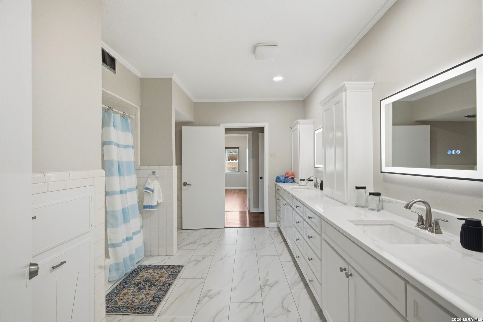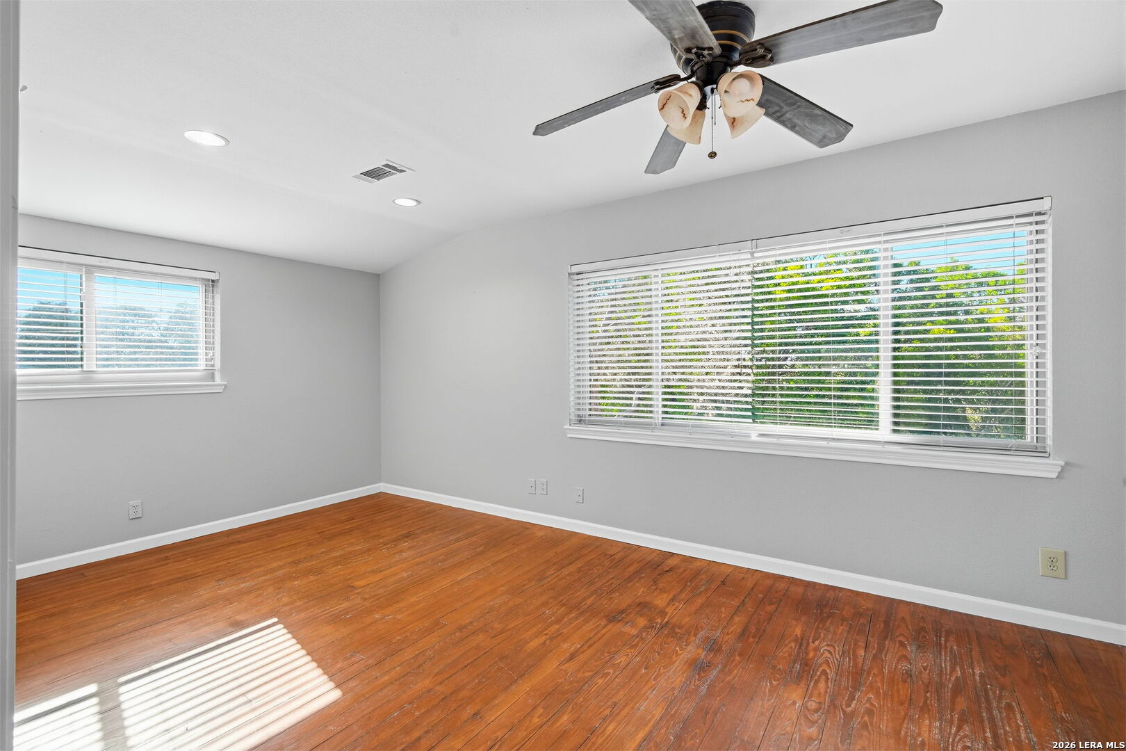 Beautifully appointed and timeless, this sprawling Castle Hills estate is ideally positioned on a prominent corner lot in one of San Antonio's most established communities. Offering 5 spacious bedrooms and 4 full bathrooms, plus a versatile bonus space above the 3-car garage that provides exceptional flexibility for additional bedrooms, a private office, gym or media room. Designed for both everyday living and effortless entertaining, the open-concept kitchen flows seamlessly into the main living area and features granite countertops, custom cabinetry, double stainless steel ovens, a striking rock backsplash and direct access to the backyard. The expansive living room is anchored by a stunning rock fireplace and enhanced with built-in speakers for an inviting, connected atmosphere. The generously sized primary suite offers double closets, room for a sitting area or workspace and a beautiful ensuite bath complete with dual vanities and an oversized double-headed walk-in shower. In addition, a newly renovated secondary bathroom adds fresh, modern appeal. Recent upgrades provide both peace of mind and energy efficiency, including a new HVAC system, metal roof, solar panels, water softener, and double-paned windows. The interior has been freshly repainted and features no carpet throughout, creating a clean, move-in-ready feel. A rare opportunity to own a mid century classic, yet thoughtfully updated Castle Hills property offering space, flexibility and long-term value, this one is truly a must-see.