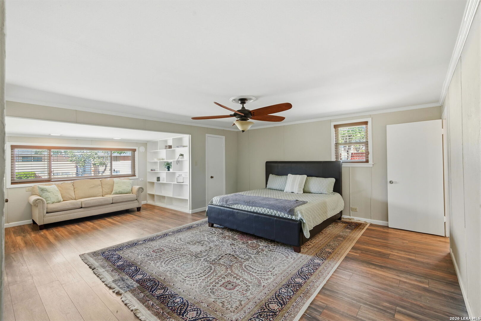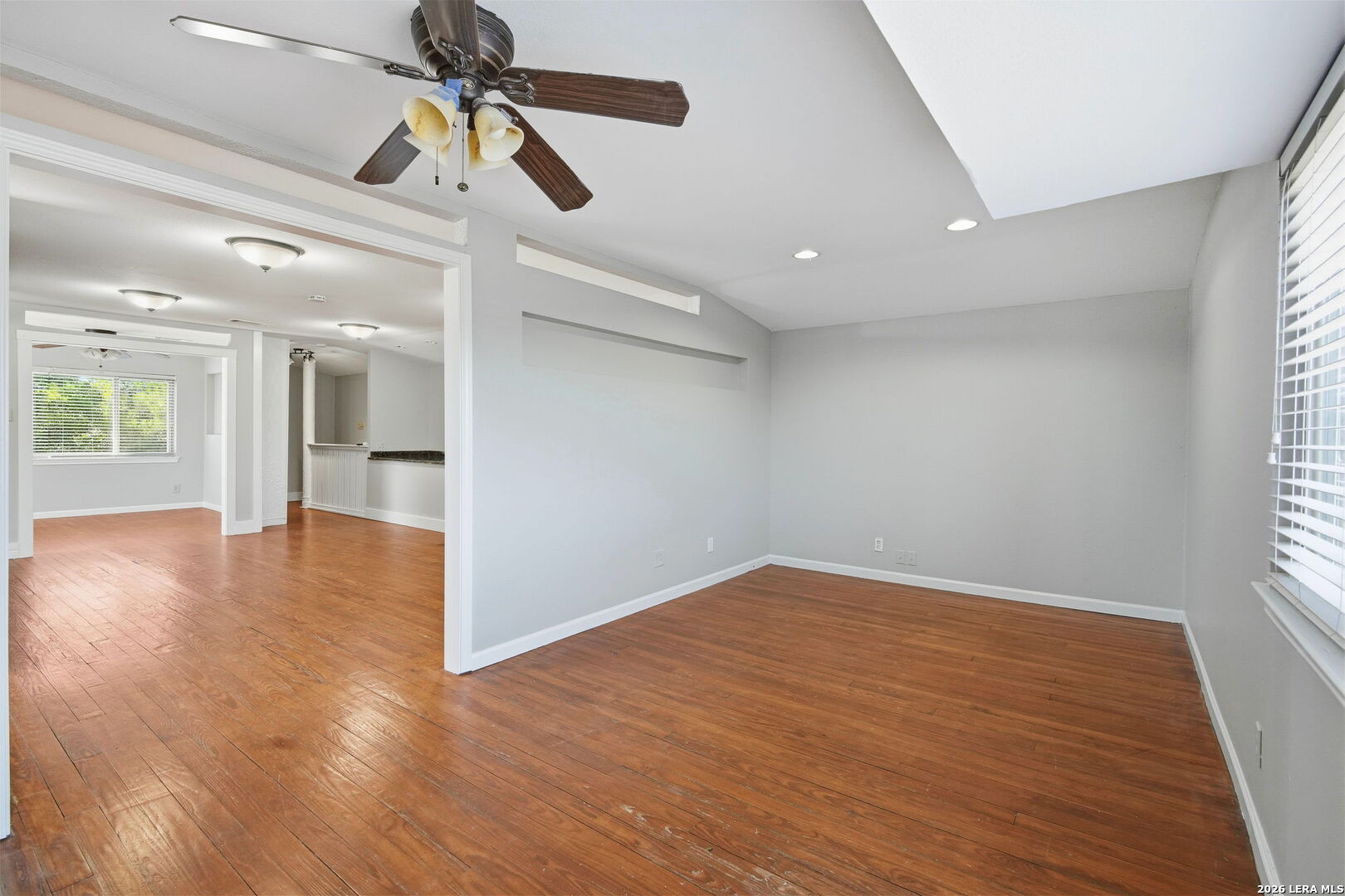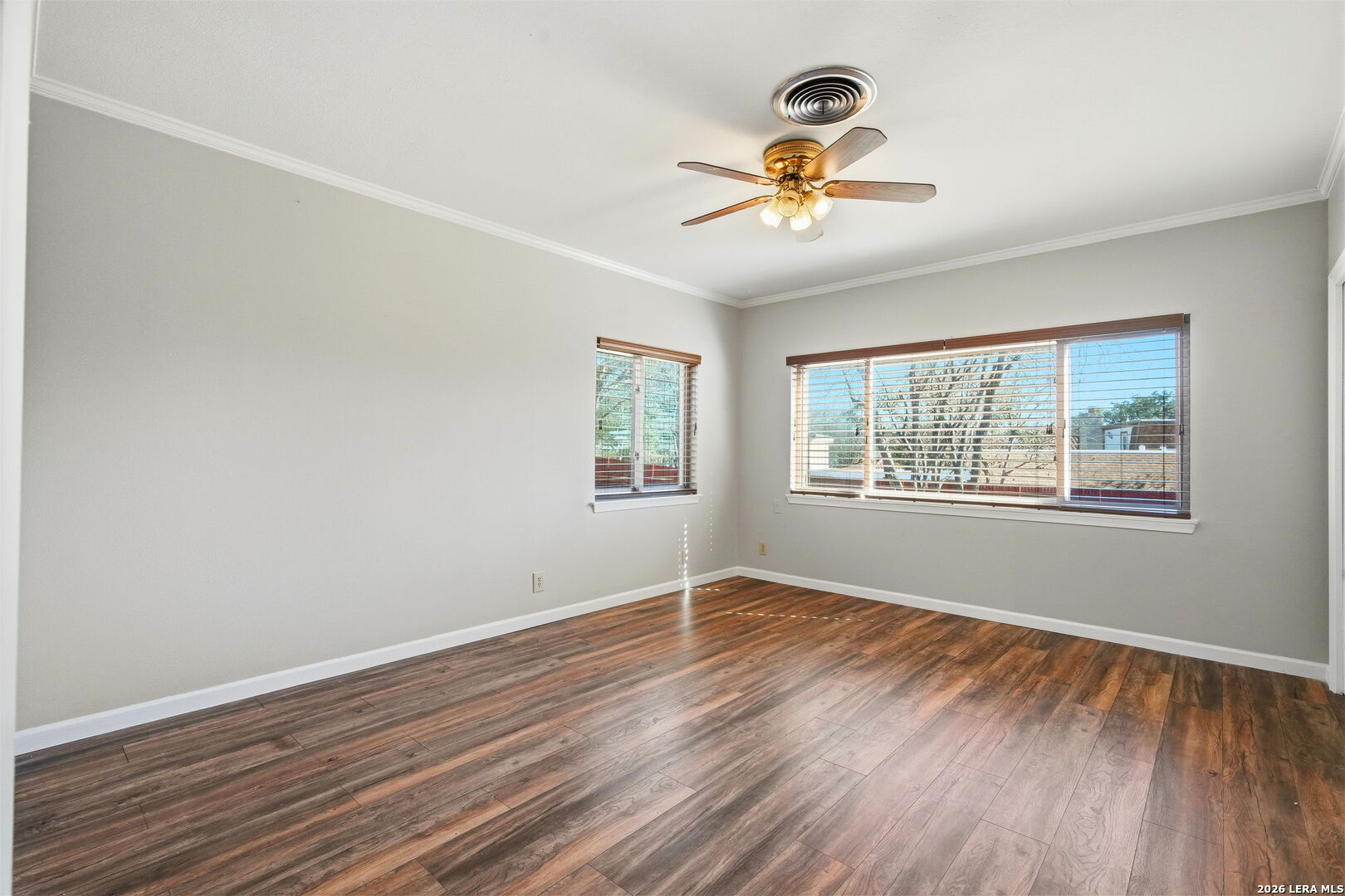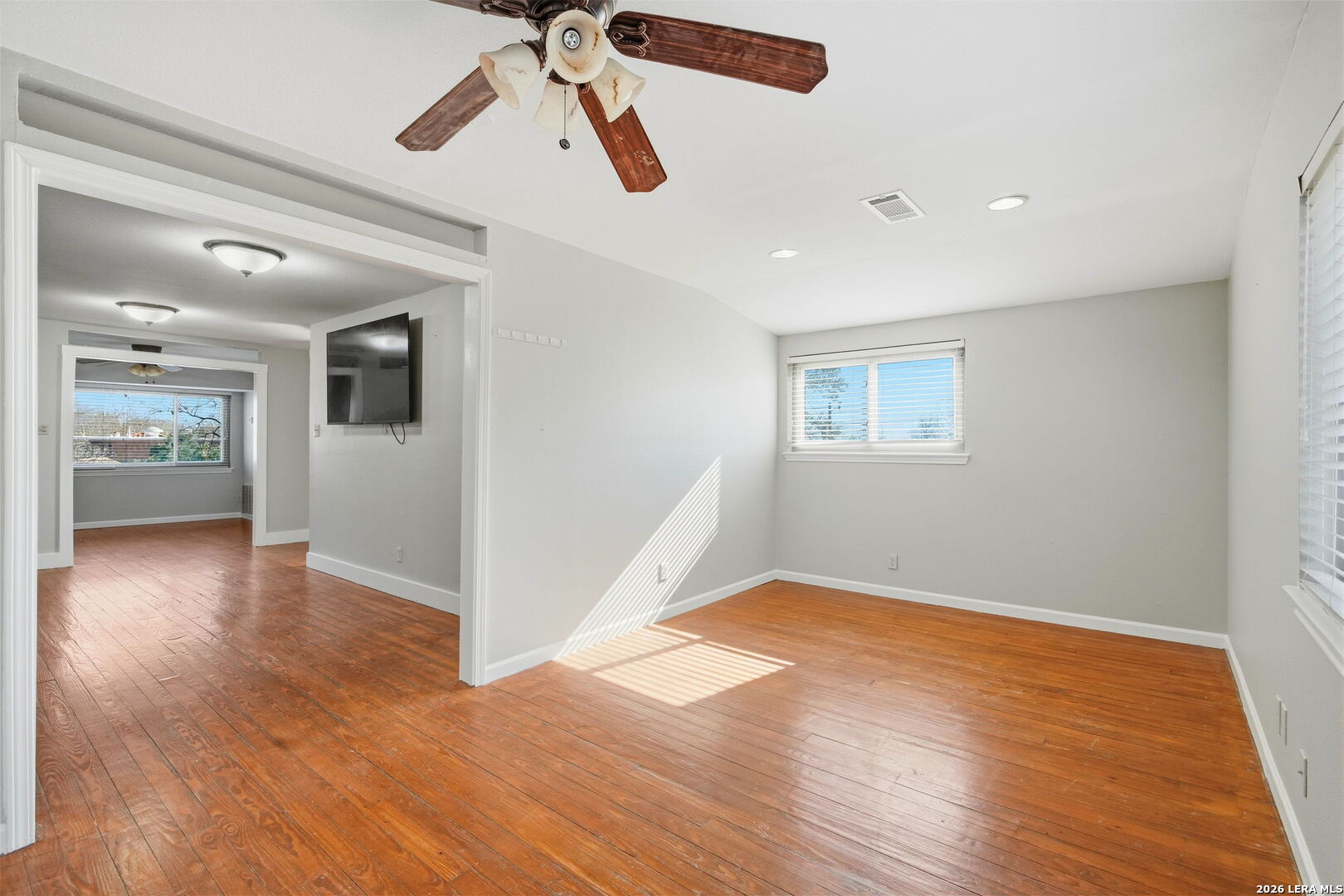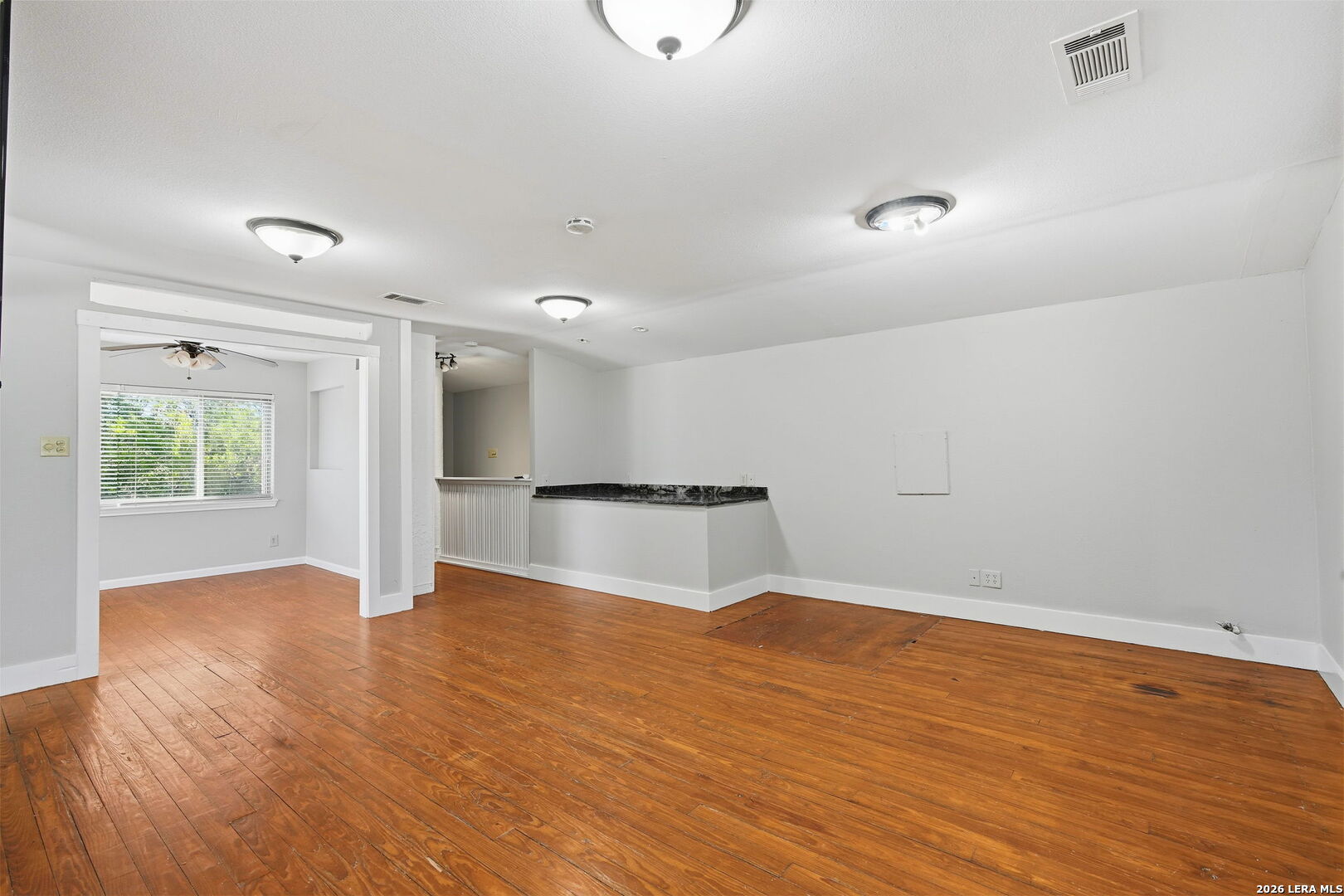 Beautifully appointed and timeless, this sprawling Castle Hills estate is ideally positioned on a prominent corner lot in one of San Antonio's most established communities. Offering 5 spacious bedrooms and 4 full bathrooms, plus a versatile bonus space above the 3-car garage that provides exceptional flexibility for additional bedrooms, a private office, gym or media room. Designed for both everyday living and effortless entertaining, the open-concept kitchen flows seamlessly into the main living area and features granite countertops, custom cabinetry, double stainless steel ovens, a striking rock backsplash and direct access to the backyard. The expansive living room is anchored by a stunning rock fireplace and enhanced with built-in speakers for an inviting, connected atmosphere. The generously sized primary suite offers double closets, room for a sitting area or workspace and a beautiful ensuite bath complete with dual vanities and an oversized double-headed walk-in shower. In addition, a newly renovated secondary bathroom adds fresh, modern appeal. Recent upgrades provide both peace of mind and energy efficiency, including a new HVAC system, metal roof, solar panels, water softener, and double-paned windows. The interior has been freshly repainted and features no carpet throughout, creating a clean, move-in-ready feel. A rare opportunity to own a mid century classic, yet thoughtfully updated Castle Hills property offering space, flexibility and long-term value, this one is truly a must-see.