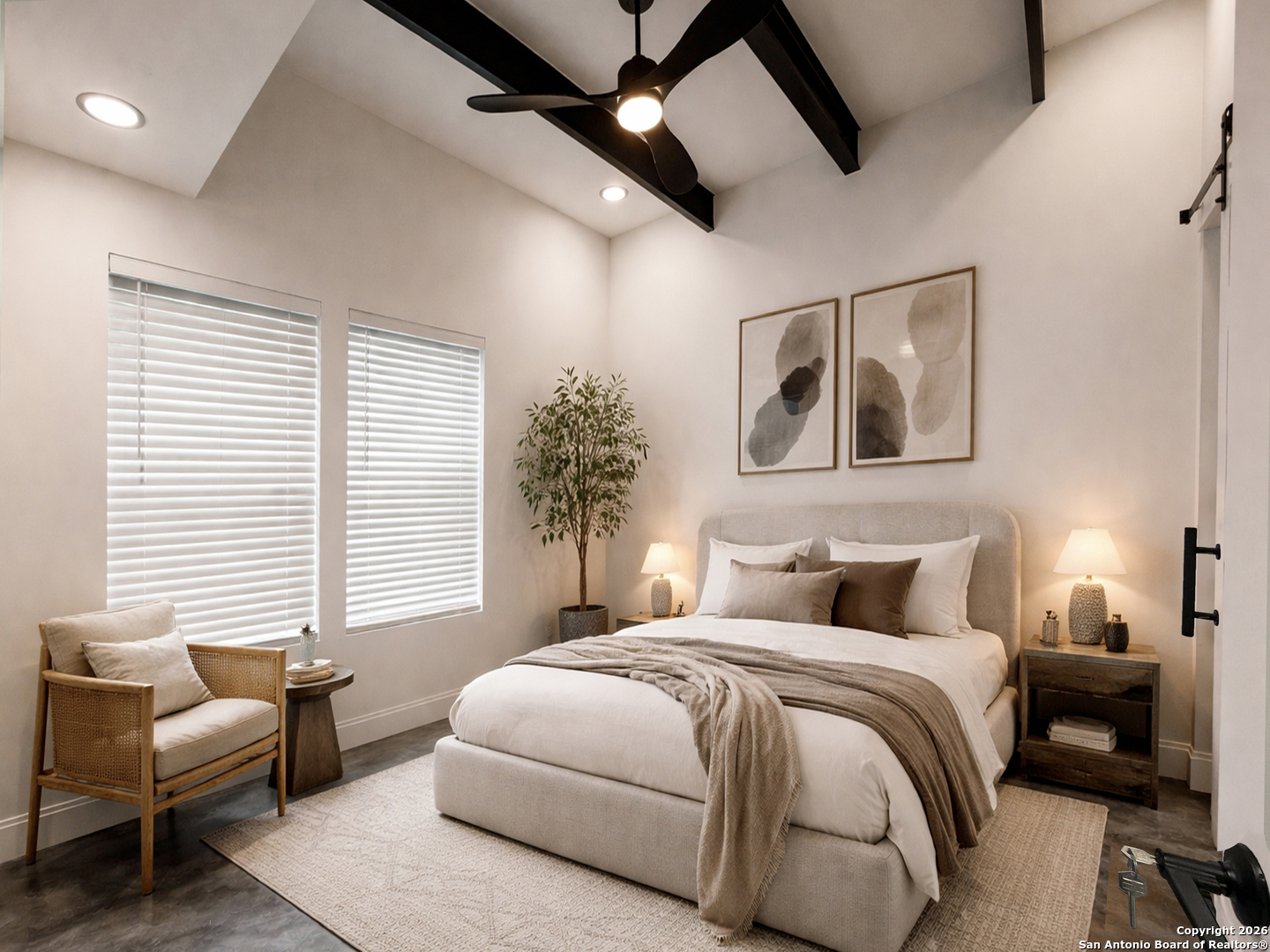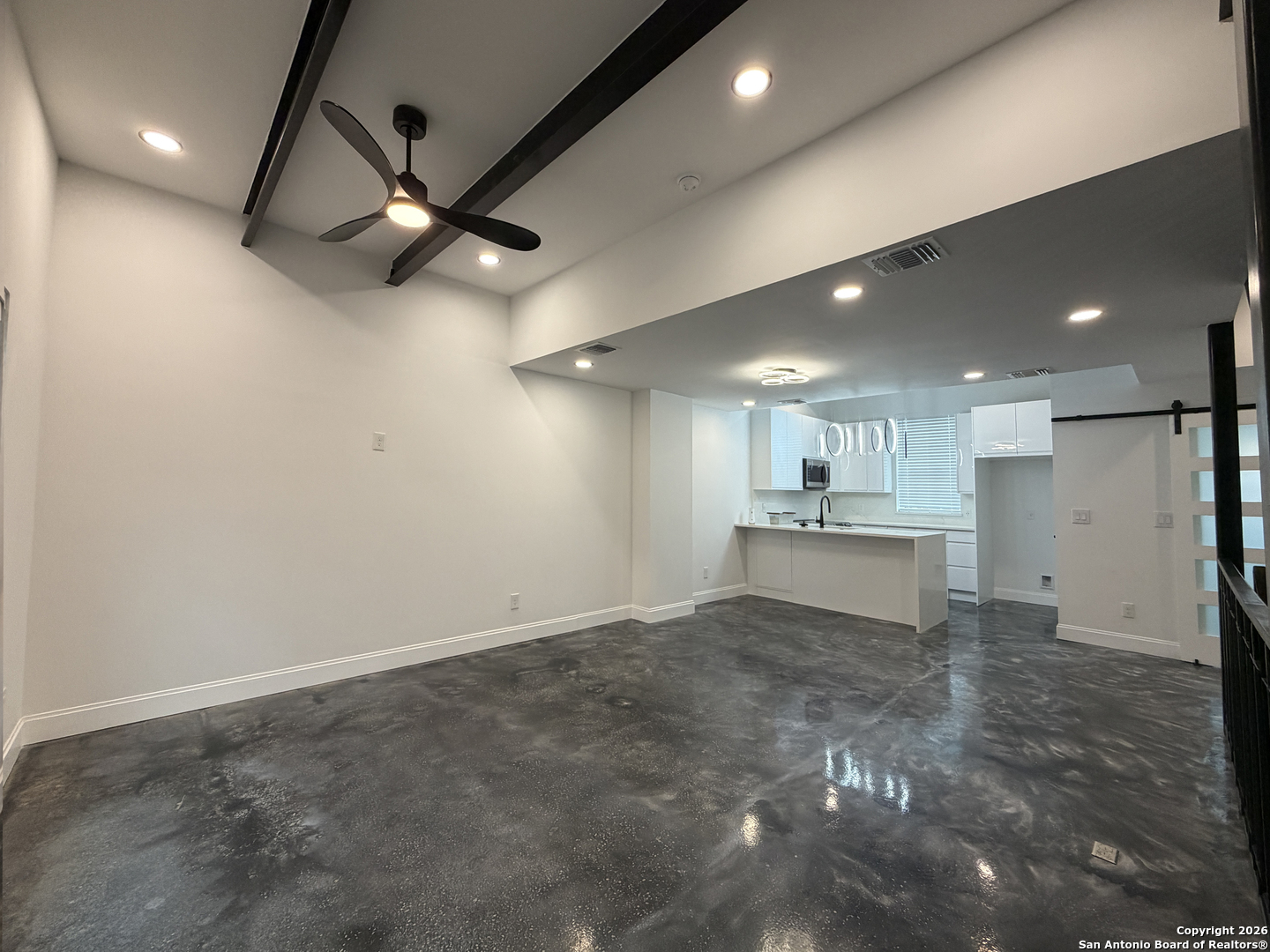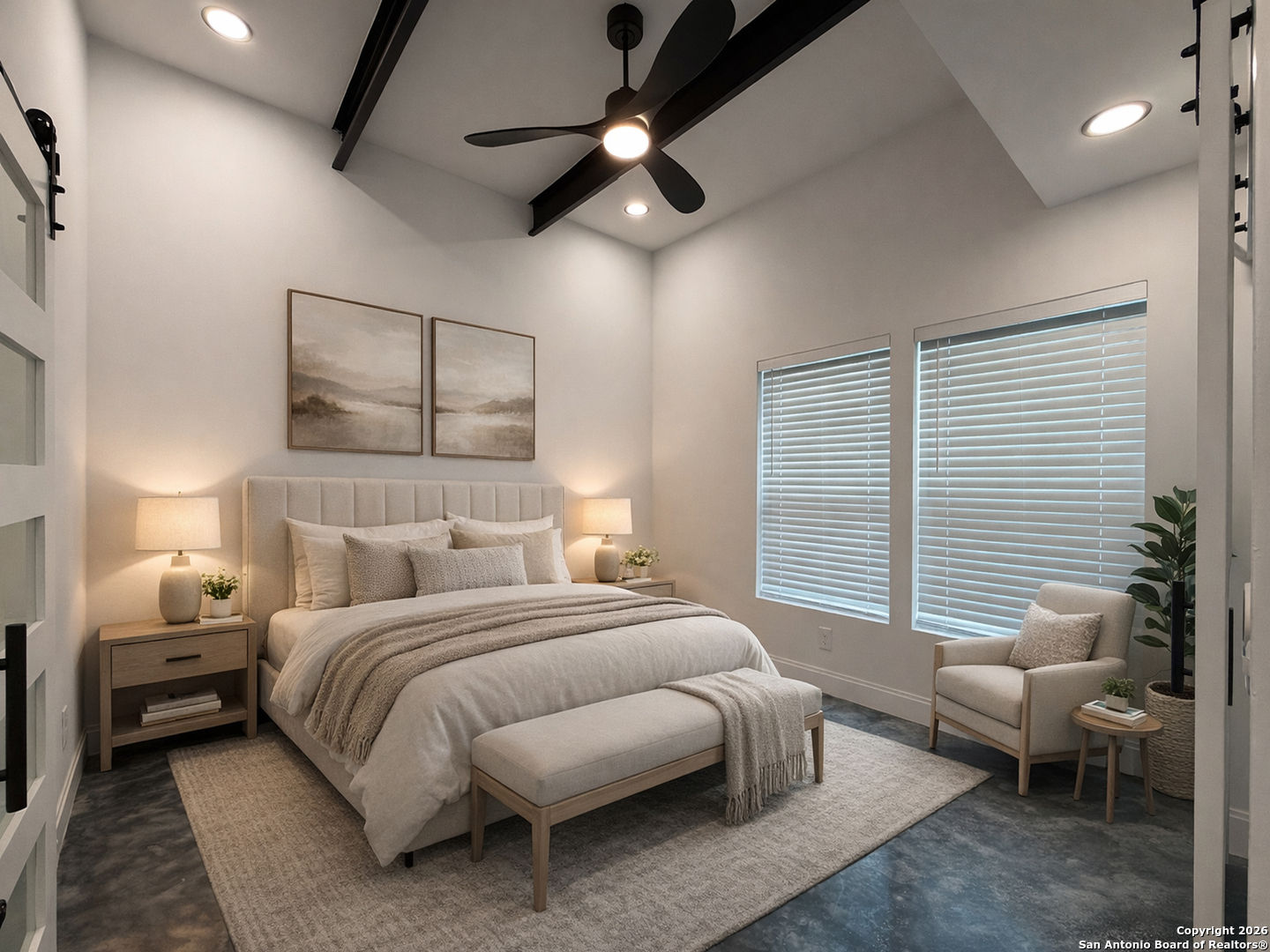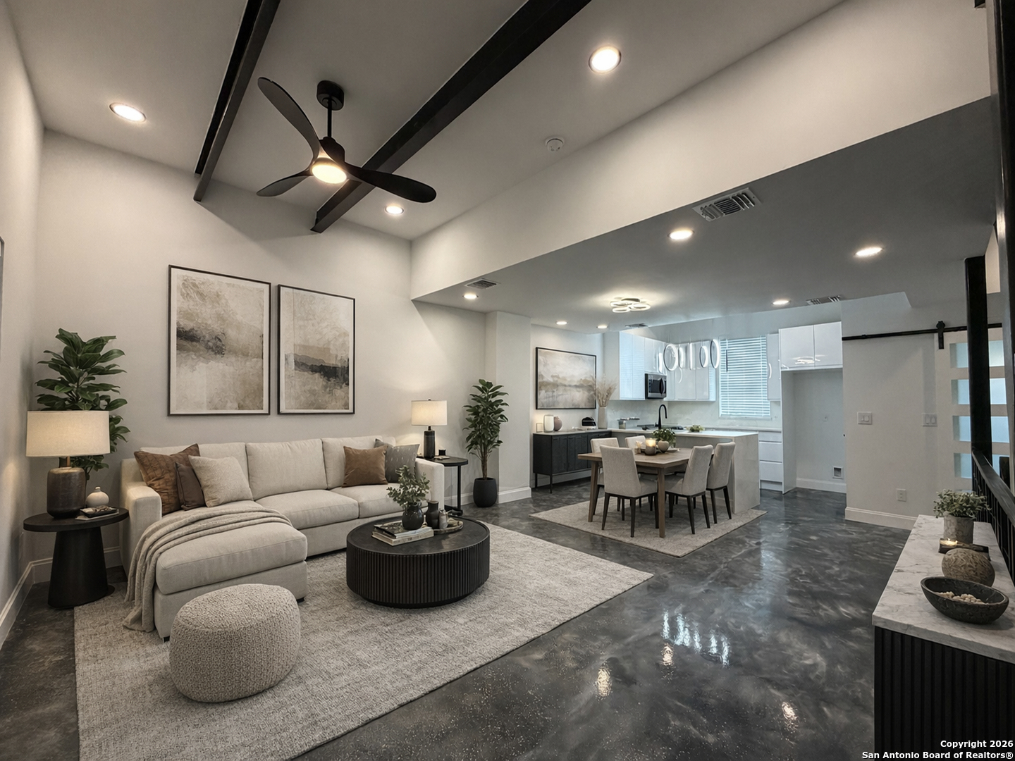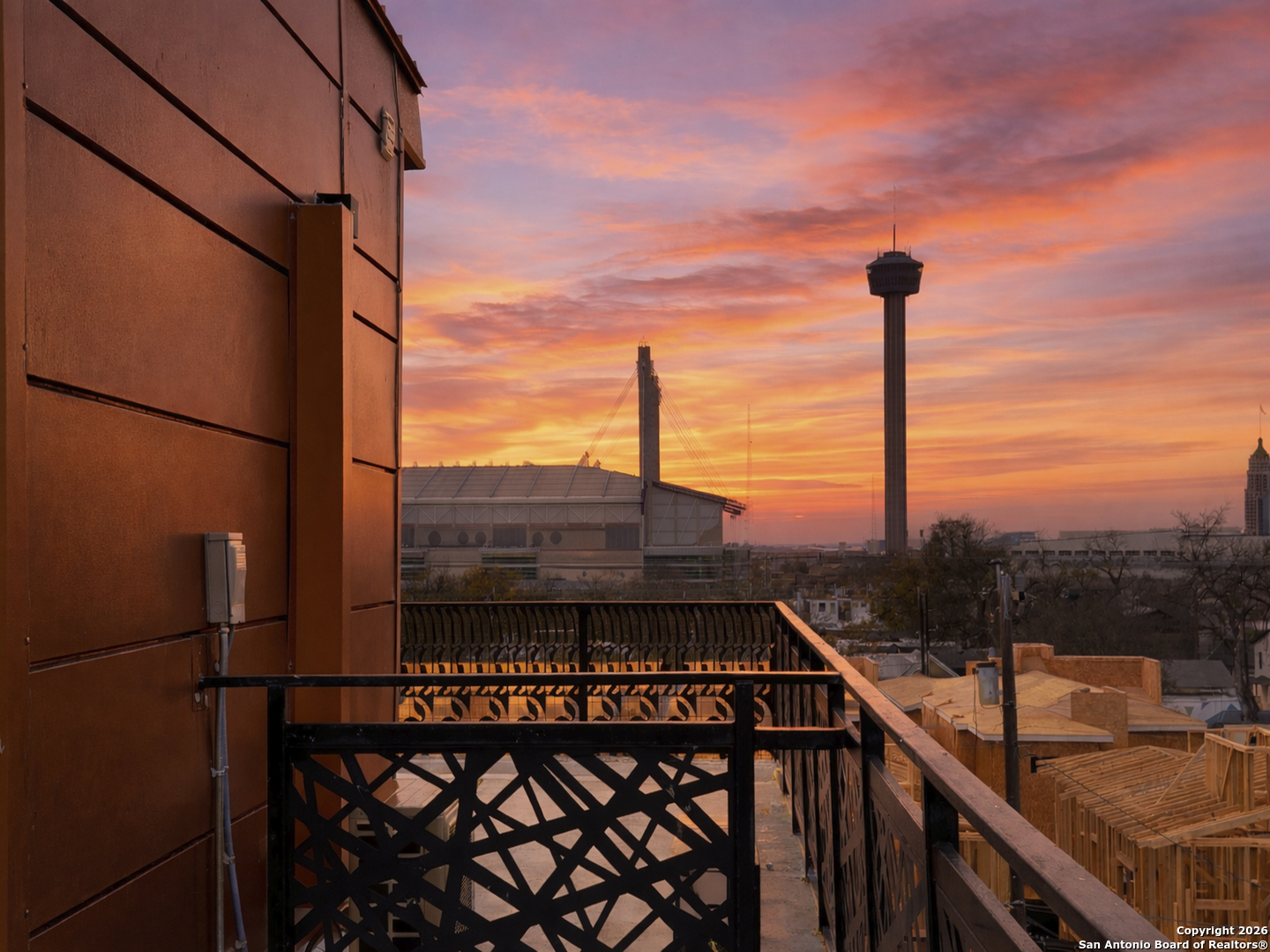 Modern Architectural new-construction home in the heart of Denver Heights. This three-story residence blends industrial design with luxury finishes and offers stunning skyline views. Polished concrete floors throughout provide a sleek contemporary look and enhanced sound insulation between levels. Each bedroom features its own private en-suite bathroom, ideal for roommates or professionals seeking privacy. The first floor includes a private guest suite with a full bathroom, perfect for visitors or a home office. The second floor offers an open-concept kitchen and living area with exposed black steel beams, designer lighting, high-gloss cabinetry, quartz countertops, and a large island, plus a convenient half bath. The third floor features two spacious bedrooms, each with its own en-suite bath. The home is crowned by a private rooftop terrace with sweeping downtown views, including the Tower of the Americas and the Alamodome, creating an ideal outdoor space for entertaining or relaxing above the city. Conveniently located near Downtown San Antonio, The Pearl, Southtown, Blue Star Arts Complex, the River Walk, major highways, dining, nightlife, and cultural destinations. Schedule your showing today and experience elevated urban living.