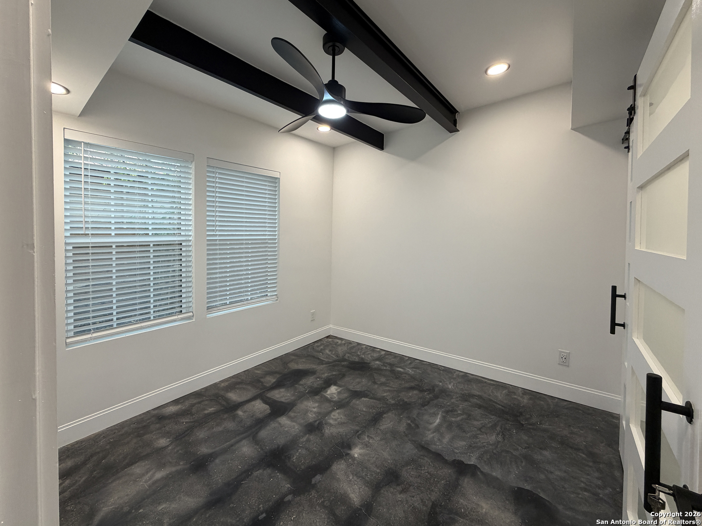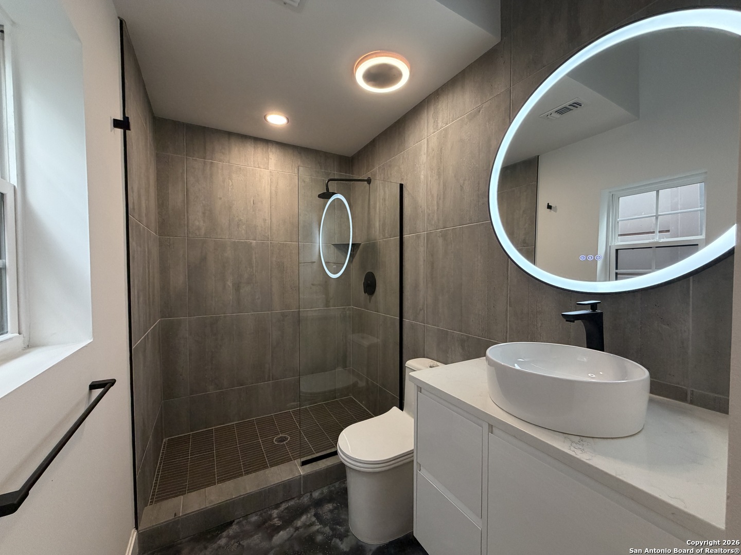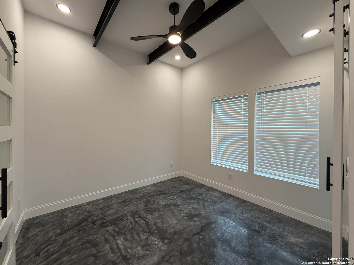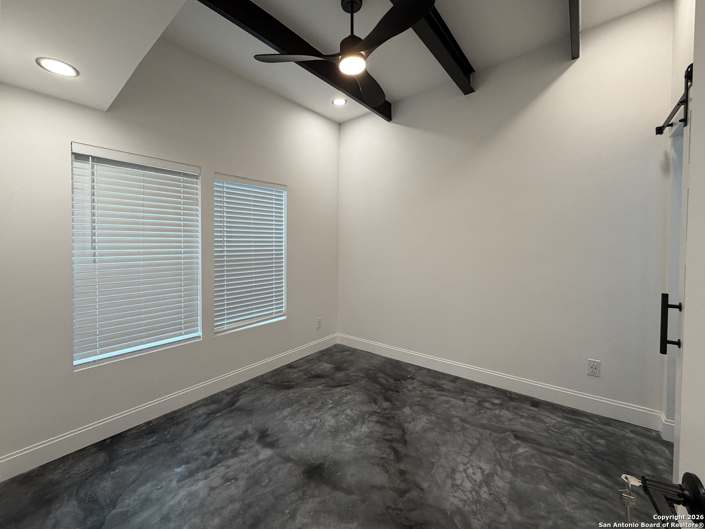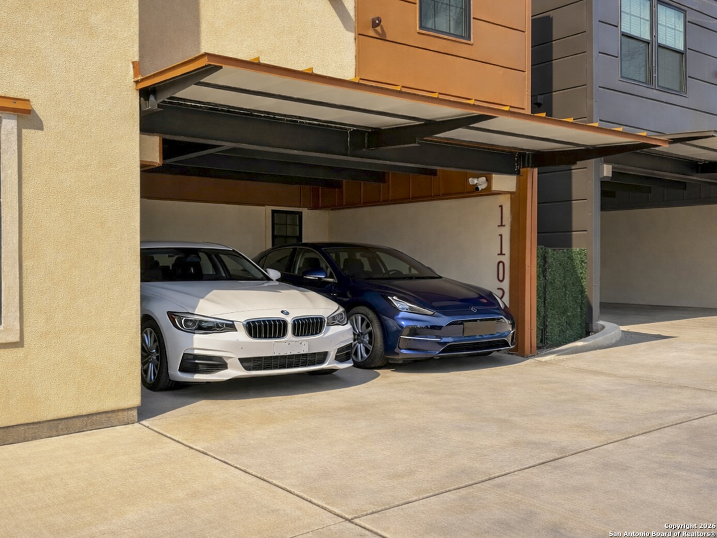 Modern Architectural new-construction home in the heart of Denver Heights. This three-story residence blends industrial design with luxury finishes and offers stunning skyline views. Polished concrete floors throughout provide a sleek contemporary look and enhanced sound insulation between levels. Each bedroom features its own private en-suite bathroom, ideal for roommates or professionals seeking privacy. The first floor includes a private guest suite with a full bathroom, perfect for visitors or a home office. The second floor offers an open-concept kitchen and living area with exposed black steel beams, designer lighting, high-gloss cabinetry, quartz countertops, and a large island, plus a convenient half bath. The third floor features two spacious bedrooms, each with its own en-suite bath. The home is crowned by a private rooftop terrace with sweeping downtown views, including the Tower of the Americas and the Alamodome, creating an ideal outdoor space for entertaining or relaxing above the city. Conveniently located near Downtown San Antonio, The Pearl, Southtown, Blue Star Arts Complex, the River Walk, major highways, dining, nightlife, and cultural destinations. Schedule your showing today and experience elevated urban living.