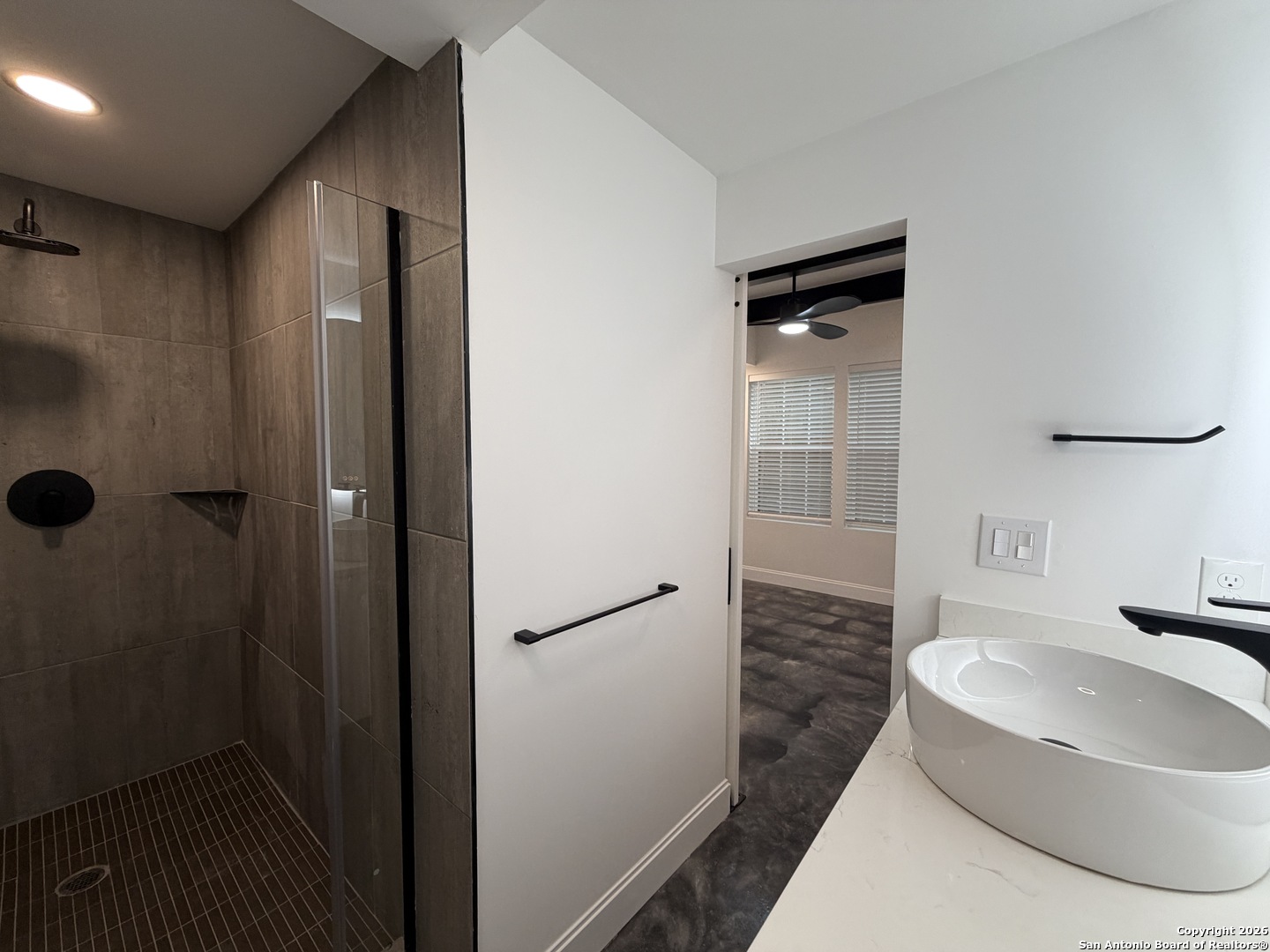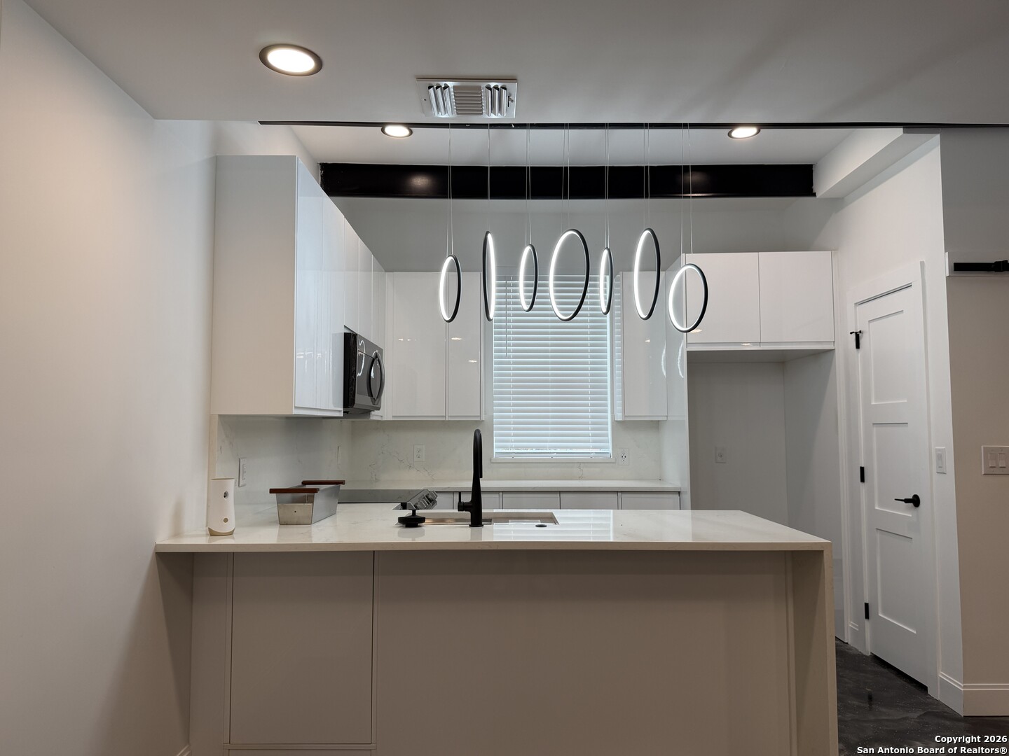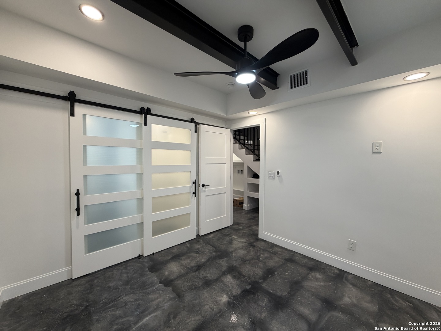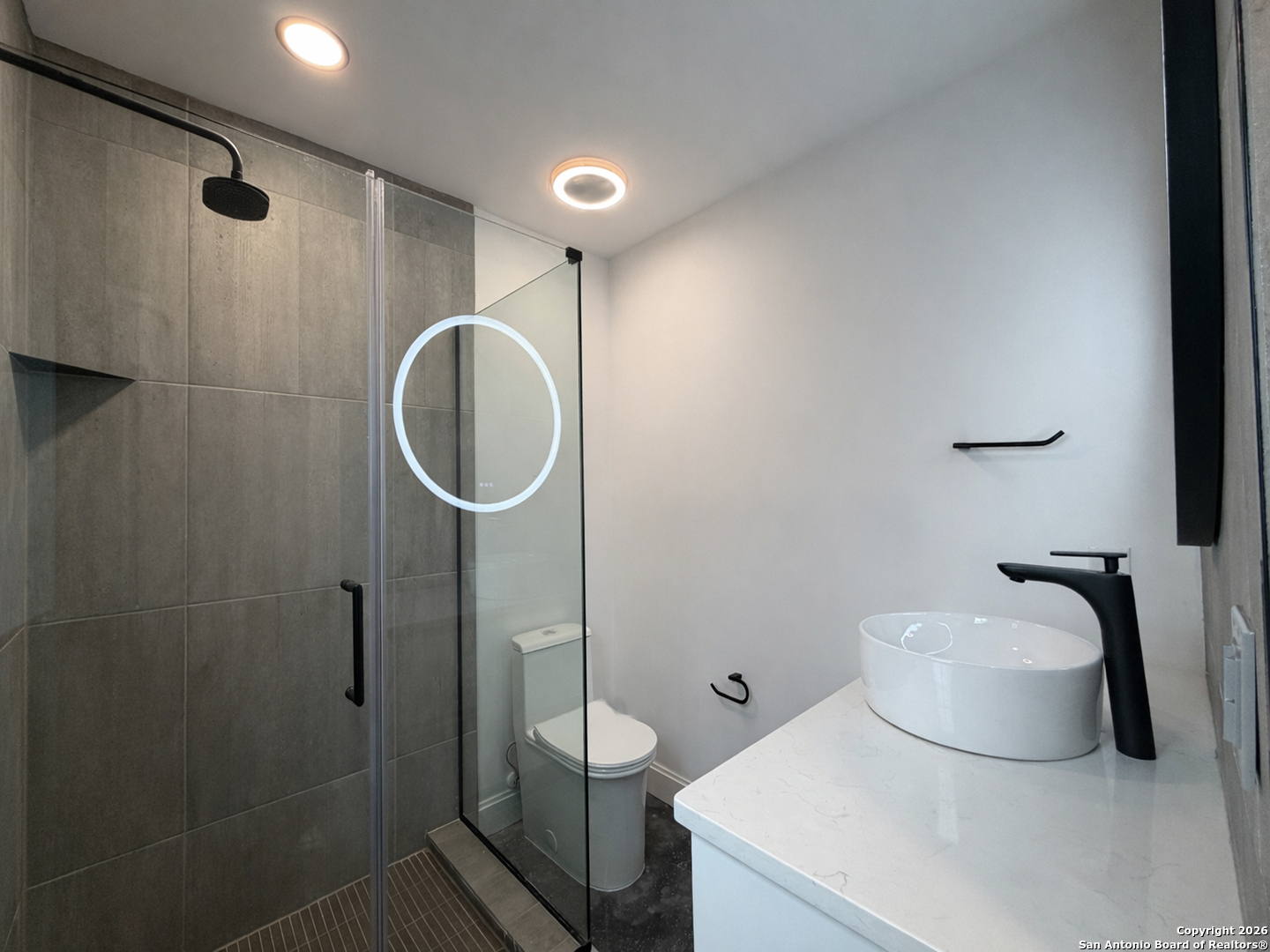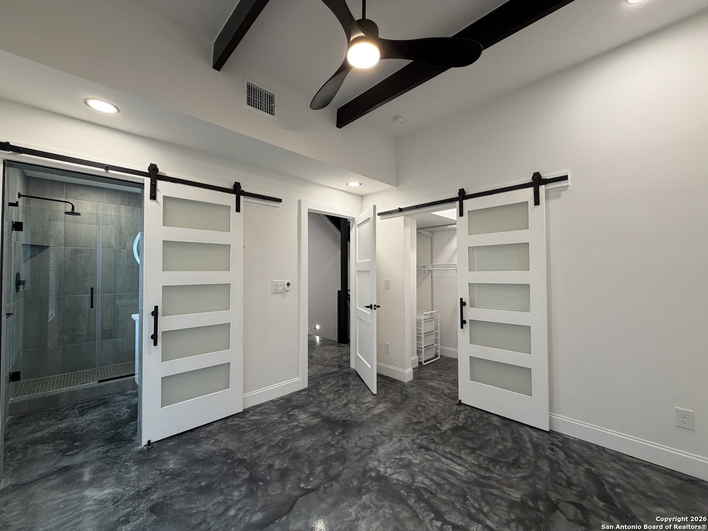 Modern Architectural new-construction home in the heart of Denver Heights. This three-story residence blends industrial design with luxury finishes and offers stunning skyline views. Polished concrete floors throughout provide a sleek contemporary look and enhanced sound insulation between levels. Each bedroom features its own private en-suite bathroom, ideal for roommates or professionals seeking privacy. The first floor includes a private guest suite with a full bathroom, perfect for visitors or a home office. The second floor offers an open-concept kitchen and living area with exposed black steel beams, designer lighting, high-gloss cabinetry, quartz countertops, and a large island, plus a convenient half bath. The third floor features two spacious bedrooms, each with its own en-suite bath. The home is crowned by a private rooftop terrace with sweeping downtown views, including the Tower of the Americas and the Alamodome, creating an ideal outdoor space for entertaining or relaxing above the city. Conveniently located near Downtown San Antonio, The Pearl, Southtown, Blue Star Arts Complex, the River Walk, major highways, dining, nightlife, and cultural destinations. Schedule your showing today and experience elevated urban living.