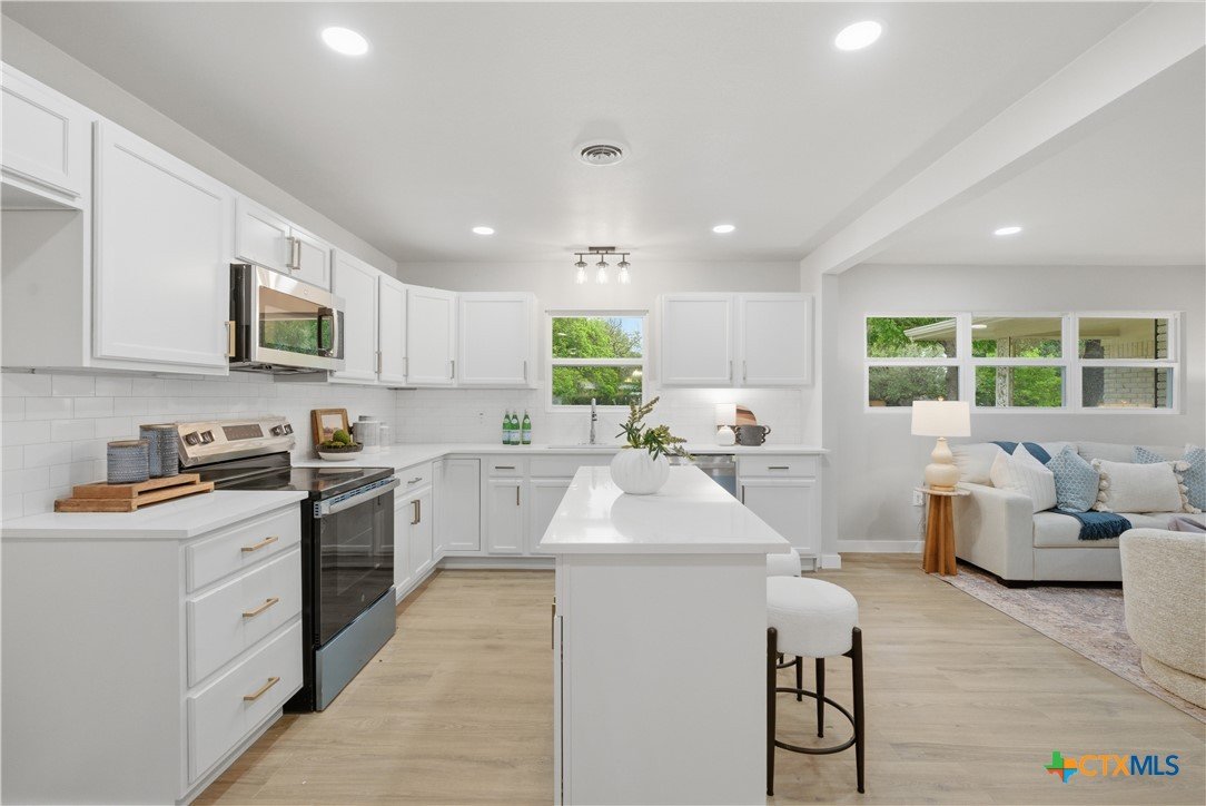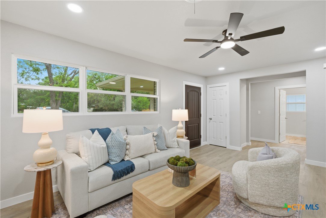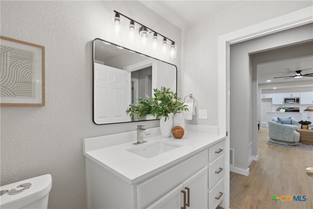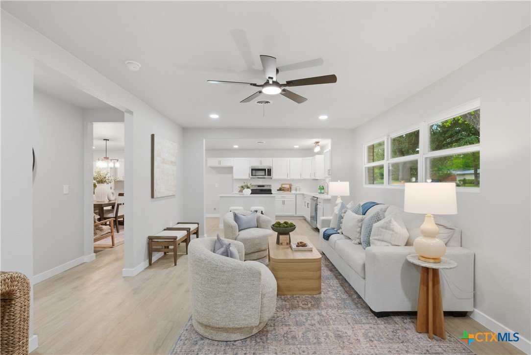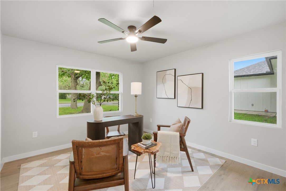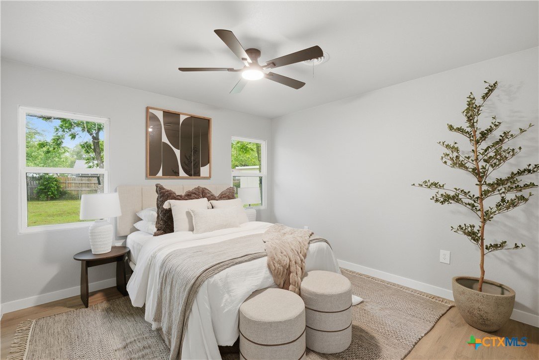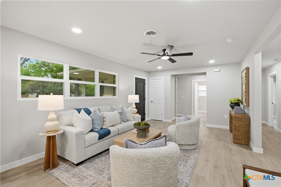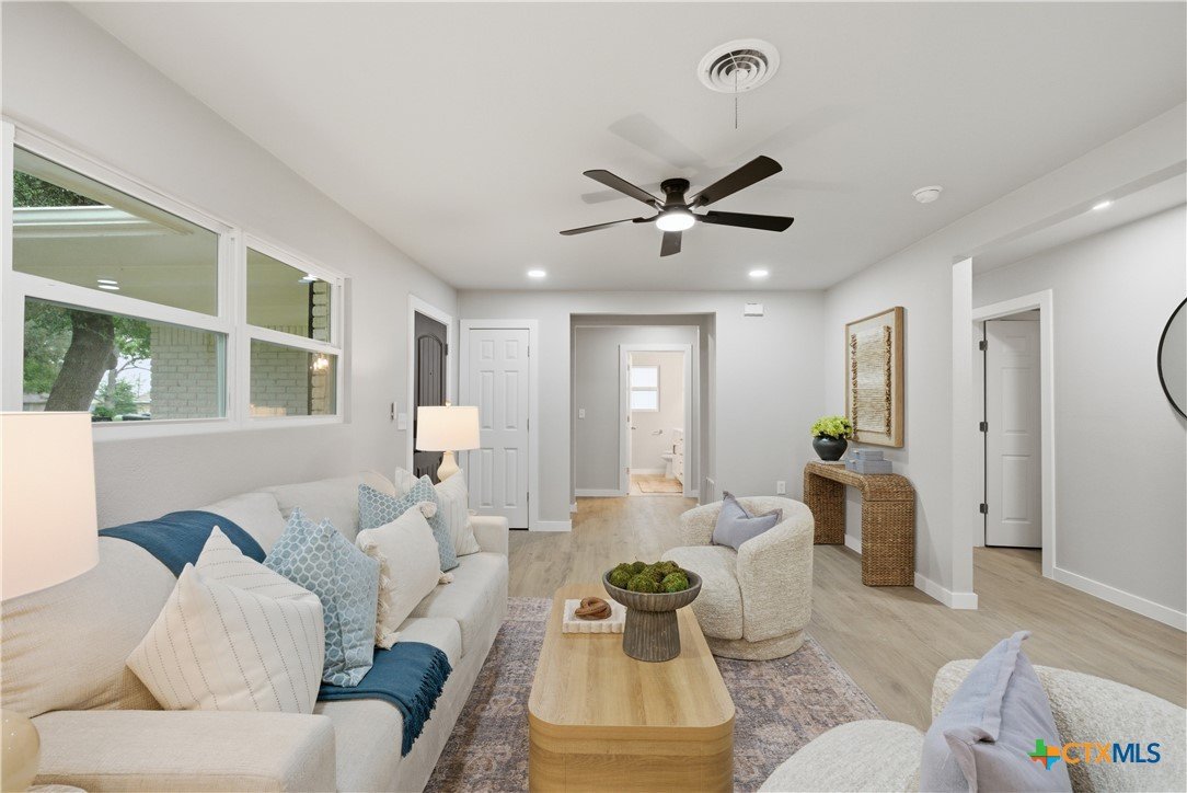 Completely remodeled and move-in ready, this home features luxury vinyl plank flooring throughout—no carpet anywhere. Major updates include a brand new HVAC system and ductwork, brand new roof, brand new windows, and all new fixtures throughout. The open floor plan creates a bright, inviting space, and all rooms include ceiling fans for added comfort. Both bathrooms offer tile floors and beautifully tiled showers, while the kitchen and baths are finished with quartz countertops and brand new stainless steel appliances. Enjoy a sunroom perfect for a home office or extra living space. Located in an established neighborhood with mature trees, just minutes from Baylor Scott & White and surrounded by restaurants and shopping. Backyard is fenced and includes a storage shed.