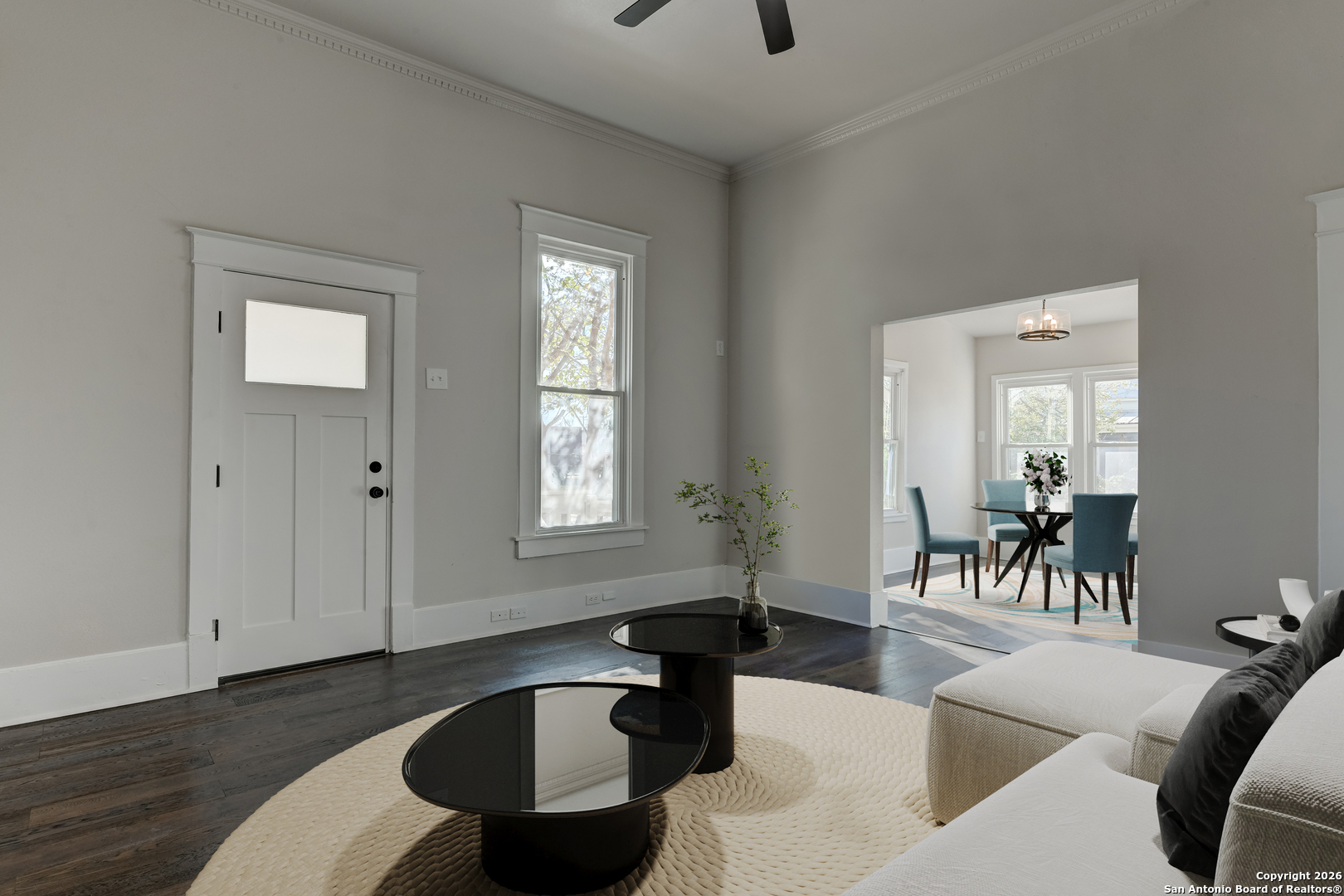 Morning light greets the front porch, setting the tone for a home rooted in history yet thoughtfully modernized for daily living. Inside, the entry feels open and inviting, with high ceilings, classic trim, and refreshed hardwood floors creating an immediate sense of warmth. Two front bedrooms offer comfortable, well-sized spaces with practical updates that support everyday routines, served by a nearby bath with clean, timeless style. The layout unfolds with an easy balance of character and flexibility. A quiet downstairs retreat sits toward the back of the home, while additional bedrooms allow the space to adapt to a variety of living needs. The living room naturally draws people together, filled with sunlight and subtle details that make it equally suited for relaxed mornings or evenings spent entertaining. The dining room flows seamlessly toward the kitchen, where updated finishes provide function without losing the home's charm, and a conveniently placed laundry area keeps daily life running smoothly. Upstairs, a spacious and versatile area offers options for a private suite, additional living space, or creative retreat, complete with its own bath and architectural details that reflect the home's original design. Located within a historic district and close to downtown San Antonio, the home places the River Walk and city energy just moments away. Thoughtful updates, adaptable spaces, and a strong sense of place come together to create a home that honors its past while comfortably supporting modern life. Appliances will be installed at closing. Some photos have been virtually staged for illustrative purposes; depicted appliances may not reflect the exact items to be installed.