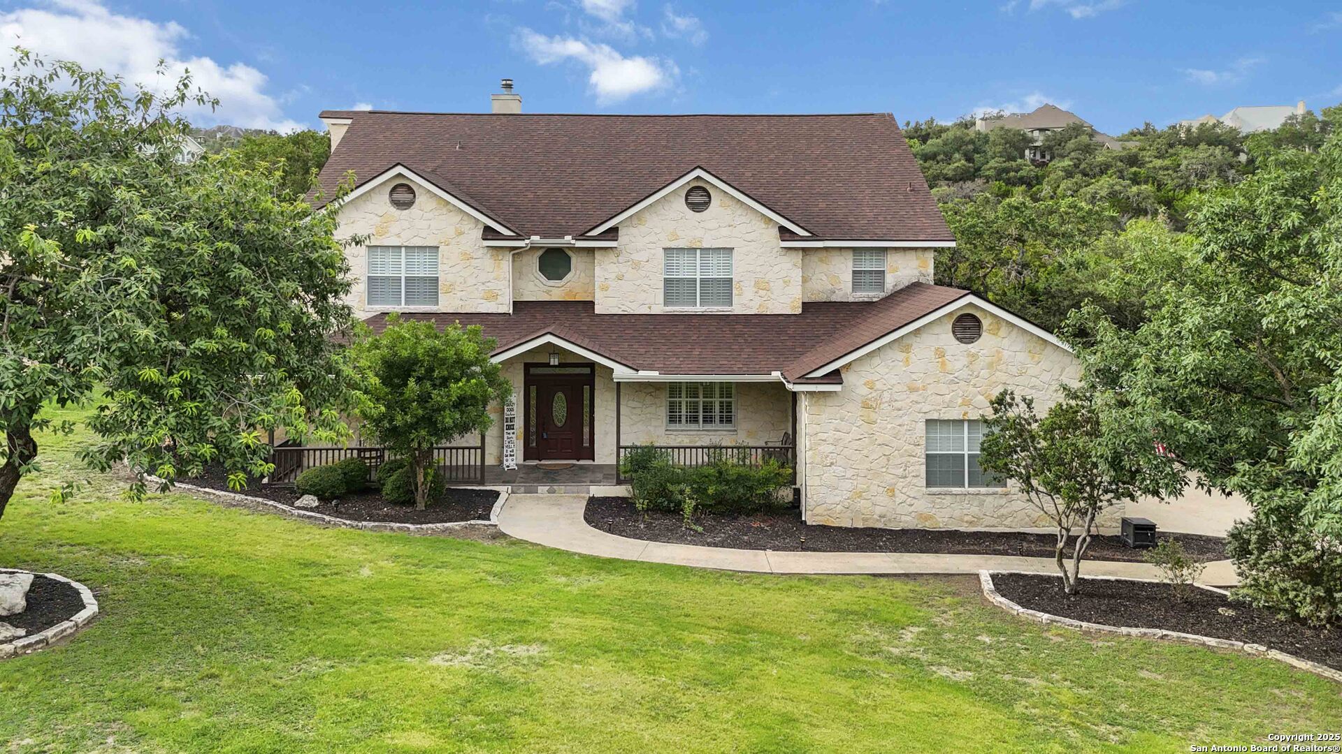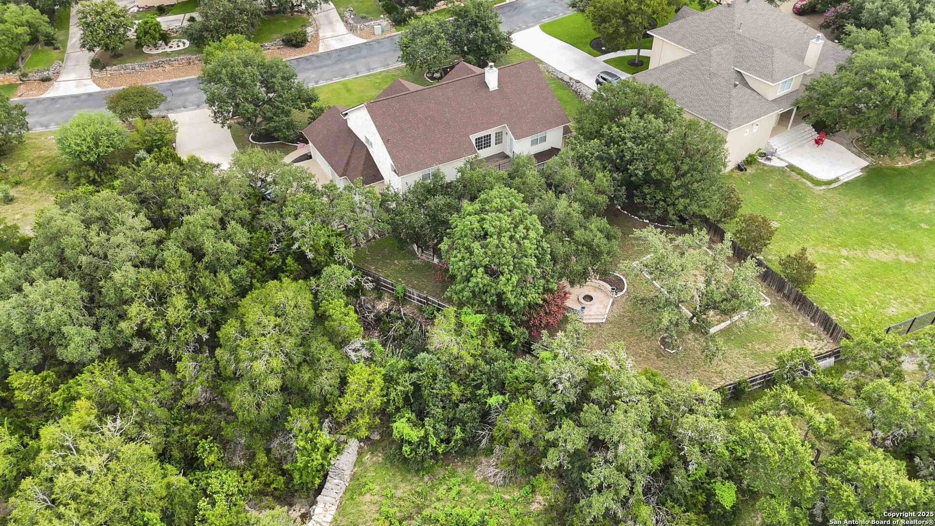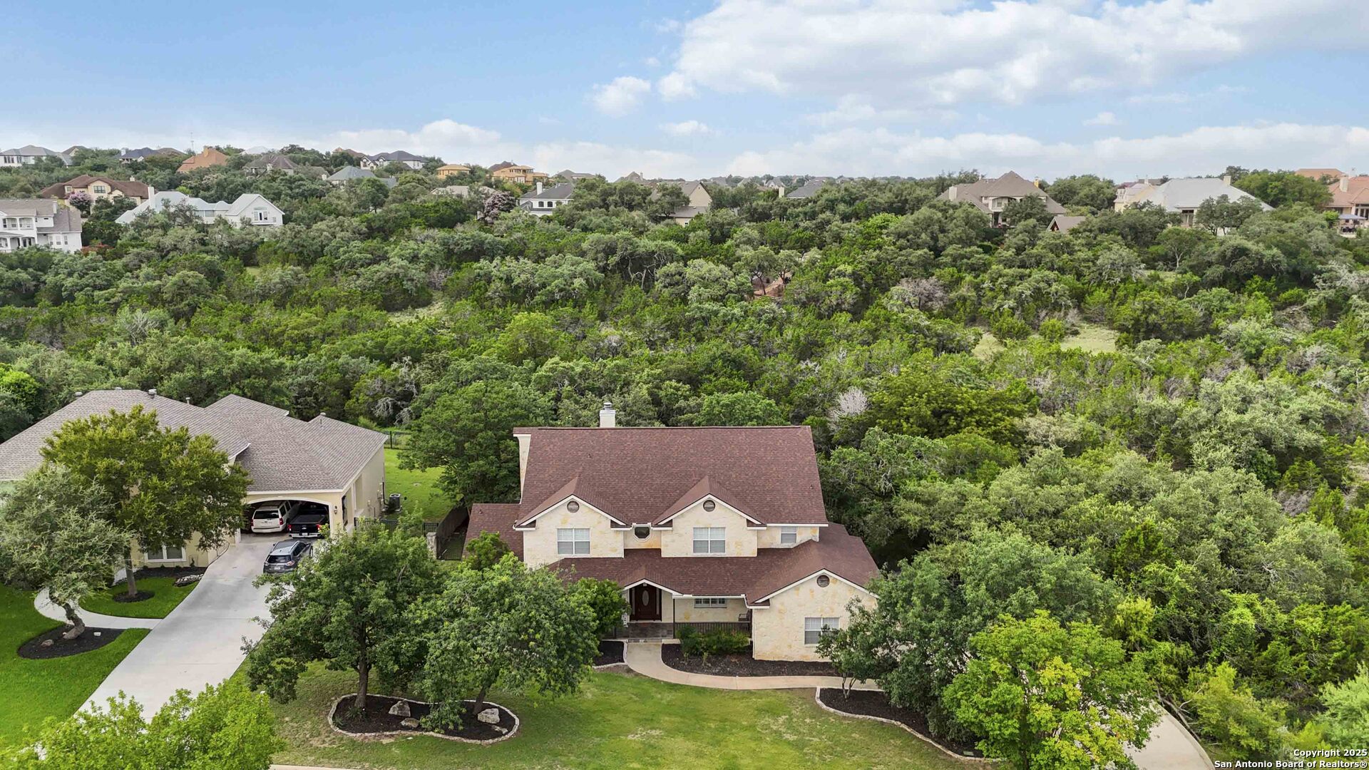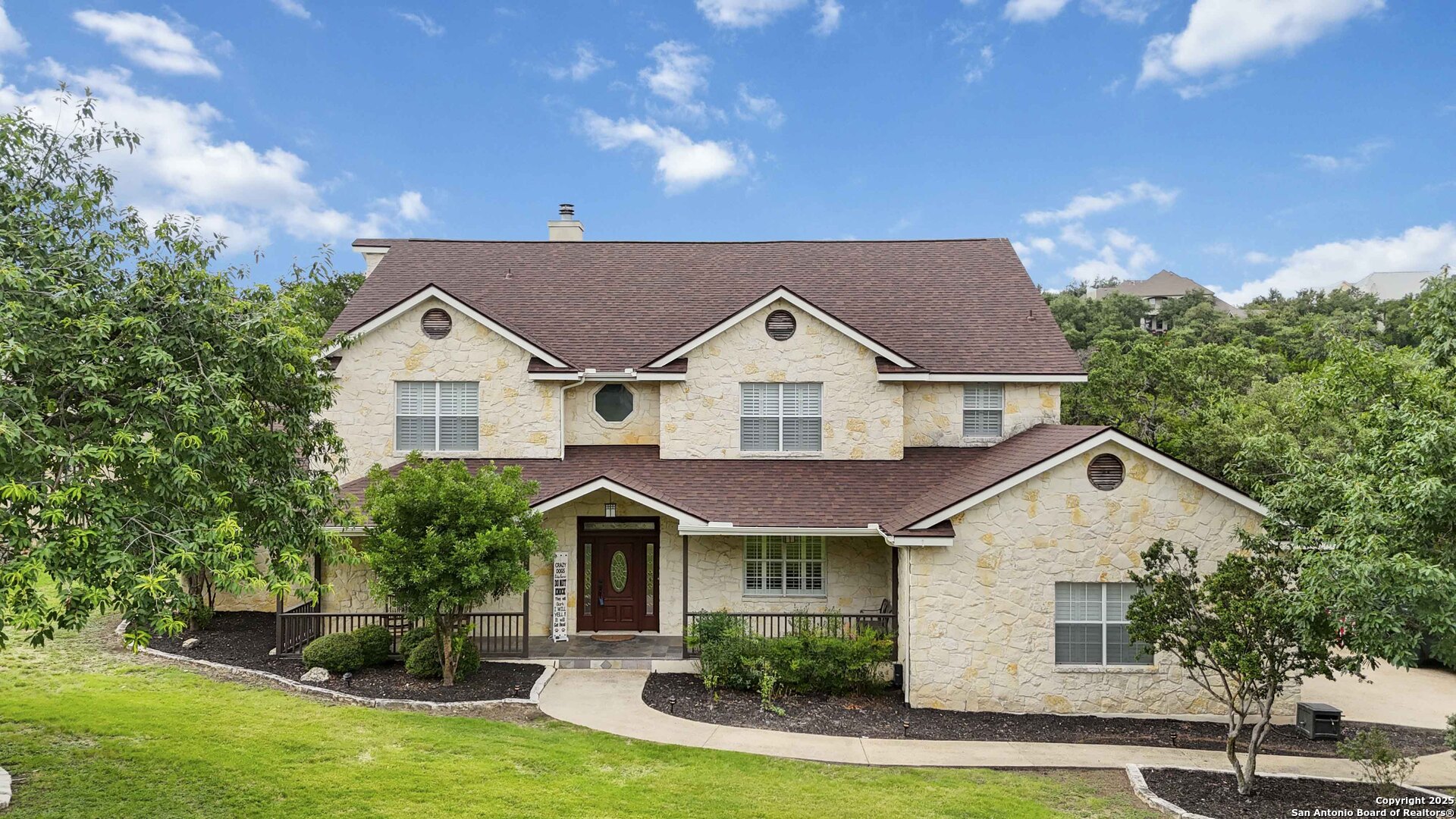 NEW ROOF! INSTALLED JULY 2025. Tucked away in the serene, guard-gated community of Summerglen, this exceptional residence offers the perfect blend of elegance, comfort, and privacy. Set on nearly half an acre along the tree-lined streets of this sought-after neighborhood, this 4,472 square foot hill country-style home is a rare find. From the moment you step onto the charming, long covered front porch, the inviting ambiance is undeniable. Inside, you're greeted by a spacious entryway with hand-scraped hardwood floors and a stunning view straight through to your tree-studded backyard oasis-privacy and tranquility await at every turn. To your left, behind elegant double doors, lies a private study ideal for working from home or quiet reflection. To your right, a generous formal dining room sets the stage for memorable gatherings. The heart of the home is the expansive living area, flooded with natural light and anchored by a striking floor-to-ceiling stone fireplace-a true centerpiece that brings warmth and character. The open-concept design flows effortlessly into a beautifully updated chef's kitchen, complete with stainless steel appliances, custom cabinetry, and a cozy breakfast nook where mornings begin with peace and sunlight. The main-level primary suite is a private retreat, featuring serene backyard views, a spa-inspired bath with a soaking tub and separate shower, and ample dressing space framed by floor-to-ceiling mirrors. Upstairs, discover three spacious guest bedrooms, including a secondary suite with a private bath and scenic views. The oversized game room offers versatility for entertainment, fitness, or media, and opens to a second-story balcony-perfect for enjoying the peaceful, elevated "treehouse" feel. Outside, the expansive over 1000 square feet of flagstone decking provides room to breathe, play, and unwind. Whether you're hosting a barbecue or enjoying a quiet evening under the stars, this is the private sanctuary you've been searching for. Located just 28 minutes north of downtown San Antonio, Summerglen is a luxury community known for its impressive architecture, rolling hills, and canopy of shady oaks. Residents enjoy access to exclusive amenities including a park with pavilion, tennis and basketball courts, jogging trails, picnic areas with barbecue pits, and more. Conveniently close to the Village at Stone Oak, top-rated NEISD schools, premier shopping, dining, and healthcare-including Baptist Emergency Hospital-this home truly has it all. Don't miss this opportunity to own a slice of hill country paradise in one of San Antonio's most prestigious neighborhoods. Schedule your private tour today.