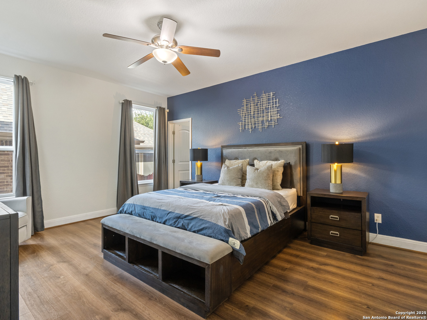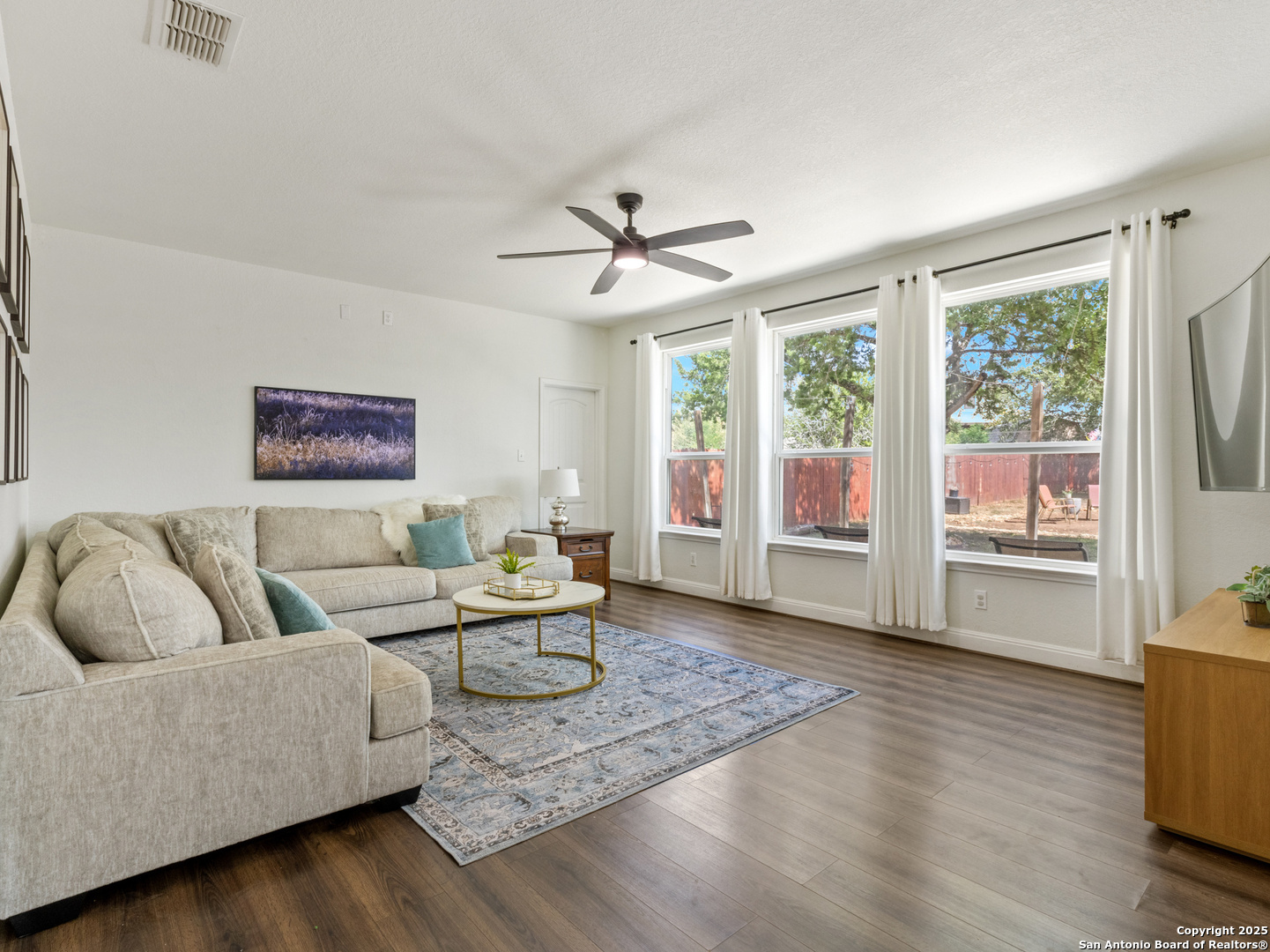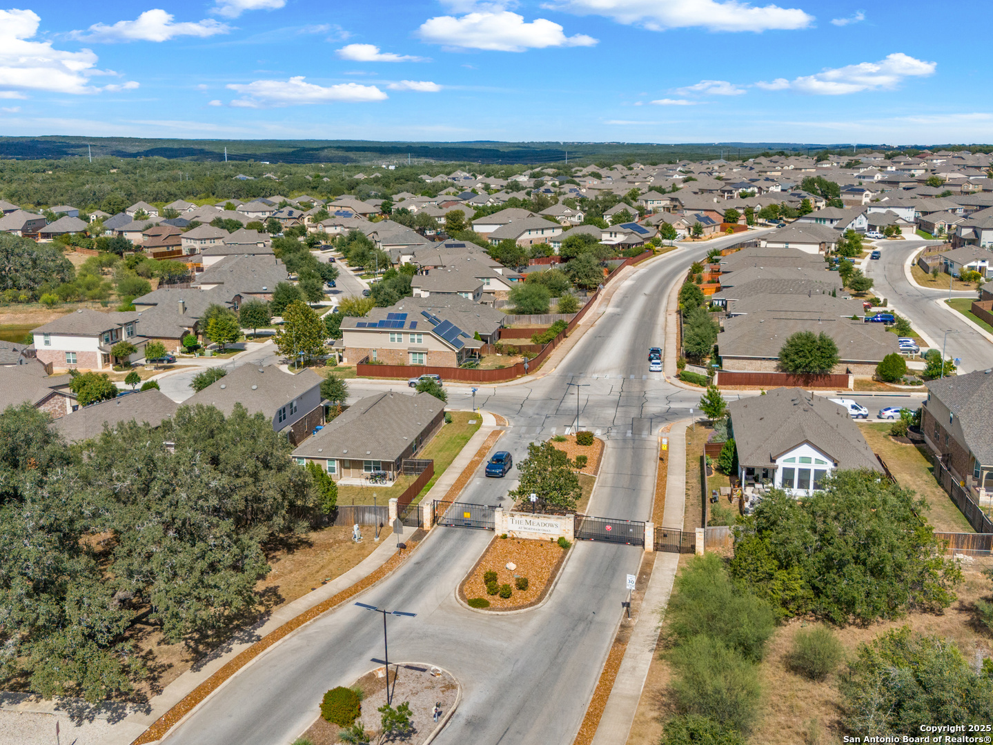 No need to upsize, this home has it all! Welcome to 22438 Akin Fawn, a spacious 4-bedroom, 3.5-bath home in North San Antonio offering the perfect blend of comfort and functionality with an OFFICE, THREE LIVING AREAS, a DOWNSTAIRS PRIMARY SUITE with dual closets, and an UPSTAIRS JUNIOR SUITE for guests. The open-concept kitchen and family room are ideal for entertaining, featuring a large island, abundant storage, and seamless flow for gatherings, while the OVERSIZED GAMEROOM with a flex space provides endless options for a media room, gym, or hobby area. You will love the high ceilings and the many windows for natural light, while the SOLAR PANELS offer energy efficiency and lower utility costs. Outside you'll enjoy an expansive patio and extra large backyard perfect for games, BBQ, parties, and relaxation. Located just off Evans Road with easy access to Loop 1604 and Hwy 281, this vibrant community is easily accessible and includes a community pool, clubhouse, basketball court, park, and playground-offering the best of both entertainment and outdoor fun. At 22438 your not just living, you are creating a lifestyle!! Zoned outside the city limits too.