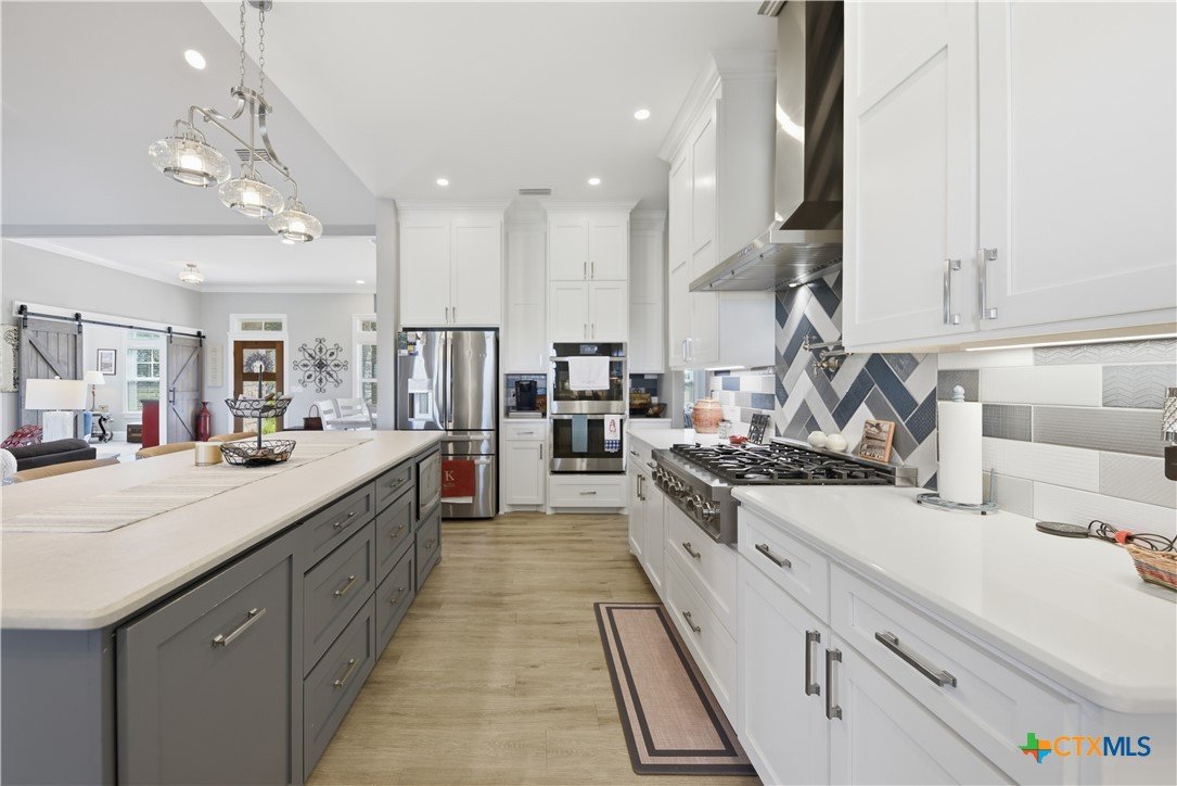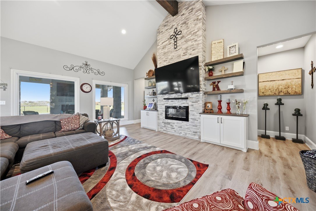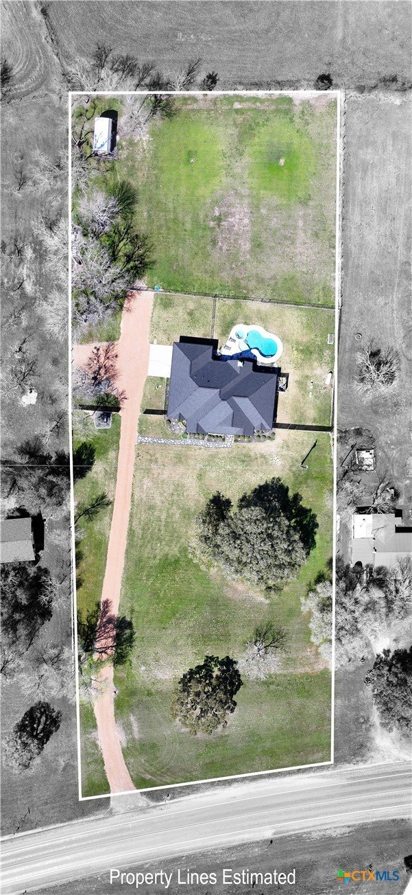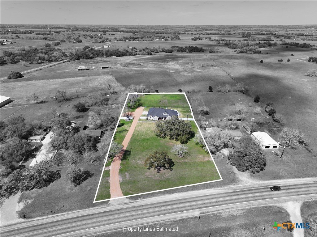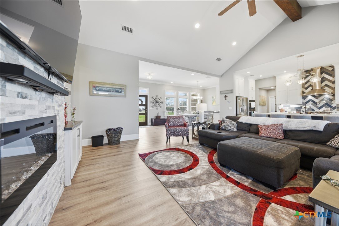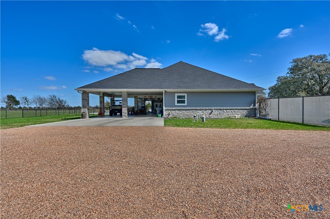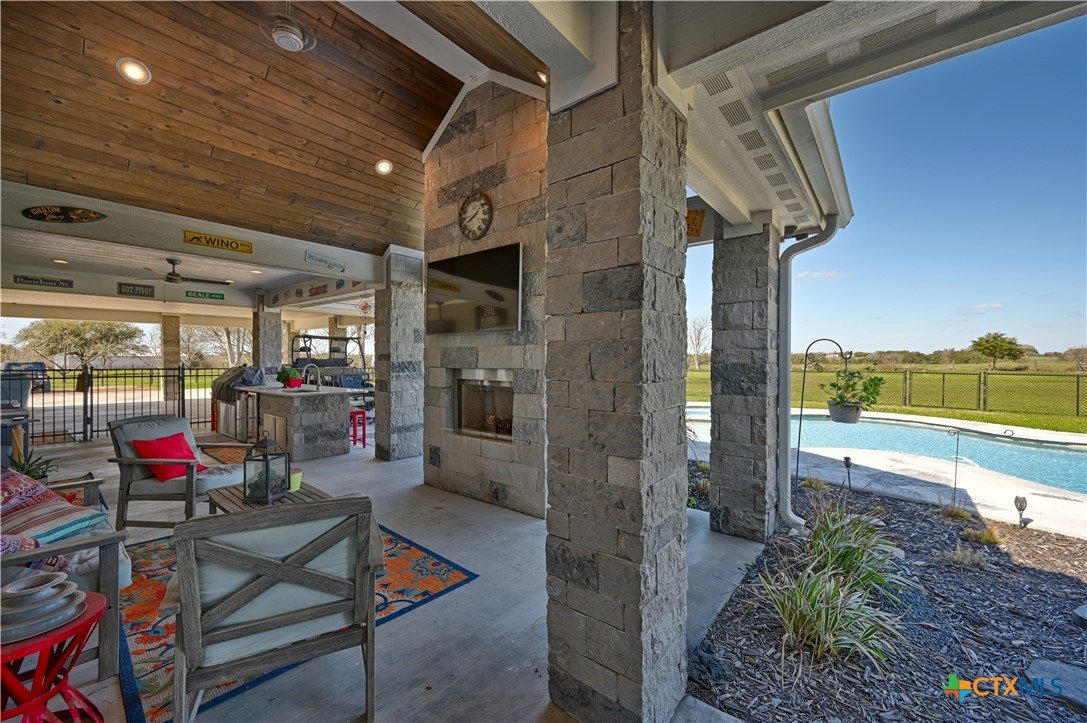 Welcome to this beautifully designed 2,758sqft custom home (2021). Set on a spacious 2.13ac tract w/ countryside views. Featuring stacked stone & Hardie board exterior finishes and a beautifully landscaped yard. The main living area connects the kitchen, dining, and is ideal for everyday living and entertaining. Large picture windows give you views of the covered back patio, outdoor kitchen, pool, and country landscape. The kitchen has custom cabinetry, quartz countertops and a large center island with ample storage and bar seating. Appliances include a built-in double oven, 6 burner gas range, above range pot filler, dishwasher, microwave & stainless steel farmhouse sink. The dining area is open to the living room and features a built in hutch w/ buffet. A private office/flex room located just off the main living areas offers versatility and could serve as a home office, game room or additional bedroom. The split floor plan provides privacy for the primary suite. The spacious primary bedroom features a recessed ceilings, elegant crown molding and direct access to the back porch. The primary bathroom includes a separate shower and soaking tub, split double vanity with a center makeup vanity and direct access to the spacious walk-in closet. The primary closet has custom shelving and a center, built-in island for exceptional storage and organization. On the opposite side of the home, there are two nice sized secondary bedrooms each include walk-in closets. The common bathroom has a tub/shower combination with a custom tile surround. The utility room features a mudroom entry, large sink, overhead storage, utility closet, and space for an additional refrigerator or freezer. A covered back patio is highlighted by a vaulted wood ceiling, gas/wood-burning fireplace, and a fully equipped outdoor kitchen with sink, refrigerator, ice maker, and grill. The gunite swimming pool with attached hot tub completes the outdoor space all set against peaceful countryside views.