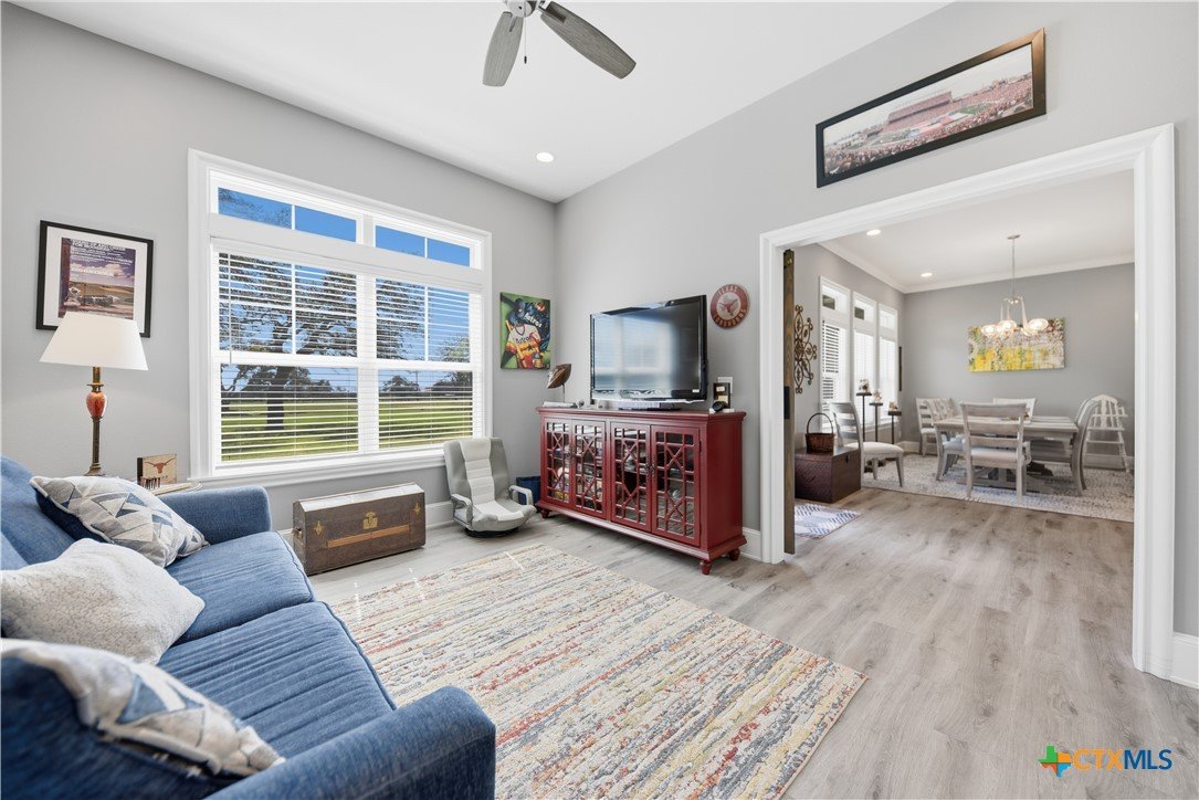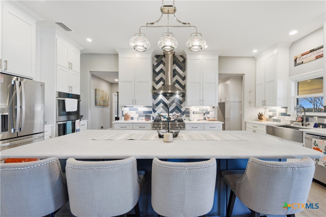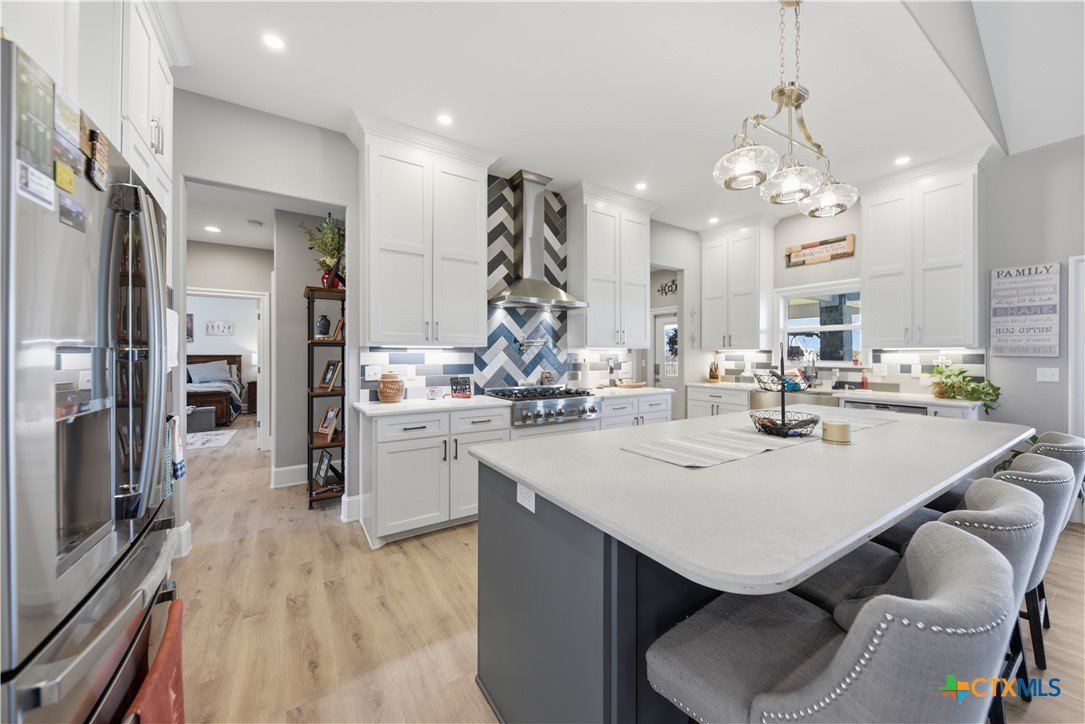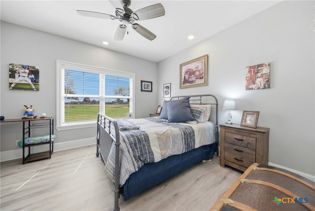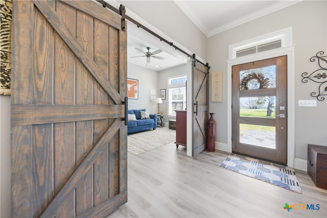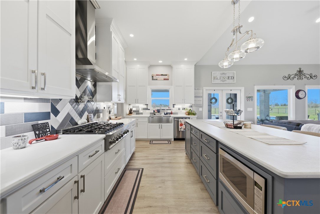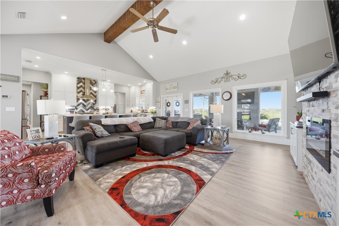 Welcome to this beautifully designed 2,758sqft custom home (2021). Set on a spacious 2.13ac tract w/ countryside views. Featuring stacked stone & Hardie board exterior finishes and a beautifully landscaped yard. The main living area connects the kitchen, dining, and is ideal for everyday living and entertaining. Large picture windows give you views of the covered back patio, outdoor kitchen, pool, and country landscape. The kitchen has custom cabinetry, quartz countertops and a large center island with ample storage and bar seating. Appliances include a built-in double oven, 6 burner gas range, above range pot filler, dishwasher, microwave & stainless steel farmhouse sink. The dining area is open to the living room and features a built in hutch w/ buffet. A private office/flex room located just off the main living areas offers versatility and could serve as a home office, game room or additional bedroom. The split floor plan provides privacy for the primary suite. The spacious primary bedroom features a recessed ceilings, elegant crown molding and direct access to the back porch. The primary bathroom includes a separate shower and soaking tub, split double vanity with a center makeup vanity and direct access to the spacious walk-in closet. The primary closet has custom shelving and a center, built-in island for exceptional storage and organization. On the opposite side of the home, there are two nice sized secondary bedrooms each include walk-in closets. The common bathroom has a tub/shower combination with a custom tile surround. The utility room features a mudroom entry, large sink, overhead storage, utility closet, and space for an additional refrigerator or freezer. A covered back patio is highlighted by a vaulted wood ceiling, gas/wood-burning fireplace, and a fully equipped outdoor kitchen with sink, refrigerator, ice maker, and grill. The gunite swimming pool with attached hot tub completes the outdoor space all set against peaceful countryside views.