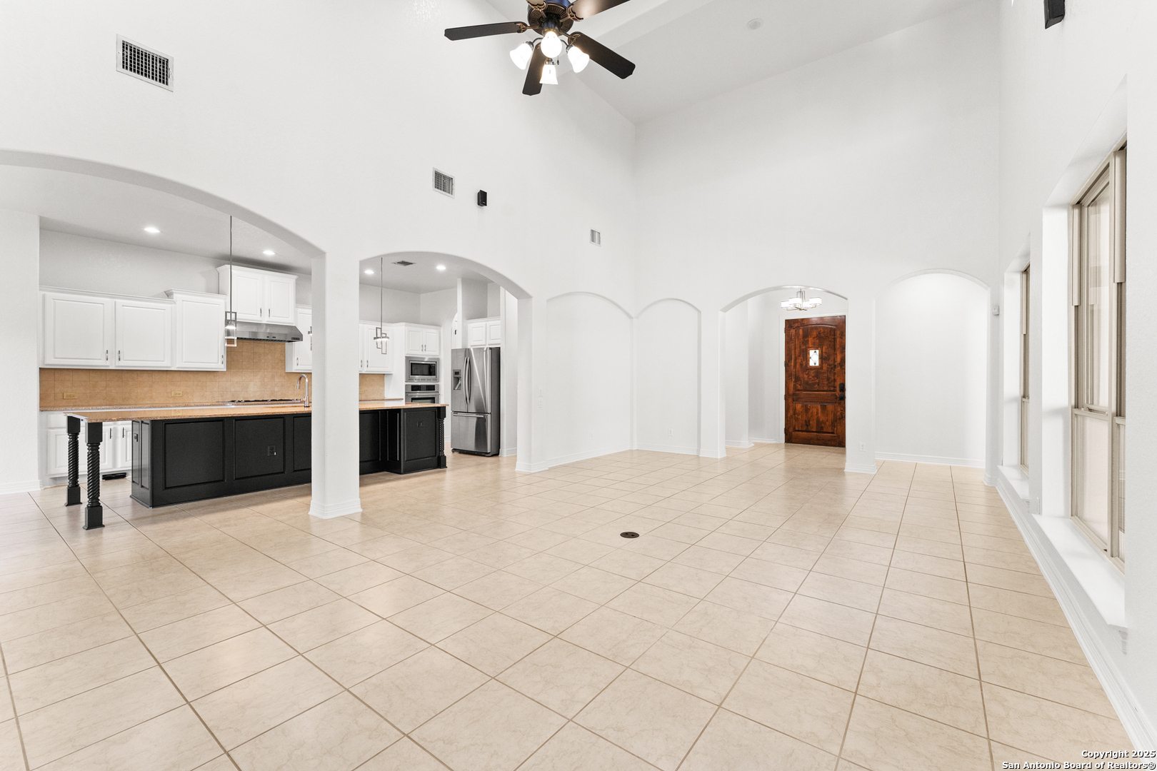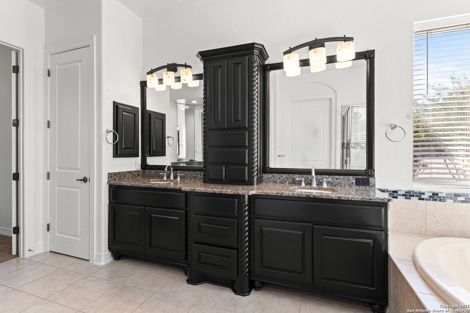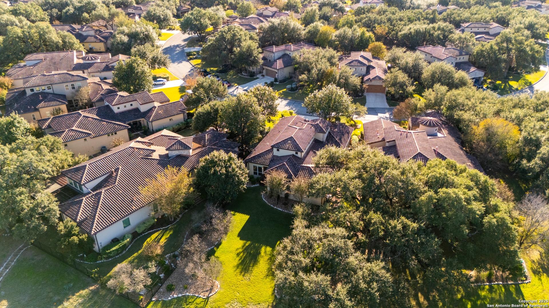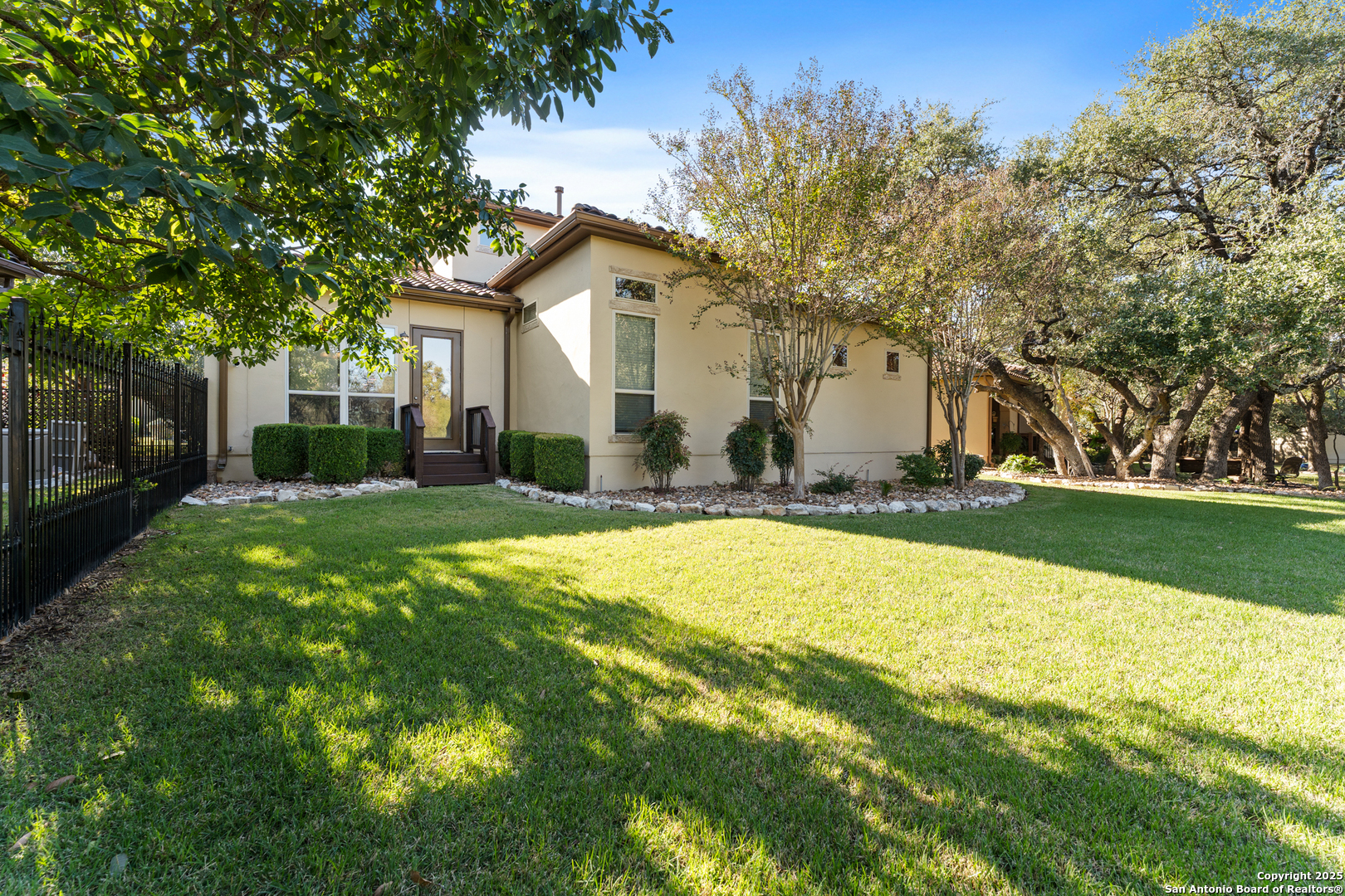 Nestled within the prestigious Campanas enclave of Cibolo Canyon's Resort Community, this immaculately maintained Mediterranean-style residence offers a refined blend of luxury, comfort, and resort living. Recently painted and immacutately maintained, this 3-bedroom, 2-bath home spans 2,354 sq.ft. of beautifully designed living space where architectural detail and natural light take center stage. From the moment you arrive, the home exudes timeless elegance and a sense of tranquility, perfectly complementing its greenbelt setting and serene surroundings. At the heart of the home, the kitchen is both striking and functional; designed for everyday living and effortless entertaining. It features stainless steel appliances, a gas cooktop, built-in oven and microwave, granite countertops, and tall cabinetry that has been recently refreshed with updated paint. A generously sized breakfast island anchors the space, offering ample seating and serving as the perfect gathering spot for hosting loved ones. Just beyond, the dining room overlooks the backyard and greenbelt, creating a peaceful backdrop. The living room is a true showstopper, thoughtfully architected with soaring ceilings, dramatic beams, graceful arches, custom nooks, and expansive windows that flood the space with natural light. This room effortlessly blends warmth and character, making it ideal for both intimate evenings and larger gatherings. The primary suite is a private retreat, designed to inspire relaxation with high ceilings, abundant natural light, and a calming atmosphere. The spa-like primary bathroom features dual vanities, a jetted soaking tub, a standalone easy-entry shower, a dedicated vanity station, and a spacious walk-in closet. Two additional bedrooms offer privacy, and flexibility for guests, family, or a home office, with convenient access to a well-appointed secondary bathroom. Both bathrooms have been enhanced with updated fixtures, including modern bluetooth exhaust fans. A recent addition, the side patio with durable vinyl decking, extends the living space outdoors and is ideal for entertaining, hosting, or simply relaxing while enjoying the peaceful surroundings. Living in Campanas means enjoying a low-maintenance lifestyle, with the HOA covering lawn maintenance and providing 24-hour security. Residents also enjoy exclusive access to three exceptional amenity centers featuring a lazy river, resort-style and junior Olympic lap pools, multiple playgrounds and playscapes, a kiddie splash area with beach entry, and a 9,000+ square-foot clubhouse. Additional highlights include a 24/7 fitness center, tennis and pickleball courts, a grand ballroom perfect for weddings and events, three fully equipped kitchens, a library, and a game room complete with poker tables, billiards, and a bar. Just minutes away, the JW Marriott Hill Country Resort offers PGA Tour TPC golf courses, a world-class spa, a nine-acre water park, and outstanding dining; all within Cibolo Canyons! Come experience 22450 Viajes, where luxury living meets an unparalleled resort lifestyle.