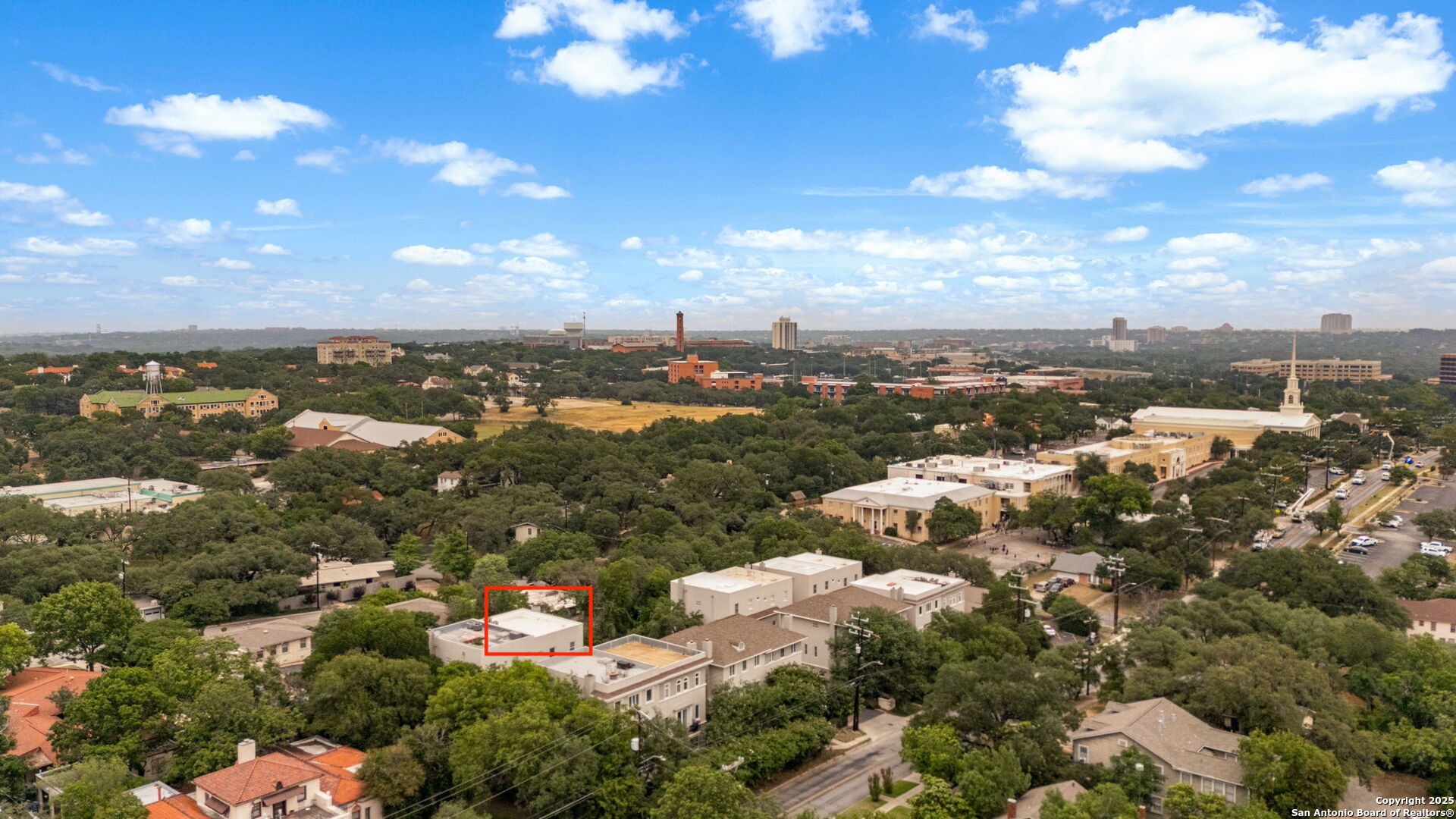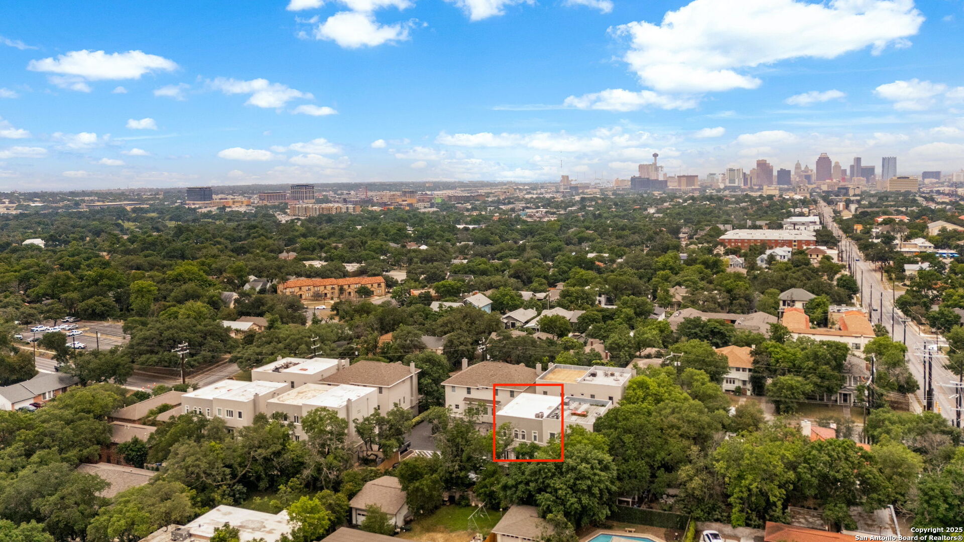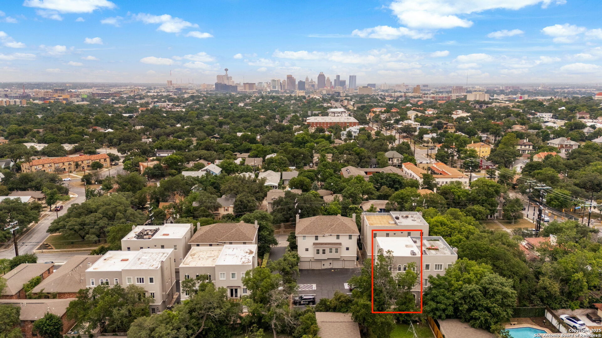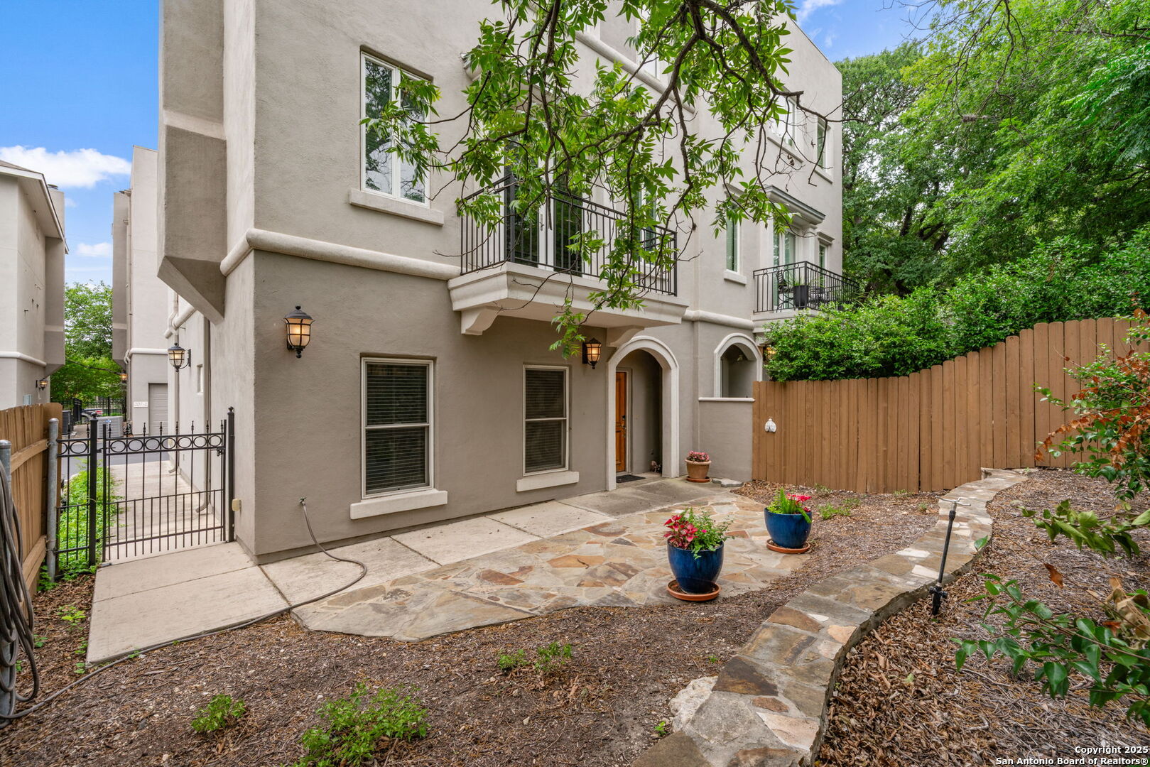 Experience the Ultimate Urban Lifestyle minutes from downtown with a Private Rooftop Access! Contemporary style meets timeless elegance in this stunning townhome-style condominium located in the heart of historic Monte Vista. Perfect for those seeking a seamless transition to urban living, this beautiful tri-level home offers both luxury and convenience. Step into a private courtyard with low-maintenance yard upkeep-ideal for relaxing or entertaining. Enjoy breathtaking panoramic views of downtown San Antonio from your expansive rooftop deck. Inside, every room reflects refined taste and thoughtful design. The first floor serves as a versatile space-perfect for a home office or guest suite. On the second level, you'll find an inviting layout featuring a chef-inspired kitchen. The adjacent living area boasts a cozy fireplace and access to a balcony with serene treetop views. The upper-level primary suite is a true retreat, complete with two walk-in closets and a spa-like bathroom showcasing a stand-alone soaking tub, walk-in tile shower, and dual vanities with soapstone countertops. A secondary bedroom, full bath, and laundry area complete this level. The spiral staircase leads to the rooftop access with AMAZING downtown views - must see it in the evenings to truly appreciate. Additional highlights include ample storage throughout, an attached two-car garage, and generous guest parking (located right next to the unit). Located just minutes from Hwy 281 and Loop 410, this exceptional home offers quick access to downtown, the airport, the University of the Incarnate Word, Trinity University, and the Pearl District.