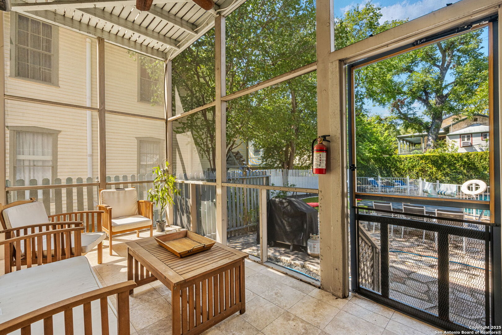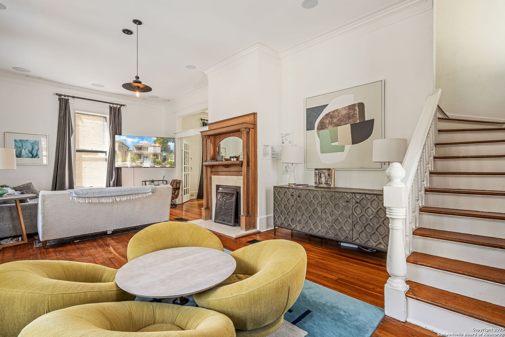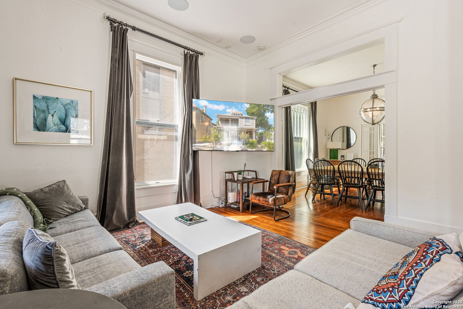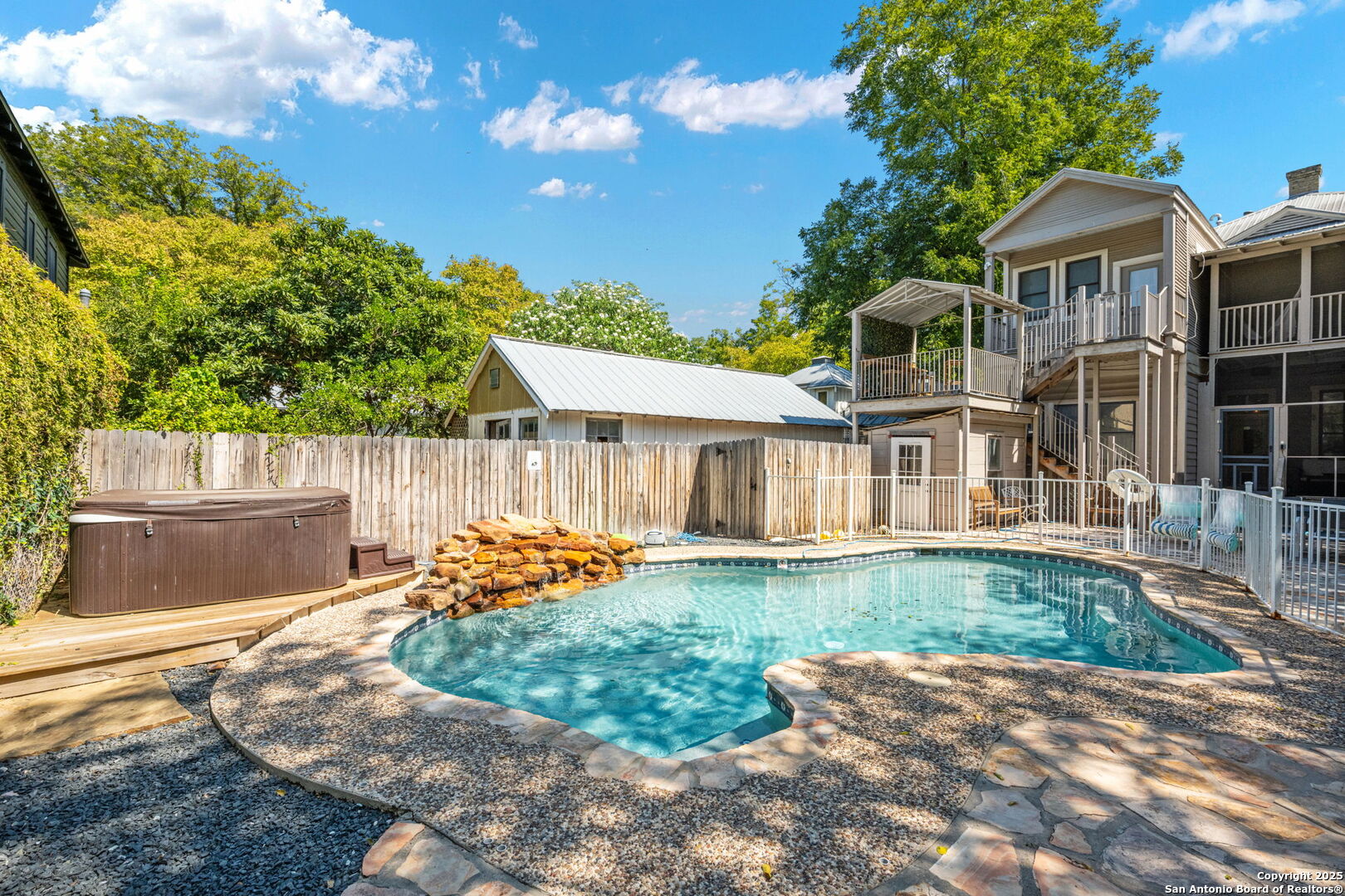 Spectacular 1922 Victorian in the heart of historic King William, offering timeless curb appeal with a true front porch, classic columns, and beautifully preserved architecture. Just two blocks from the River Walk, this home places you steps from parades, restaurants, and downtown living. Inside, the home blends historic charm with thoughtful updates. It features 5 bedrooms (dual primary suites), 4 full bathrooms, a large living room, formal dining room, and a screened-in porch/sunroom. The beautifully updated kitchen includes refreshed tile floors, backsplash, stunning countertops, lighting, and modern appliances. The living area also boasts a state-of-the-art entertainment system with a 110" automated drop-down screen and 7.1 in-ceiling speakers. Among other energy-saving features, the original windows remain intact & are enhanced with Indow Windows for improved energy efficiency & noise reduction. The backyard is a private retreat with an in-ground pool, deck, low-maintenance turf landscaping, pool fence, and standalone hot tub/spa. Private off-street parking and an electric car charger add convenience. A rare opportunity to enjoy an updated historic home in one of San Antonio's most iconic neighborhoods.