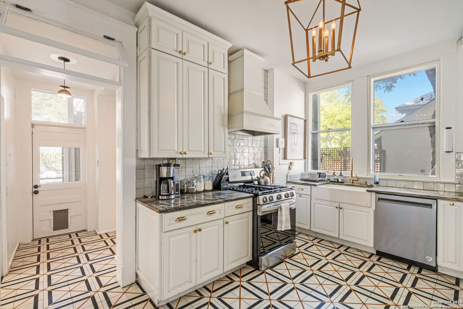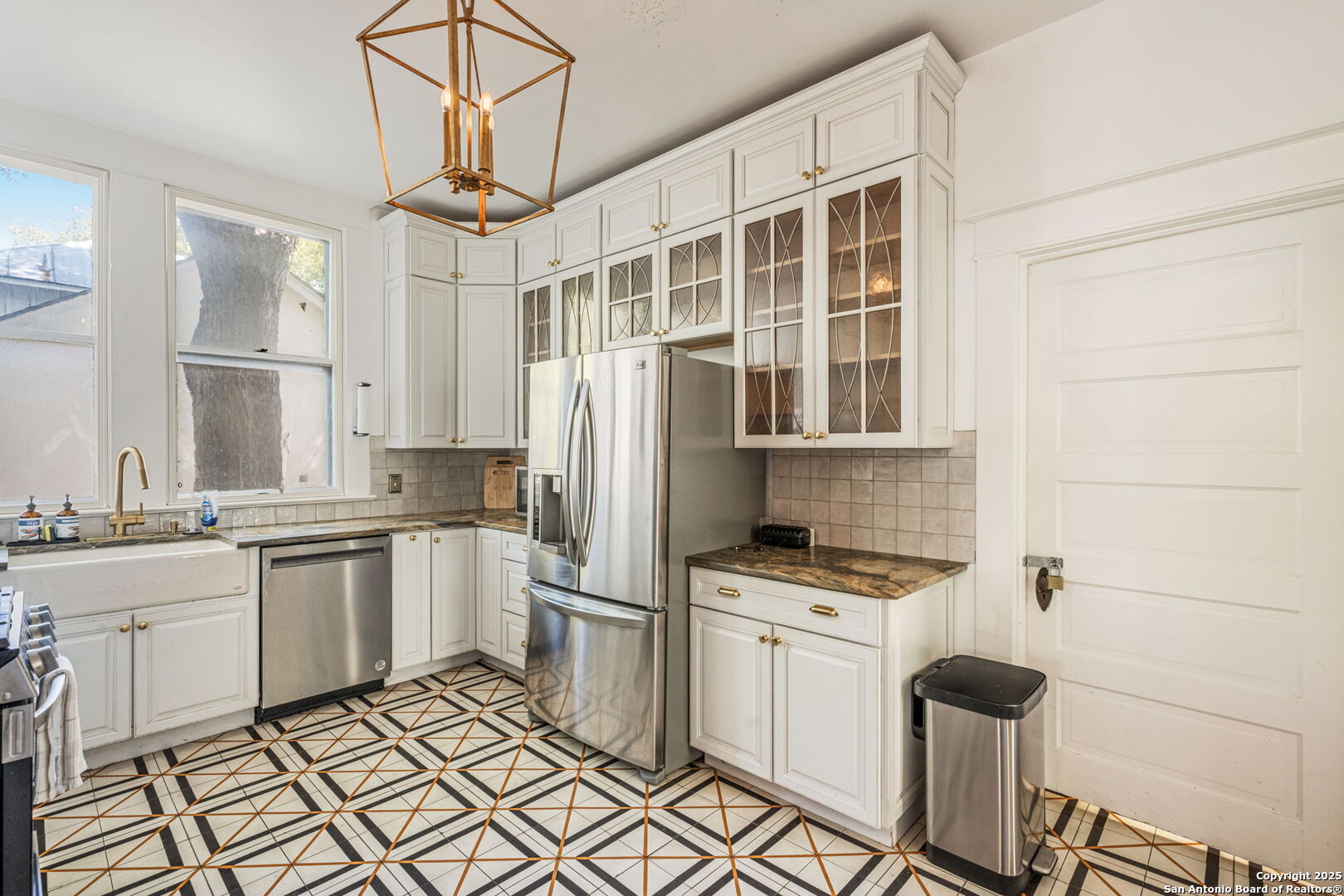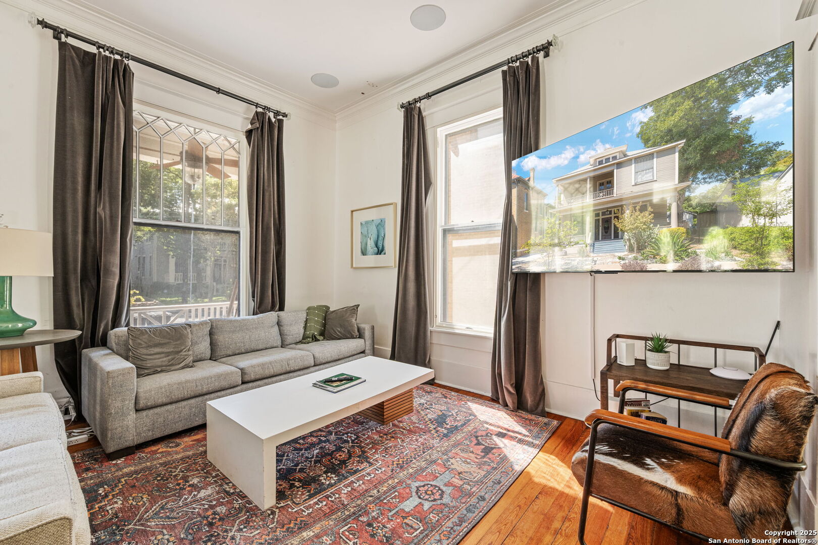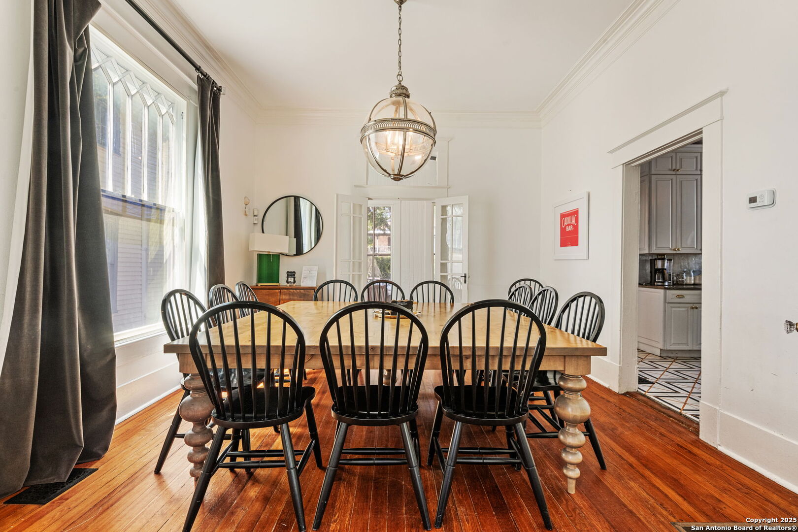 Spectacular 1922 Victorian in the heart of historic King William, offering timeless curb appeal with a true front porch, classic columns, and beautifully preserved architecture. Just two blocks from the River Walk, this home places you steps from parades, restaurants, and downtown living. Inside, the home blends historic charm with thoughtful updates. It features 5 bedrooms (dual primary suites), 4 full bathrooms, a large living room, formal dining room, and a screened-in porch/sunroom. The beautifully updated kitchen includes refreshed tile floors, backsplash, stunning countertops, lighting, and modern appliances. The living area also boasts a state-of-the-art entertainment system with a 110" automated drop-down screen and 7.1 in-ceiling speakers. Among other energy-saving features, the original windows remain intact & are enhanced with Indow Windows for improved energy efficiency & noise reduction. The backyard is a private retreat with an in-ground pool, deck, low-maintenance turf landscaping, pool fence, and standalone hot tub/spa. Private off-street parking and an electric car charger add convenience. A rare opportunity to enjoy an updated historic home in one of San Antonio's most iconic neighborhoods.