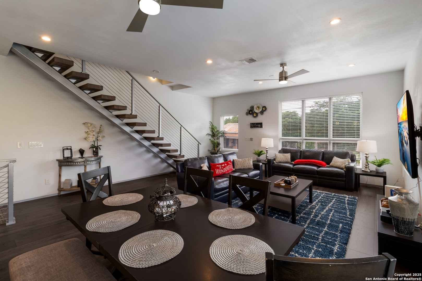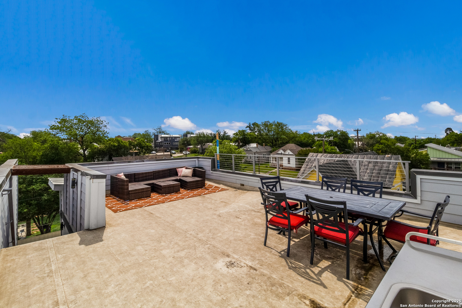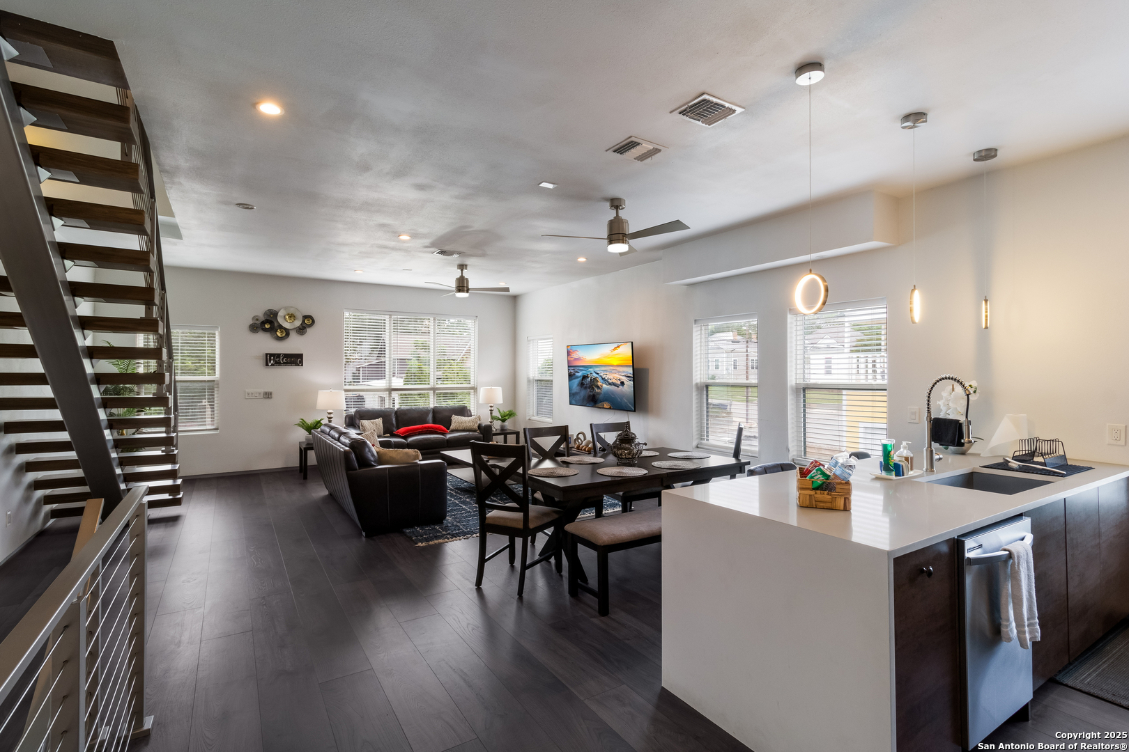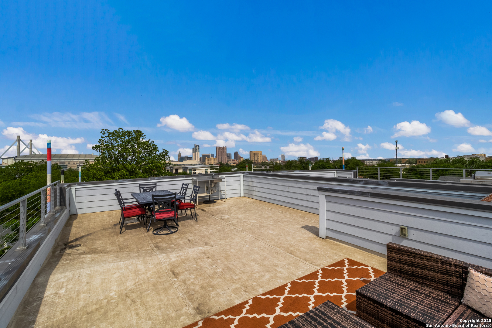 Turn-key FULLY FURNISHED luxury Air Bnb with a rooftop view of the San Antonio skyline! This exceptional 3-bedroom, 2.5-bathroom three-story condo is fully furnished and ready to generate income. Located in the heart of San Antonio, this home offers modern living with all the conveniences you could desire. The entry level features a spacious living area or flex space, perfect for a variety of uses. The second floor serves as the heart of the home, with an open living and dining area flooded with natural light, creating a welcoming space for both relaxation and entertaining. The kitchen features a waterfall counter with a breakfast bar, stainless steel appliances, and gas cooking. The third floor is dedicated to the bedrooms and full-sized bathrooms. The primary bedroom is a luxurious retreat, complete with a double vanity, modern shower, and a walk-in closet. A cozy seating area and the laundry room are also located on this floor for added convenience. The secondary bedrooms are generously sized, and the guest bathroom offers a full-sized shower and oversized vanity. Head up to the rooftop to enjoy 360-degree views of the San Antonio skyline. The rooftop terrace is perfect for outdoor dining, with plenty of seating space to take in the stunning vistas. Conveniently located within walking distance to the famous River Walk, this condo provides easy access to I-37, I-35, and I-10, offering both a prime location and ultimate comfort.