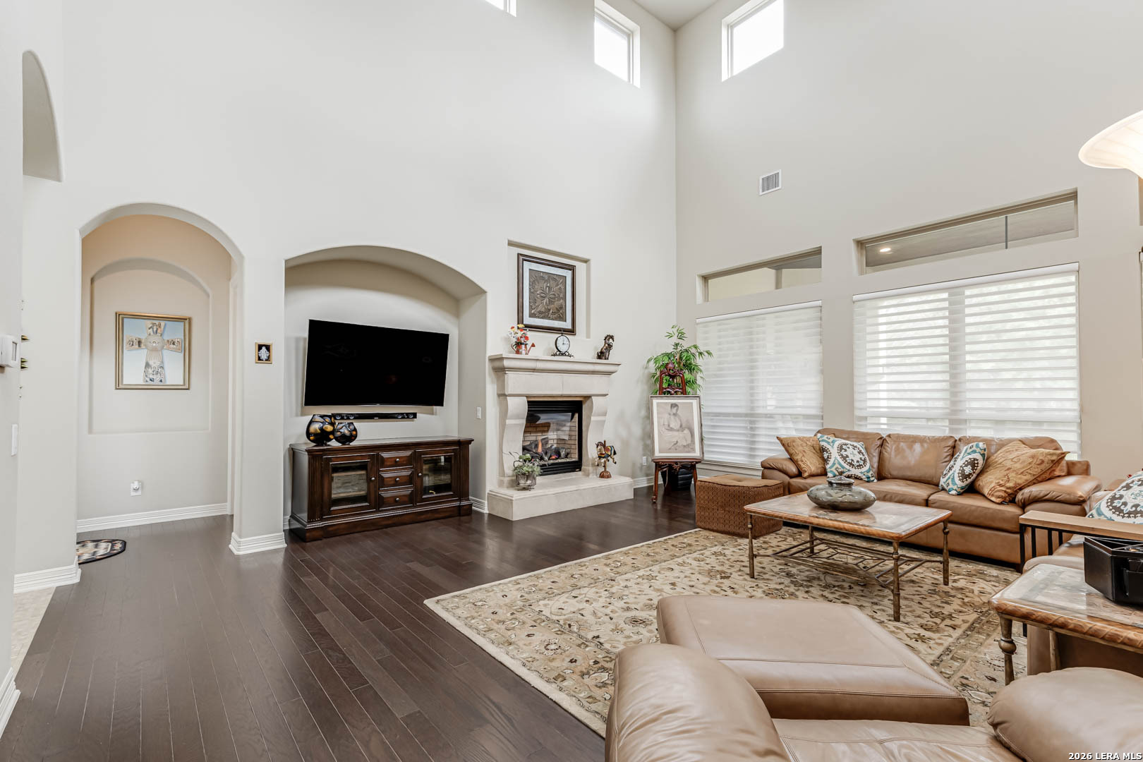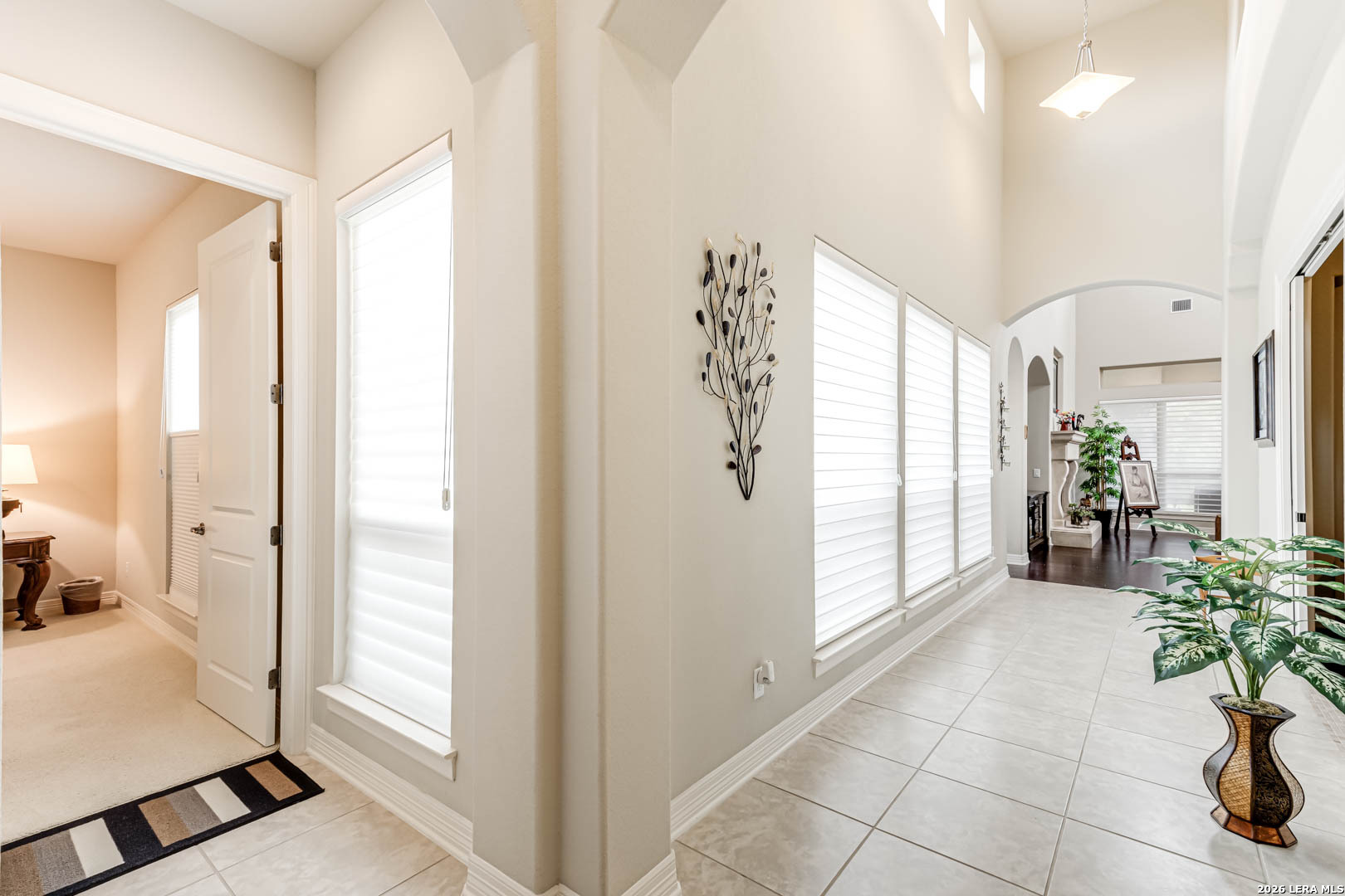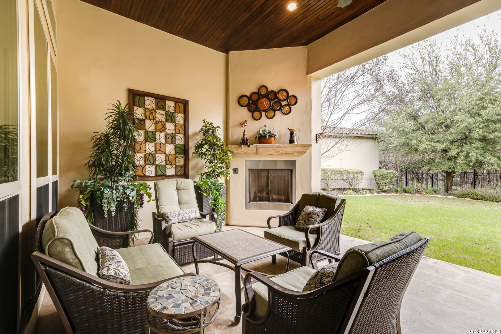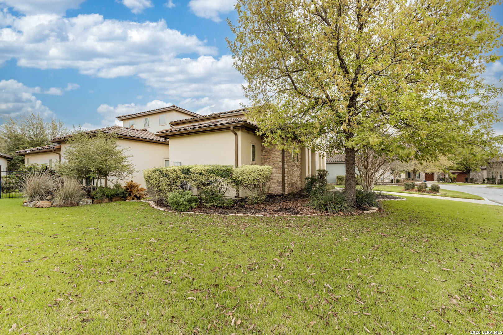 Experience refined living in this elegant one-story garden home offering 3,004 sq. ft. of thoughtfully designed space. The home features three spacious bedrooms, each with its own full bathroom, plus a convenient powder room for guests and a large private study-ideal for a home office or library. Beautiful wood flooring flows throughout the main living areas, complementing a chef-inspired gourmet kitchen with a striking granite island, gas cooktop, built-in oven and microwave, refrigerator, wine fridge, and custom blinds. The spacious living area invites relaxation with a beautiful fireplace, while a second fireplace on the covered patio creates the perfect setting for seamless indoor-outdoor entertaining. The private backyard backs to a tranquil greenbelt and scenic hiking trail, providing both privacy and serenity.Located in an exclusive community just steps from the luxurious JW Marriott San Antonio Hill Country Resort & Spa and minutes from premier shopping, dining, and medical facilities, this home offers an exceptional opportunity to enjoy a truly elegant lifestyle.