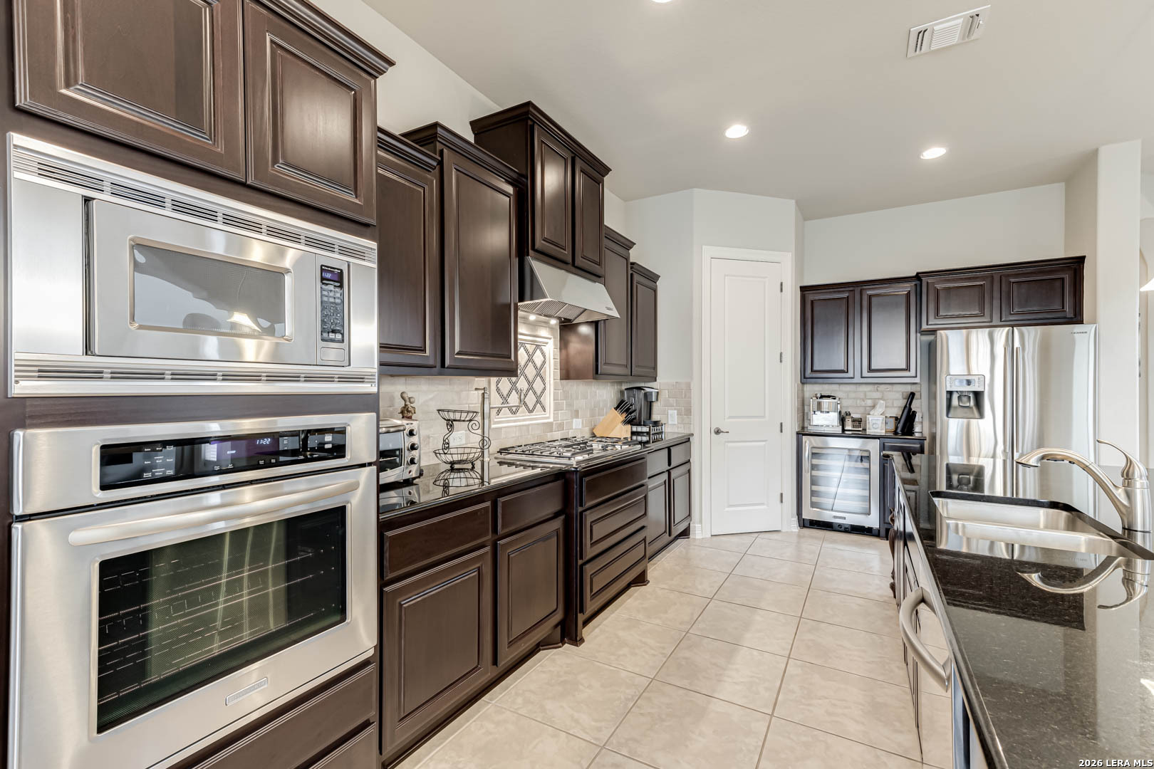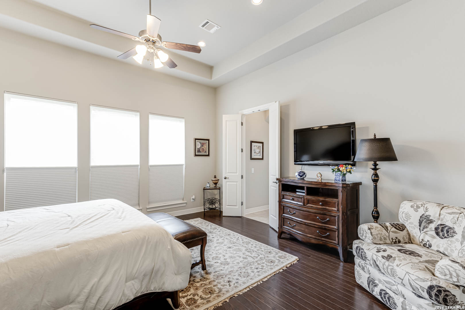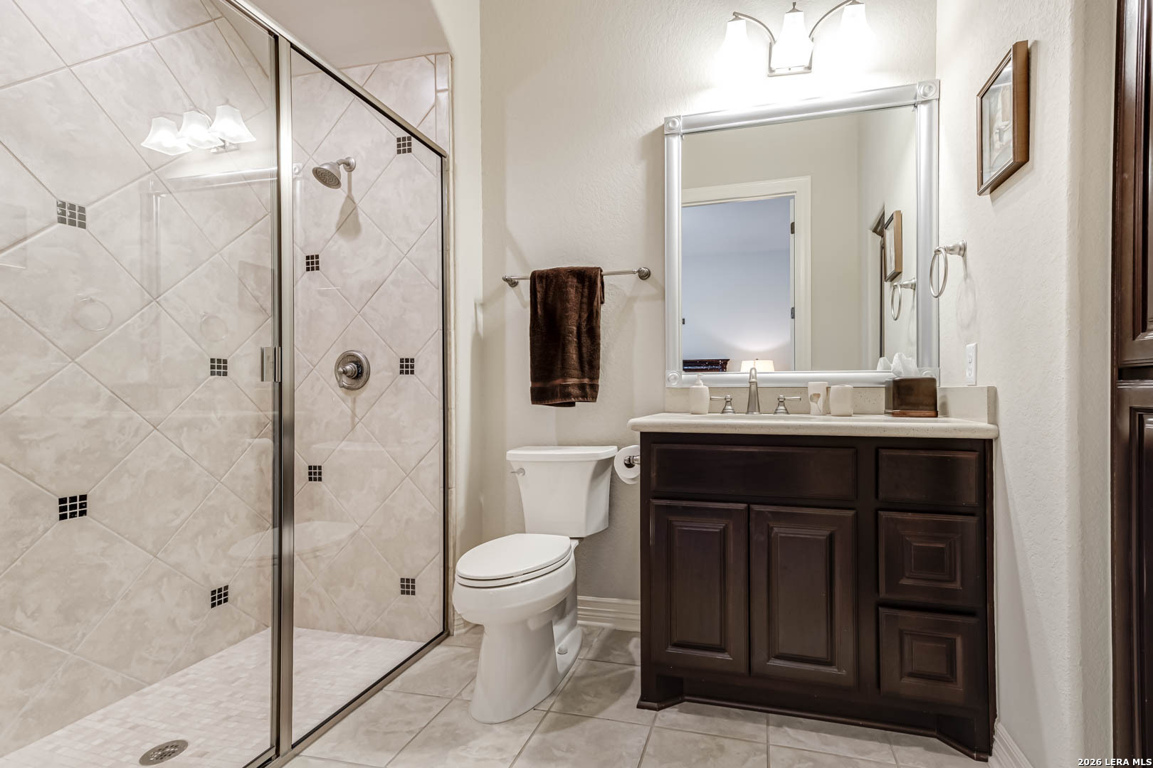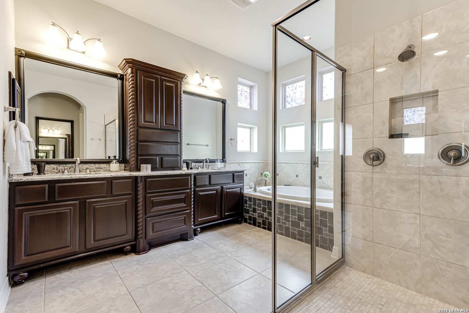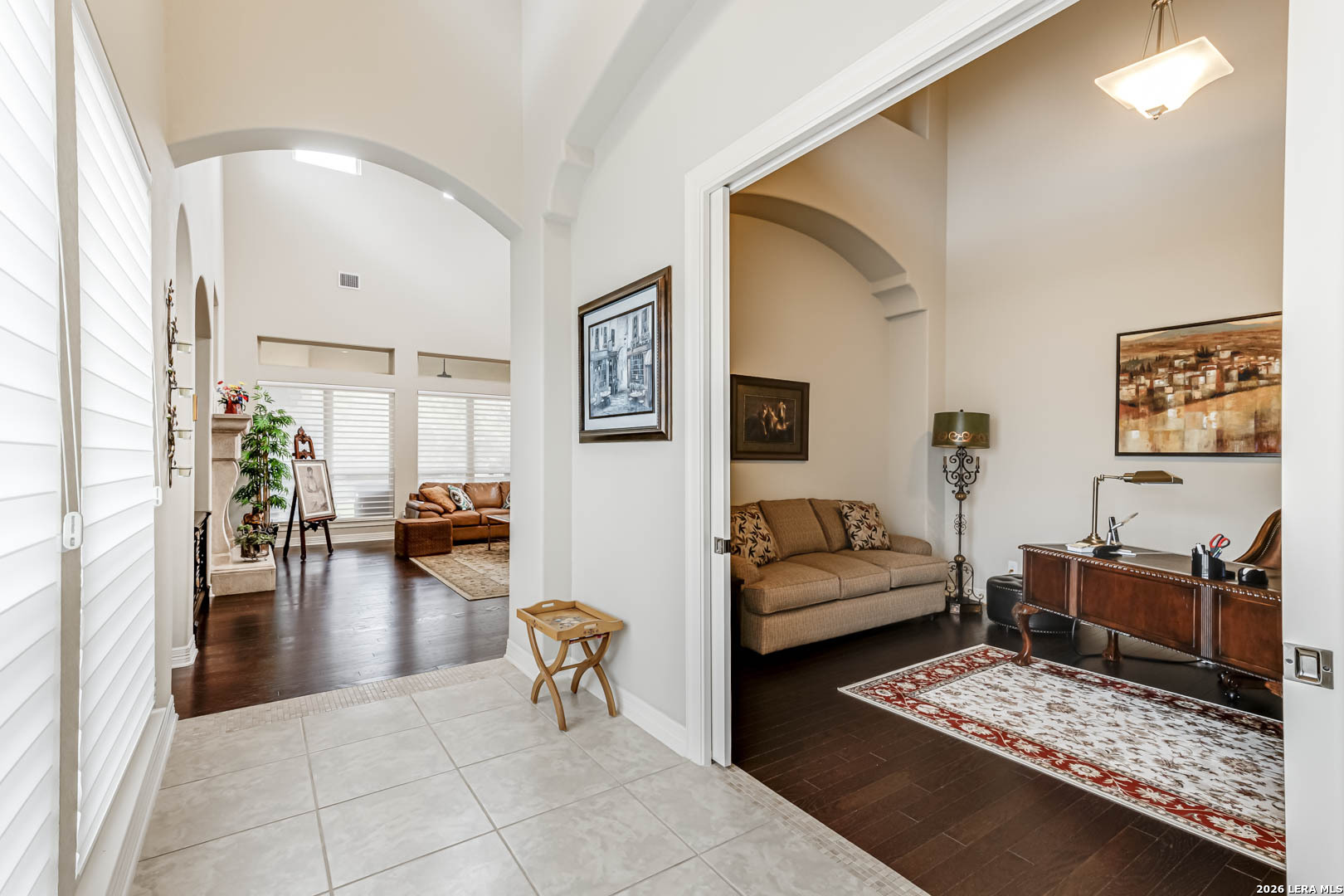 Experience refined living in this elegant one-story garden home offering 3,004 sq. ft. of thoughtfully designed space. The home features three spacious bedrooms, each with its own full bathroom, plus a convenient powder room for guests and a large private study-ideal for a home office or library. Beautiful wood flooring flows throughout the main living areas, complementing a chef-inspired gourmet kitchen with a striking granite island, gas cooktop, built-in oven and microwave, refrigerator, wine fridge, and custom blinds. The spacious living area invites relaxation with a beautiful fireplace, while a second fireplace on the covered patio creates the perfect setting for seamless indoor-outdoor entertaining. The private backyard backs to a tranquil greenbelt and scenic hiking trail, providing both privacy and serenity.Located in an exclusive community just steps from the luxurious JW Marriott San Antonio Hill Country Resort & Spa and minutes from premier shopping, dining, and medical facilities, this home offers an exceptional opportunity to enjoy a truly elegant lifestyle.