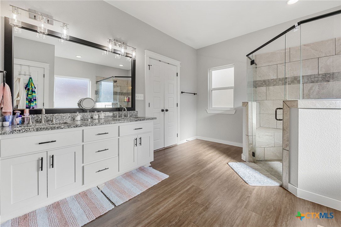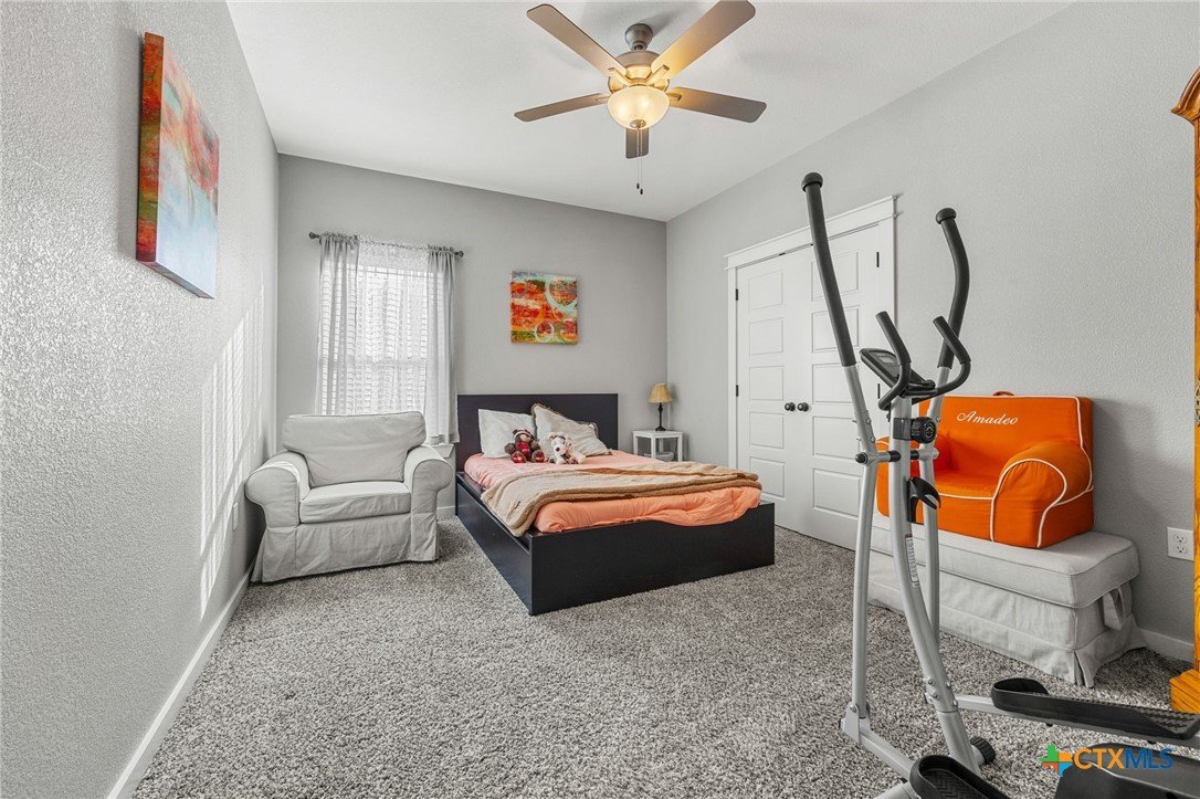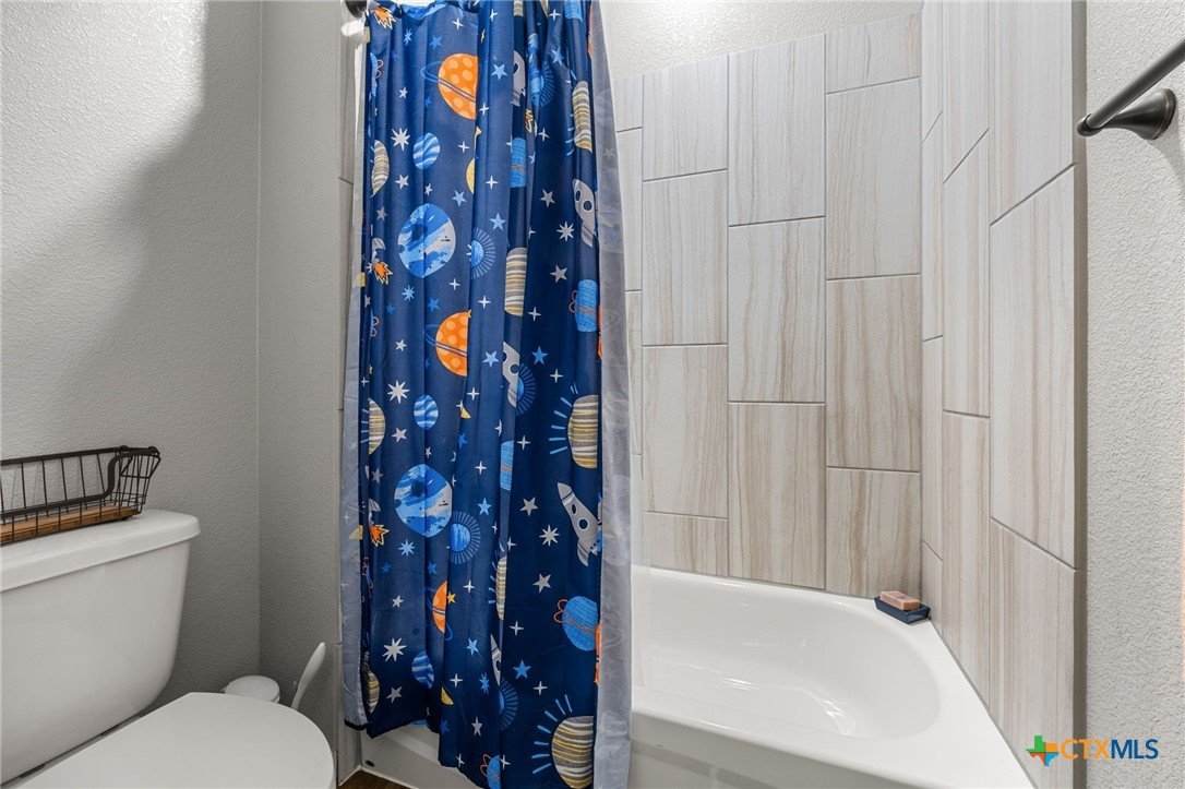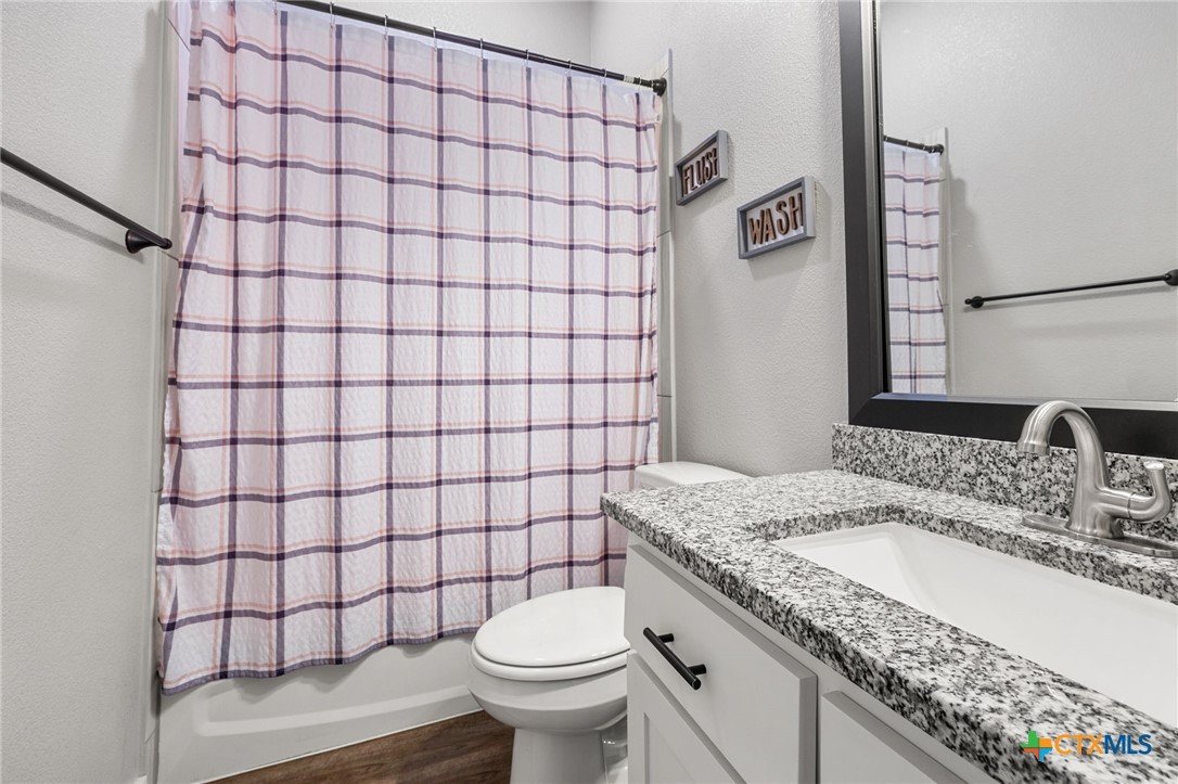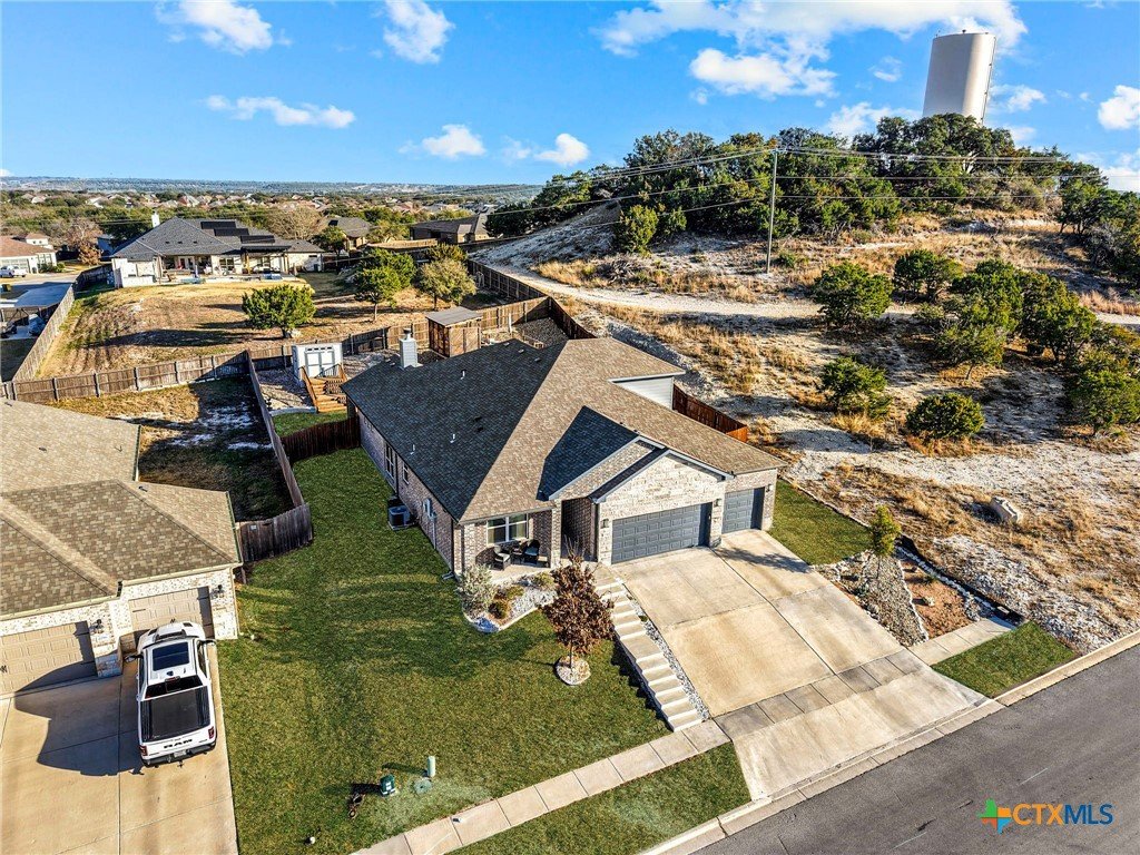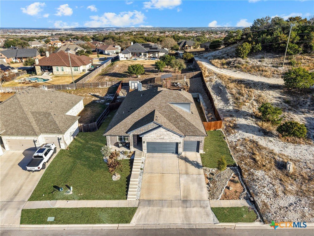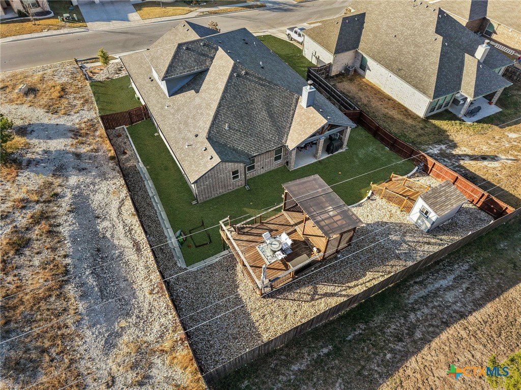 Welcome to this beautiful five bedroom, three bathroom, three car garage home in the Enclave at Warriors Legacy, offering a spacious layout and thoughtful design throughout. Exterior features include an irrigation system, gutters, concrete steps leading to the front entry, and a third garage bay that is fully separated by a framed wall, creating a private, enclosed space ideal for a traditional garage, gym, workshop, or flex room. The backyard was designed to complement the natural incline, creating a terraced outdoor retreat while still preserving a generous, level yard for everyday use. Enjoy the elevated, covered wood deck, ideal for relaxing or entertaining, along with a storage building at the upper level. Inside, a guest bedroom with a walk-in closet and a nearby full bathroom sits just off the entry, making it perfect for guests, multigenerational living, or a home office. The home opens into a spacious great room connecting the kitchen, dining, and living areas. The living room features a centered wood-burning fireplace, while the dining space comfortably fits a Texas-sized table. The kitchen offers a massive island, custom cabinetry, granite countertops, separate oven and cooktop, built-in microwave, vent hood, and oversized pantry. The primary suite provides a private retreat with a spa-like bathroom featuring a Texas-sized walk-in shower, double vanities, a soaker tub, and a large walk-in closet. The spacious layout allows room for a sitting area, creating a true owner’s retreat. Two additional bedrooms are located downstairs with great natural light and closet space. All bathrooms and the kitchen feature granite countertops. Upstairs includes a large fifth bedroom currently used as a movie room, plus a 10.5 by 31 foot unfinished attic with extensive decking for storage, along with additional storage throughout the home. Schedule your showing today!