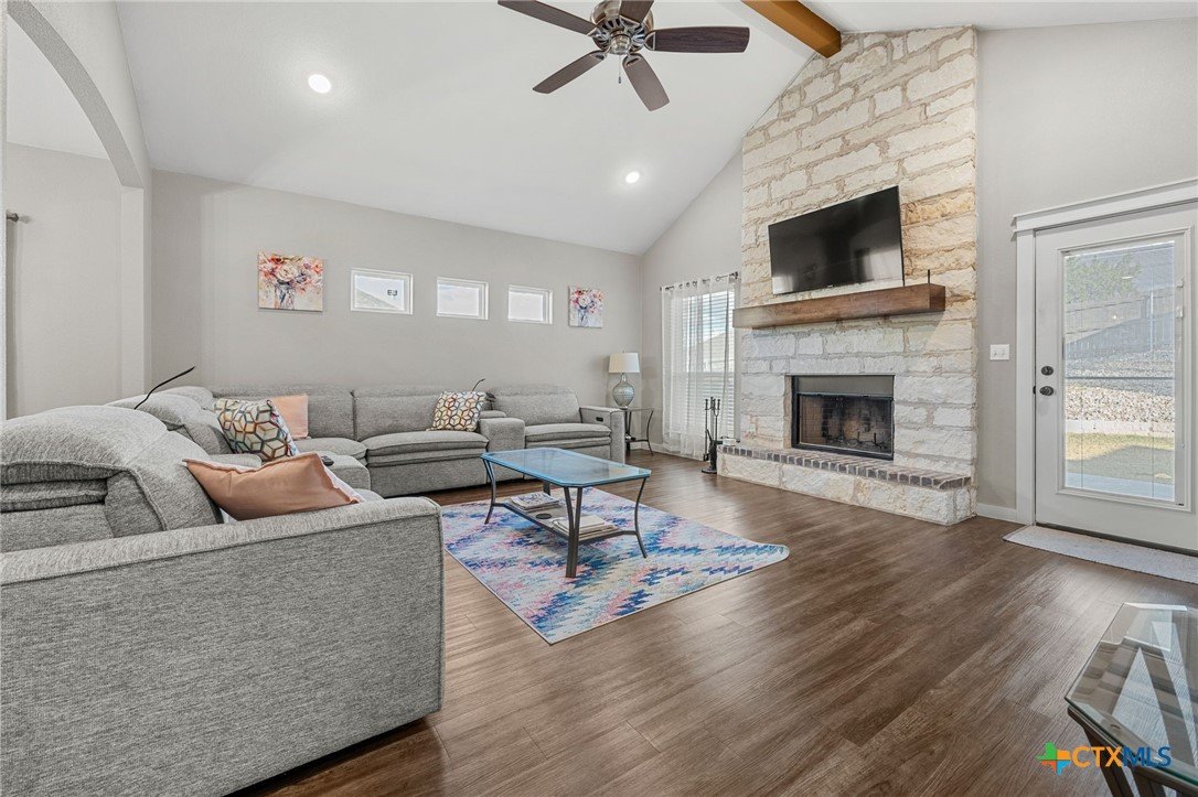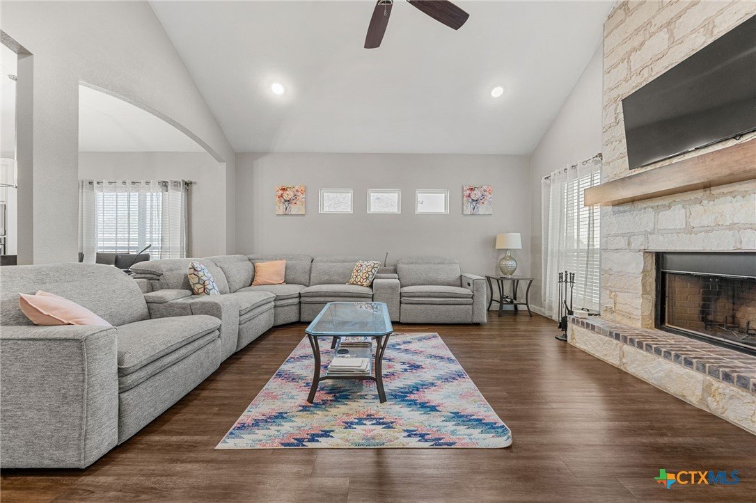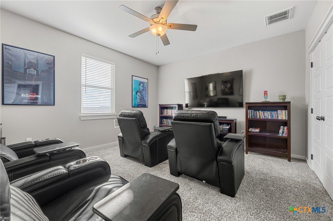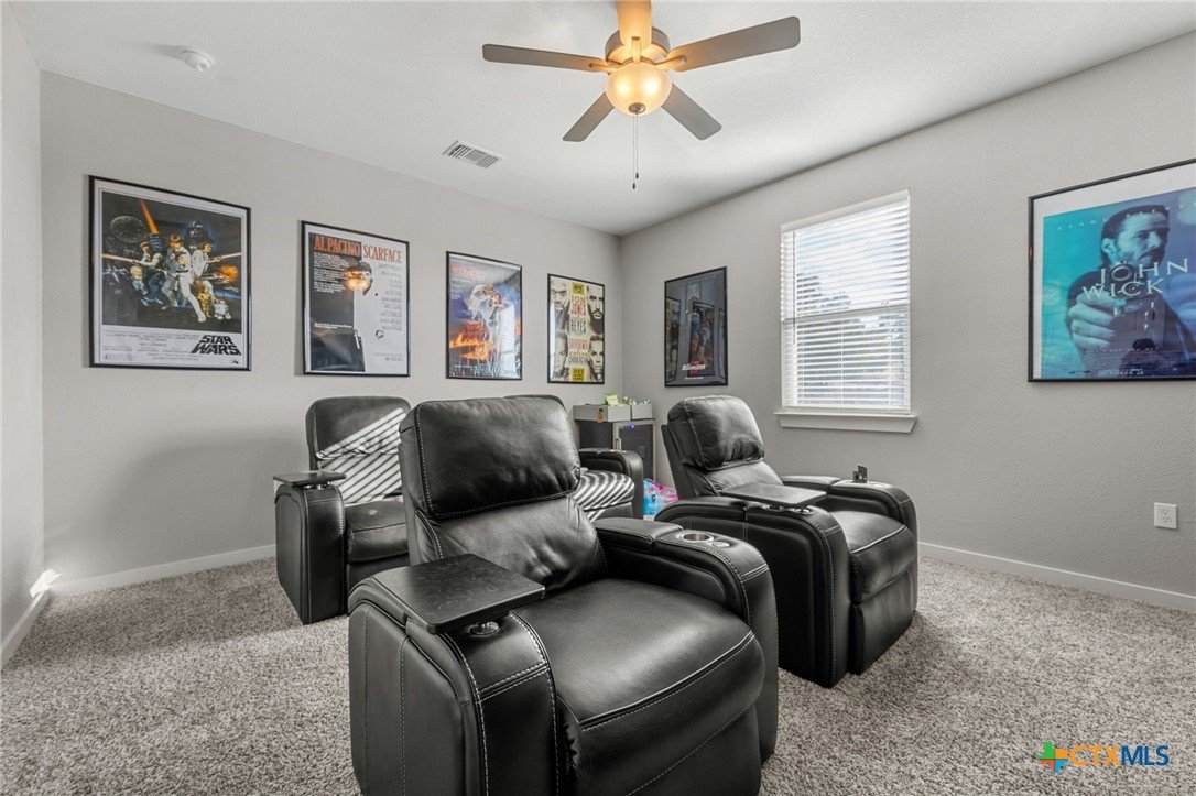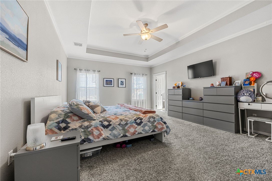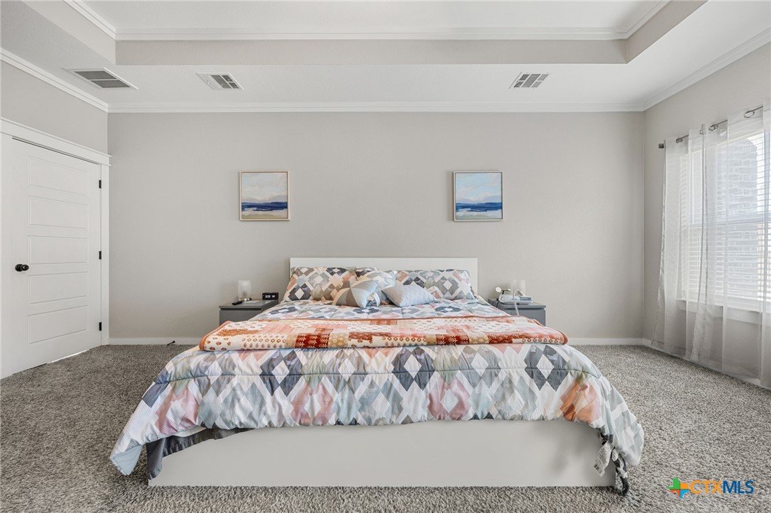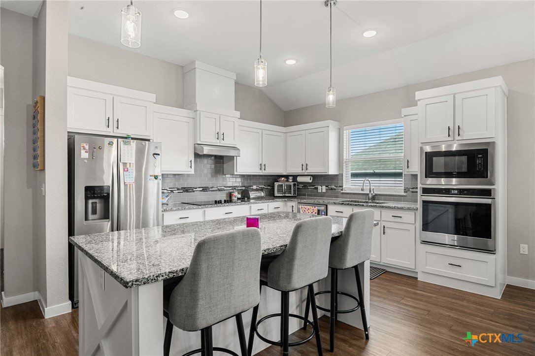 Welcome to this beautiful five bedroom, three bathroom, three car garage home in the Enclave at Warriors Legacy, offering a spacious layout and thoughtful design throughout. Exterior features include an irrigation system, gutters, concrete steps leading to the front entry, and a third garage bay that is fully separated by a framed wall, creating a private, enclosed space ideal for a traditional garage, gym, workshop, or flex room. The backyard was designed to complement the natural incline, creating a terraced outdoor retreat while still preserving a generous, level yard for everyday use. Enjoy the elevated, covered wood deck, ideal for relaxing or entertaining, along with a storage building at the upper level. Inside, a guest bedroom with a walk-in closet and a nearby full bathroom sits just off the entry, making it perfect for guests, multigenerational living, or a home office. The home opens into a spacious great room connecting the kitchen, dining, and living areas. The living room features a centered wood-burning fireplace, while the dining space comfortably fits a Texas-sized table. The kitchen offers a massive island, custom cabinetry, granite countertops, separate oven and cooktop, built-in microwave, vent hood, and oversized pantry. The primary suite provides a private retreat with a spa-like bathroom featuring a Texas-sized walk-in shower, double vanities, a soaker tub, and a large walk-in closet. The spacious layout allows room for a sitting area, creating a true owner’s retreat. Two additional bedrooms are located downstairs with great natural light and closet space. All bathrooms and the kitchen feature granite countertops. Upstairs includes a large fifth bedroom currently used as a movie room, plus a 10.5 by 31 foot unfinished attic with extensive decking for storage, along with additional storage throughout the home. Schedule your showing today!