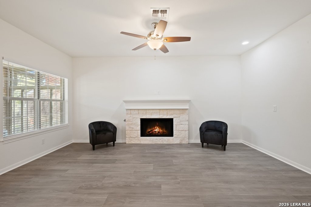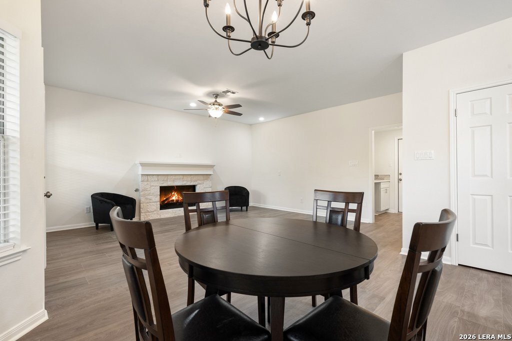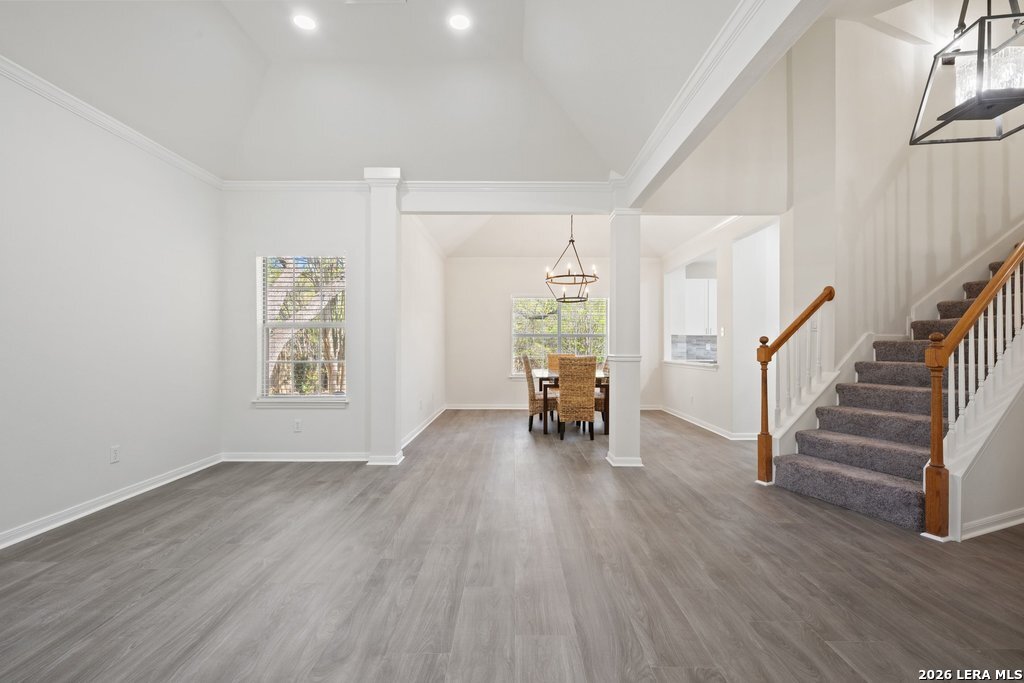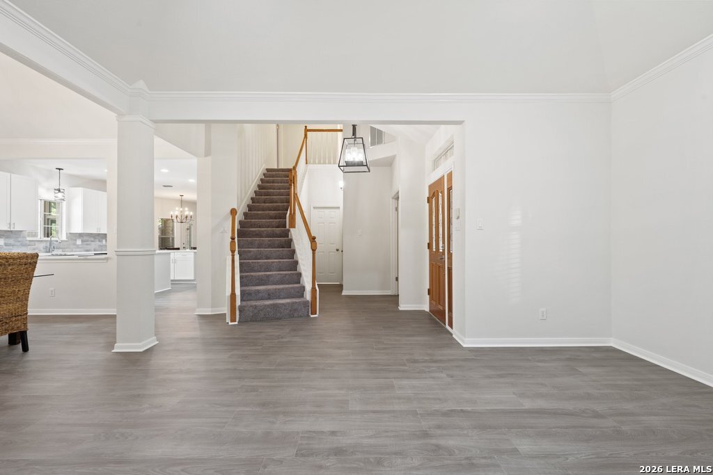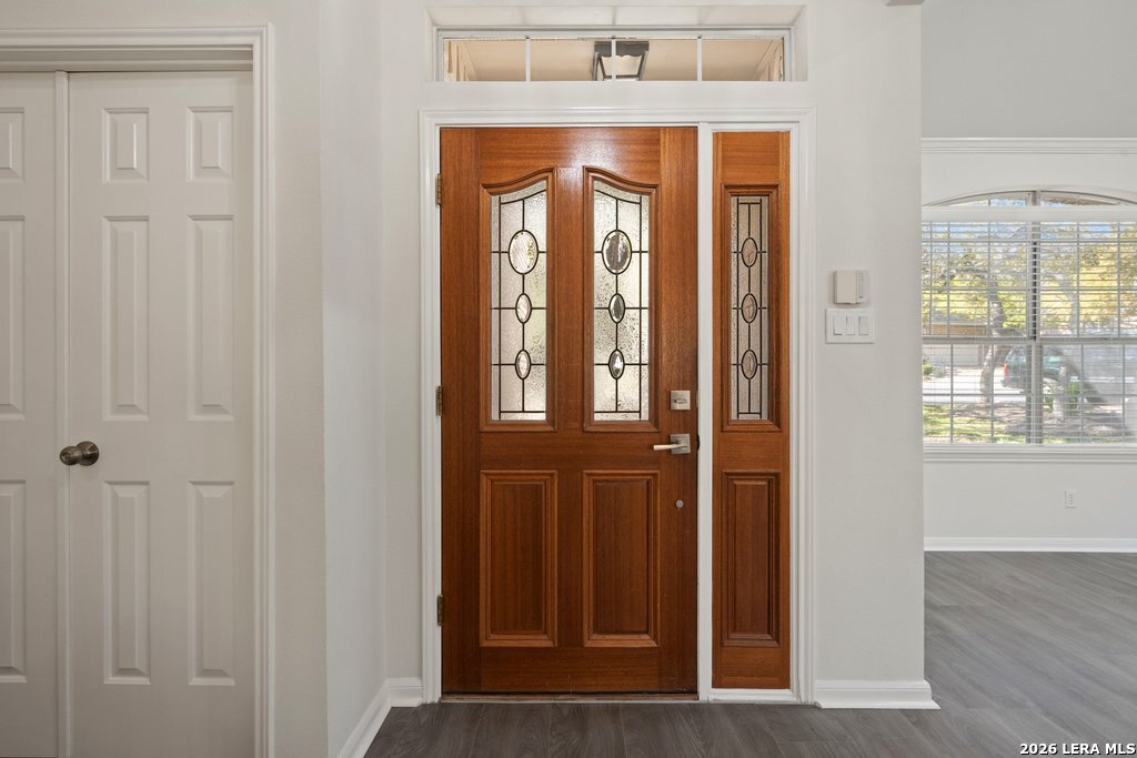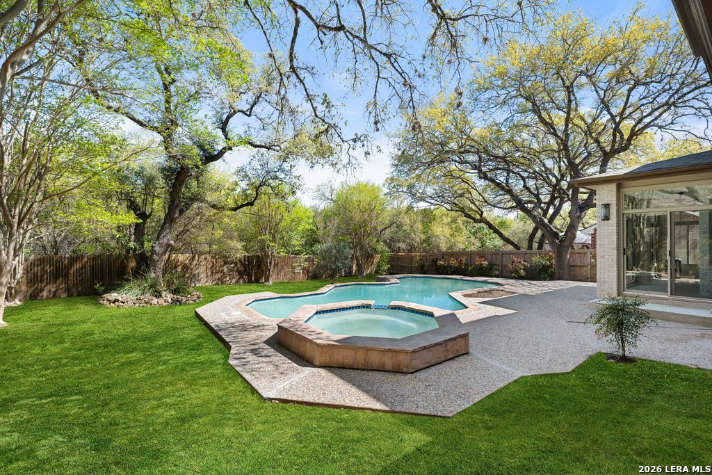 Excellent location! Enjoy a lifestyle of comfort and privacy in this beautifully updated custom home on an oversized greenbelt lot in the gated Woods of Deerfield. Recent improvements include quartz countertops in the kitchen and bathrooms, all new cabinetry, luxury vinyl plank flooring, new carpet, and updated lighting and hardware throughout. The home welcomes you with a grand entry, soaring ceilings, and abundant natural light. Formal living and dining areas provide ideal spaces for entertaining, while the updated kitchen offers generous workspace, a walk-in pantry, and opens seamlessly to the breakfast area and family room. The spacious primary suite is located upstairs and features high ceilings, dual vanities, and a large walk-in closet. Secondary bedrooms offer ample storage, and a downstairs guest bedroom can easily serve as a private office. An upstairs family/flex room provides additional living space and could function as a fifth bedroom if desired. Practicality meets convenience with dual utility areas-an upstairs laundry room plus a mud/utility room off the garage complete with sink and space for a refrigerator. The sunroom offers a bright retreat to enjoy year-round. Step outside to a true backyard oasis featuring mature trees, a pool and spa, and an expansive yard overlooking the greenbelt for exceptional privacy. A circular drive enhances curb appeal and leads to an oversized two-car garage with workshop space and plenty of additional parking.