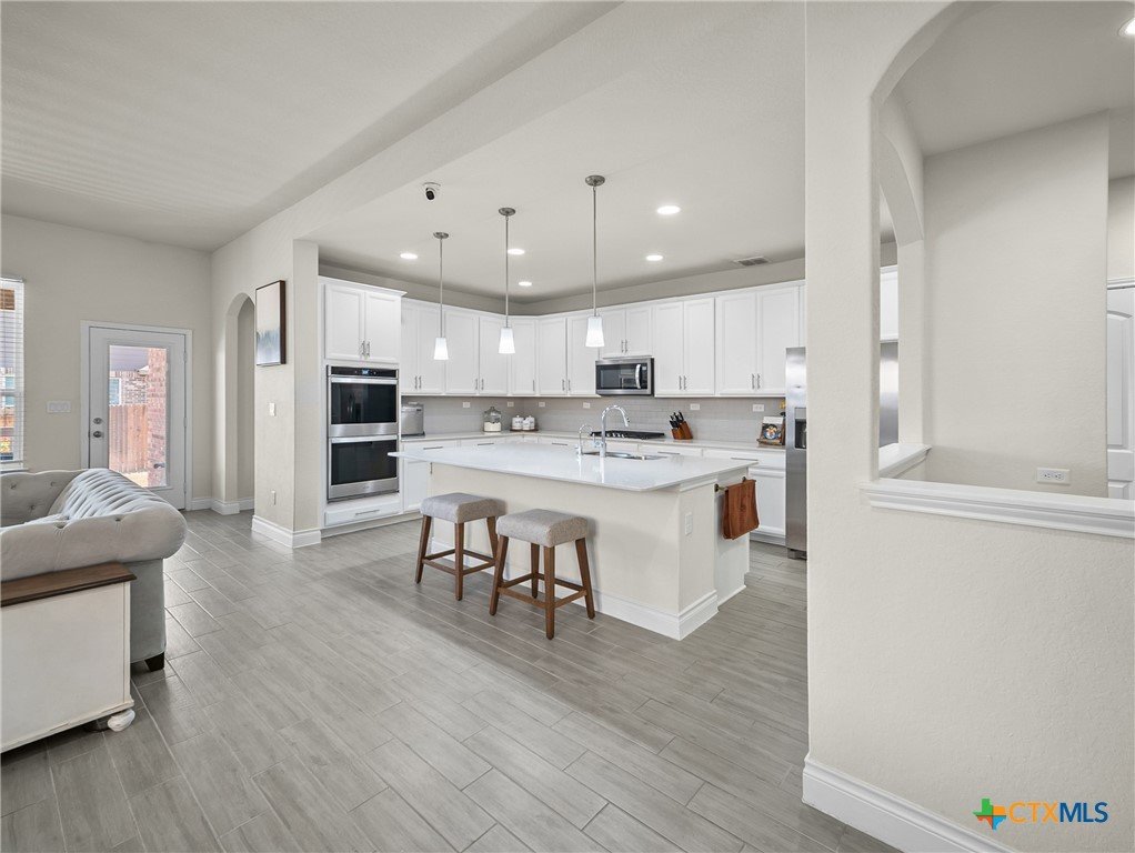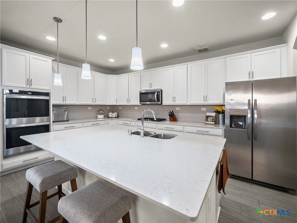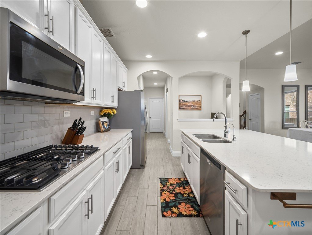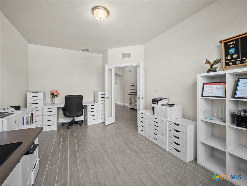The best value per square foot in Veramendi right now. This Pulte-built, four-sided masonry home delivers the durability buyers want, paired with a layout that actually works for everyday living. From the moment you walk in, it flows. A private study with glass French doors sits just off the entry, opening into a bright, connected living, dining, and kitchen space with soaring ceilings, wood-look tile flooring, and natural light throughout. The kitchen is built for real life, with white cabinetry, subway tile backsplash, Corian countertops, a large island, double ovens, and a gas range designed for both daily use and gathering. The downstairs primary suite offers privacy and function, featuring dual walk-in closets, elevated vanities, and an expanded walk-in shower. Upstairs, a large flex space adds flexibility for a gym, media room, or second living area, along with three additional bedrooms, including one with a private ensuite. A 2.5-car tandem garage provides the extra space most homes lack, ideal for storage, a workshop, or keeping a third vehicle or gear tucked away. Step outside to an extended covered patio and landscaped backyard designed for easy enjoyment without extra upkeep. Located just a short walk to Veramendi Elementary, with quick access to I-35, downtown New Braunfels, Gruene, and community amenities including trails, parks, and The Ledge pool. Timing matters - Move in by Memorial Day, settle in over the summer, and start the next school year already in place. And for qualified buyers, there’s a strategic advantage...assume the current VA loan, offering potential long-term savings compared to today’s market rates.