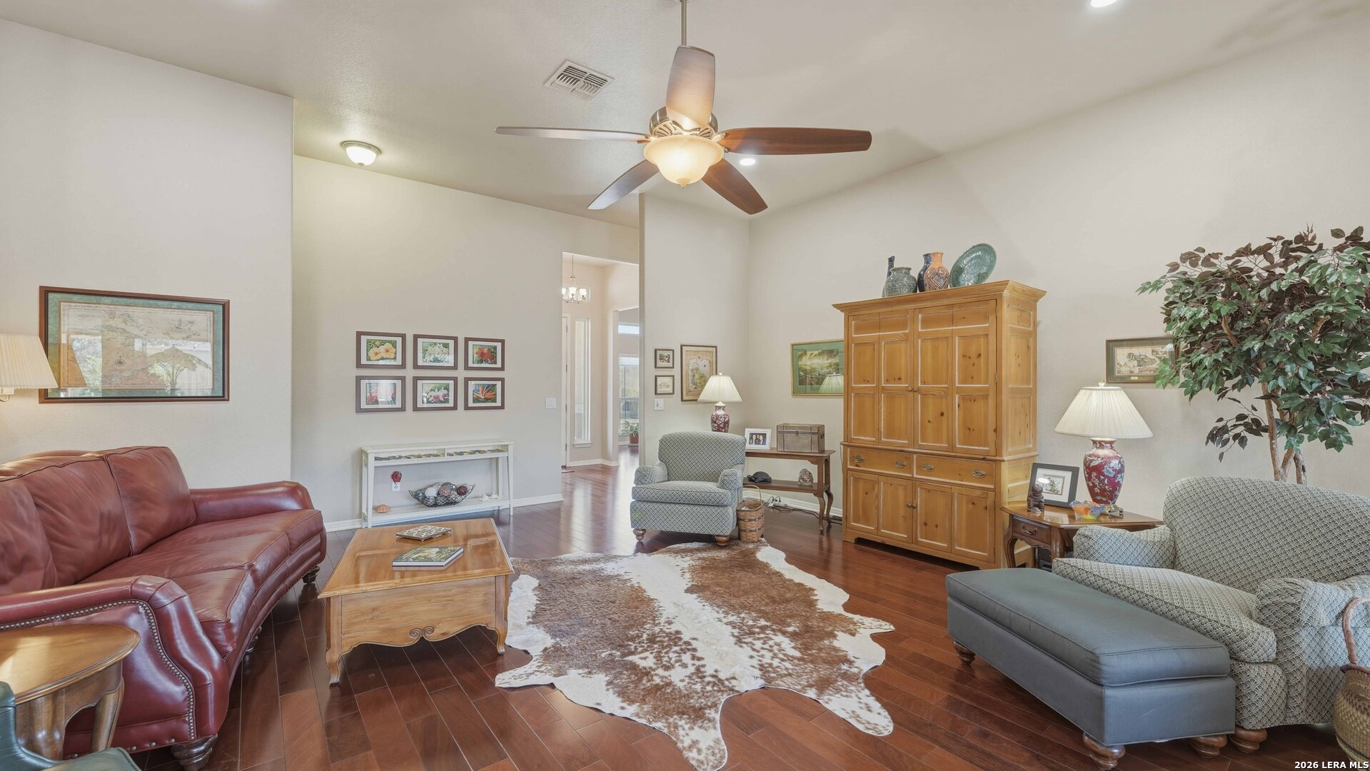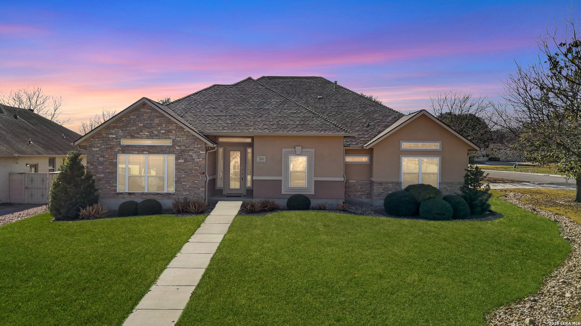 This beautifully maintained single-story home offers 3 bedrooms and 2.5 baths on just under a third of an acre in the highly sought-after Southbank subdivision. From the moment you step inside, you'll feel right at home in the elegant, light-filled open floor plan designed for both comfort and style. Rich wood floors flow throughout the main living areas, leading into a gourmet kitchen featuring custom cabinetry, quality finishes, and thoughtful design details. The spacious, sequestered primary suite serves as a private retreat with a large walk-in closet and a luxurious bath complete with double vanities, a separate shower, and a relaxing garden tub. Two generously sized secondary bedrooms share a well-appointed full bath. Designed for living and entertaining, this home boasts two inviting living areas, two dining spaces, a versatile bonus room just off the kitchen-perfect for a home office, hobby room, or play space-and an oversized laundry room with ample storage. Step outside to your own private oasis. The incredible covered patio is highlighted by a tranquil water feature and a dramatic fire feature, creating the perfect setting for entertaining guests or simply unwinding at the end of the day. Residents of Southbank enjoy exceptional neighborhood amenities, including access to the Guadalupe River and Lake Dunlap, a community pool, fitness facility, sports courts, clubhouse, playground, dog park, and even a lending library-all conveniently located near schools, shopping, and dining. Welcome HOME!