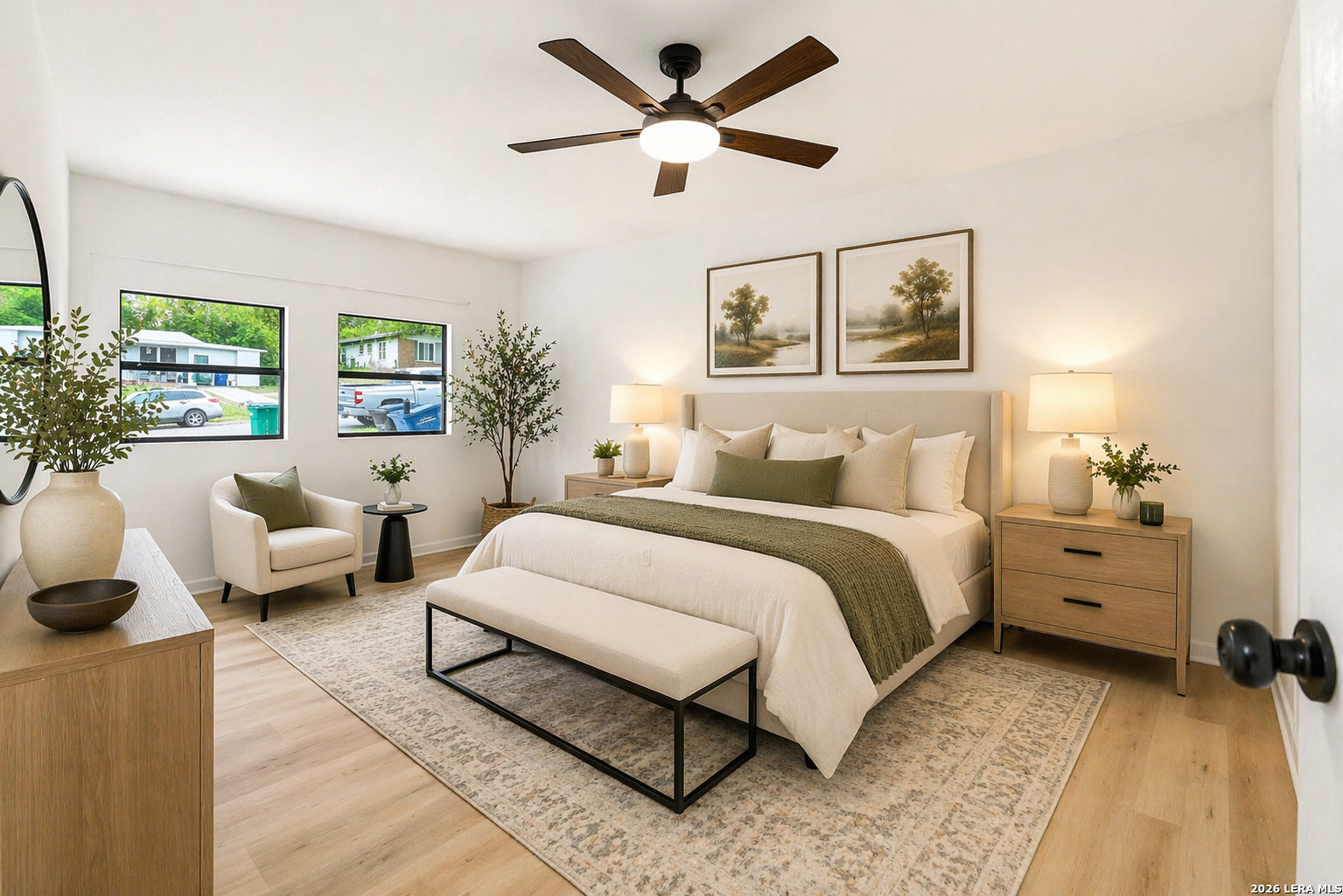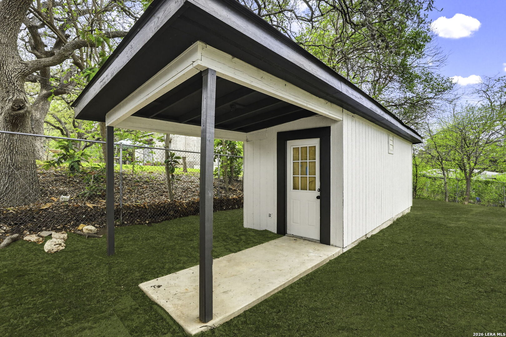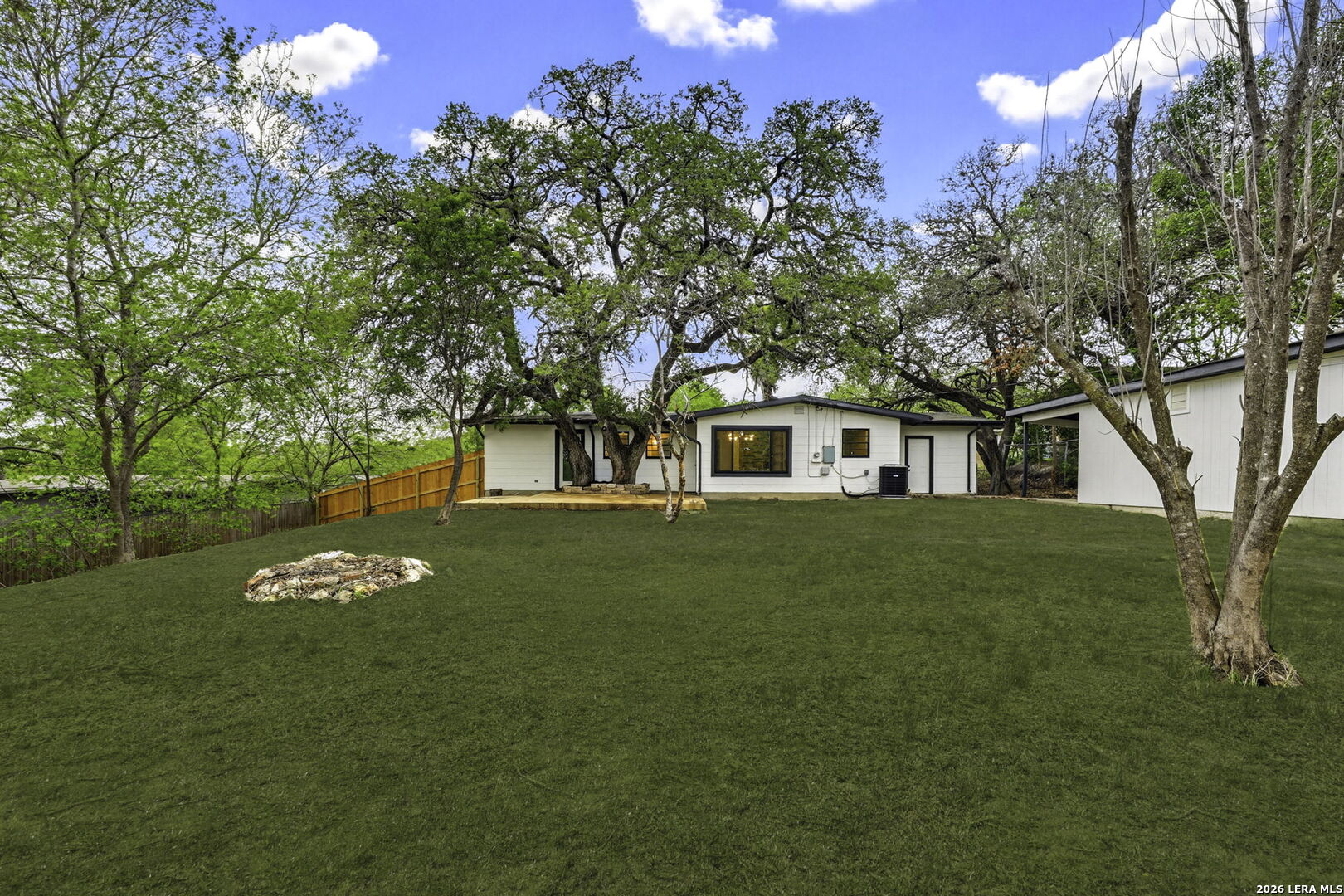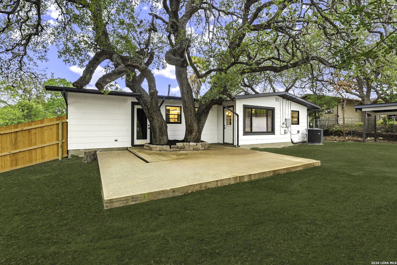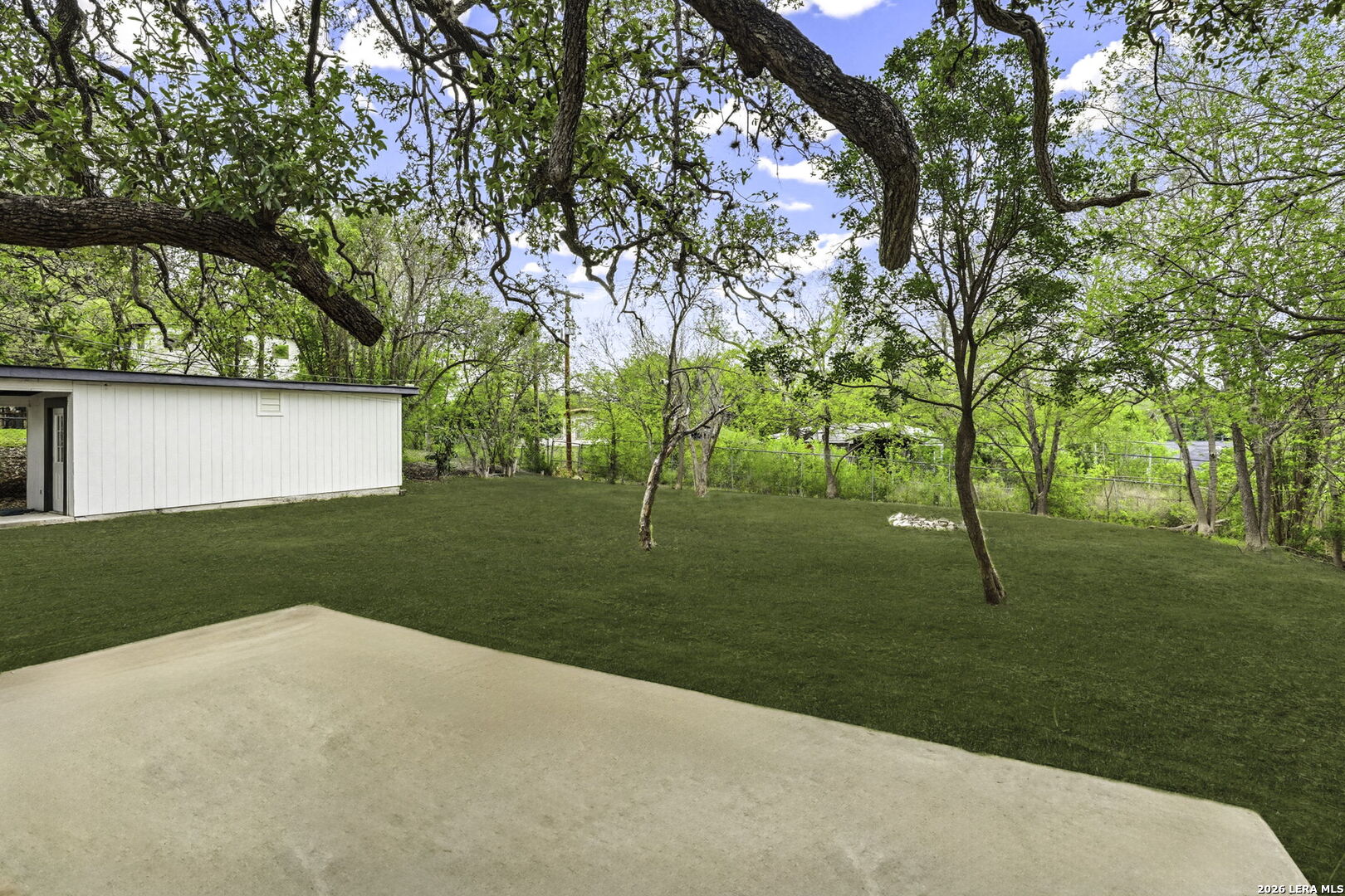 Fully Renovated Mid-Century on 1/3 Acre | Gas Cooking | Huge Yard. Move-in ready and fully renovated, this rare mid-century modern home sits on an expansive 1/3 acre lot surrounded by mature trees, offering a level of space, privacy, and character that is hard to find in San Antonio. This 4-bedroom, 2-bath home offers 1,526 square feet of open concept living, blending clean modern updates with timeless original charm. From the moment you arrive, the curb appeal stands out with its classic brick exterior, updated finishes, and beautiful tree-lined setting. Inside, you will find a bright and open layout featuring newly refinished original hardwood floors, luxury vinyl plank in the kitchen, fresh paint, and large picture windows that fill the home with natural light. The updated kitchen includes new cabinets, countertops, and gas cooking, combining modern convenience with classic design. What truly sets this home apart is its character. Original mid-century details like the built-in hutch, brick accents, and vintage-inspired bathrooms have been thoughtfully preserved, giving the home a style and feel you will not find in typical cookie-cutter renovations. Additional upgrades include: New HVAC system, New flooring throughout, Updated kitchen and bathrooms, Gas cooking, New windows, including large picture windows, Newer roof and water heater, Large dedicated laundry room, Huge storage building with endless possibilities, and More. Step outside and you will see the true value. The massive backyard offers endless possibilities with room to entertain, garden, expand, or simply enjoy the privacy and shade from mature trees. Properties with this kind of lot size this close to the city are rare. Located in San Antonio with quick access to Loop 410, I-10, and the Medical Center, this home is convenient to major employers, shopping, dining, parks, and schools. This home is FHA and VA eligible and qualifies for 100% financing options, making it an excellent opportunity for first-time buyers or anyone looking for a turnkey home with space and character. Homes that combine fully renovated condition, large lots, and mid-century charm do not come available often. Schedule your showing today!