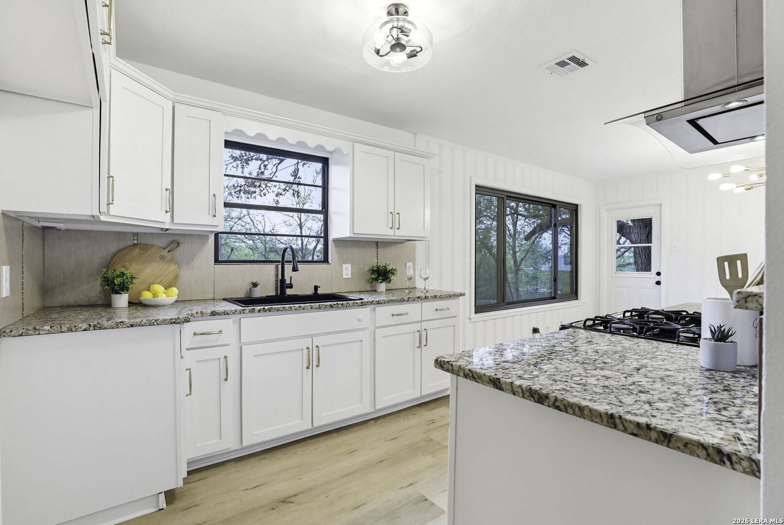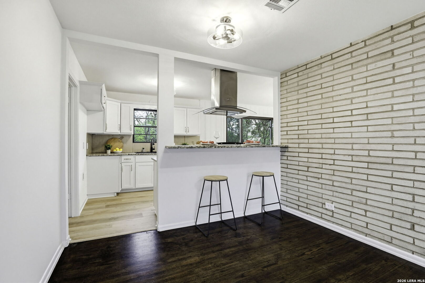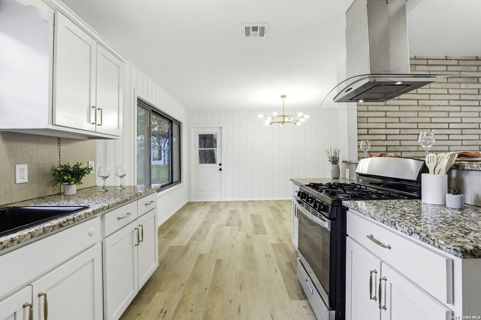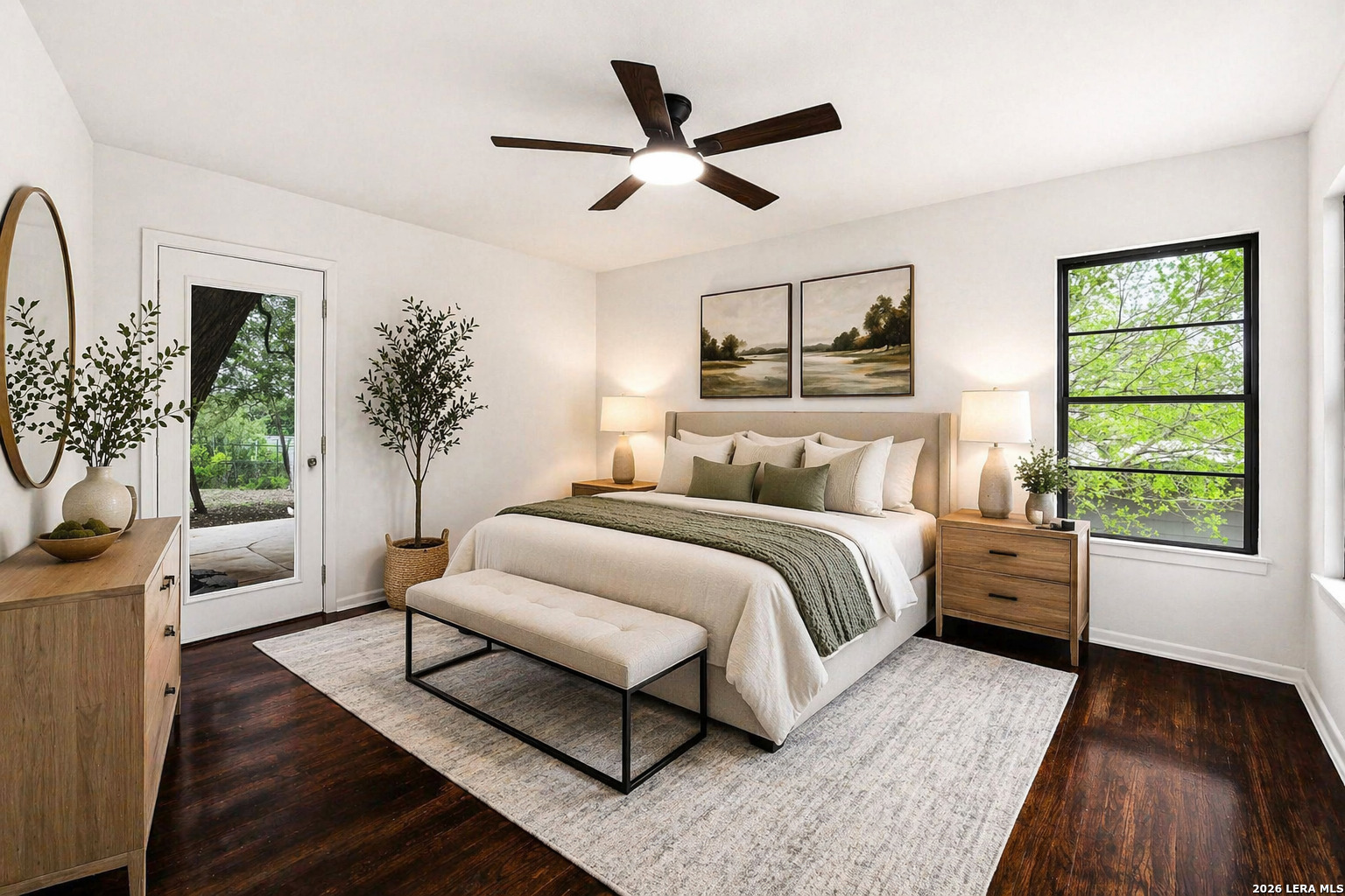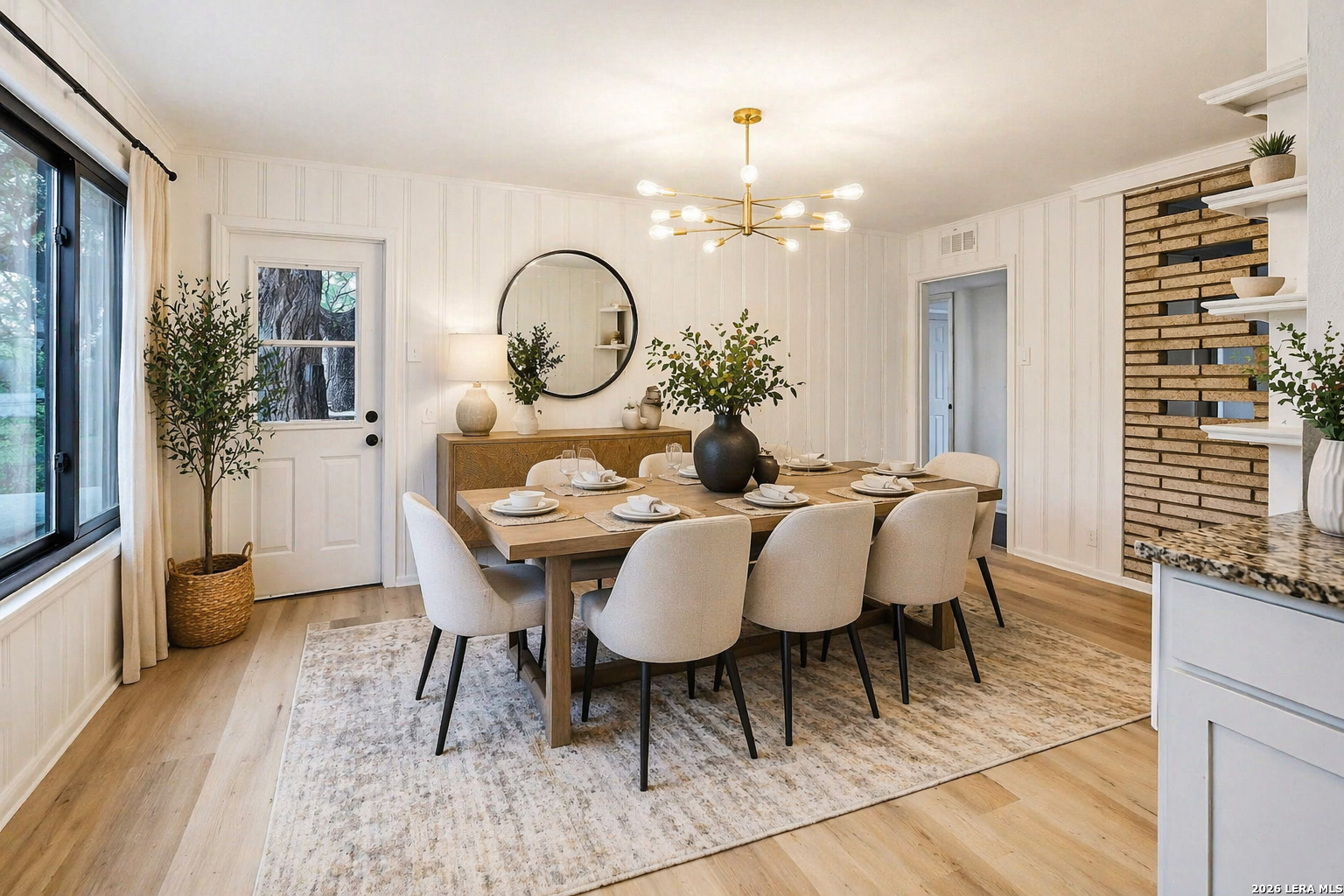 Fully Renovated Mid-Century on 1/3 Acre | Gas Cooking | Huge Yard. Move-in ready and fully renovated, this rare mid-century modern home sits on an expansive 1/3 acre lot surrounded by mature trees, offering a level of space, privacy, and character that is hard to find in San Antonio. This 4-bedroom, 2-bath home offers 1,526 square feet of open concept living, blending clean modern updates with timeless original charm. From the moment you arrive, the curb appeal stands out with its classic brick exterior, updated finishes, and beautiful tree-lined setting. Inside, you will find a bright and open layout featuring newly refinished original hardwood floors, luxury vinyl plank in the kitchen, fresh paint, and large picture windows that fill the home with natural light. The updated kitchen includes new cabinets, countertops, and gas cooking, combining modern convenience with classic design. What truly sets this home apart is its character. Original mid-century details like the built-in hutch, brick accents, and vintage-inspired bathrooms have been thoughtfully preserved, giving the home a style and feel you will not find in typical cookie-cutter renovations. Additional upgrades include: New HVAC system, New flooring throughout, Updated kitchen and bathrooms, Gas cooking, New windows, including large picture windows, Newer roof and water heater, Large dedicated laundry room, Huge storage building with endless possibilities, and More. Step outside and you will see the true value. The massive backyard offers endless possibilities with room to entertain, garden, expand, or simply enjoy the privacy and shade from mature trees. Properties with this kind of lot size this close to the city are rare. Located in San Antonio with quick access to Loop 410, I-10, and the Medical Center, this home is convenient to major employers, shopping, dining, parks, and schools. This home is FHA and VA eligible and qualifies for 100% financing options, making it an excellent opportunity for first-time buyers or anyone looking for a turnkey home with space and character. Homes that combine fully renovated condition, large lots, and mid-century charm do not come available often. Schedule your showing today!