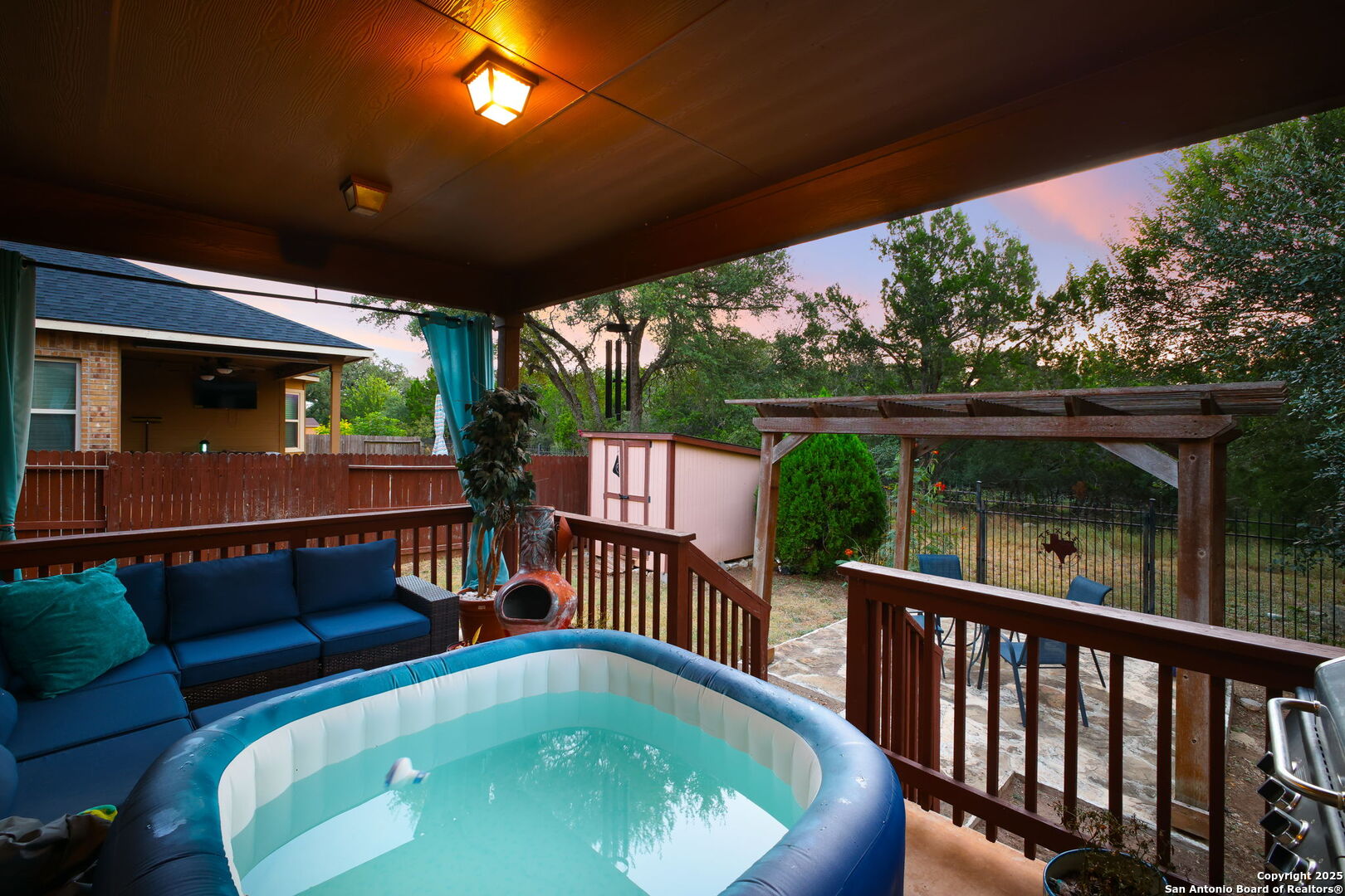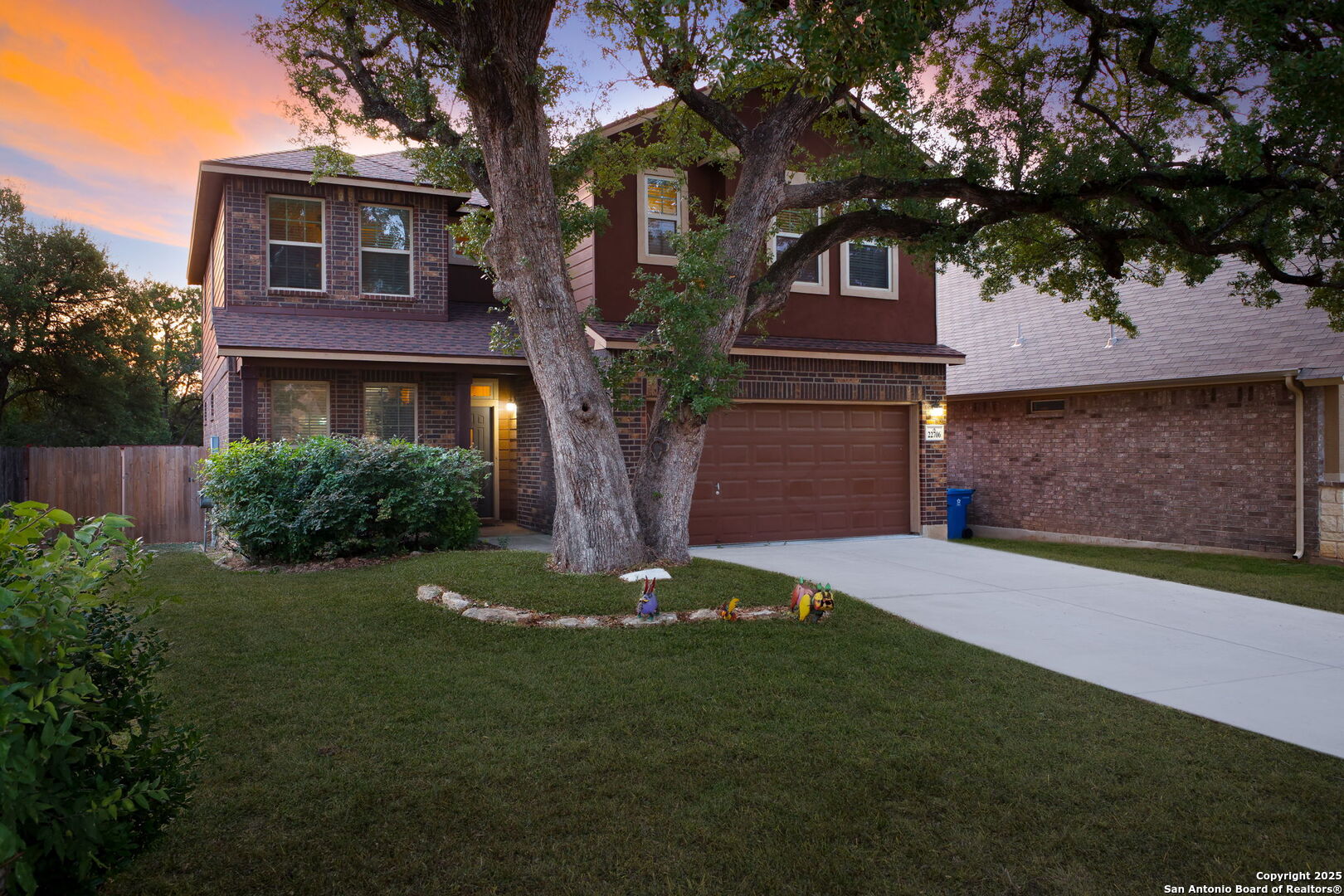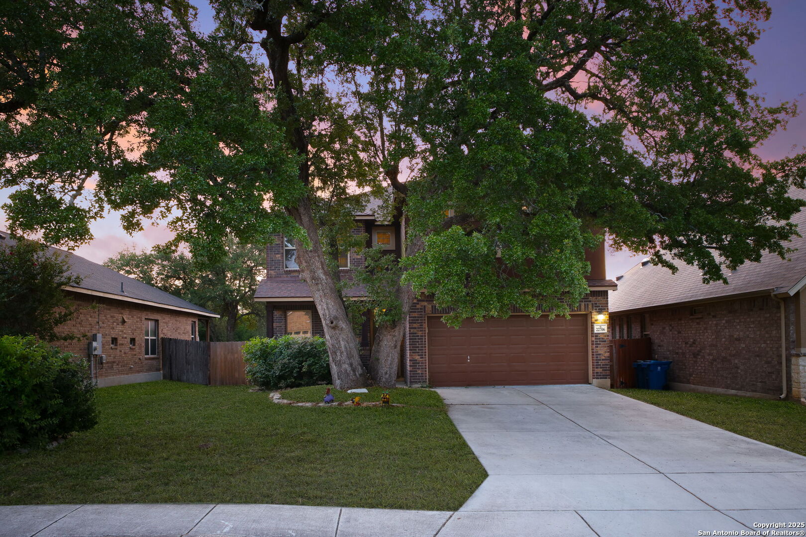 Welcome to 22706 Allegro Creek Drive, a beautifully maintained and thoughtfully upgraded two-story home nestled in the highly sought-after Wortham Oaks subdivision in Northeast San Antonio. This charming 4-bedroom, 2.5-bath home offers the perfect balance of elegance, comfort, and functionality - all set on a scenic greenbelt lot that provides privacy, tranquility, and views of lush Texas Hill Country. From the moment you arrive, the home's curb appeal impresses with its mature trees, lush landscaping, and inviting front porch. A brand new roof (2025) and new fencing provide peace of mind for years to come, while the brand new carpet throughout the upstairs adds a fresh, modern touch to this move-in-ready gem. Step inside and be greeted by a bright and open floor plan with tile flooring throughout the main level. The formal dining area and game room featuring a pool table welcome you with arched entryways and crown molding, creating a grand yet cozy atmosphere. The living room is spacious and filled with natural light, perfect for relaxing or entertaining. The heart of the home - the kitchen - boasts granite countertops, a central island, stainless steel appliances, gas cooking, and ample cabinet space. Enjoy casual meals at the breakfast bar or in the cozy breakfast nook overlooking the backyard. Upstairs, the primary suite is a luxurious retreat with generous space & a tray ceiling. The ensuite bathroom includes a soaking tub, separate shower, dual vanities, and a walk-in closet. Three additional well-sized bedrooms and a full bath complete the upper level. Enjoy year-round outdoor living under the covered patio with lighting and privacy curtains. Relax in the inflatable hot tub, or gather around the custom flagstone patio under a pergola, perfect for entertaining or enjoying quiet evenings under the stars. The greenbelt lot means no backyard neighbors and direct access to nature with peaceful wooded views. There's also a storage shed for convenience. Wortham Oaks is a gated, family-friendly community known for its exceptional amenities and welcoming atmosphere. Residents enjoy access to two sparkling community pools, multiple playgrounds, basketball courts, and picnic areas. The HOA organizes year-round family events, including movie nights, food truck gatherings, holiday parades, and seasonal festivals - a perfect way to build lasting connections with your neighbors. Located within the top-rated Judson Independent School District, Wortham Oaks is home to two newly built schools within the subdivision - Wortham Oaks Elementary and the newly opened Middle School (Fall 2025), offering parents the ultimate convenience and peace of mind with a short walk or bike ride to school for the kids. Enjoy the best of San Antonio living with nearby attractions and conveniences: Natural Bridge Caverns & Wildlife Ranch - Just minutes away for family-friendly outdoor adventures. The Forum at Olympia Parkway & Rolling Oaks Mall - Endless shopping and dining options. TPC San Antonio Golf Resort & JW Marriott Hill Country Resort & Spa - Perfect for golf enthusiasts and staycation seekers. McAllister Park and Bulverde Community Park - Great for outdoor activities, hiking, and sports. Easy access to Loop 1604, Highway 281, and IH-35, making commuting a breeze. This home is truly the complete package - combining ideal location, thoughtful upgrades, and unmatched community living. Whether you're a growing family, a first-time buyer, or someone looking for more space, 22706 Allegro Creek Drive offers everything you need and more.