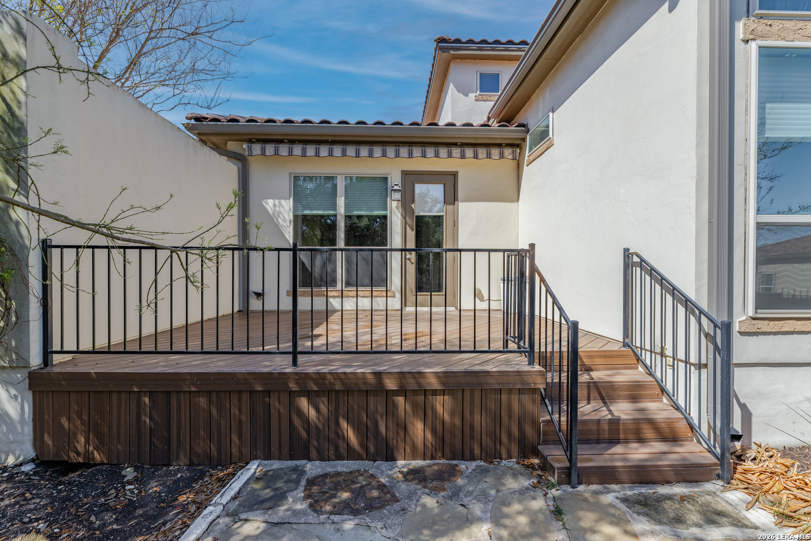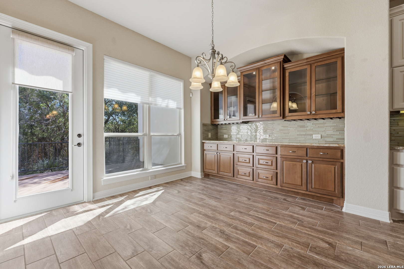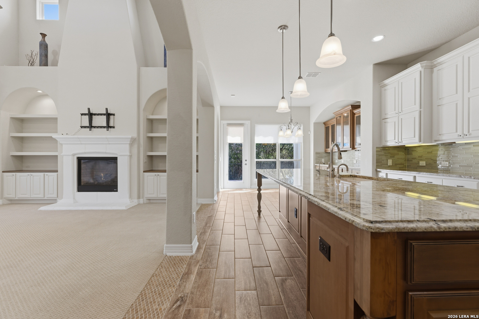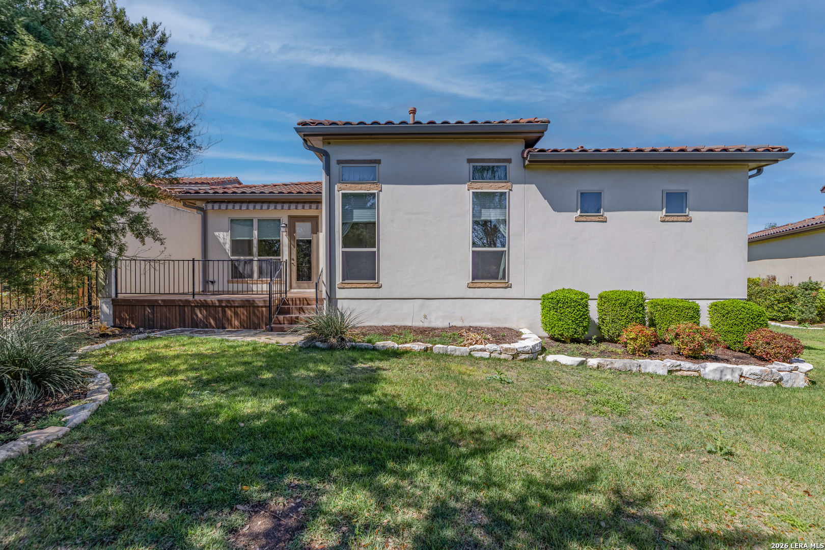 Experience elevated living in this stunning single-story home, with soaring ceilings and dramatic picture windows. Exceptional curb appeal is highlighted by lush, mature landscaping and manicured greenery. An expansive open-concept design offers seamless flow for refined entertaining and elevated everyday living. The grand living room features a statement fireplace, impressive ceiling heights, and abundant natural light. The gourmet kitchen is beautifully appointed with custom white cabinetry, a large island with bar seating, granite countertops, mosaic tile backsplash, and premium stainless steel appliances, including a gas cooktop. An adjoining dining area with a built-in bar adds both elegance and convenience. The private primary suite serves as a luxurious retreat, complete with tiered tray ceilings, floor-to-ceiling windows, and a spa-inspired en suite bath featuring dual vanities, a walk-in shower with rainfall feature, and a dedicated vanity space. A well-appointed secondary bedroom and a versatile office or optional third bedroom offer flexible accommodations. Outdoors, a spacious deck overlooks a beautifully landscaped backyard, offering a peaceful setting perfect for relaxing or entertaining. The space features both a covered patio and an additional patio with a retractable cover for flexible shade and comfort. Ideally located with convenient access to Hwy 281, premier schools, dining, and shopping, this home offers an exceptional blend of comfort, style, and sophistication.
