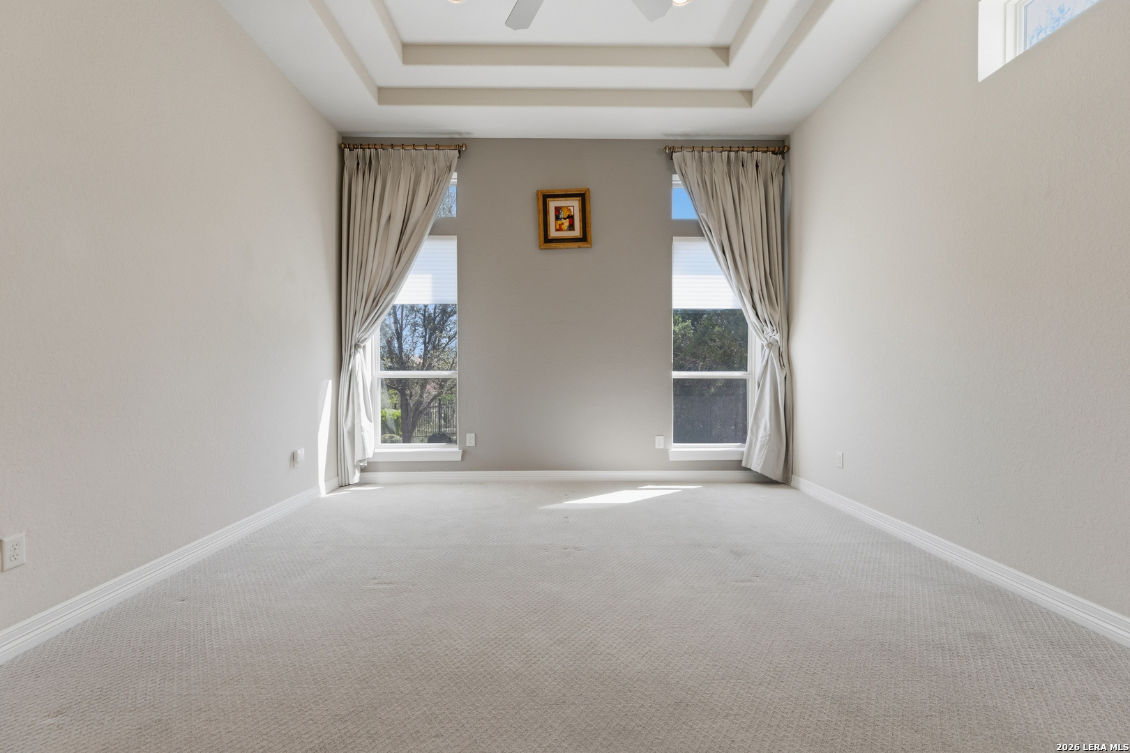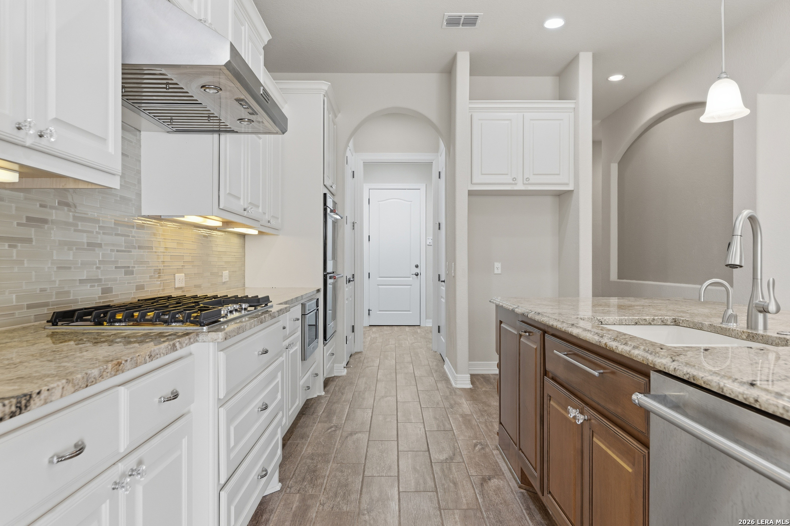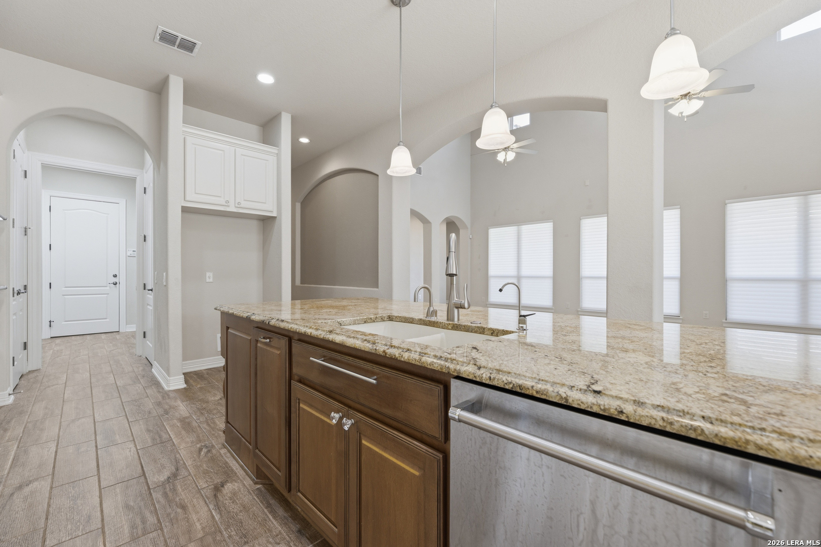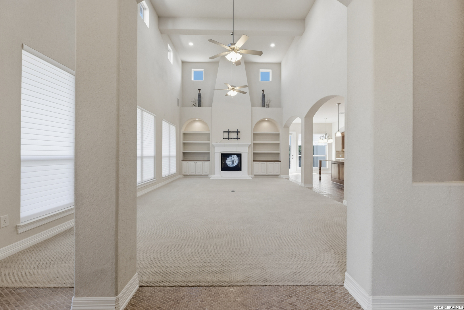 Experience elevated living in this stunning single-story home, with soaring ceilings and dramatic picture windows. Exceptional curb appeal is highlighted by lush, mature landscaping and manicured greenery. An expansive open-concept design offers seamless flow for refined entertaining and elevated everyday living. The grand living room features a statement fireplace, impressive ceiling heights, and abundant natural light. The gourmet kitchen is beautifully appointed with custom white cabinetry, a large island with bar seating, granite countertops, mosaic tile backsplash, and premium stainless steel appliances, including a gas cooktop. An adjoining dining area with a built-in bar adds both elegance and convenience. The private primary suite serves as a luxurious retreat, complete with tiered tray ceilings, floor-to-ceiling windows, and a spa-inspired en suite bath featuring dual vanities, a walk-in shower with rainfall feature, and a dedicated vanity space. A well-appointed secondary bedroom and a versatile office or optional third bedroom offer flexible accommodations. Outdoors, a spacious deck overlooks a beautifully landscaped backyard, offering a peaceful setting perfect for relaxing or entertaining. The space features both a covered patio and an additional patio with a retractable cover for flexible shade and comfort. Ideally located with convenient access to Hwy 281, premier schools, dining, and shopping, this home offers an exceptional blend of comfort, style, and sophistication.