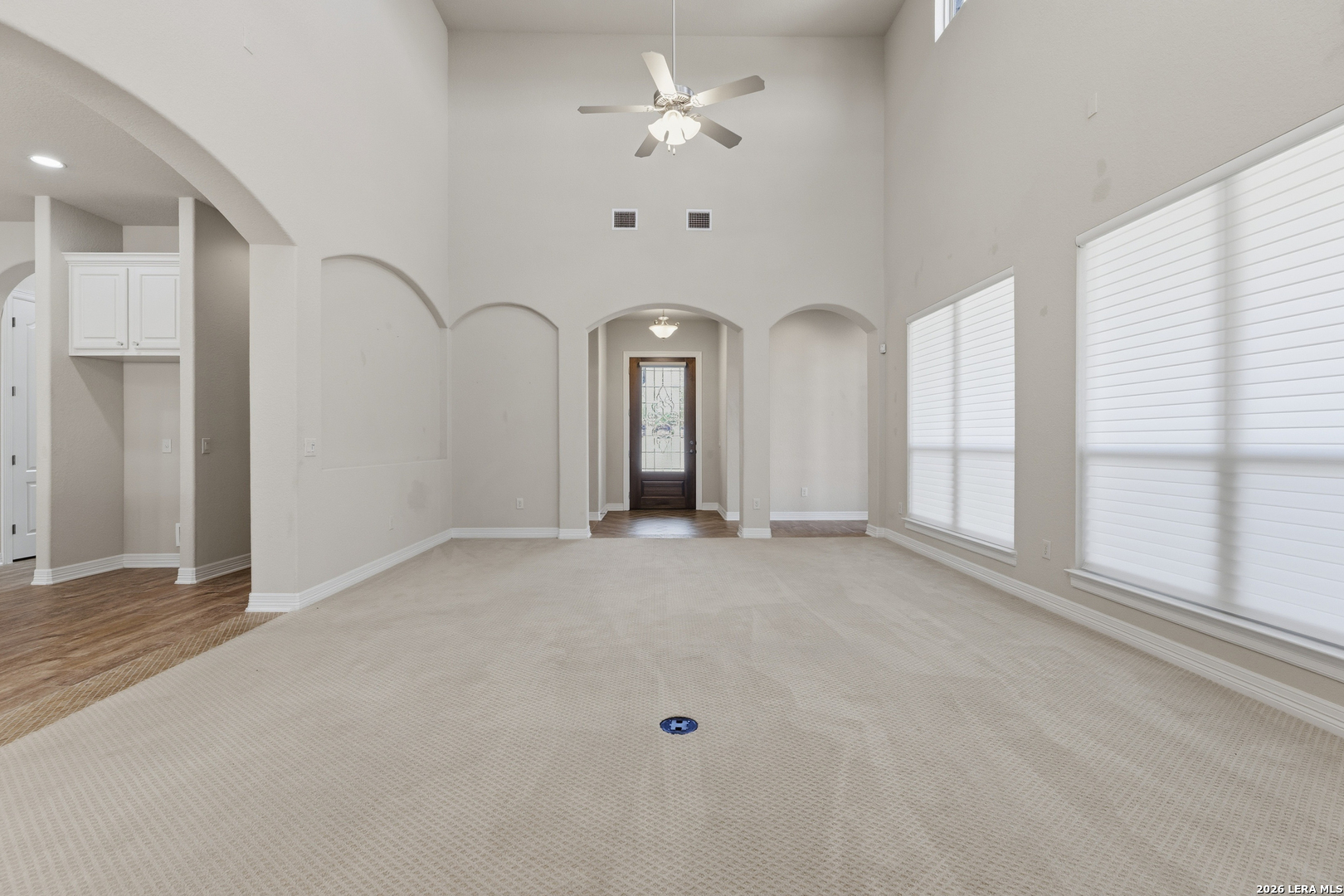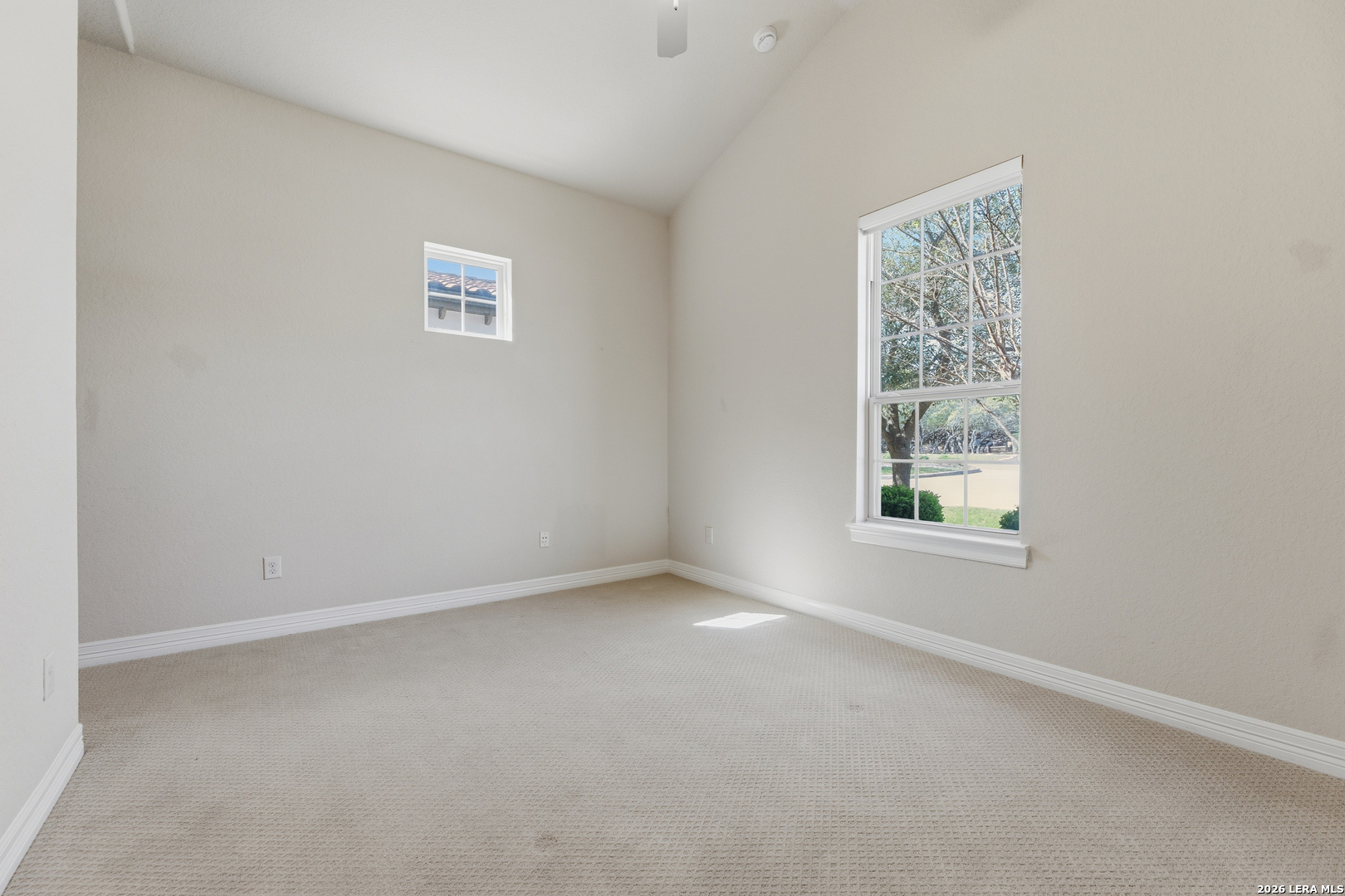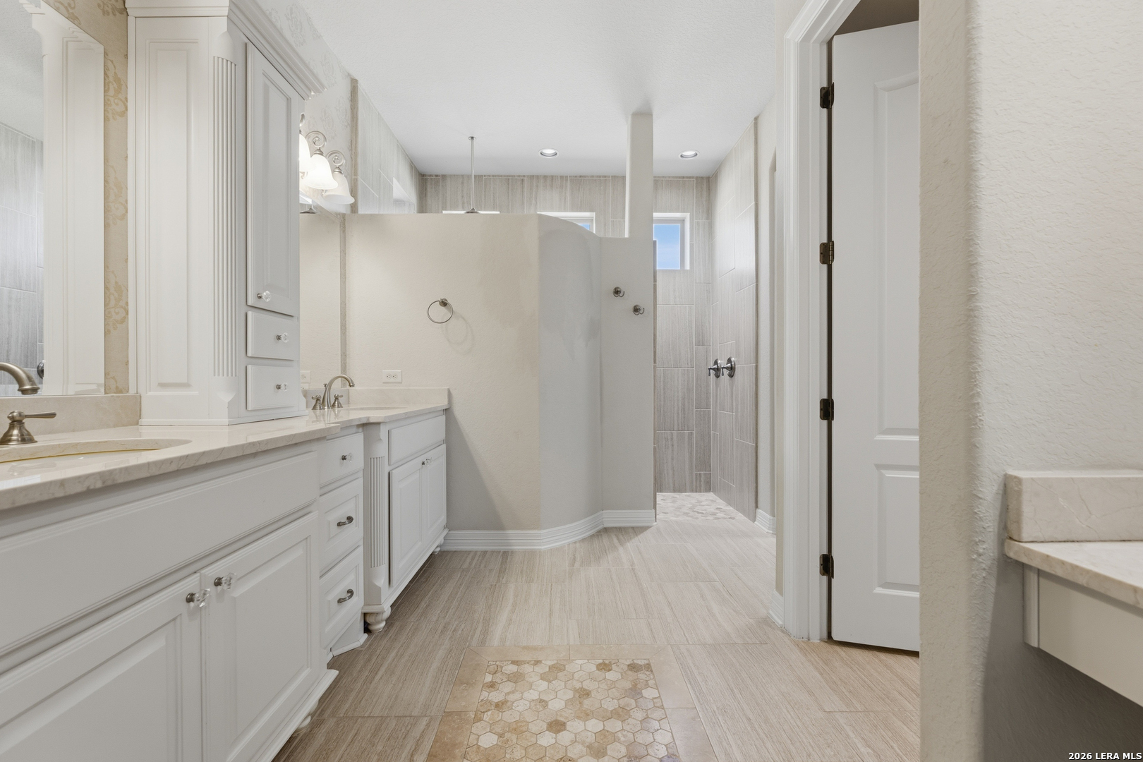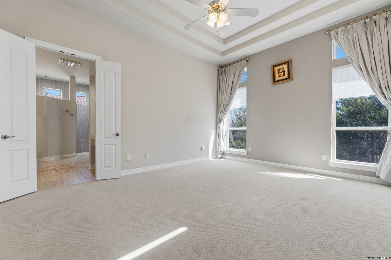 Experience elevated living in this stunning single-story home, with soaring ceilings and dramatic picture windows. Exceptional curb appeal is highlighted by lush, mature landscaping and manicured greenery. An expansive open-concept design offers seamless flow for refined entertaining and elevated everyday living. The grand living room features a statement fireplace, impressive ceiling heights, and abundant natural light. The gourmet kitchen is beautifully appointed with custom white cabinetry, a large island with bar seating, granite countertops, mosaic tile backsplash, and premium stainless steel appliances, including a gas cooktop. An adjoining dining area with a built-in bar adds both elegance and convenience. The private primary suite serves as a luxurious retreat, complete with tiered tray ceilings, floor-to-ceiling windows, and a spa-inspired en suite bath featuring dual vanities, a walk-in shower with rainfall feature, and a dedicated vanity space. A well-appointed secondary bedroom and a versatile office or optional third bedroom offer flexible accommodations. Outdoors, a spacious deck overlooks a beautifully landscaped backyard, offering a peaceful setting perfect for relaxing or entertaining. The space features both a covered patio and an additional patio with a retractable cover for flexible shade and comfort. Ideally located with convenient access to Hwy 281, premier schools, dining, and shopping, this home offers an exceptional blend of comfort, style, and sophistication.
