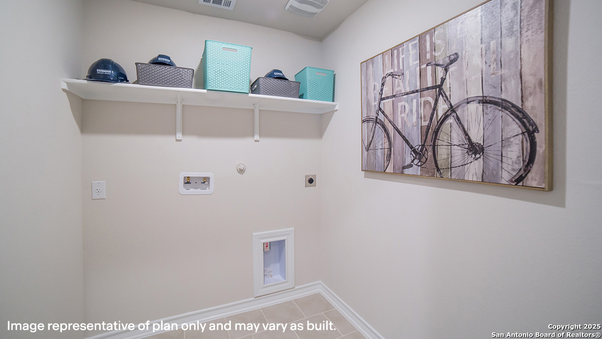 The Bryant is a stunning single-story home featured at Langdon in San Antonio, TX. The Bryant is sure to impress with its selection of 3 front exteriors, 4 bedrooms, 2 bathrooms and 2-car garage. Welcome guests as they walk through the elongated foyer with a decorative nook wall feature to the spacious eat-in kitchen. Facing the blended dining area and living room, the kitchen includes an oversized island, corner pantry with shelving, plenty of cabinet storage, quartz countertops, stylish subway tile backsplash, stainless steel appliances, and a gas cooking range. The private main bedroom is located at the back of the house and features a relaxing ensuite bathroom complete with double vanities, a garden tub, walk-in shower, and a spacious walk-in closet. If privacy is your top priority, this bathroom comes standard with a separate water closet. Two secondary bedrooms are located off the entry and the other is centrally located off the kitchen. All have quality carpet, spacious closets and windows for plenty of natural lighting. Whether these rooms become bedrooms or other bonus spaces, there is sure to be comfort and functionality. Additional features include tall 9-foot ceilings, 2-inch faux wood blinds throughout the home, luxury vinyl plank flooring in the entry, family room, kitchen, and dining area, ceramic tile in the bathrooms and utility room, and pre-plumb for water softener loop. Relax outside on a covered patio (per plan) located off the family room and enjoy full yard landscaping and full yard irrigation. You'll enjoy added security in your new home with our Home is Connected features. Using one central hub that talks to all the devices in your home, you can control the lights, thermostat and locks, all from your cellular device.