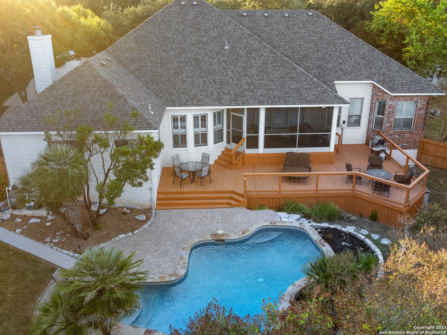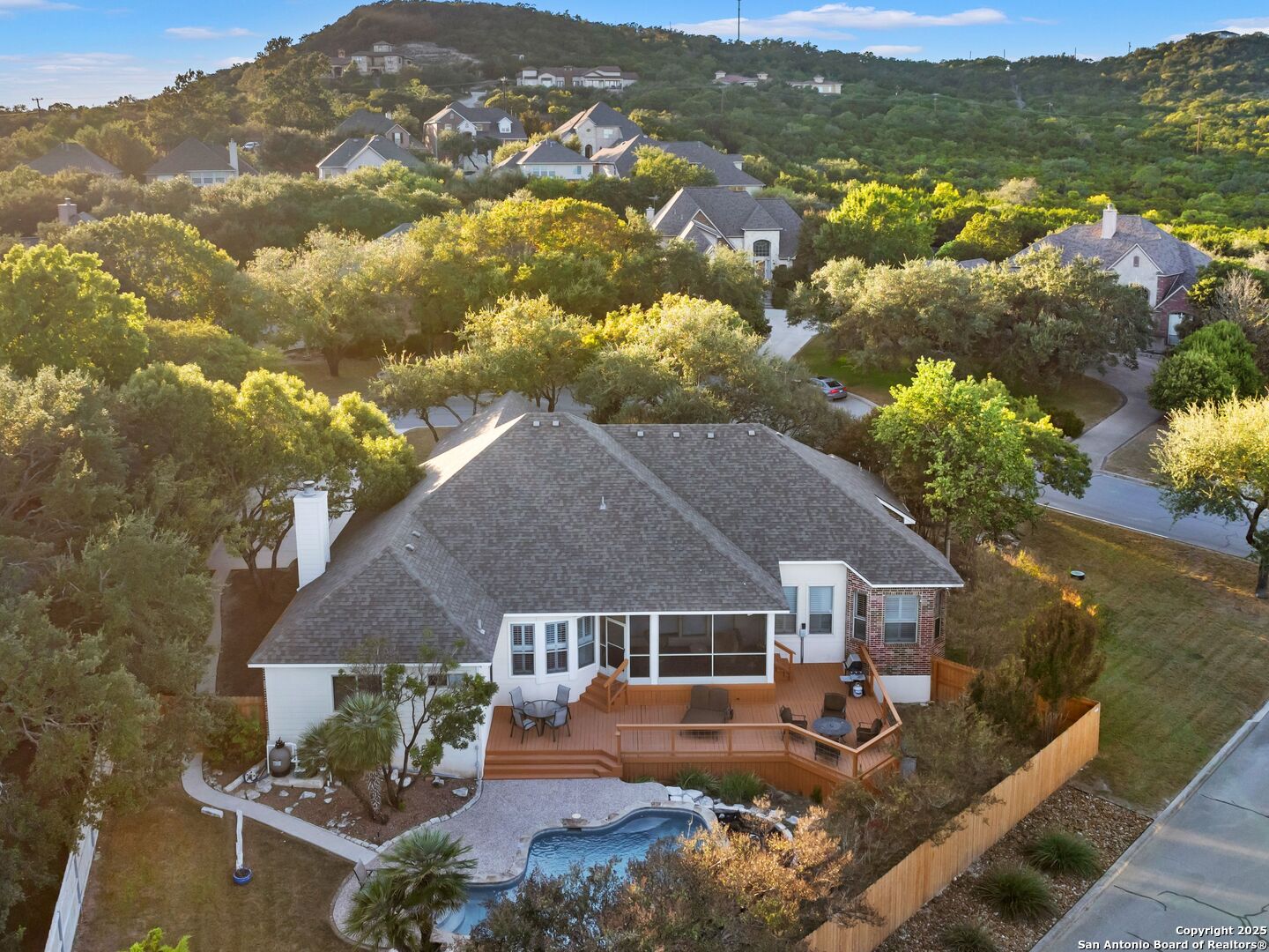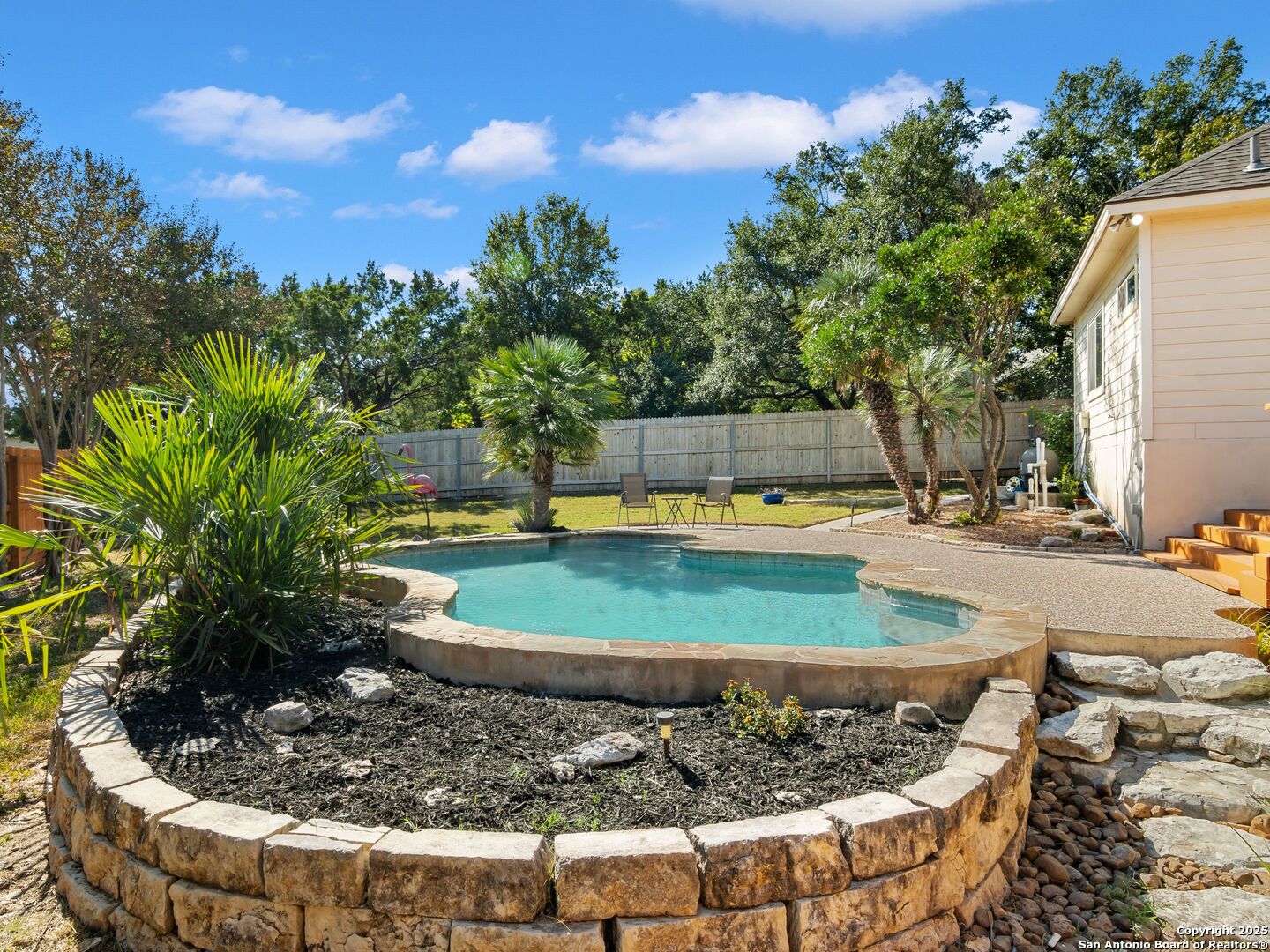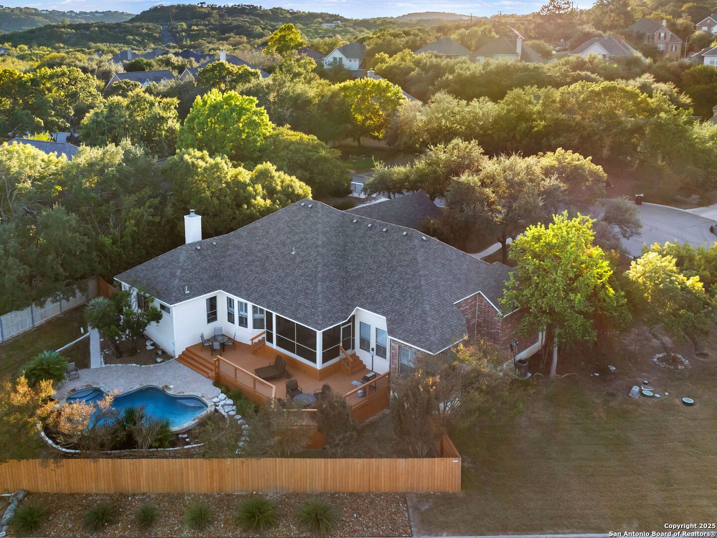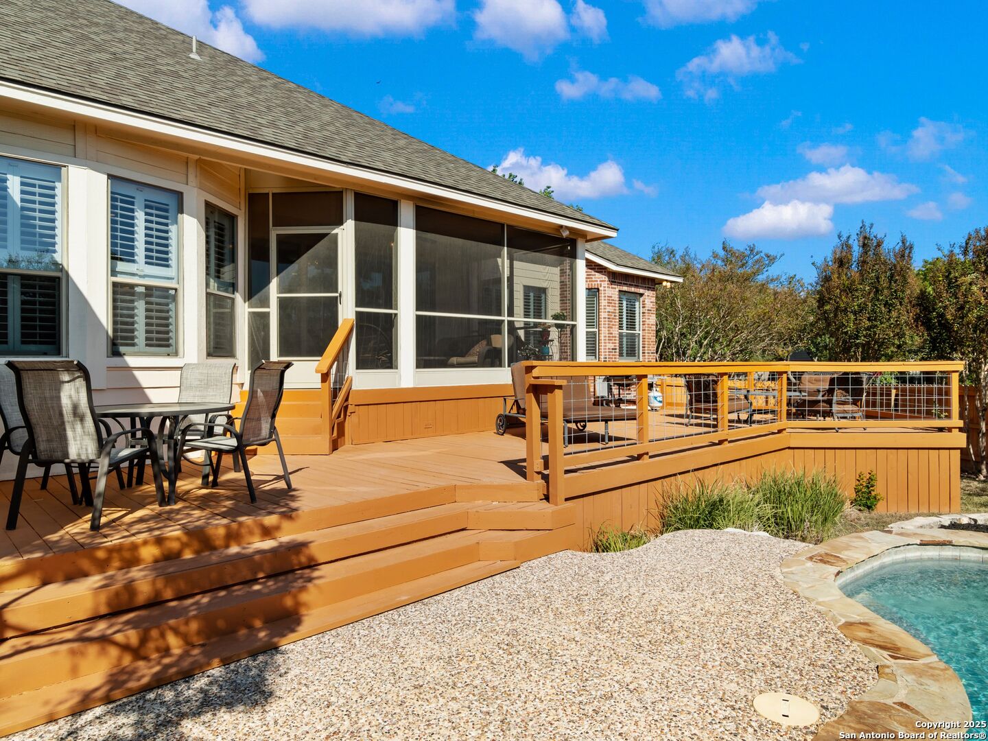 Great style with timeless personality in Steeple Brook. Experience the allure of this stunning one-story home on a serene .52-acre wooded lot within a gated community. This 4-bedroom, 3-bathroom residence combines classic elegance with modern amenities. Enjoy the cozy family room and spacious living room plus a private study/office. The huge living room adds additional living space for entertainment and at the heart of this home is a beautiful kitchen which flows seamlessly into the warm and inviting family room with fireplace. This culinary arena provides natural stone counters, custom backsplash, and an expansive breakfast bar. A formal dining room completes the package. A luxe owner's suite offers a tray ceiling and additional sitting area overlooking the pool. The primary bath includes dual walk-in closets, a spa tub and oversized walk-in shower. Three nicely sized secondary bedrooms and two full baths add to this one-story allure. The home boasts a three-car garage and fantastic backyard that features an enclosed patio space 10X10 plus a sprawling level deck and refreshing sparkling pool. The expansive backyard presents endless opportunities for outdoor living. Ideally situated between Boerne and San Antonio, with easy access to IH10 and local amenities.