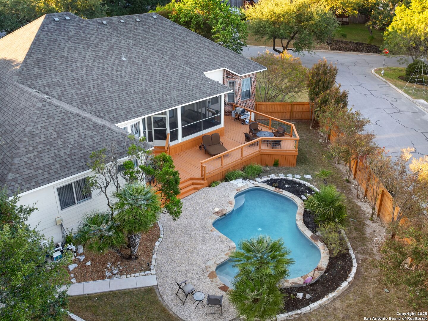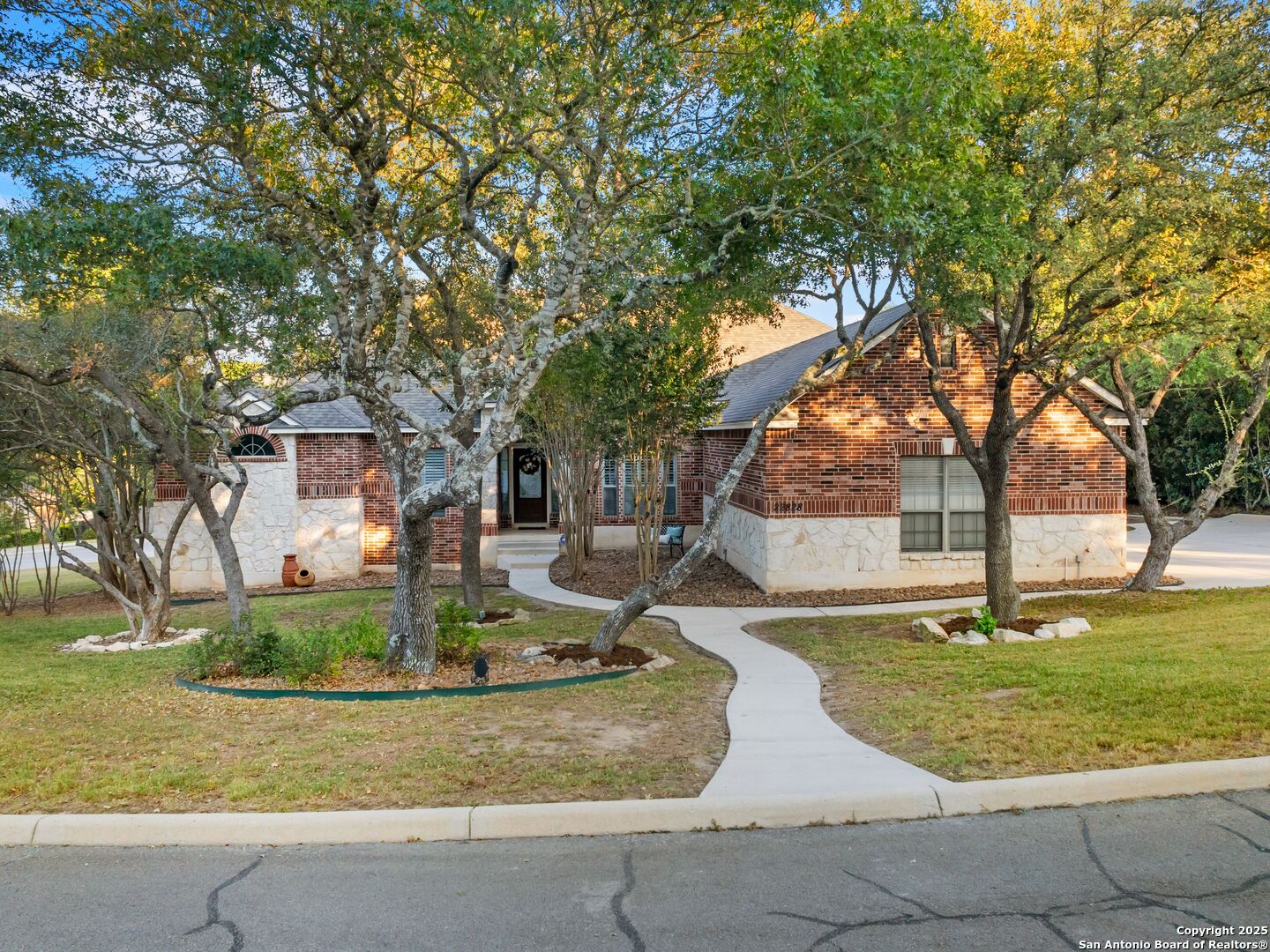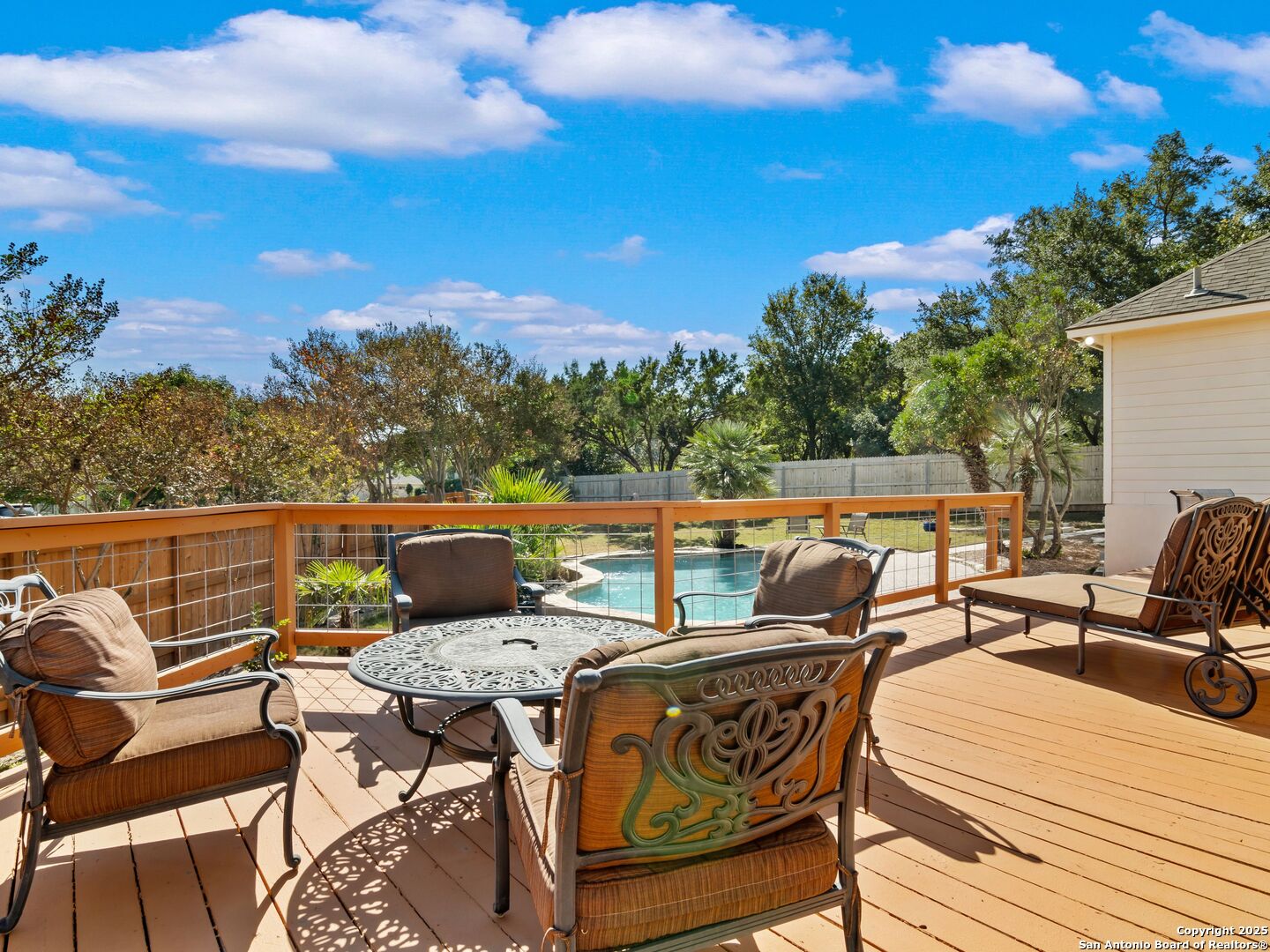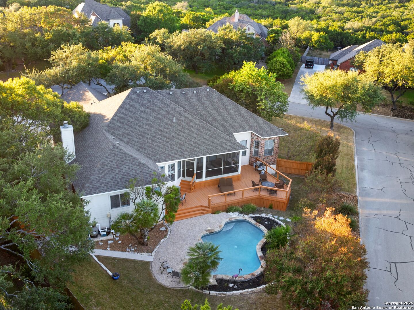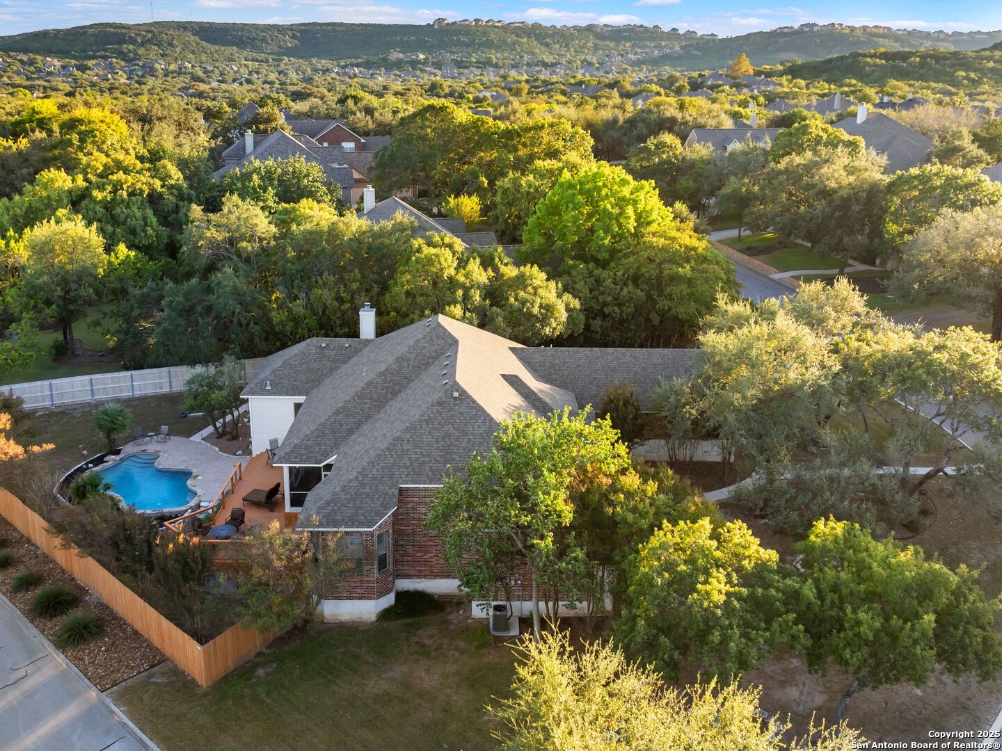 Great style with timeless personality in Steeple Brook. Experience the allure of this stunning one-story home on a serene .52-acre wooded lot within a gated community. This 4-bedroom, 3-bathroom residence combines classic elegance with modern amenities. Enjoy the cozy family room and spacious living room plus a private study/office. The huge living room adds additional living space for entertainment and at the heart of this home is a beautiful kitchen which flows seamlessly into the warm and inviting family room with fireplace. This culinary arena provides natural stone counters, custom backsplash, and an expansive breakfast bar. A formal dining room completes the package. A luxe owner's suite offers a tray ceiling and additional sitting area overlooking the pool. The primary bath includes dual walk-in closets, a spa tub and oversized walk-in shower. Three nicely sized secondary bedrooms and two full baths add to this one-story allure. The home boasts a three-car garage and fantastic backyard that features an enclosed patio space 10X10 plus a sprawling level deck and refreshing sparkling pool. The expansive backyard presents endless opportunities for outdoor living. Ideally situated between Boerne and San Antonio, with easy access to IH10 and local amenities.