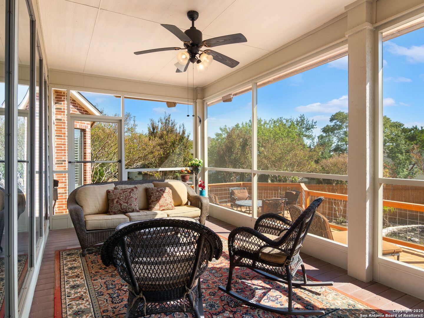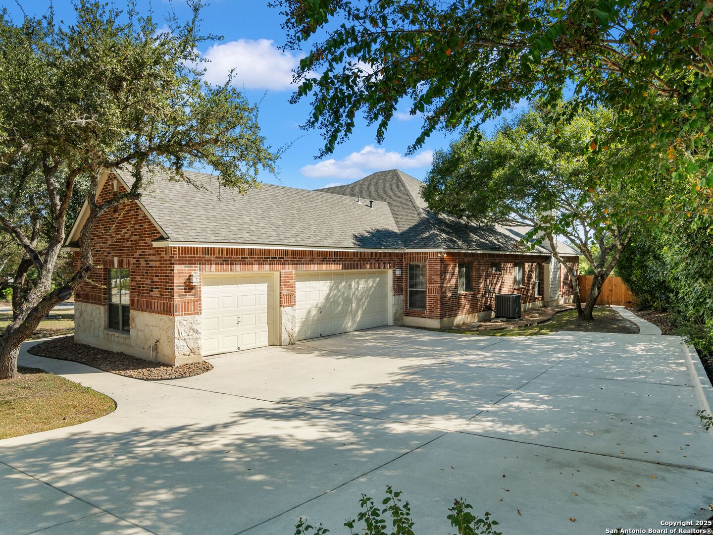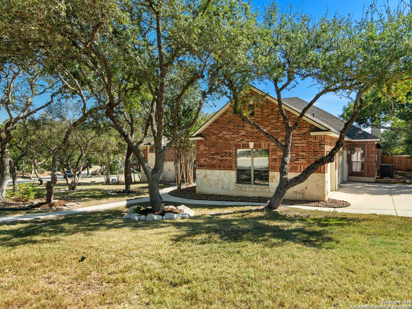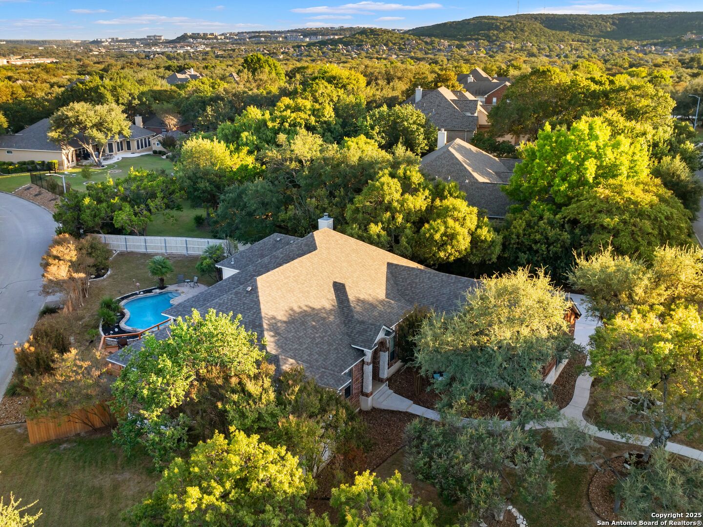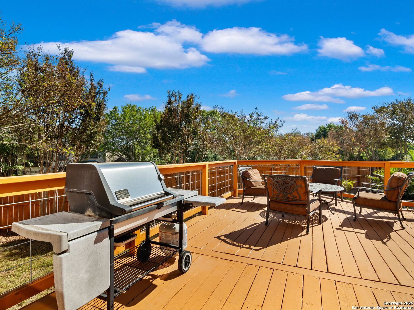 Great style with timeless personality in Steeple Brook. Experience the allure of this stunning one-story home on a serene .52-acre wooded lot within a gated community. This 4-bedroom, 3-bathroom residence combines classic elegance with modern amenities. Enjoy the cozy family room and spacious living room plus a private study/office. The huge living room adds additional living space for entertainment and at the heart of this home is a beautiful kitchen which flows seamlessly into the warm and inviting family room with fireplace. This culinary arena provides natural stone counters, custom backsplash, and an expansive breakfast bar. A formal dining room completes the package. A luxe owner's suite offers a tray ceiling and additional sitting area overlooking the pool. The primary bath includes dual walk-in closets, a spa tub and oversized walk-in shower. Three nicely sized secondary bedrooms and two full baths add to this one-story allure. The home boasts a three-car garage and fantastic backyard that features an enclosed patio space 10X10 plus a sprawling level deck and refreshing sparkling pool. The expansive backyard presents endless opportunities for outdoor living. Ideally situated between Boerne and San Antonio, with easy access to IH10 and local amenities.