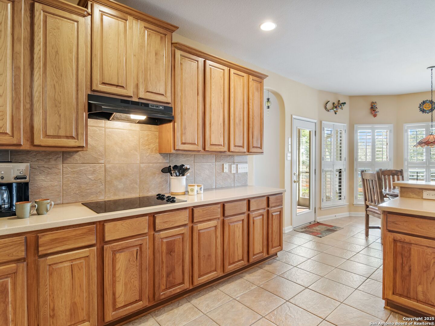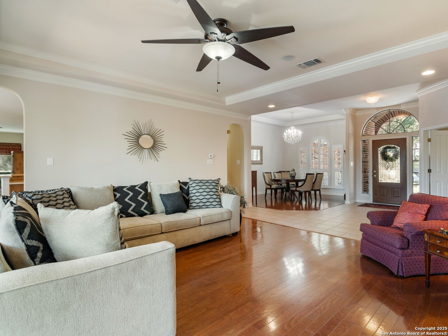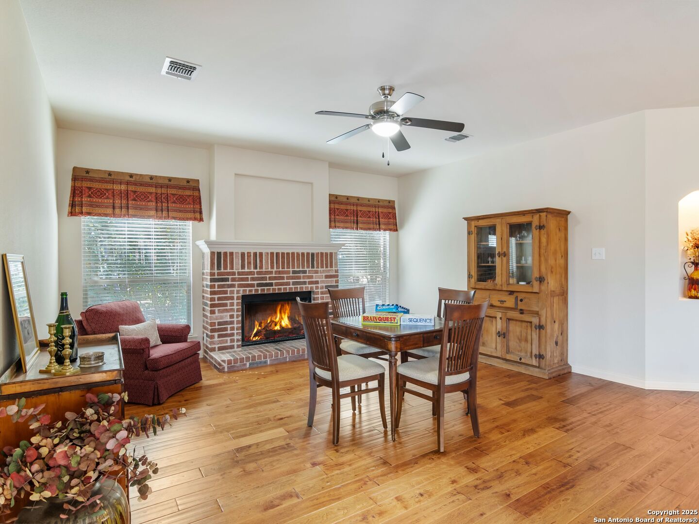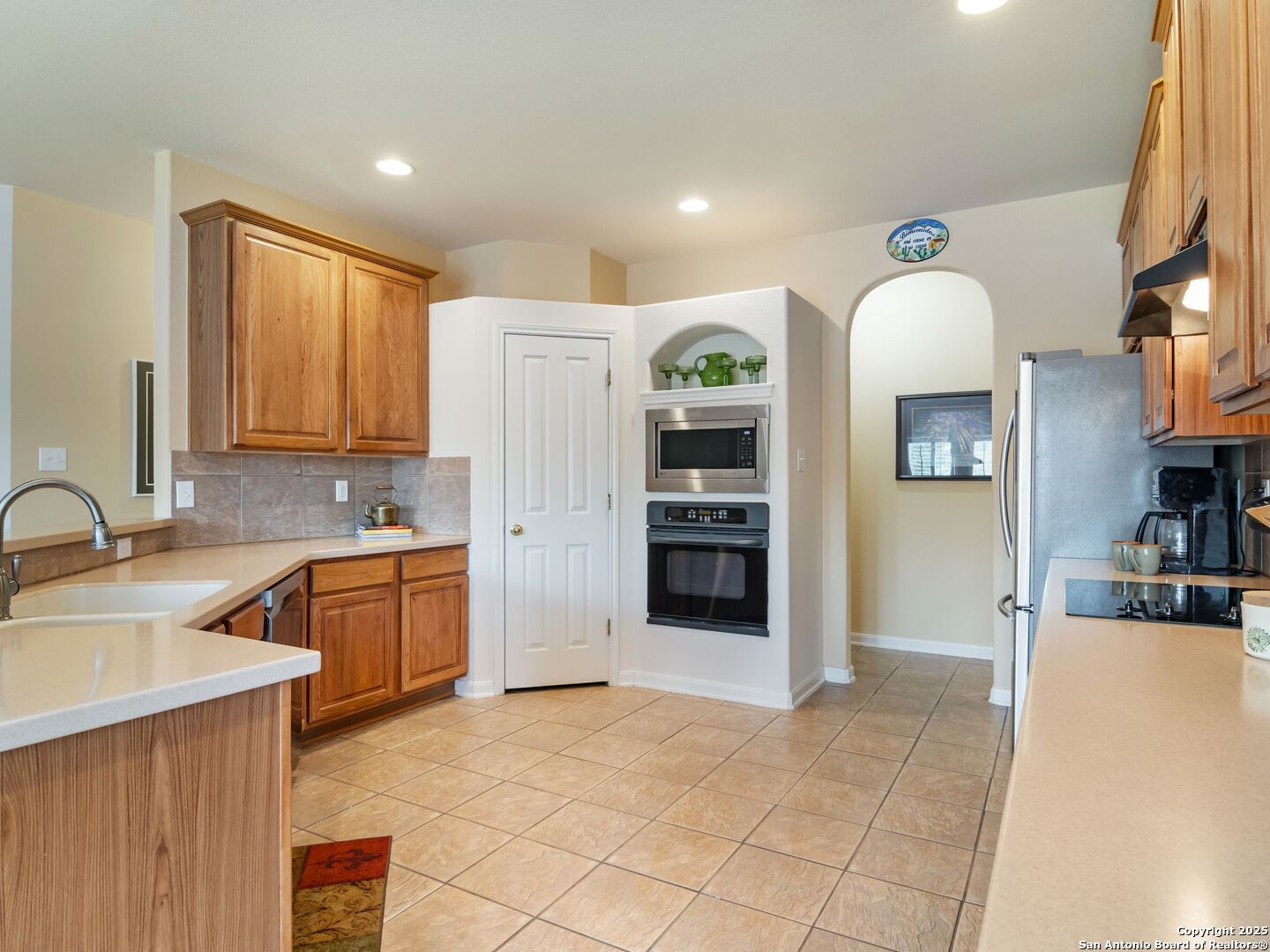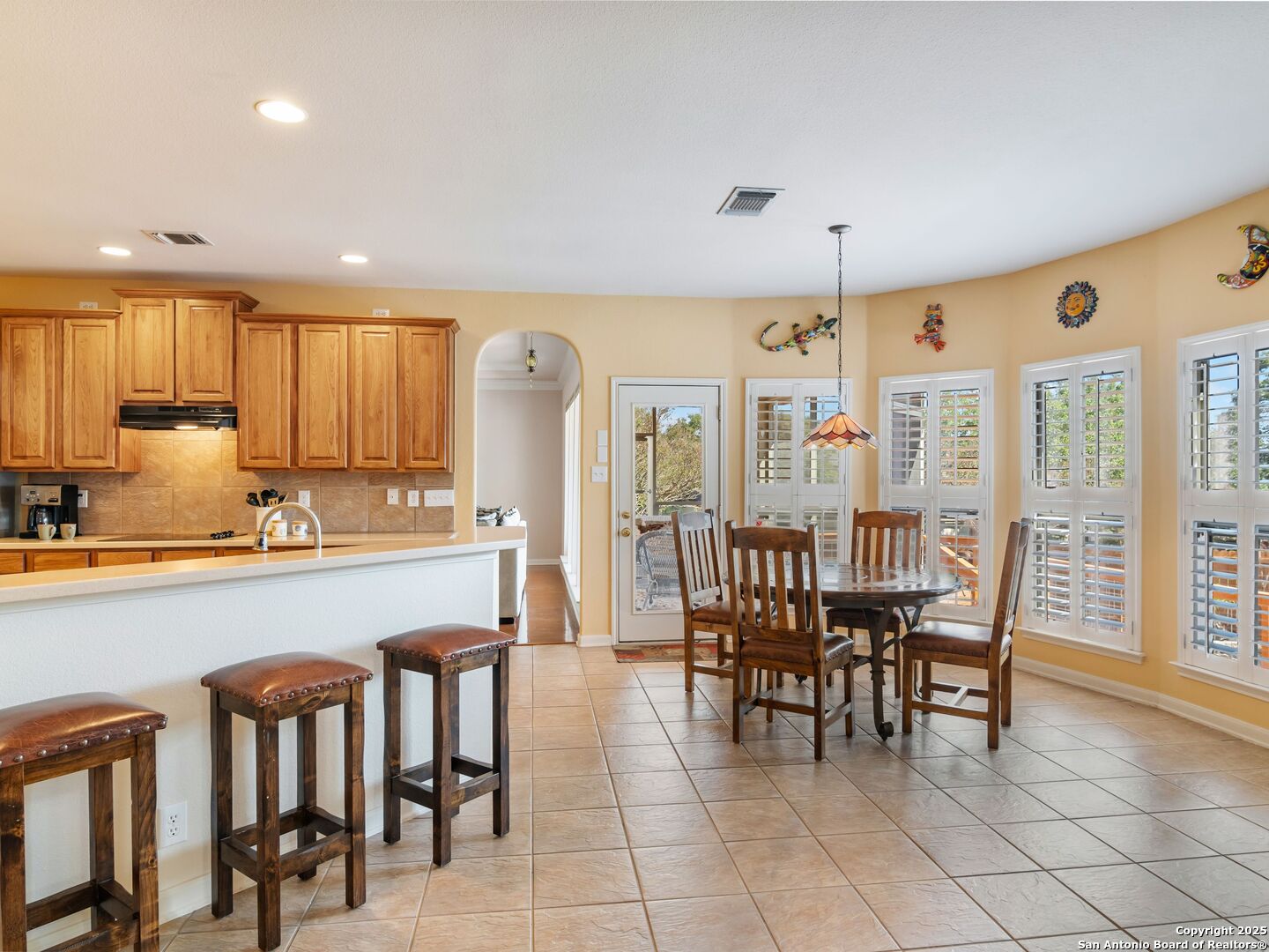 Great style with timeless personality in Steeple Brook. Experience the allure of this stunning one-story home on a serene .52-acre wooded lot within a gated community. This 4-bedroom, 3-bathroom residence combines classic elegance with modern amenities. Enjoy the cozy family room and spacious living room plus a private study/office. The huge living room adds additional living space for entertainment and at the heart of this home is a beautiful kitchen which flows seamlessly into the warm and inviting family room with fireplace. This culinary arena provides natural stone counters, custom backsplash, and an expansive breakfast bar. A formal dining room completes the package. A luxe owner's suite offers a tray ceiling and additional sitting area overlooking the pool. The primary bath includes dual walk-in closets, a spa tub and oversized walk-in shower. Three nicely sized secondary bedrooms and two full baths add to this one-story allure. The home boasts a three-car garage and fantastic backyard that features an enclosed patio space 10X10 plus a sprawling level deck and refreshing sparkling pool. The expansive backyard presents endless opportunities for outdoor living. Ideally situated between Boerne and San Antonio, with easy access to IH10 and local amenities.