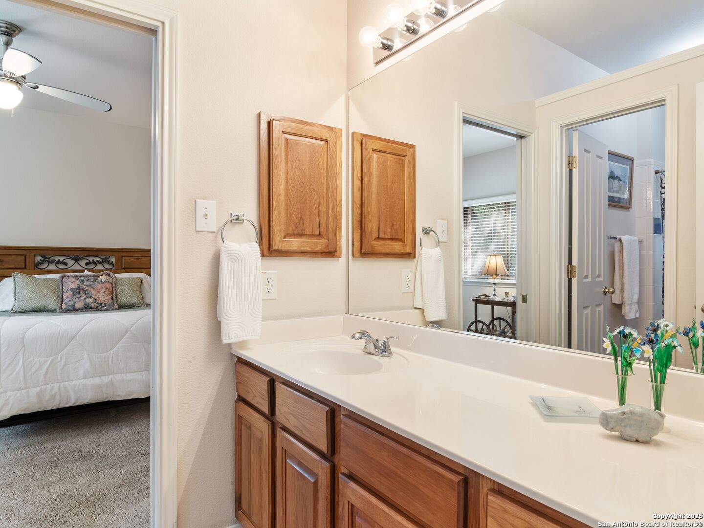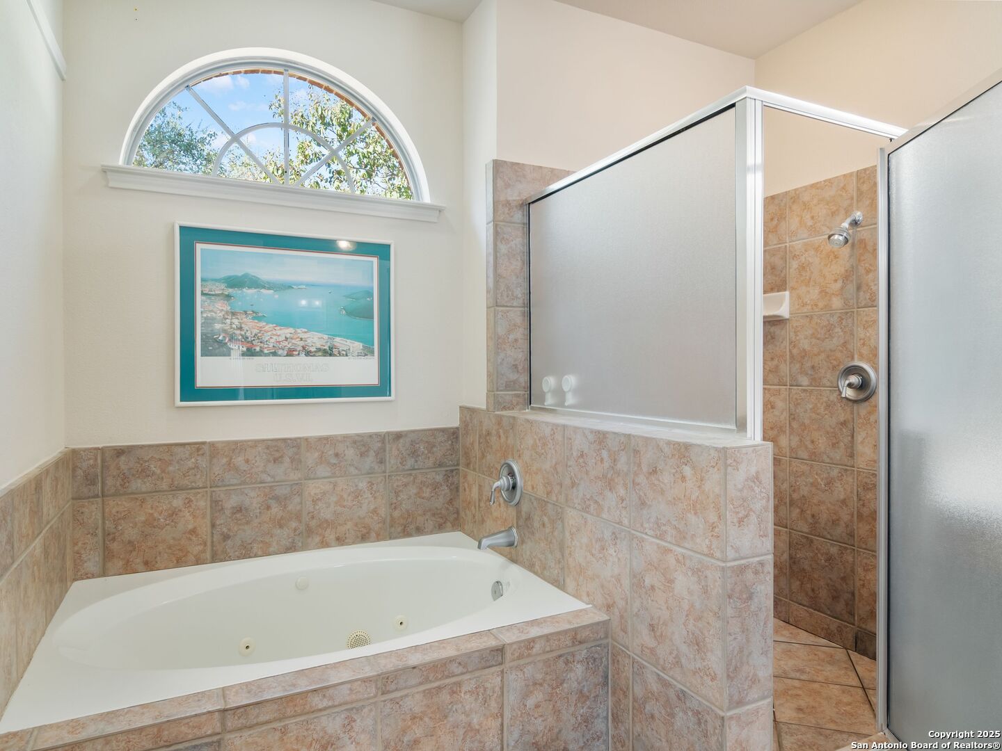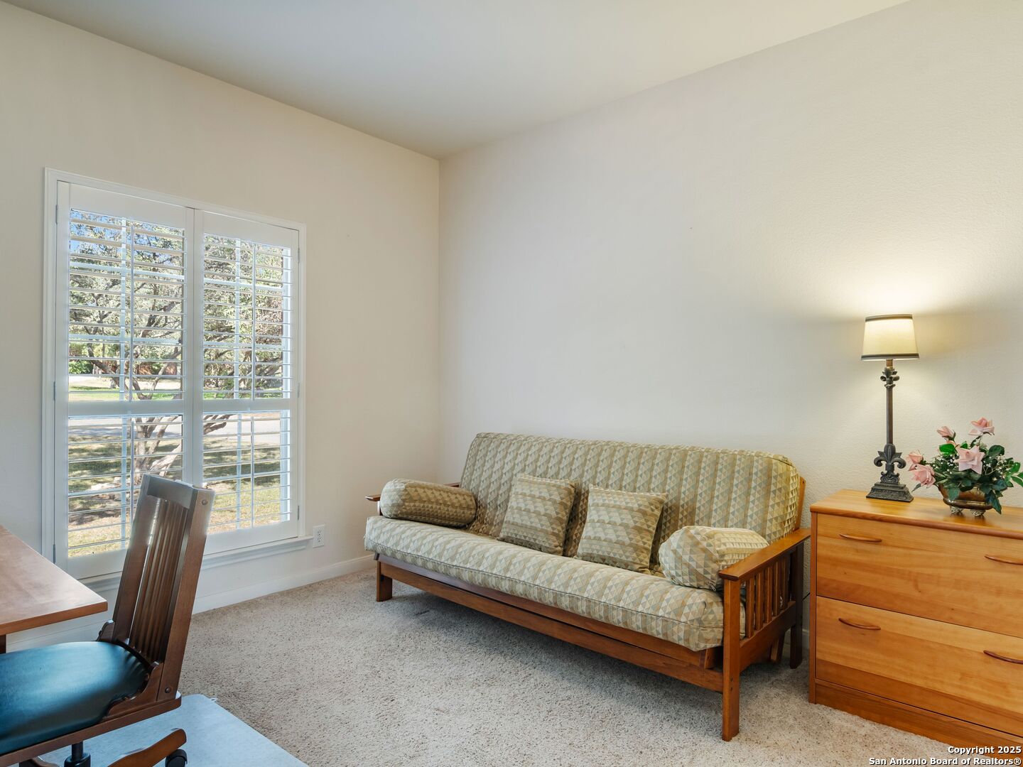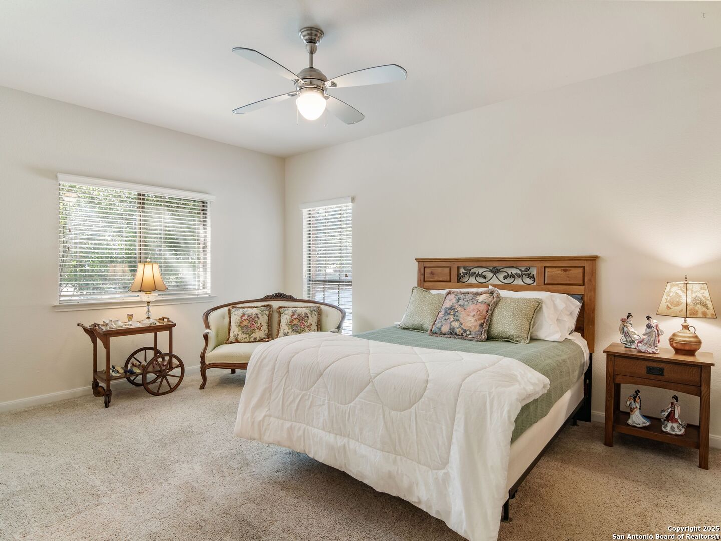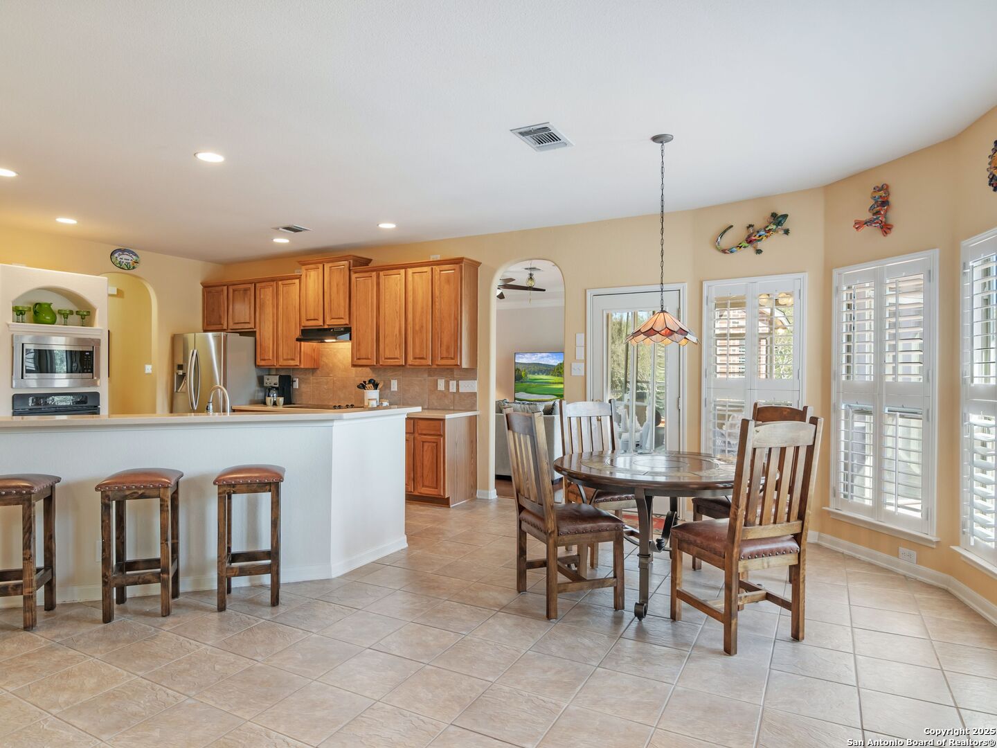 Great style with timeless personality in Steeple Brook. Experience the allure of this stunning one-story home on a serene .52-acre wooded lot within a gated community. This 4-bedroom, 3-bathroom residence combines classic elegance with modern amenities. Enjoy the cozy family room and spacious living room plus a private study/office. The huge living room adds additional living space for entertainment and at the heart of this home is a beautiful kitchen which flows seamlessly into the warm and inviting family room with fireplace. This culinary arena provides natural stone counters, custom backsplash, and an expansive breakfast bar. A formal dining room completes the package. A luxe owner's suite offers a tray ceiling and additional sitting area overlooking the pool. The primary bath includes dual walk-in closets, a spa tub and oversized walk-in shower. Three nicely sized secondary bedrooms and two full baths add to this one-story allure. The home boasts a three-car garage and fantastic backyard that features an enclosed patio space 10X10 plus a sprawling level deck and refreshing sparkling pool. The expansive backyard presents endless opportunities for outdoor living. Ideally situated between Boerne and San Antonio, with easy access to IH10 and local amenities.