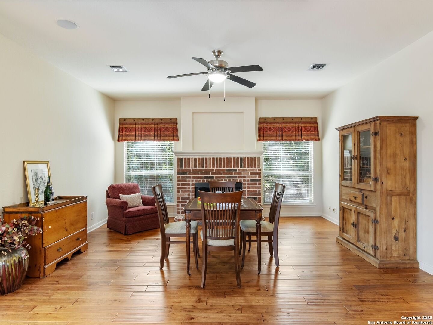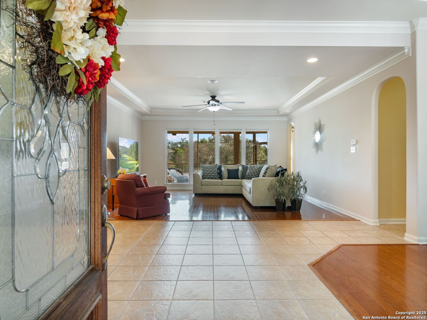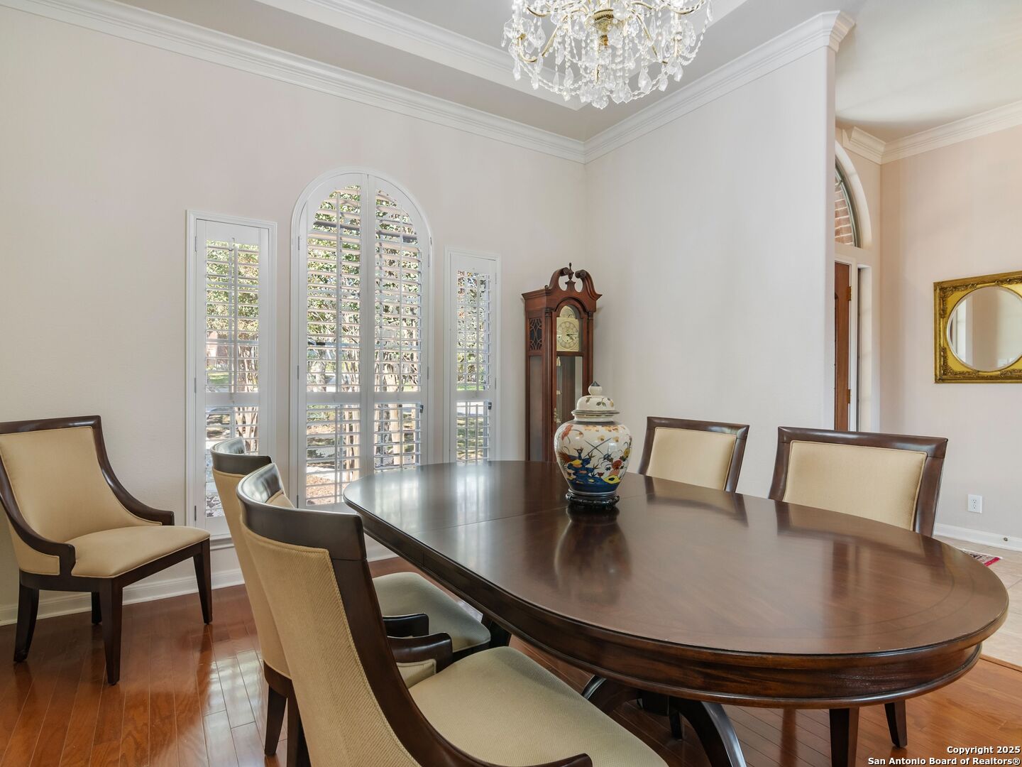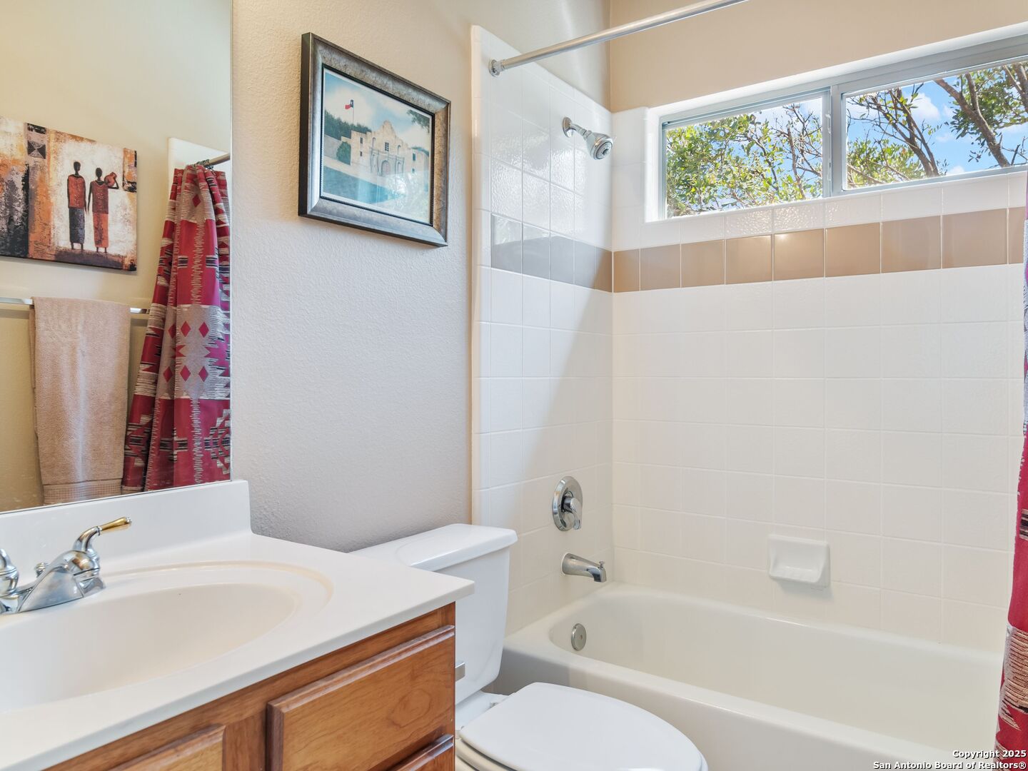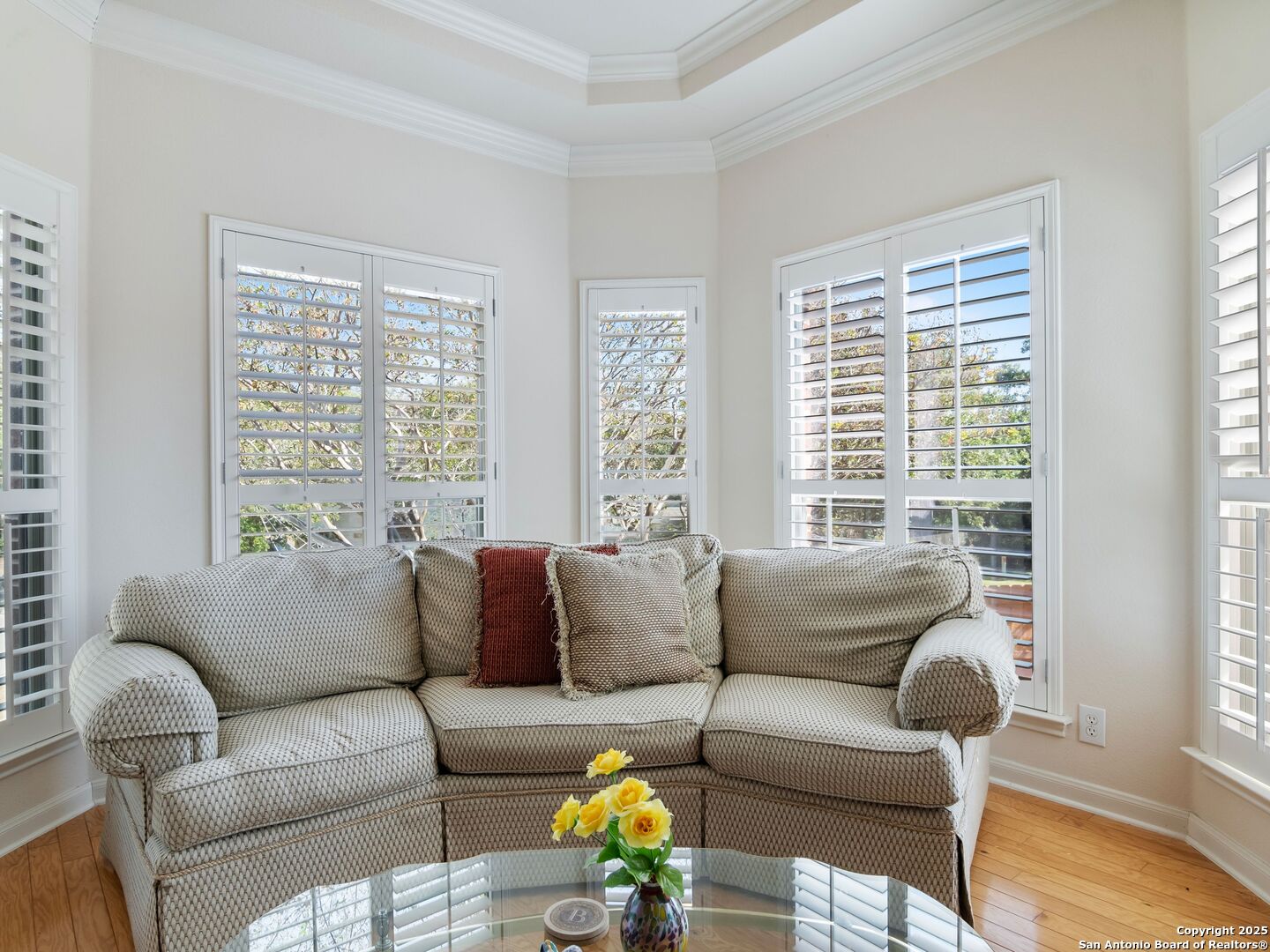 Great style with timeless personality in Steeple Brook. Experience the allure of this stunning one-story home on a serene .52-acre wooded lot within a gated community. This 4-bedroom, 3-bathroom residence combines classic elegance with modern amenities. Enjoy the cozy family room and spacious living room plus a private study/office. The huge living room adds additional living space for entertainment and at the heart of this home is a beautiful kitchen which flows seamlessly into the warm and inviting family room with fireplace. This culinary arena provides natural stone counters, custom backsplash, and an expansive breakfast bar. A formal dining room completes the package. A luxe owner's suite offers a tray ceiling and additional sitting area overlooking the pool. The primary bath includes dual walk-in closets, a spa tub and oversized walk-in shower. Three nicely sized secondary bedrooms and two full baths add to this one-story allure. The home boasts a three-car garage and fantastic backyard that features an enclosed patio space 10X10 plus a sprawling level deck and refreshing sparkling pool. The expansive backyard presents endless opportunities for outdoor living. Ideally situated between Boerne and San Antonio, with easy access to IH10 and local amenities.