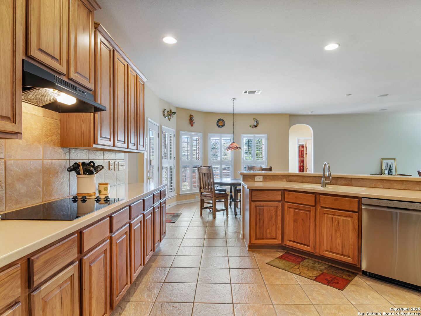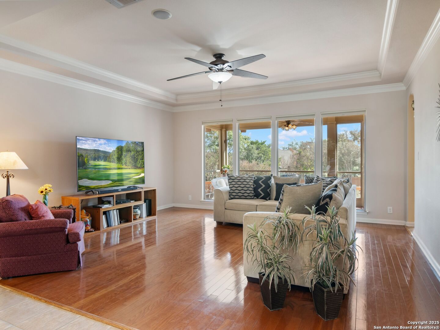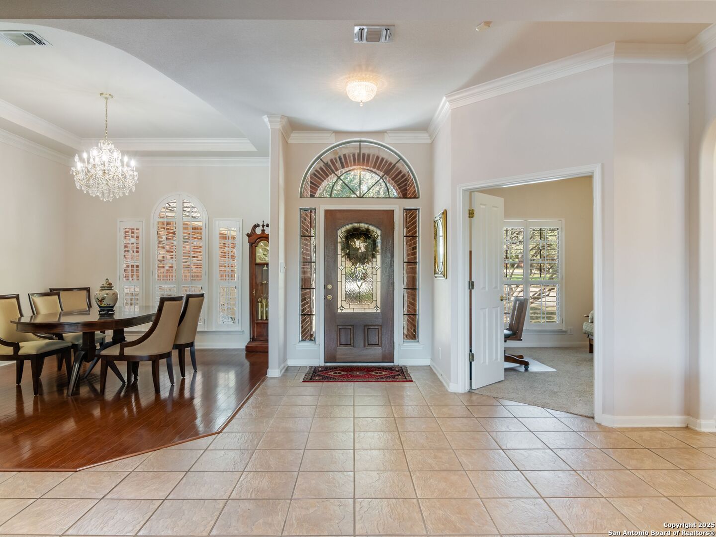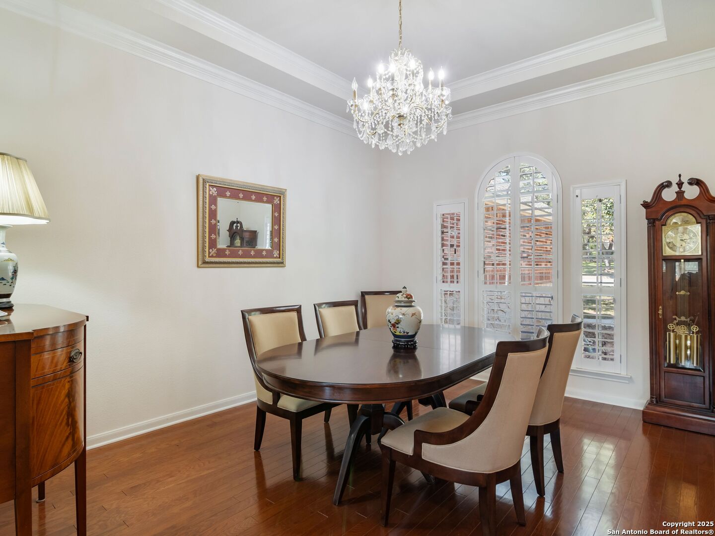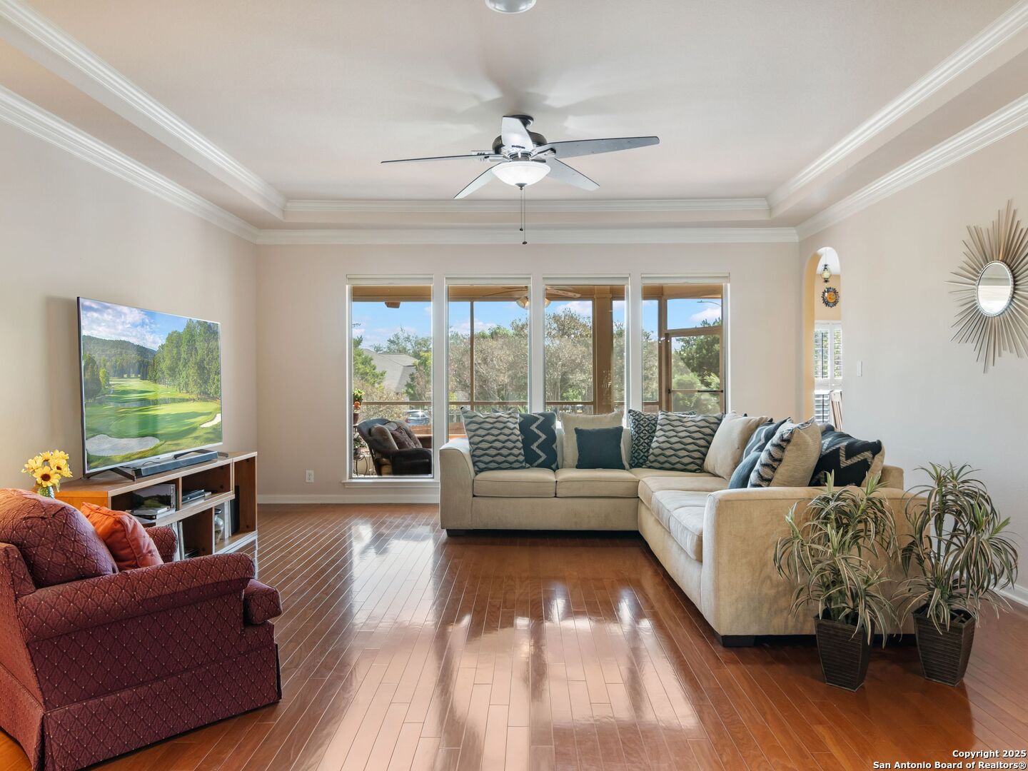 Great style with timeless personality in Steeple Brook. Experience the allure of this stunning one-story home on a serene .52-acre wooded lot within a gated community. This 4-bedroom, 3-bathroom residence combines classic elegance with modern amenities. Enjoy the cozy family room and spacious living room plus a private study/office. The huge living room adds additional living space for entertainment and at the heart of this home is a beautiful kitchen which flows seamlessly into the warm and inviting family room with fireplace. This culinary arena provides natural stone counters, custom backsplash, and an expansive breakfast bar. A formal dining room completes the package. A luxe owner's suite offers a tray ceiling and additional sitting area overlooking the pool. The primary bath includes dual walk-in closets, a spa tub and oversized walk-in shower. Three nicely sized secondary bedrooms and two full baths add to this one-story allure. The home boasts a three-car garage and fantastic backyard that features an enclosed patio space 10X10 plus a sprawling level deck and refreshing sparkling pool. The expansive backyard presents endless opportunities for outdoor living. Ideally situated between Boerne and San Antonio, with easy access to IH10 and local amenities.