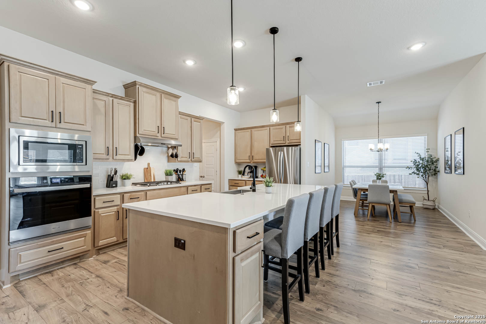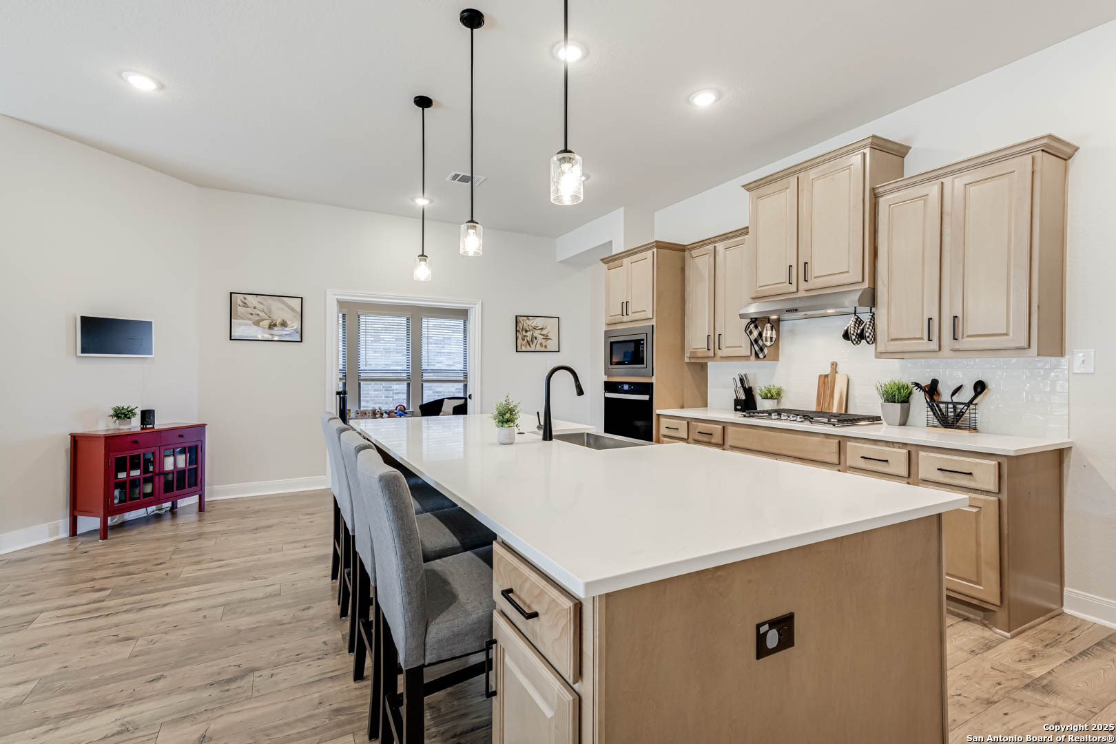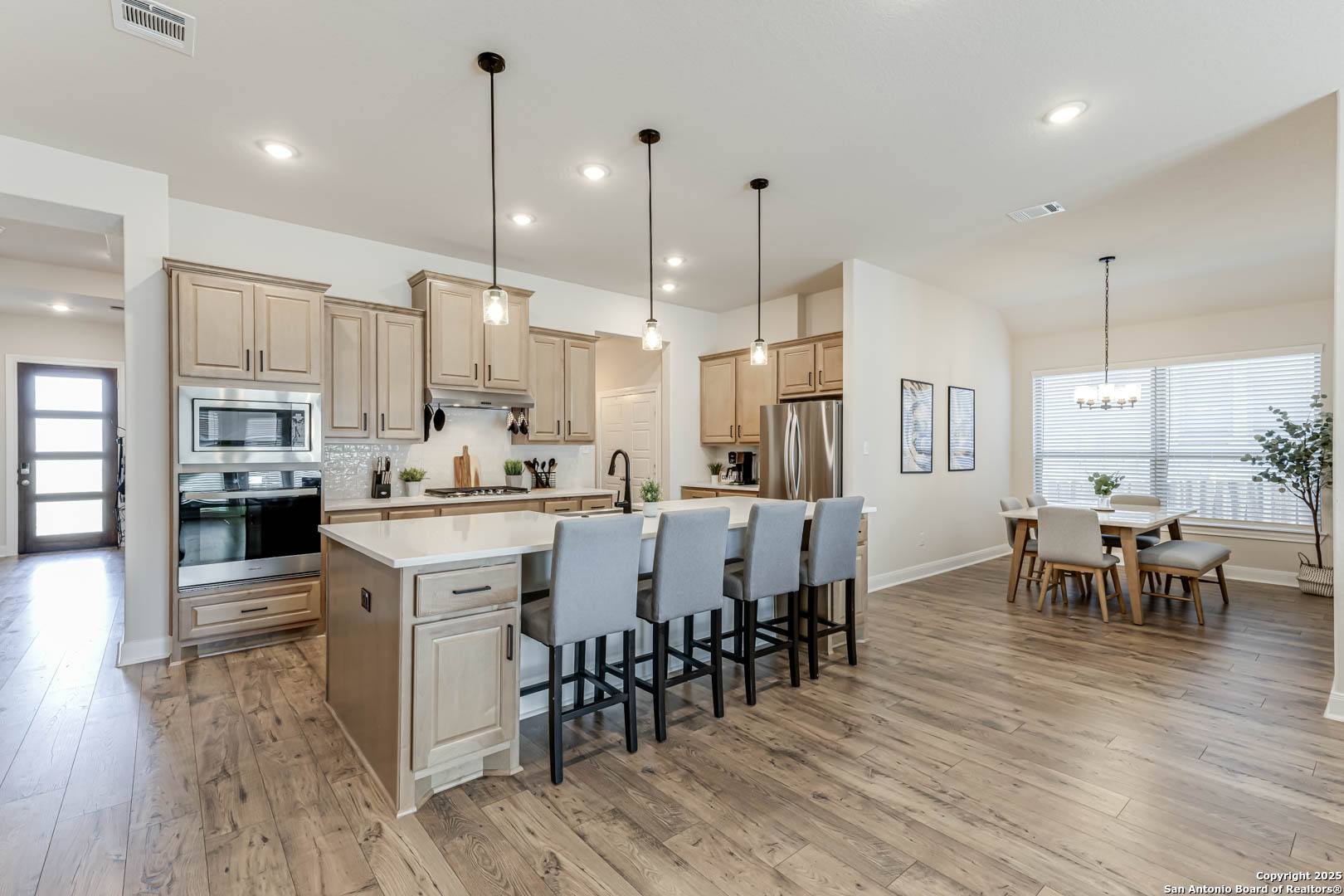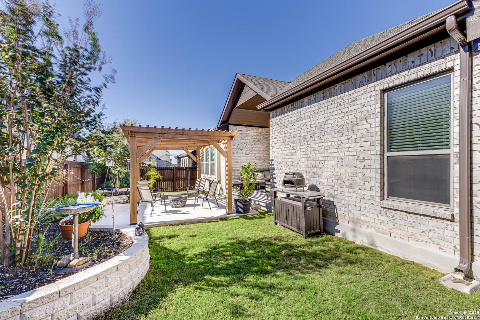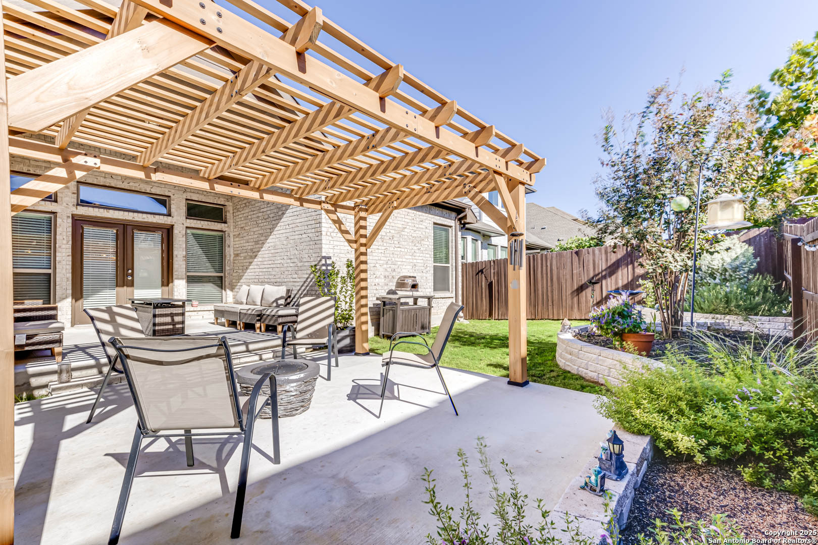 This is the Stone Oak area gem you've been waiting for! A truly one-of-a-kind home in Coronado, this 4-bedroom, 3-bathroom residence was newly built in 2023. Designed with a modern, open-concept layout and thoughtfully chosen finishes, this home stands apart with its blend of contemporary style and warm, modern farmhouse character. The elevated front porch is spacious and perfect for morning coffee or evening sunsets with its peaceful horizon views. Inside, rustic chestnut-toned laminate floors flow through the kitchen and main living area, complementing the wheat-color cabinetry and white quartz countertops. The kitchen also features a stainless steel undermount apron sink and stainless steel appliances. The spacious primary suite offers bay windows perfect for use as a reading nook or decorative space, an extra-large walk-in shower lined with classic subway tile, and a spacious walk-in closet. For those seeking a little extra space, you'll find it here with an additional office and rec room that can be utilized as a second workspace, playroom, home library, or creative studio. Out back, enjoy a Texas-sized outdoor living space with an expansive covered patio and a charming pergola area, perfect for entertaining or cozy family evenings. Additional highlights include a large, three-car garage with abundant storage and zoning within the highly rated NEISD school district. Tucked right off 281, accessed through a tree-lined road that quiets the city noise, and minutes from Sam's, HEB Plus, and Stone Oak Village, the Coronado community offers both serenity and convenience. Come discover this home that combines modern living and peaceful comfort.