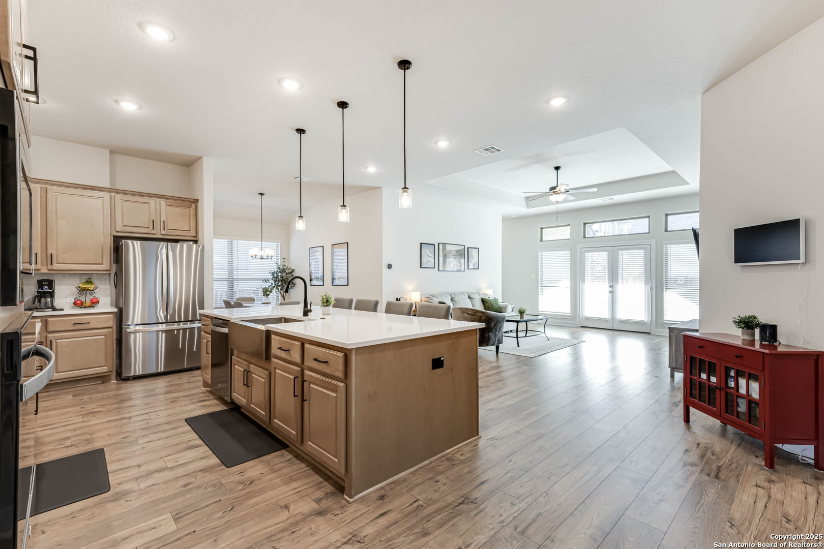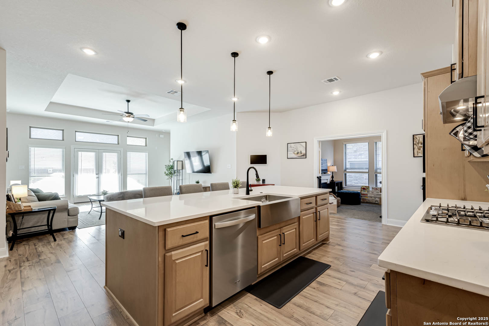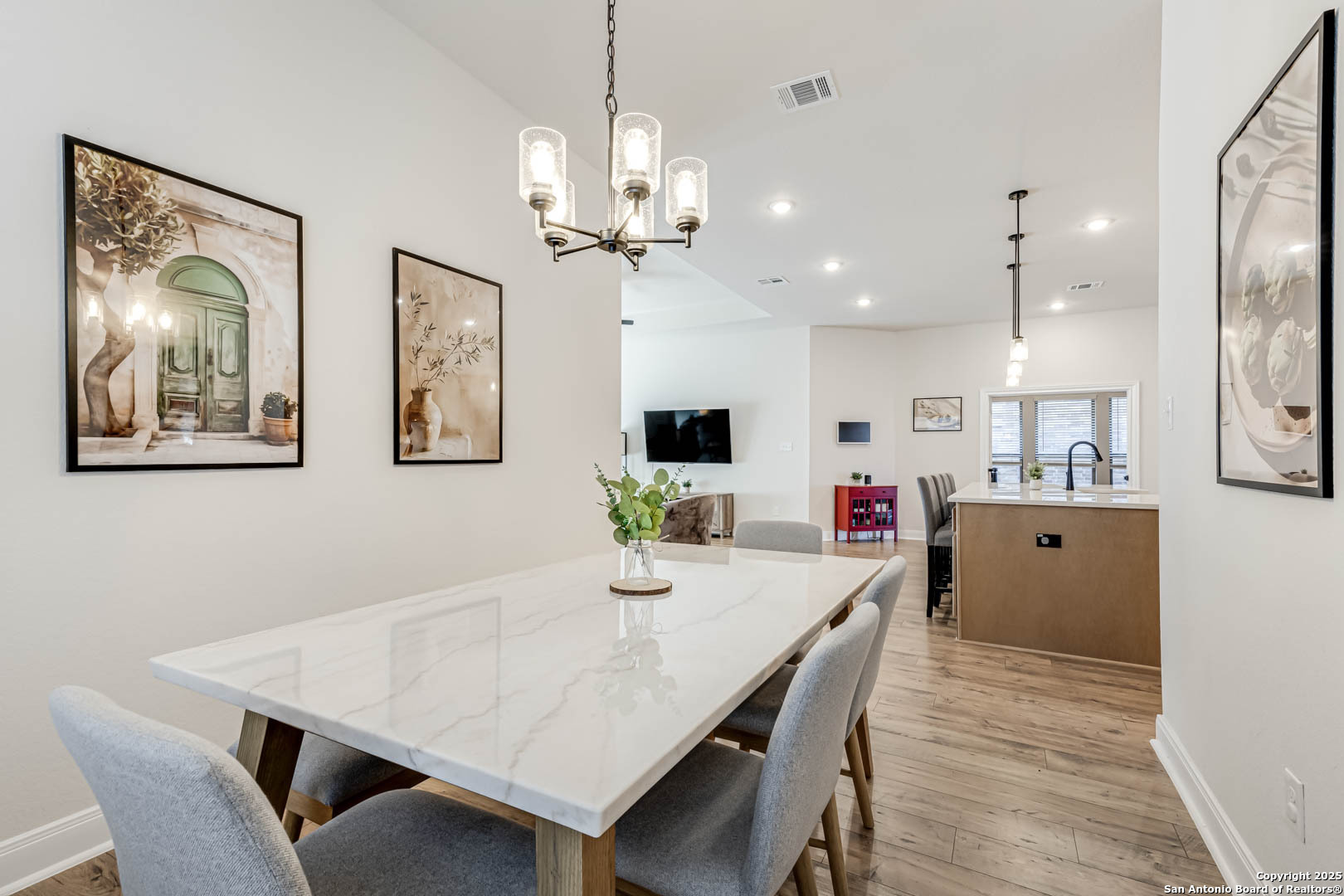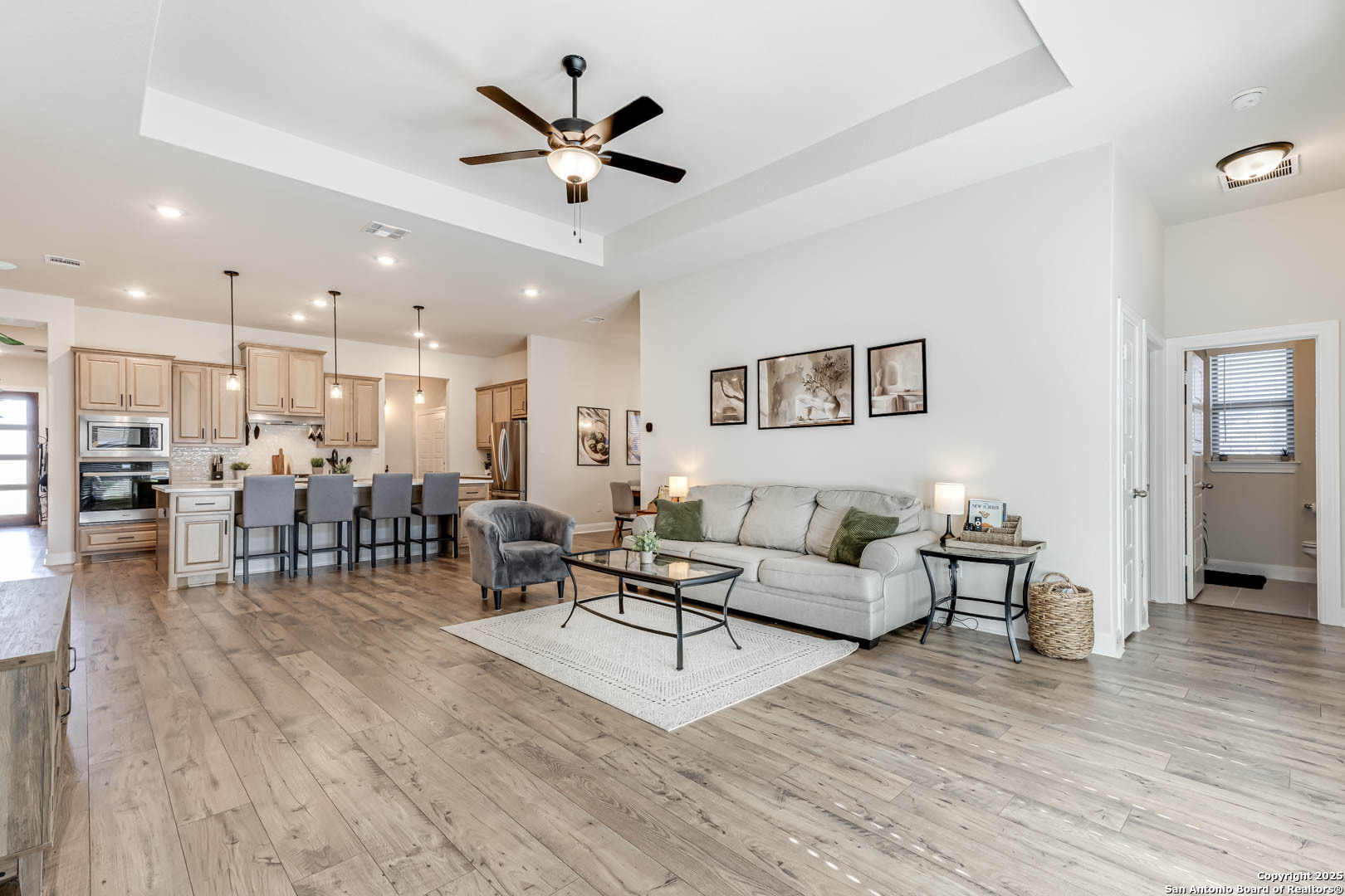 This is the Stone Oak area gem you've been waiting for! A truly one-of-a-kind home in Coronado, this 4-bedroom, 3-bathroom residence was newly built in 2023. Designed with a modern, open-concept layout and thoughtfully chosen finishes, this home stands apart with its blend of contemporary style and warm, modern farmhouse character. The elevated front porch is spacious and perfect for morning coffee or evening sunsets with its peaceful horizon views. Inside, rustic chestnut-toned laminate floors flow through the kitchen and main living area, complementing the wheat-color cabinetry and white quartz countertops. The kitchen also features a stainless steel undermount apron sink and stainless steel appliances. The spacious primary suite offers bay windows perfect for use as a reading nook or decorative space, an extra-large walk-in shower lined with classic subway tile, and a spacious walk-in closet. For those seeking a little extra space, you'll find it here with an additional office and rec room that can be utilized as a second workspace, playroom, home library, or creative studio. Out back, enjoy a Texas-sized outdoor living space with an expansive covered patio and a charming pergola area, perfect for entertaining or cozy family evenings. Additional highlights include a large, three-car garage with abundant storage and zoning within the highly rated NEISD school district. Tucked right off 281, accessed through a tree-lined road that quiets the city noise, and minutes from Sam's, HEB Plus, and Stone Oak Village, the Coronado community offers both serenity and convenience. Come discover this home that combines modern living and peaceful comfort.